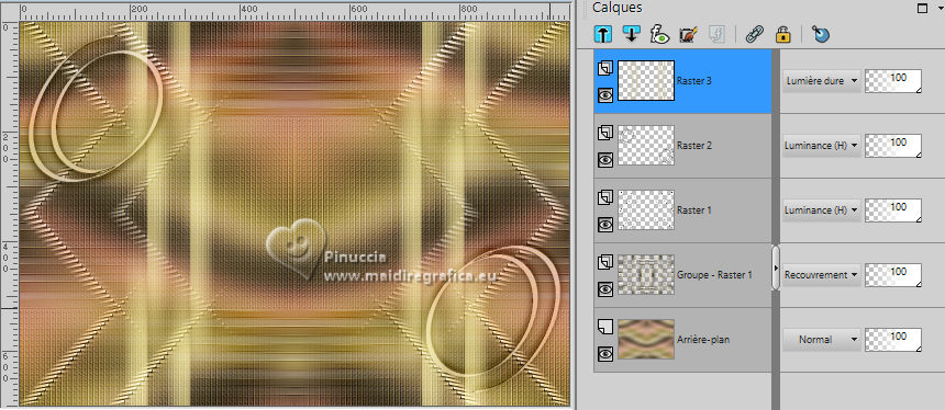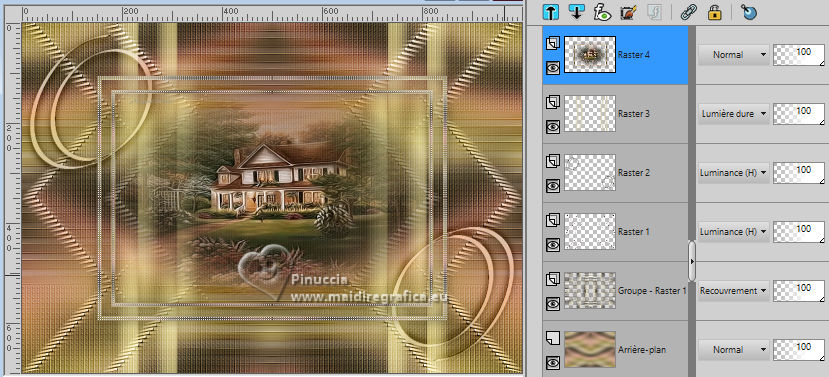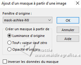 Pour traduire ce tutoriel j'ai utilisé PSPX9 et PSP2020, mais il peut également être exécuté avec les autres versions. Suivant la version utilisée, vous pouvez obtenir des résultats différents. Depuis la version X4, la fonction Image>Miroir a été remplacée par Image>Renverser horizontalement, et Image>Renverser avec Image>Renverser verticalement . Dans les versions X5 et X6, les fonctions ont été améliorées par la mise à disposition du menu Objets. Avec la nouvelle version X7, nous avons encore Image>Miroir et Image>Renverser/Retourner, mais avec nouvelles différences. Voir les détails à ce sujet ici Certaines dénominations ont changées entre les versions de PSP. Les plus frequentes dénominations utilisées: ![]() English translation here Vos versions ici![]() Nécessaire pour réaliser ce tutoriel: ![]() Pour les tubes merci AngelStar. Le reste du matériel est de Maria José (ici les liens vers les sites des créateurs du matériel) ![]() consulter, si nécessaire, ma section des filtres ici Filters Unlimited 2.0 ici Mura's Seamless - Emboss at Alpha ici Carolaine and Sensibility - CS-LDots ici Simple - Top Left Mirror ici AAA Filters - Custom ici Filtres Mura's Seamless et Simple peuvent être utilisés seuls ou importés dans Filters Unlimited. voir comment le faire ici). Si un filtre est fourni avec cette icône, ![]() en fonction des couleurs utilisées, vous pouvez changer le mode mélange et l'opacité des calques. ![]() Placer les sélections dans le dossier Sélections. Ouvrir le masque dans PSP et le minimiser avec le reste du matériel. Placer en avant plan la couleur #4e452c, et en arrière plan la couleur #9c8958. ![]() 1. Ouvrir l'image fundo-1-MJ ![]() Cette image sera la base de votre travail. Coloriser à votre goût. 2. Effets>Effets d'image>Mosaïque sans jointures. ![]() 3. Réglage>Flou>Flou gaussien - rayon 15. ![]() 4. Calques>Nouveau calque raster. Remplir le calque avec la couleur foncée.5. Calques>Nouveau calque de masque>A partir d'une image. Ouvrir le menu deroulant sous la fenêtre d'origine et vous verrez la liste des images ouvertes. Sélectionner le masque mask-ashlee-MJ. ![]() Calques>Fusionner>Fusionner le groupe. 6. Effets>Modules Externes>Mura's Seamless - Emboss at Alpha, par défaut. ![]() 7. Effets>Effets d'image>Mosaïque sans jointures. ![]() 8. Réglage>Netteté>Davantage de netteté. 9. Effets>Effets de réflexion>Miroir rotatif, par défaut. ![]() Placer ce calque en mode Recouvrement. 10. Ouvrir deco-MJ ![]() Édition>Copier. Revenir sur votre travail et Édition>Coller comme nouveau calque. Placer le calque en mode Luminance (héritée). 11. Ouvrir deco-1-MJ ![]() Édition>Copier. Revenir sur votre travail et Édition>Coller comme nouveau calque. Placer le calque en mode Luminance (héritée). 12. Ouvrir deco-2-MJ ![]() Édition>Copier. Revenir sur votre travail et Édition>Coller comme nouveau calque. Placer le calque en mode Lumière dure. ![]() 13. Vous positionner sur le calque d'arrière plan. Sélections>Charger/Enregistrer une sélection>Charger à partir du disque. Chercher et charger la sélection ashlee-MJ ![]() Sélections>Transformer la sélection en calque. 14. Calques>Agencer>Placer en haut de la pile. 15. Effets>Modules Externes>Carolaine and Sensibility - CS-LDots. ![]() 16. Effets>Effets de bords>Dilater. 17. Effets>Effets de bords>Accentuer. Sélections>Désélectionner tout. 18. Effets>Effets de réflexion>Miroir rotatif. ![]() 19. Effets>Modules Externes>Simple - Top Left Mirror. ![]() 20. Image>Redimensionner, à 70%, redimensionner tous les calques décoché. ![]() 21. Sélections>Charger/Enregistrer une sélection>Charger à partir du disque. Chercher et charger la sélection ashlee-1-MJ ![]() 22. Calques>Nouveau calque raster. Ouvrir le misted AS Tube p.34-2 ![]() Édition>Copier. Revenir sur votre travail et Édition>Coller dans la sélection. Calques>Agencer>Déplacer vers le bas. 23. Vous positionner sur le calque de dessus, Sélection transformée. Calques>Fusionner>Fusionner le calque de dessous. Sélections>Désélectionner tout. 24. Effets>Effets 3D>Ombre portée, couleur noire. ![]() La tag et les calques - adapter Mode mélange et opacité à votre goût. ![]() 25. Ouvrir le tube AS Tube 387 ![]() Édition>Copier. Revenir sur votre travail et Édition>Coller comme nouveau calque. Image>Redimensionner, à 73%, redimensionner tous les calques décoché. Déplacer le tube à gauche, ou à votre goût.Effets>Effets 3D>Ombre portée, à choix. 26. Image>Ajouter des bordures, 1 pixel, symétrique, couleur foncée. Image>Ajouter des bordures, 1 pixel, symétrique, couleur claire. 27. Sélections>Sélectionner tout. Édition>Copier Image>Ajouter des bordures, 50 pixels, symétrique, couleur blanche. 28. Sélections>Inverser. Édition>Coller dans la sélection 29. Réglage>Flou>Flou gaussien - rayon 15. ![]() 30. Effets>Modules Externes>Carolaine and Sensibility - CS-LDots, comme précédemment. ![]() 31. Réglage>Netteté>Davantage de netteté. Effets>Effets 3D>Ombre portée, couleur noire. ![]() 32. Calques>Nouveau calque raster. Ouvrir bordas-MJ ![]() Édition>Copier. Revenir sur votre travail et Édition>Coller dans la sélection. Placer le calque en mode Luminance (héritée), ou autre. Sélections>Désélectionner tout. 33. Sélections>Charger/Enregistrer une sélection>Charger à partir du disque. Chercher et charger la sélection ashlee-2-MJ ![]() 34. Sélections>Inverser. Effets>Effets 3D>Ombre portée, comme précédemment. Sélections>Désélectionner tout. 35. Signer votre travail sur un nouveau calque. Image>Ajouter des bordures, 1 pixel, symétrique, couleur foncée. 36. Image>Redimensionner, 1000 pixels de largeur, redimensionner tous les calques coché. OPTIONNEL: Effets>Modules Externes>AAA Filters - Custom - cliquer sur Landscape et ok. ![]() Enregistrer en jpg. Pour le tube de cette version merci Kamil ![]() Luz Cristina et Yvonne ![]() ![]() Si vous avez des problèmes, ou de