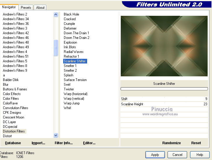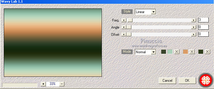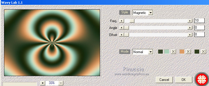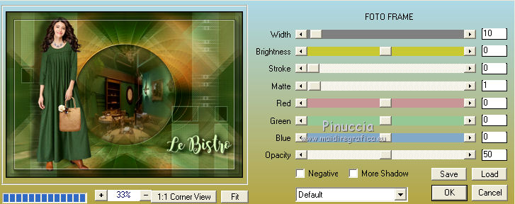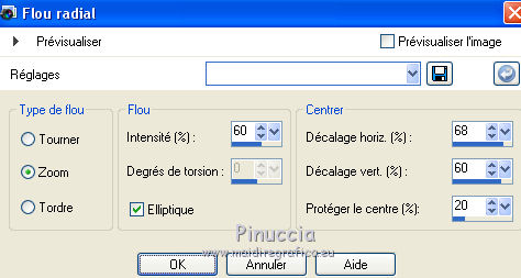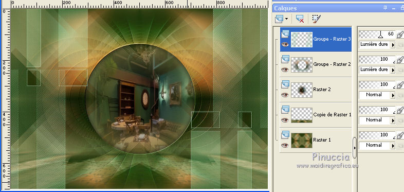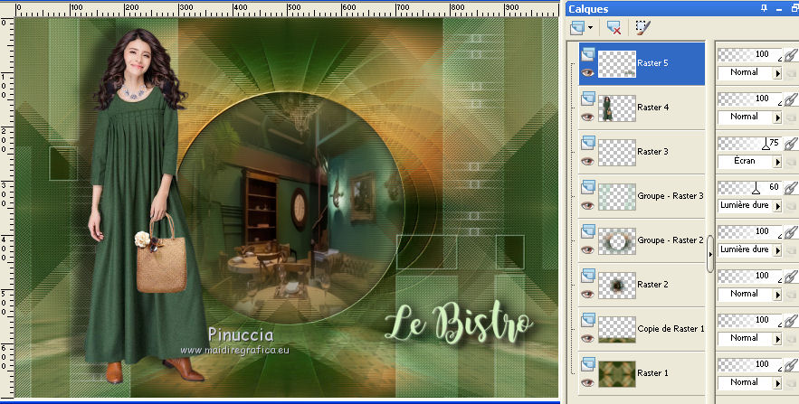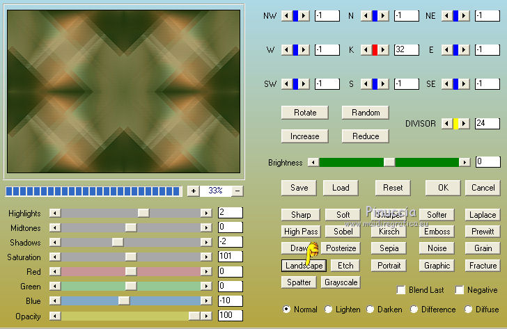 Pour traduire ce tutoriel j'ai utilisé CorelX12, mais il peut également être exécuté avec les autres versions. Suivant la version utilisée, vous pouvez obtenir des résultats différents. Depuis la version X4, la fonction Image>Miroir a été remplacée par Image>Renverser horizontalement, et Image>Renverser avec Image>Renverser verticalement . Dans les versions X5 et X6, les fonctions ont été améliorées par la mise à disposition du menu Objets. Avec la nouvelle version X7, nous avons encore Image>Miroir et Image>Renverser/Retourner, mais avec nouvelles différences. Voir les détails à ce sujet ici Certaines dénominations ont changées entre les versions de PSP. Les plus frequentes dénominations utilisées: ![]() Vos versions ici Nécessaire pour réaliser ce tutoriel: Matériel ici Pour le tube merci Nena Silva. (ici les liens vers les sites des créateurs de tubes) Modules Externes: consulter, si nécessaire, ma section des filtres ici Filters Unlimited 2.0 ici Graphics Plus - Vertical Mirror ici Mehdi - Wavy Lab 1.1. ici Mehdi - Sorting Tiles ici Simple - Pizza Slice Mirror ici Mura's Seamless - Emboss at Alpha ici Mura's Meister - Perspective Tiling ici AAA Frames - Foto Frame / AAA Filters - Custom ici Filtres Mura's Seamless et VM Instant Art peuvent être utilisés seuls ou importés dans Filters Unlimited. voir comment le faire ici). Si un filtre est fourni avec cette icône, ![]() en fonction des couleurs utilisées, vous pouvez changer le mode mélange et l'opacité des calques. Placer les sélections dans le dossier Sélections. Ouvrir les masques dans PSP et les minimiser avec le reste du matériel. Placer en avant plan la couleur #acd1b9, et en arrière plan la couleur #374429. ![]() 1. Ouvrir une nouvelle image transparente 1000 x 700 pixels. 2. Effets>Modules Externes>Mehdi - Wavy lab 1.1 Ce filtre crée des dégradés avec les couleurs de votre palette: la première est la couleur d'arrière plan, la deuxième est la couleur d'avant plan. Changer les autres deux couleurs créées par le filtre: la troisième avec la couleur #db9c66, la quatrième avec la couleur #2f3d1c. ![]() 3. Réglage>Flou>Flou radial. ![]() 4. Effets>Modules Externes>Mehdi - Sorting Tiles. ![]() 5. Effets>Modules Externes>Graphics Plus - Vertical Mirror, par défaut. ![]() 6. Effets>Modules Externes>Simple - Pizza Slice Mirror. 7. Effets>Effets de réflexion>Miroir rotatif, par défaut. ![]() 8. Effets>Modules Externes>Filters Unlimited 2.0 - Distortion Filters - Scanline Shifter, par défaut. ![]() 9. Effets>Effets d'image>Mosaïque sans jointures. ![]() 10. Effets>Modules Externes>AAA Filters - Custom - cliquer sur Landscape et ok. ![]() 11. Calques>Dupliquer. Effets>Effets de textures>Textile couleur du tissage: couleur d'arrière plan ![]() 12. Effets>Modules Externes>Mura's Meister - Perspective Tiling. ![]() 13. Sélections>Charger/Enregistrer une sélection>Charger à partir du disque. Chercher et charger la sélection lebistro_mj. ![]() Presser +/-10 fois CANC sur le clavier ![]() Sélections>Désélectionner tout. 14. Calques>Nouveau calque raster. Effets>Modules Externes>Wavy Lab 1.1 - garder les couleurs de l'étape 2. ![]() 15. Calques>Nouveau calque de masque>A partir d'une image. Ouvrir le menu deroulant sous la fenêtre d'origine et vous verrez la liste des images ouvertes. Sélectionner le masque blossommask_mj. ![]() Calques>Fusionner>Fusionner le groupe. 16. Effets>Modules Externes>Mura's Seamless - Emboss at Alpha, par défaut. ![]() Effets>Effets 3D>Ombre portée, couleur noire. ![]() Placer le calque en mode Lumière dure, ou autre. ![]() 17. Sélections>Charger/Enregistrer une sélection>Charger à partir du disque. Chercher et charger la sélection lebistro_1_mj. ![]() 18. Calques>Nouveau calque raster. Calques>Agencer>Déplacer vers le bas. Ouvrir le misted et Édition>Copier. Revenir sur votre travail et Édition>Coller dans la sélection. Sélections>Désélectionner tout. 19. Calques>Nouveau calque raster. Calques>Agencer>Placer en haut de la pile. Réduire l'opacité de l'outil Pot de peinture à 85 Remplir le calque avec la couleur claire #acd1b9.20. Calques>Nouveau calque de masque>A partir d'une image. Ouvrir le menu deroulant sous la fenêtre d'origine et sélectionner le masque maskpaz. ![]() Calques>Fusionner>Fusionner le groupe. 21. Effets>Modules Externes>Mura's Seamless - Emboss at Alpha, par défaut. ![]() 22. Calques>Dupliquer. Image>Mirror. Image>Renverser. 23. Calques>Fusionner>Fusionner le calque de dessous. Placer le calque en mode Lumière dure, ou autre, et réduire l'opacité à 60%. ![]() 24. Ouvrir deco_lebistro_mj - Édition>Copier. Revenir sur votre travail et Édition>Coller comme nouveau calque. Placer le calque en mode Écran, ou autre, et réduire l'opacité à 75%. 25. Ouvrir le tube de la femme - Édition>Copier. Revenir sur votre travail et Édition>Coller comme nouveau calque. Positionner bien le tube.Effets>Effets 3D>Ombre portée, à choix. 26. Ouvrir le texte - Édition>Copier. Revenir sur votre travail et Édition>Coller comme nouveau calque. Positionner le texte à votre goût.Ou écrivez un votre texte (dans le matériel la police utilisée pour le texte fourni). Vous devriez avoir ce-ci. ![]() 27. Optionnel - Répéter Effets>Modules Externes>AAA Filters - Custom - Landscape et ok. 28. Effets>Modules Externes>AAA Frames - Foto Frame. ![]() 29. Répéter Effets>Modules Externes>AAA Frames - Foto Frame - width 10 ![]() 30. Image>Ajouter des bordures, 1 pixel, symétrique, couleur noire. 31. Signer votre traval sur un nouveau calque. Calques>Fusionner>Tous. Enregistrer en jpg. Version avec tube de Gabry ![]() ![]() Vos versions ici ![]() Si vous avez des problèmes, ou des doutes, ou vous trouvez un link modifié, ou seulement pour me dire que ce tutoriel vous a plu, vous pouvez m'écrire. 6 Octobre 2019 |