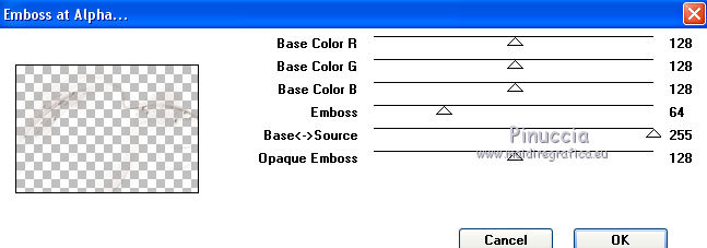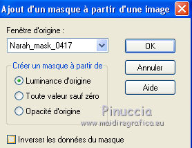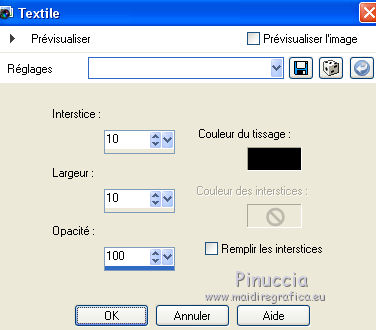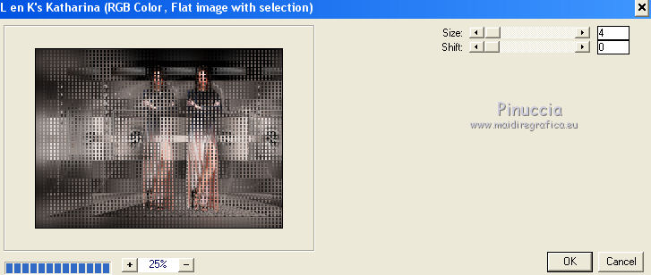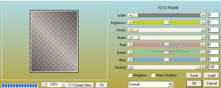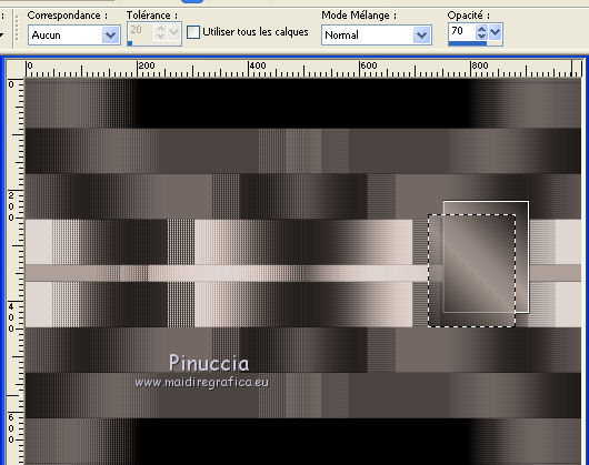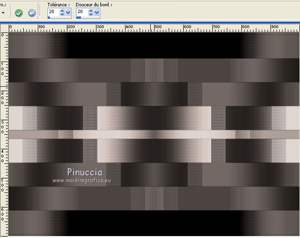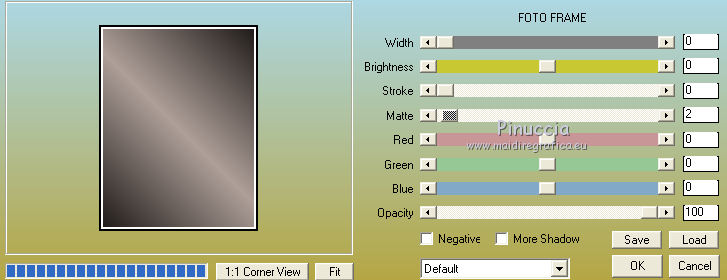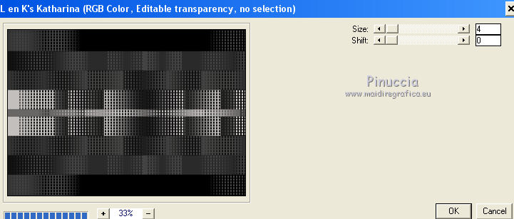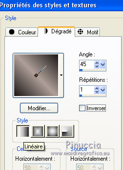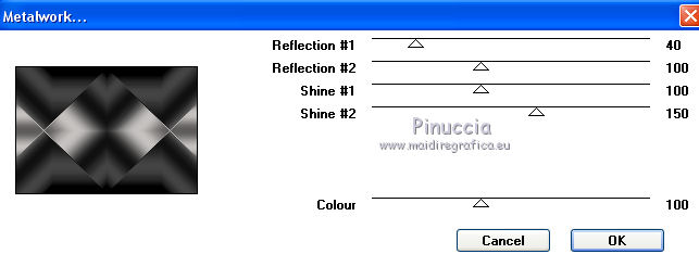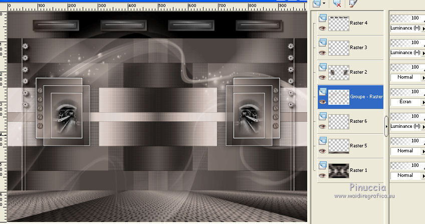 Pour traduire ce tutoriel j'ai utilisé CorelX17, mais il peut également être exécuté avec les autres versions. Suivant la version utilisée, vous pouvez obtenir des résultats différents. Depuis la version X4, la fonction Image>Miroir a été remplacée par Image>Renverser horizontalement, et Image>Renverser avec Image>Renverser verticalement . Dans les versions X5 et X6, les fonctions ont été améliorées par la mise à disposition du menu Objets. Avec la nouvelle version X7, nous avons encore Image>Miroir et Image>Renverser/Retourner, mais avec nouvelles différences. Voir les détails à ce sujet ici Certaines dénominations ont changées entre les versions de PSP. Les plus frequentes dénominations utilisées: ![]() Vos versions ici Nécessaire pour réaliser ce tutoriel: Matériel ici Pour le tube et le masque merci Nena Silva et Narah. (ici les liens vers les sites des créateurs de tubes) Modules Externes: consulter, si nécessaire, ma section des filtres ici Filters Unlimited 2.0 ici Simple - Pizza Slice Mirror, Top Left Mirror ici Simple - Left Right Wrap ici Graphics Plus - Vertical Mirror ici L&K's - L&K's Katharina ici AAA Frames - Foto Frame ici Toadies - Metalwork, Look,Butthead,a TV ici Mura's Meister - Perspective Tiling ici Mura's Seamless - Emboss at Alpha ici Filtres Toadies, Simple, Graphics Plus et Mura's Seamless peuvent être utilisés seuls ou importés dans Filters Unlimited. voir comment le faire ici). Si un filtre est fourni avec cette icône, ![]() en fonction des couleurs utilisées, vous pouvez changer le mode mélange et l'opacité des calques. Dans les plus récentes versions de PSP, vous ne trouvez pas le dégradé d'avant plan/arrière plan ou Corel_06_029. Vous pouvez utiliser le dégradé des versions antérieures. Ici le dossier Dégradés de CorelX. Placer la sélection dans le dossier Sélections. Ouvrir le masque dans PSP et le minimiser avec le reste du matériel. Placer en avant plan la couleur #1c1816, et en arrière plan la couleur #ae9f98. ![]() Préparer en avant plan un dégradé de premier plan/arrière plan, style Linéaire. ![]() 1. Ouvrir alphachannel_byllie. Fenêtre>Dupliquer ou sur le clavier shift+D pour faire une copie. ![]() Fermer l'original. La copie, qui sera la base de votre travail, n'est pas vide, mais contient les sélections enregistrées sur le canal alpha. Remplir l'image transparente du dégradé.2. Effets>Modules Externes>Simple - Pizza Slice Mirror. 3. Effets>Modules Externes>Simple - Top Left Mirror. 4. Effets>Modules Externes>Simple - Left Right Wrap. 5. Effets>Modules Externes>Toadies - Metalwork ![]() 6. Effets>Modules Externes>Toadies - Look, Butthead, a TV ![]() 7. Effets>Modules Externes>Graphics Plus - Vertical Mirror ![]() 8. Effets>Modules Externes>L&K's - L&K's Katharina, par défaut. ![]() 9. Effets>Effets de réflexion>Miroir rotatif. ![]() 10. Activer l'outil Changeur de couleur ![]() Tolérance et Douceur du bord 20 Cliquer sur l'image avec la touche droite de la souris, pour coloriser l'image avec la couleur claire d'arrière plan #ae9f98. ![]() 11. Sélections>Charger/Enregistrer une sélection>Charger à partir d'un canal alpha. La sélection #1 est déjà disponible. On doit seulement cliquer sur Charger. ![]() Calques>Nouveau calque raster. Remplir le calque du dégradé.12. Effets>Modules Externes>AAA Frames - Foto Frame. ![]() Sélections>Désélectionner tout. 13. Sélections>Charger/Enregistrer une sélection>Charger à partir d'un canal alpha. Ouvrir le menu des sélection et charger la sélection #2. ![]() Calques>Nouveau calque raster. Réduire l'opacité de l'outil Pot de peinture à 70% Remplir la sélection du dégradé![]() 14. Effets>Modules Externes>AAA Frames - Foto Frame, comme précédemment. ![]() 15. Sélections>Modifier>Contracter - 25 pixels. 16. Effets>Modules Externes>AAA Frames - Foto Frame, comme précédemment. 17. Calques>Nouveau calque raster. Ouvrir le misted - Édition>Copier. Revenir sur votre travail et Édition>Coller dans la sélection. 18. Sélections>Désélectionner tout. Calques>Fusionner>Fusionner le calque de dessous - 2 fois. Effets>Effets 3D>Ombre portée, couleur noire. ![]() 19. Calques>Dupliquer. Image>Miroir. Calques>Fusionner>Fusionner le calque de dessous. 20. Ouvrir deco_byllie_mj - Édition>Copier. Revenir sur votre travail et Édition>Coller comme nouveau calque. Positionner bien le tube.Placer le calque en mode Luminance (héritée). 21. Ouvrir le tube deco_byllie_1_mj - Édition>Copier. Revenir sur votre travail et Édition>Coller comme nouveau calque. 22. Effets>Effets d'image>Décalage. ![]() Placer le calque en mode Luminance (héritée), ou répéter l'étape 10 (changeur de couleur). 23. Vous positionner sur le calque du bas de la pile. Calques>Nouveau calque raster. Placer à nouveau l'opacité à 100, et remplir le calque du dégradé.24. Effets>Effets de textures>Textile, couleur du tissage noire ![]() 25. Effets>Modules Externes>Mura's Meister - Perspective Tiling. ![]() 26. Ouvrir le tube deco_byllie_2_mj - Édition>Copier. Revenir sur votre travail et Édition>Coller comme nouveau calque. Effets>Effets d'image>Décalage ![]() Placer le calque en mode Luminance (héritée). 27. Calques>Nouveau calque raster. Réduire l'opacité de l'outil Pot de peinture à 75% et remplir le calque avec la couleur claire d'arrière plan.28. Calques>Nouveau calque de masque>A partir d'une image. Ouvrir le menu deroulant sous la fenêtre d'origine et vous verrez la liste des images ouvertes. Sélectionner le masque Narah_mask_0417. ![]() Calques>Fusionner>Fusionner le groupe. 29. Effets>Modules Externes>Mura's Seamless - Emboss at Alpha, par défaut. ![]() Placer le calque en mode Écran. ![]() 30. Vous positionner sur le calque du haut de la pile. Ouvrir le tube de la femme - Édition>Copier. Revenir sur votre travail et Édition>Coller comme nouveau calque. Image>Redimensionner, à 80%, redimensionner tous les calques décoché. Effets>Effets 3D>O