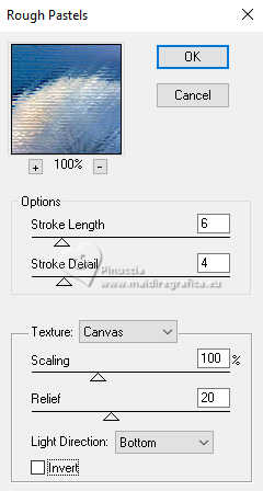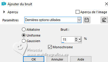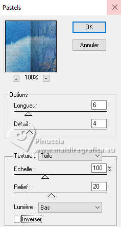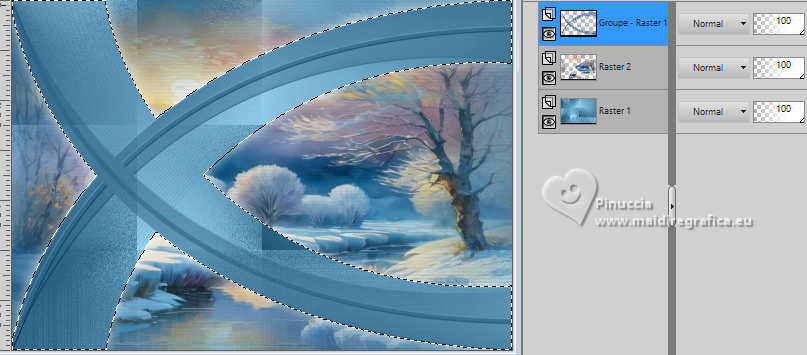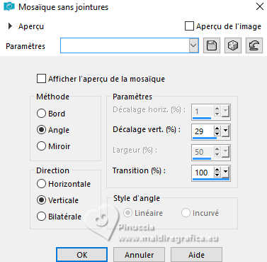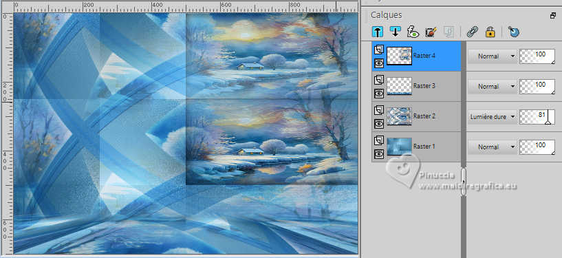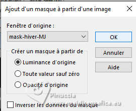 Pour traduire ce tutoriel j'ai utilisé PSPX9 et PSP2020, mais il peut également être exécuté avec les autres versions. Suivant la version utilisée, vous pouvez obtenir des résultats différents. Depuis la version X4, la fonction Image>Miroir a été remplacée par Image>Renverser horizontalement, et Image>Renverser avec Image>Renverser verticalement . Dans les versions X5 et X6, les fonctions ont été améliorées par la mise à disposition du menu Objets. Avec la nouvelle version X7, nous avons encore Image>Miroir et Image>Renverser/Retourner, mais avec nouvelles différences. Voir les détails à ce sujet ici Certaines dénominations ont changées entre les versions de PSP. Les plus frequentes dénominations utilisées: ![]() English translation here Vos versions ici![]() Nécessaire pour réaliser ce tutoriel: ![]() Le matériel est de Maria José (ici les liens vers les sites des créateurs du matériel) ![]() consulter, si nécessaire, ma section des filtres ici Filters Unlimited 2.0 ici Mura's Seamless - Emboss at Alpha ici Mehdi - Sorting Tiles ici Artistiques - Pastels ici Mura's Meister - Perspective Tiling ici VM Natural - Speed ici Filtres Mura's Seamless et VM Natural peuvent être utilisés seuls ou importés dans Filters Unlimited. voir comment le faire ici). Si un filtre est fourni avec cette icône, ![]() en fonction des couleurs utilisées, vous pouvez changer le mode mélange et l'opacité des calques. Dans les plus récentes versions de PSP, vous ne trouvez pas le dégradé d'avant plan/arriére plan ou Corel_06_029. Vous pouvez utiliser le dégradé des versions antérieures. Ici le dossier Dégradés de CorelX. ![]() Placer les sélections dans le dossier Sélections. Ouvrir le masque dans PSP et le minimiser avec le reste du matériel. Placer en avant plan la couleur #9d41ee et en arrière plan la couleur #306588. ![]() Préparer en avant plan un dégradé de premier plan/arrière plan, style Halo. ![]() 1. Ouvrir une nouvelle image transparente 1000 x 700 pixels. Remplir l'image transparente avec la couleur foncée d'arrière plan.2. Calques>Nouveau calque de masque>A partir d'une image. Ouvrir le menu deroulant sous la fenêtre d'origine et vous verrez la liste des images ouvertes. Sélectionner le masque mask-hiver-MJ. ![]() Calques>Fusionner>Fusionner le groupe. 3. Effets>Modules Externes>Mura's Seamless - Emboss at Alpha, par défaut. ![]() 4. Calques>Nouveau calque raster. Remplir le calque du dégradé.Calques>Agencer>Déplacer vers le bas. 5. Réglage>Ajouter/Supprimer du bruit>Ajouter du bruit. ![]() Réglage>Netteté>Netteté. 6. Effets>Modules Externes>Mehdi - Sorting Tiles. ![]() 7. Effets>Modules Externes>VM Natural - Speed, par défaut. ![]() 8. Calques>Nouveau calque raster. Sélections>Charger/Enregistrer une sélection>Charger à partir du disque. Chercher et charger la sélection celhiver-MJ ![]() 9. Sélections>Inverser. Ouvrir le tube misted-hiver-MJ ![]() Édition>Copier. Revenir sur votre travail et Édition>Coller dans la sélection. 10. Effets>Modules Externes>Artistiques - Pastels si vous utilisez la version anglaise du filtre (le résultat ne change pas): Effets>Modules Externes>Artistic - Rough Pastels ![]() 11. Sélections>Inverser. Effets>Effets 3D>Ombre portée, couleur blanche ![]() Vous positionner sur le calque du haut Groupe-Raster 1 ![]() Calques>Fusionner>Fusionner le calque de dessous. Sélections>Désélectionner tout. 12. Effects>Effets d'image>Mosaïque sans jointures. ![]() Placer le calque en mode Lumière dure et réduire l'opacité entre 80 et 83% (selon vos couleurs). 13. Édition>Copie Spéciale>Copier avec fusion. Édition>Coller comme nouveau calque. Image>Miroir. 14. Effets>Modules Externes>Mura's Meister - Perspective Tiling. ![]() 15. Activer l'outil Baguette magique , tolérance 0 et Progressivité 50et cliquer dans la partie transparente pour la sélectionner. Presser +/-10 fois CANC sur le clavier ![]() Sélections>Désélectionner tout. 16. Sélections>Charger/Enregistrer une sélection>Charger à partir du disque. Chercher et charger la sélection celhiver-1-MJ ![]() 17. Calques>Nouveau calque raster. Activer à nouveau le misted misted-hiver-MJ et Édition>Copier. Revenir sur votre travail et Édition>Coller dans la sélection. Réglage>Netteté>Davantage de netteté. 18. Sélections>Inverser. Effets>Effets 3D>Ombre portée, couleur noire. ![]() Sélections>Désélectionner tout. 19. Effets>Effets d'image>Mosaïque sans jointures. ![]() La tag et les calques - adapter Mode mélange et opacité selon vos couleurs ![]() 20. Ouvrir le tube tube-cestlhiver-MJ ![]() Édition>Copier. Revenir sur votre travail et Édition>Coller comme nouveau calque. Image>Redimensionner, à 70%, redimensionner tous les calques décoché. Déplacer le tube à droite.Effets>Effets 3D>Ombre portée, à choix. 21. Ouvrir le tube aveneve-MJ ![]() Édition>Copier. Revenir sur votre travail et Édition>Coller comme nouveau calque. Image>Redimensionner, à 65%, redimensionner tous les calques décoché. Déplacer le tube à gauche.22. Ouvrir le texte texto ![]() Édition>Copier. Revenir sur votre travail et Édition>Coller comme nouveau calque. Déplacer le texte à votre goût.23. Image>Ajouter des bordures, 1 pixel, symétrique, couleur foncée. Image>Ajouter des bordures, 1 pixel, symétrique, couleur claire. Image>Ajouter des bordures, 1 pixel, symétrique, couleur foncée. 24. Sélections>Sélectionner tout. Image>Ajouter des bordures, 50 pixels, symétrique, couleur blanche. Sélections>Inverser. Remplir la sélection du dégradé.25. Réglage>Ajouter/Supprimer du bruit>Ajouter du bruit, comme précédemment. ![]() 26. Effets>Modules Externes>Artistiques - Pastels, comme précédemment. ![]() 27. Effets>Effets de Réflexion>Miroir rotatif, par défaut. ![]() 28. Sélections>Inverser. Effets>Effets 3D>Ombre portée, couleur blanche. ![]() 29. Sélections>Sélectionner tout. Sélections>Modifier>Contracter - 25 pixels. Répéter