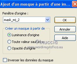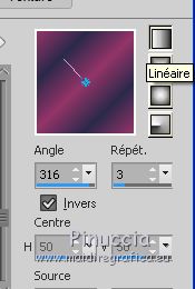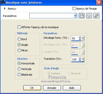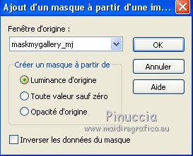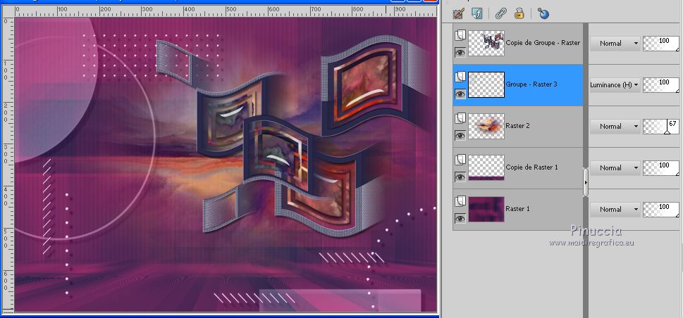 Pour traduire ce tutoriel j'ai utilisé PSPX7, PSPX2 et PSPX3, mais il peut également être exécuté avec les autres versions. Suivant la version utilisée, vous pouvez obtenir des résultats différents. Depuis la version X4, la fonction Image>Miroir a été remplacée par Image>Renverser horizontalement, et Image>Renverser avec Image>Renverser verticalement . Dans les versions X5 et X6, les fonctions ont été améliorées par la mise à disposition du menu Objets. Avec la nouvelle version X7, nous avons encore Image>Miroir et Image>Renverser/Retourner, mais avec nouvelles différences. Voir les détails à ce sujet ici Certaines dénominations ont changées entre les versions de PSP. Les plus frequentes dénominations utilisées: ![]() English translation here Vos versions iciNécessaire pour réaliser ce tutoriel: Matériel ici Le matériel est de Maria José. (ici les liens vers les sites des créateurs du matériel) Modules Externes: consulter, si nécessaire, ma section des filtres ici Filters Unlimited 2.0 ici [AFS IMPORT] - sqborder2 ici Eye Candy 4000 - Motion Trail ici Mura's Seamless - Emboss at Alpha ici Mehdi - Sorting Tiles ici Toadies - What are you ici Alien Skin Eye Candy 5 Impact - Glass ici Two Moon - VerticalRipplie, Emboston ici Mura's Meister - Perspective Tiling ici AAA Filters - Custom ici Graphics Plus - Quick Tile ici Filtres AFS IMPORT, Toadies, Two Moon, Graphics Plus et Mura's Seamless peuvent être utilisés seuls ou importés dans Filters Unlimited. voir comment le faire ici). Si un filtre est fourni avec cette icône, ![]() en fonction des couleurs utilisées, vous pouvez changer le mode mélange et l'opacité des calques. Dans les plus récentes versions de PSP, vous ne trouvez pas le dégradé d'avant plan/arrière plan ou Corel_06_029. Vous pouvez utiliser le dégradé des versions antérieures. Ici le dossier Dégradés de CorelX. Placer le preset En cliquant sur le preset une ou deux fois (selon vos réglages) automatiquement il se placera directement dans le dossier Settings de Alien Skin Eye Candy. pourquoi un ou deux clic voir ici Placer les sélections dans le dossier Sélections. Ouvrir les masques dans PSP et les minimiser avec le reste du matériel. Placer en avant plan la couleur #2b2a4a, et en arrière plan la couleur #943468. ![]() 1. Ouvrir une nouvelle image transparente 1000 x 700 pixels. Remplir l'image transparente avec la couleur d'avant plan #2b2a4a.2. Calques>Nouveau calque de masque>A partir d'une image. Ouvrir le menu deroulant sous la fenêtre d'origine et vous verrez la liste des images ouvertes. Sélectionner le masque maskmygallery_mj. ![]() Calques>Fusionner>Fusionner le groupe. 3. Effets>Modules Externes>[AFS IMPORT] - sqborder2, par défaut. ![]() 4. Calques>Dupliquer. Effets>Modules Externes>Eye Candy 4000 - Motion Trail. ![]() Calques>Agencer>Déplacer vers le bas. Vous positionner sur le calque du haut de la pile. Calques>Fusionner>Fusionner le calque de dessous. 5. Effets>Modules Externes>Mura's Seamless - Emboss at Alpha, par défaut. ![]() 6. Sélections>Charger/Enregistrer une sélection>Charger à partir du disque. Chercher et charger la sélection chemin_mj ![]() 7. Calques>Nouveau calque raster. Ouvrir l'image graficolilas - Édition>Copier. Revenir sur votre travail et Édition>Coller dans la sélection. 8. Sélections>Modifier>Contracter - 10 pixels. Presser CANC sur le clavier ![]() 9. Sélections>Modifier>Contracter - 15 pixels. Édition>Coller dans la sélection (l'image graficolilas est toujours en mémoire). ![]() 10. Effets>Modules Externes>Alien Skin Eye Candy 5 Impact - Glass Sélectionner le preset glass_majo et ok. ![]() Sélections>Désélectionner tout. Calques>Fusionner>Fusionner le calque de dessous. 11. Effets>Effets de distorsion>Vagues. ![]() 12. Image>Redimensionner, à 90%, redimensionner tous les calques décoché. 13. Calques>Dupliquer. Image>Renverser. 14. Touche K pour activer l'outil Sélecteur ![]() et placer Position horiz.: 280,00 et Position vert.: 60,00. ![]() ![]() Touche M pour désélectionner l'outil. Calques>Fusionner>Fusionner le calque de dessous. 15. Effets>Effets 3D>Ombre portée, couleur noire. ![]() 16. Image>Redimensionner, 2 fois à 90%, redimensionner tous les calques décoché. 17. Outil Sélecteur ![]() et placer Position horiz.: 336,00 et Position vert.: 40,00. ![]() ![]() Touche M pour désélectionner l'outil. 18. Préparer en avant plan un dégradé de premier plan/arrière plan, style Linéaire. ![]() Calques>Nouveau calque raster. Calques>Agencer>Déplacer vers le bas. Remplir le calque du dégradé.19. Effets>Effets géométriques>Inclinaison. ![]() 20. Effets>Modules Externes>Mehdi - Sorting Tiles. ![]() 21. Effets>Modules Externes>Toadies - What are you. ![]() 22. Effets>Modules Externes>Two Moon - Vertical Ripplie, par défaut. ![]() 23. Effets>Modules Externes>Two Moon - Emboston, par défaut. ![]() 24. Effets>Effets d'image>Mosaïque sans jointures. ![]() 25. Ouvrir le misted - Édition>Copier. Revenir sur votre travail et Édition>Coller comme nouveau calque. Positionner bien le tube.Réduire l'opacité de ce calque +/-67%, selon votre misted. ![]() 26. Vous positionner sur le calque du bas de la pile, Raster 1. Calques>Dupliquer. Effets>Modules Externes>Mura's Meister - Perspective Tiling. ![]() 27. Sélections>Charger/Enregistrer une sélection>Charger à partir du disque. Chercher et charger la sélection chemin_1_mj ![]() Presser +/-7 fois CANC sur le clavier ![]() Sélections>Désélectionner tout. 28. Placer en avant plan la couleur blanche #ffffff. Calques>Nouveau calque raster. Remplir le calque avec la couleur blanche.29. Calques>Nouveau calque de masque>A partir d'une image. Ouvrir le menu deroulant sous la fenêtre d'origine et sélectionner le masque mask_mj_2. ![]() Calques>Fusionner>Fusionner le groupe. 30. Effets>Modules Externes>Mura's Seamless - Emboss at Alpha, par défaut. ![]() Effets>Effets 3D>Ombre portée, par défaut ![]() Placer