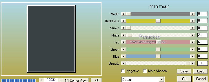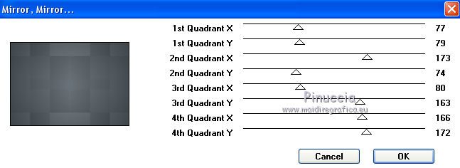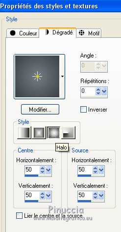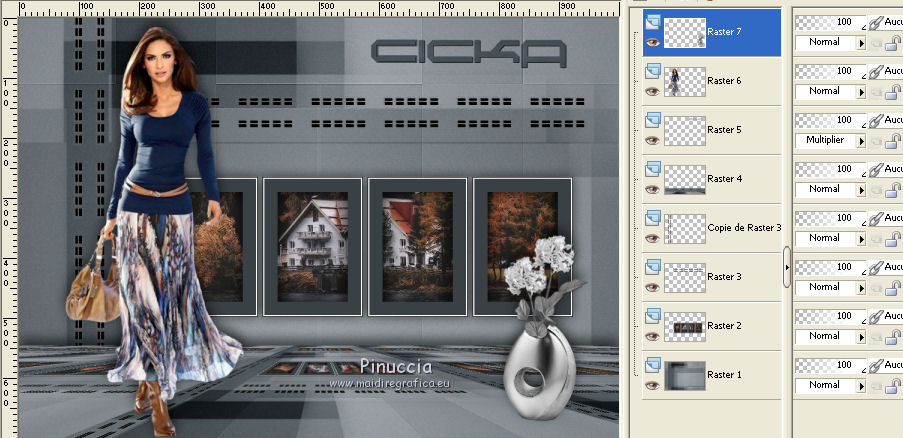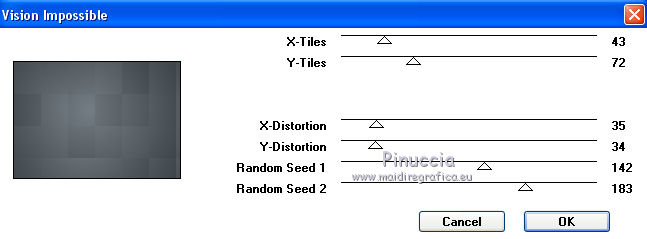 Pour traduire ce tutoriel j'ai utilisé CorelX17, mais il peut également être exécuté avec les autres versions. Suivant la version utilisée, vous pouvez obtenir des résultats différents. Depuis la version X4, la fonction Image>Miroir a été remplacée par Image>Renverser horizontalement, et Image>Renverser avec Image>Renverser verticalement . Dans les versions X5 et X6, les fonctions ont été améliorées par la mise à disposition du menu Objets. Avec la nouvelle version X7, nous avons encore Image>Miroir et Image>Renverser/Retourner, mais avec nouvelles différences. Voir les détails à ce sujet ici Certaines dénominations ont changées entre les versions de PSP. Les plus frequentes dénominations utilisées: ![]() Vos versions iciNécessaire pour réaliser ce tutoriel: Matériel ici Merci pour le tube Cicka et pour le déco Valy. (ici les liens vers les sites des créateurs de tubes) Modules Externes: consulter, si nécessaire, ma section des filtres ici Filters Unlimited 2.0 ici Simple - Zoom Out and Flip ici VM Distortion - Vision Impossible ici Filter Factory Gallery A - Mirror Mirror ici Mura's Meister - Copies ici Mura's Meister - Perspective Tiling ici AAA Frames - Foto Frame ici Filtres Simple, VM Distortion et Factory Gallery peuvent être utilisés seuls ou importés dans Filters Unlimited. voir comment le faire ici). Si un filtre est fourni avec cette icône, ![]() en fonction des couleurs utilisées, vous pouvez changer le mode mélange et l'opacité des calques. Dans les plus récentes versions de PSP, vous ne trouvez pas le dégradé d'avant plan/arrière plan ou Corel_06_029. Vous pouvez utiliser le dégradé des versions antérieures. Ici le dossier Dégradés de CorelX. Placer les sélections dans le dossier Sélections. 1. Placer en avant plan la couleur #747d84, et en arrière plan la couleur #3a4145. ![]() Préparer en avant plan un dégradé de premier plan/arrière plan, style Halo. ![]() Ouvrir une nouvelle image transparente 1000 x 700 pixels. Remplir l'image transparente du dégradé.2. Effets>Modules Externes>VM Distortion - Vision Impossible, par défaut. ![]() 3. Effets>Modules Externes>Filter Factory Gallery A - Mirror Mirror, par défaut. ![]() 4. Effets>Effets de bords>Accentuer davantage. 5. Calques>Nouveau calque raster. Sélections>Sélectionner tout. 6. Ouvrir le masque Edit Mask 34 - Édition>Copier. Revenir sur votre travail et Édition>Coller dans la sélection. Sélections>Désélectionner tout. Placcer le calque en mode Lumière douce, ou autre. Calques>Fusionner>Fusionner le calque de dessous. 7. Sélections>Charger/Enregistrer une sélection>Charger à partir du disque. Chercher et charger la sélection cicka. ![]() Calques>Nouveau calque raster. Remplir le calque avec la couleur foncée d'arrière plan.8. Effets>Modules Externes>AAA Frames - Foto Frame. ![]() Sélections>Modifier>Contracter - 35 pixels. Presser CANC sur le clavier ![]() Sélections>Désélectionner tout. 9. Effets>Modules Externes>Mura's Meister - Copies. ![]() 10. Sélections>Charger/Enregistrer une sélection>Charger à partir du disque. Chercher et charger la sélection cicka_1_mj. ![]() 11. Ouvrir l'image gráfico - Édition>Copier. Revenir sur votre travail et Édition>Coller comme nouveau calque. Positionner bien le tube sur la sélection, à votre goût.Sélections>Inverser. Presser CANC sur le clavier. 12. Effets>Effets 3D>Ombre portée, couleur noire. ![]() Calques>Fusionner>Fusionner le calque de dessous. Sélections>Désélectionner tout. 13. Effets>Effets 3D>Ombre portée, couleur noire. ![]() 14. Ouvrir le tube deco_cicka - Édition>Copier. Revenir sur votre travail et Édition>Coller comme nouveau calque. 15. Activer l'outil sélecteur ![]() et placer Position horiz.: 238,00 et Position vert.: 129,00. ![]() Calques>Dupliquer. 16. Image>Rotation libre - 90 degrés à gauche. ![]() 17. Placer Position horiz.: 89,00 et Position vert. -4,00. ![]() 18. Vous positionner sur le calque Raster 1. Réglage>Ajouter/Supprimer du bruit>Ajouter du bruit. ![]() 19. Vous positionner sur le calque du haut de la pile, Copie de Raster 3. Édition>Copie Spéciale>Copier avec fusion. 20. Édition>Coller comme nouveau calque. Image>Renverser. 21. Effets>Modules Externes>Mura's Meister - Perspective Tiling. ![]() Effets>Effets 3D>Ombre portée, couleur noire. ![]() 22. Ouvrir texto - Édition>Copier. Revenir sur votre travail et Édition>Coller comme nouveau calque. Positionner le texte à votre goût ou voir mon exemple.Placer le calque en mode Multiplier, ou autre. 23. Ouvrir le tube de la femme - Édition>Copier. Revenir sur votre travail et Édition>Coller comme nouveau calque. Positionner bien le tube.Effets>Effets 3D>Ombre portée, à choix. 24. Ouvrir le déco - Édition>Copier. Revenir sur votre travail et Édition>Coller comme nouveau calque. Positionner bien le tube.Effets>Effets 3D>Ombre portée, à choix. Les calques et la tag ![]() 25. Image>Ajouter des bordures, 3 pixels, symétrique, couleur foncée #3a4145. Image>Ajouter des bordures, 3 pixels, symétrique, couleur claire #747d84. Image>Ajouter des bordures, 1 pixel, symétrique, couleur foncée #3a4145. 26. Sélections>Sélectionner tout. Édition>Copier. Image>Ajouter des bordures, 50 pixels, symétrique, couleur blanche #ffffff. 27. Sélections>Inverser. Édition>Coller dans la sélection. 28. Réglage>Flou>Flou gaussien - rayon 20. ![]() Sélections>Transformer la sélection en calque. 29. Effets>Modules Externes>Simple - Zoom out and flip. 30. Réglage>Netteté>Davantage de netteté. Calques>Fusionner>Calques visibles. 31. Effets>Effets 3D>Ombre portée, couleur noire. ![]() Sélections>Inverser. Répéter Effets>Effets 3D>Ombre portée, comme précédemment. Sélections>Désélectionner tout. Image>Ajouter des bordures, pixel, symétrique, couleur foncée #3a4145. 22. Signer votre travail sur un nouveau calque. Calques>Fusionner>Tous. 23. Image>Redimensionner, 1000 pixels de largeur, redimensionner tous