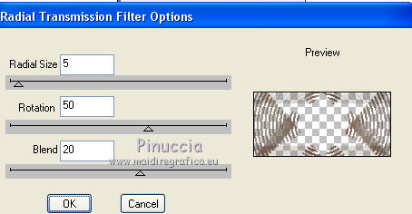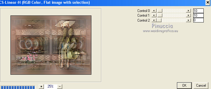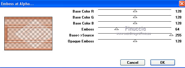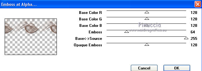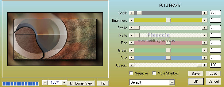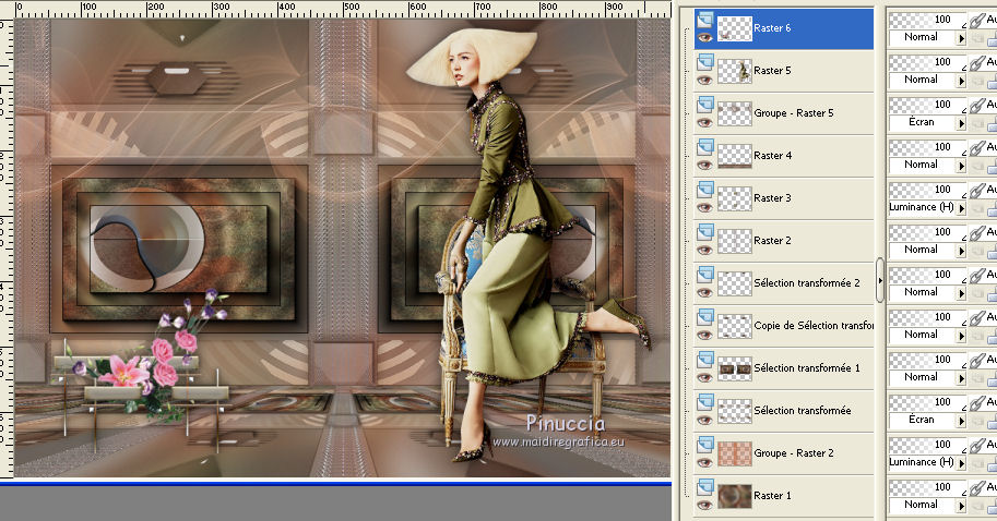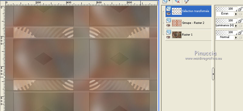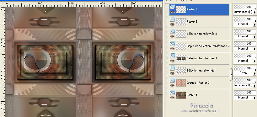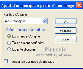 Pour traduire ce tutoriel j'ai utilisé CorelX17, mais il peut également être exécuté avec les autres versions. Suivant la version utilisée, vous pouvez obtenir des résultats différents. Depuis la version X4, la fonction Image>Miroir a été remplacée par Image>Renverser horizontalement, et Image>Renverser avec Image>Renverser verticalement . Dans les versions X5 et X6, les fonctions ont été améliorées par la mise à disposition du menu Objets. Avec la nouvelle version X7, nous avons encore Image>Miroir et Image>Renverser/Retourner, mais avec nouvelles différences. Voir les détails à ce sujet ici Certaines dénominations ont changées entre les versions de PSP. Les plus frequentes dénominations utilisées: ![]() Vos versions iciNécessaire pour réaliser ce tutoriel: Matériel ici Merci pour les tubes @nn_tdstudio et Luz Cristina. Le reste du matériel est de Maria José. (ici les liens vers les sites des créateurs de tubes) Modules Externes: consulter, si nécessaire, ma section des filtres ici Filters Unlimited 2.0 ici Brush Strokes - Angle Strokes ici Simple - Center Tile, Top Left Mirror ici DSB Flux - Radial Transmission ici Carolaine and Sensibility - CS-Linear-H ici Mura's Meister - Perspective Tiling ici Mura's Seamless - Emboss at Alpha ici AAA Frames - Foto Frame / AAA Filters - Custom ici Alien Skin Eye Candy 5 Impact - Glass ici Filtres Simple et Mura's Seamless peuvent être utilisés seuls ou importés dans Filters Unlimited. voir comment le faire ici). Si un filtre est fourni avec cette icône, ![]() en fonction des couleurs utilisées, vous pouvez changer le mode mélange et l'opacité des calques. Placer le preset En cliquant sur le preset une ou deux fois (selon vos réglages) automatiquement il se placera directement dans le dossier Settings de Alien Skin Eye Candy. pourquoi un ou deux clic voir ici Placer les sélections dans le dossier Sélections Ouvrir les masques dans PSP et les minimiser avec le reste du matériel. Choisir deux couleurs du graphique Placer en avant plan la couleur claire, pour moi#c0724e, et en arrière plan la couleur foncée, pour moi #583322. ![]() 1. Ouvrir alphachannel Fenêtre>Dupliquer ou sur le clavier shift+D pour faire une copie. ![]() Fermer l'original. La copie, qui sera la base de votre travail, n'est pas vide, mais contient les sélections enregistrées sur le canal alpha. 2. Sélections>Sélectionner tout. Ouvrir le graphic - Édition>Copier. Revenir sur votre travail et Édition>Coller dans la sélection. 3. Effets>Effets d'image>Mosaïque sans jointures. 4. Réglage>Flou>Flou gaussien - rayon 25. ![]() 5. Réglage>Ajouter/Supprimer du bruit>Ajouter du bruit. ![]() 6. Effets>Modules Externes>Brush Strokes - Angled Strokes, par défaut. ![]() 7. Calques>Nouveau calque raster. Remplir le calque avec la couleur d'avant plan #c0724e.8. Calques>Nouveau calque de masque>A partir d'une image. Ouvrir le menu deroulant sous la fenêtre d'origine et vous verrez la liste des images ouvertes. Sélectionner le masque @nn_220312_mask_075. ![]() Calques>Fusionner>Fusionner le groupe. 9. Effets>Modules Externes>Mura's Seamless - Emboss at Alpha, par défaut. ![]() 10. Effets>Effets d'image>Décalage. ![]() 11. Effets>Modules Externes>Simple - Center Tile. 12. Effets>Effets de réflexion>Miroir rotatif. ![]() Répéter Effets>Effets de réflexion>Miroir rotatif horizontal 0. ![]() Placer le calque en mode Luminance (héritée). 13. Vous positionner le calque Raster 1. Sélections>Charger/Enregistrer une sélection>Charger à partir d'un canal alpha. La sélection #1 est immédiatement disponible. On doit seulement cliquer sur Charger. ![]() Sélections>Transformer la sélection en calque. Garder sélectionné. 14. Effets>Modules Externes>Dsb Flux - Radial Transmission. ![]() Sélections>Désélectionner tout. 15. Réglage>Netteté>Netteté. 16. Effets>Modules Externes>Simple - Top Left Mirror. ![]() Placer le calque en mode Écran. ![]() 17. Vous positionner à nouveau sur le calque Raster 1. Sélections>Charger/Enregistrer une sélection>Charger à partir d'un canal alpha. Ouvrir le menu des Sélections et charger la sélection #2. ![]() Sélections>Transformer la sélection en calque. Calques>Agencer>Placer en haut de la pile. 18. Effets>Modules Externes>AAA Frames - Foto Frame. ![]() Sélections>Modifier>Contracter - 21 pixels. Édition>Coller dans la sélection (le graphique est toujours en mémoire). Réglage>Netteté>Netteté. 19. Sélections>Modifier>Contracter - 21 pixels. Effets>Modules Externes>AAA Frames - Foto Frame, comme précédemment. ![]() Sélections>Désélectionner tout. 20. Calques>Dupliquer. Image>Miroir. Calques>Fusionner>Fusionner le calque de dessous. 21. Effets>Effets 3D>Ombre portée, couleur #000000. ![]() 22. Vous positionner sur le calque Raster 1. Sélections>Charger/Enregistrer une sélection>Charger à partir d'un canal alpha. Ouvrir le menu des Sélections et charger la sélection #3. ![]() Sélections>Transformer la sélection en calque. Calques>Agencer>Placer en haut de la pile. 23. Effets>Modules Externes>Alien Skin Eye Candy 5 Impact - Glass. Sélectionner le preset glass_majo et ok. ![]() Sélections>Désélectionner tout. Calques>Dupliquer. 24. Effets>Modules Externes>DSB Flux - Linear Transmission. ![]() Calques>Agencer>Déplacer vers le bas. 24. Vous positionner sur le calque du haut Sélection transformée 2. ![]() Calques>Fusionner>Fusionner le calque de dessous. 25. Calques>Dupliquer. Image>Miroir. Calques>Fusionner>Fusionner le calque de dessous. 26. Calques>Dupliquer. Image>Renverser. Calques>Fusionner>Fusionner le calque de dessous. 27. Vous positionner à nouveau sur le calque Raster 1. Sélections>Charger/Enregistrer une sélection>Charger à partir d'un canal alpha. Ouvrir le menu des Sélections et charger la sélection #5. ![]() Sélections>Transformer la sélection en calque. Calques>Agencer>Placer en haut de la pile. 28. Effets>Modules Externes>Alien Skin Eye Candy 5 Impact - 
