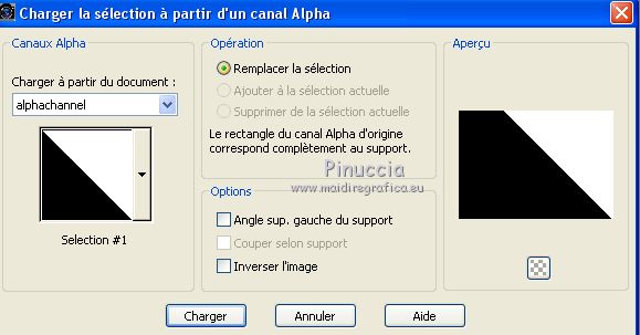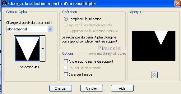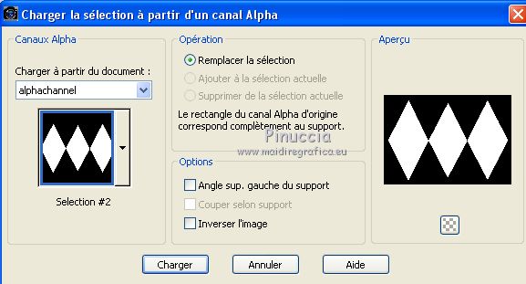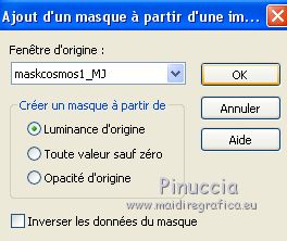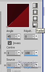 Pour traduire ce tutoriel j'ai utilisé PSPX7, PSPX2 et PSPX3, mais il peut également être exécuté avec les autres versions. Suivant la version utilisée, vous pouvez obtenir des résultats différents. Depuis la version X4, la fonction Image>Miroir a été remplacée par Image>Renverser horizontalement, et Image>Renverser avec Image>Renverser verticalement . Dans les versions X5 et X6, les fonctions ont été améliorées par la mise à disposition du menu Objets. Avec la nouvelle version X7, nous avons encore Image>Miroir et Image>Renverser/Retourner, mais avec nouvelles différences. Voir les détails à ce sujet ici Certaines dénominations ont changées entre les versions de PSP. Les plus frequentes dénominations utilisées: ![]() English translation here Vos versions iciNécessaire pour réaliser ce tutoriel: Matériel ici Pour le tube merci Babette. Le reste du matériel est de Maria José. (ici les liens vers les sites des créateurs de tubes) Modules Externes: consulter, si nécessaire, ma section des filtres ici Filters Unlimited 2.0 ici Mura's Seamless - Emboss at Alpha ici VM Natural - Speed ici Penta.com - ToyCamera ici Graphics Plus - Vertical Mirror ici Mura's Meister - Perspective Tiling ici L&K' - L&K's Adonis ici L&K' - L&K's Adonis ici Richard Rosenman - Halftone ici Simple - Left Right Wrap (bonus) ici Kiwi - Augenspiegel ici AAA Frames / AAA Filters ici Filtres VM Natural, Penta.com, Graphics Plus, Simple, Kiwi et Mura's Seamless peuvent être utilisés seuls ou importés dans Filters Unlimited. voir comment le faire ici). Si un filtre est fourni avec cette icône, ![]() en fonction des couleurs utilisées, vous pouvez changer le mode mélange et l'opacité des calques. Dans les plus récentes versions de PSP, vous ne trouvez pas le dégradé d'avant plan/arrière plan ou Corel_06_029. Vous pouvez utiliser le dégradé des versions antérieures. Ici le dossier Dégradés de CorelX. Placer les sélections dans le dossier Sélections Ouvrir le masque dans PSP et le minimiser avec le reste du matériel. 1. Placer en avant plan la couleur #2e070c, et en arrière plan la couleur #780f13. ![]() Préparer en avant plan un dégradé de premier plan/arrière plan, style Radial. ![]() 2. Ouvrir Alphachannel. Fenêtre>Dupliquer ou sur le clavier shift+D pour faire une copie. ![]() Fermer l'original. La copie, qui sera la base de votre travail, n'est pas vide, mais contient les sélections enregistrées sur le canal alpha. Remplir l'image transparente du dégradé.Image>Miroir. 3. Sélections>Charger/Enregistrer une sélection>Charger à partir d'un canal alpha. La sélection #1 est déjà disponible. On doit seulement cliquer sur Charger. ![]() 4. Effets>Effets 3D>Ombre portée, couleur noire. ![]() Sélections>Désélectionner tout. 5. Effets>Modules Externes>VM Natural - Speed, par défaut. ![]() 6. Réglage>Netteté>Netteté. 7. Effets>Modules Externes>Filters Unlimited 2.0 - Penta.com - ToyCamera. ![]() 8. Effets>Effets géométriques>Perspective verticale. ![]() 9. Effets>Effets d'image>Mosa&ium;que sans jointures. ![]() 10. Effets>Modules Externes>Graphics Plus - Vertical Mirror, par défaut. ![]() 11. Effets>Effets de réflexion>Miroir rotatif. ![]() Calques>Dupliquer. 12. Effets>Modules Externes>Kiwi - Augenspiegel, par défaut. ![]() 13. Effets>Modules Externes>Graphics Plus - Vertical Mirror, par défaut. ![]() 14. Placer le calque en mode Écran (ou autre), et réduire l'opacité à 50%. Calques>Fusionner>Fusionner le calque de dessous. 15. Effets>Modules Externes>Simple - Left Right Wrap. 16. Sélections>Charger/Enregistrer une sélection>Charger à partir d'un canal alpha. Ouvrir le menu des Sélections et charger la sélection #2. ![]() 17. Effets>Modules Externes>L&K's - L&K's - Adonis ![]() 18. Effets>Modules Externes>L&K's - L&K's - Zitah ![]() Sélections>Désélectionner tout. 19. Sélections>Charger/Enregistrer une sélection>Charger à partir d'un canal alpha. Ouvrir le menu des Sélections et charger la sélection #3. ![]() 20. Calques>Nouveau calque raster. Remplir le calque du dégradé.21. Effets>Modules Externes>Richard Rosenman - Halftone, par défaut. ![]() Sélections>Désélectionner tout. 22. Effets>Effets de réflexion>Miroir rotatif, par défaut. ![]() Calques>Dupliquer. Image>Renverser. Calques>Fusionner>Fusionner le calque de dessous. 23. Effets>Effets 3D>Ombre portée, couleur noire. ![]() 24. Effets>Modules Externes>Mura's Meister - Perspective Tiling. ![]() 25. Sélections>Charger/Enregistrer une sélection>Charger à partir d'un canal alpha. Ouvrir le menu des Sélections et charger la sélection #4. ![]() Presser CANC sur le clavier ![]() Sélections>Désélectionner tout. 26. Calques>Dupliquer. Image>Renverser. Calques>Fusionner>Fusionner le calque de dessous. Effets>Effets 3D>Ombre portée, comme précédemment. 27. Ouvrir le tube deco_3a_MJ - Édition>Copier. Revenir sur votre travail et Édition>Coller comme nouveau calque. Calques>Agencer>Déplacer vers le bas. Placer le calque en mode Luminance (héritée) ou autre. 28. Ouvrir le tube deco_2_MJ - Édition>Copier. Revenir sur votre travail et Édition>Coller comme nouveau calque. Placer le calque en mode Luminance (héritée) ou autre. 29. Calques>Nouveau calque raster. Calques>Agencer>Placer en haut de la pile. Remplir le calque avec la couleur claire.30. Calques>Nouveau calque de masque>A partir d'une image. Ouvrir le menu deroulant sous la fenêtre d'origine et vous verrez la liste des images ouvertes. Sélectionner le masque maskcosmos1_MJ. ![]() Calques>Fusionner>Fusionner le groupe. 31. Effets>Modules Externes>Mura's Seamless - Emboss at alpha, par défaut. ![]() Placer le calque en mode Écran ou autre. Vous devriez avoir ce-ci (comme j'ai dit au début, selon vos version de PSP et/ou vos couleurs) (régler modes mélange à votre goût) ma palette avec PSPX2 et X7 ![]() ma palette avec PSPx3 ![]() Calques>Fusionner>Calques visibles. 32. Effets>Modules Externes>AAA Filter