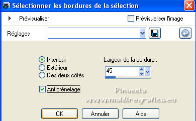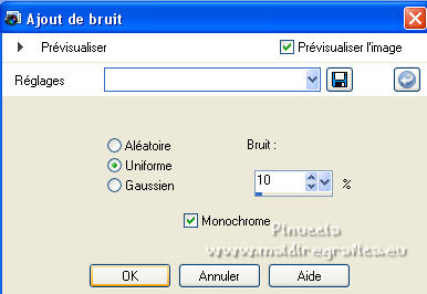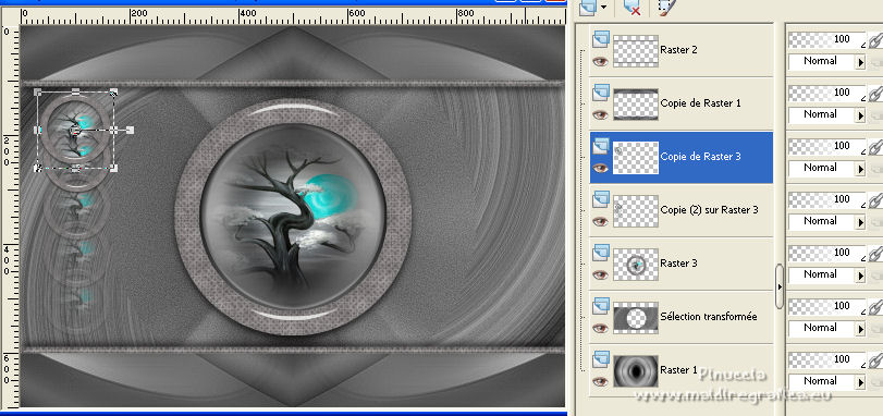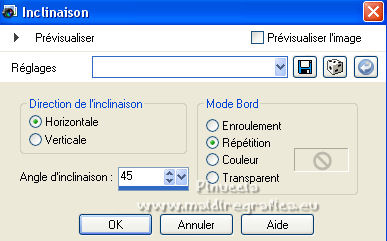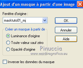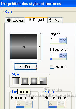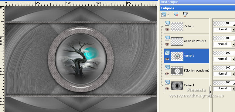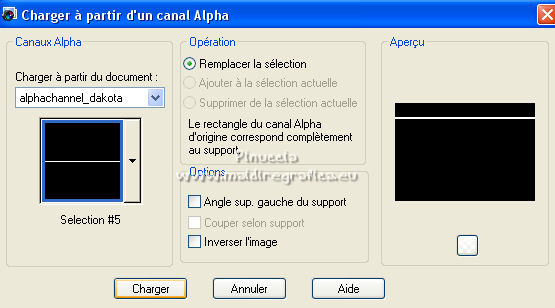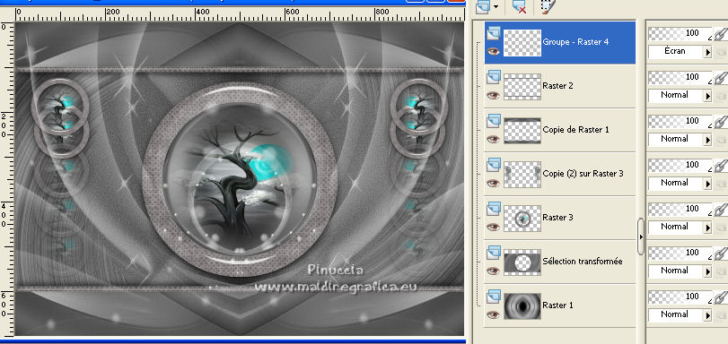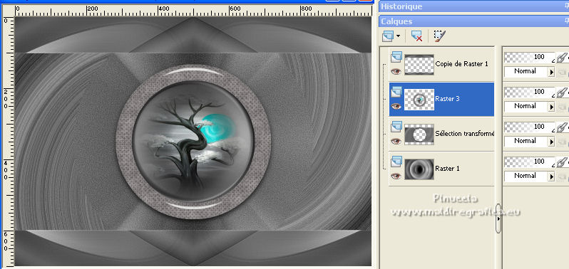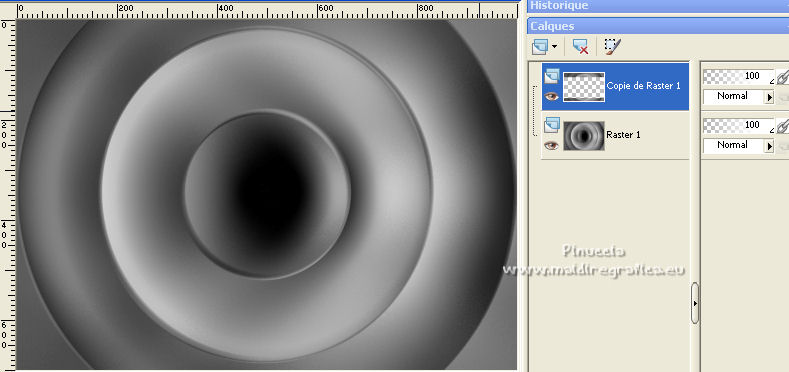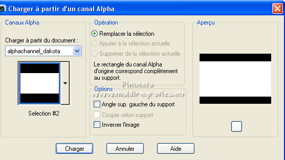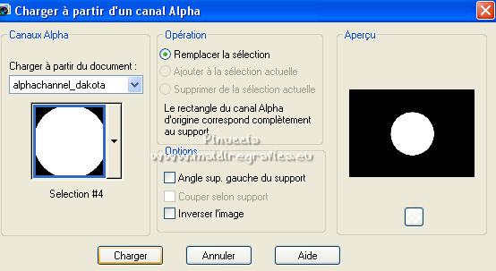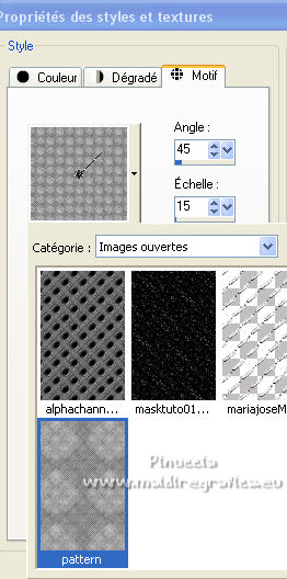 Pour traduire ce tutoriel j'ai utilisé PSPX7, PSPX2 et PSPX3, mais il peut également être exécuté avec les autres versions. Suivant la version utilisée, vous pouvez obtenir des résultats différents. Depuis la version X4, la fonction Image>Miroir a été remplacée par Image>Renverser horizontalement, et Image>Renverser avec Image>Renverser verticalement . Dans les versions X5 et X6, les fonctions ont été améliorées par la mise à disposition du menu Objets. Avec la nouvelle version X7, nous avons encore Image>Miroir et Image>Renverser/Retourner, mais avec nouvelles différences. Voir les détails à ce sujet ici Certaines dénominations ont changées entre les versions de PSP. Les plus frequentes dénominations utilisées: ![]() English translation here Vos versions ici![]() Nécessaire pour réaliser ce tutoriel: Matériel ici Le matériel est de Maria José (ici les liens vers les sites des créateurs du matériel) Modules Externes: consulter, si nécessaire, ma section des filtres ici Filters Unlimited 2.0 ici The Plugin Galaxy - Breakfast ici Atténuation - Flou Radial ici Simple - Top Left Mirror ici Filter Factory Gallery B - James Bondage ici Mura's Meister - Copies ici VanDerLee - Unplugged X ici Mura's Seamless - Emboss at Alpha ici Alien Skin Eye Candy 5 Impact - Glass ici Filtres Simple, Factory Gallery et Mura's Seamless peuvent être utilisés seuls ou importés dans Filters Unlimited. voir comment le faire ici). Si un filtre est fourni avec cette icône, ![]() en fonction des couleurs utilisées, vous pouvez changer le mode mélange et l'opacité des calques. Dans les plus récentes versions de PSP, vous ne trouvez pas le dégradé d'avant plan/arrière plan ou Corel_06_029. Vous pouvez utiliser le dégradé des versions antérieures. Ici le dossier Dégradés de CorelX. Placer le preset En cliquant sur le preset une ou deux fois (selon vos réglages) automatiquement il se placera directement dans le dossier Settings de Alien Skin Eye Candy. pourquoi un ou deux clic voir ici Ouvrir le motif "pattern" et le masque dans PSP et les minimiser avec le reste du matériel. 1. Placer en avant plan la couleur #191919. et en arrière plan la couleur #a6a6a6. ![]() Préparer en avant plan un dégradé de premier plan/arrière plan, style Linéaire. ![]() Ouvrir alphachanneldakota Fenêtre>Dupliquer ou sur le clavier shift+D pour faire une copie. ![]() Fermer l'original. La copie, qui sera la base de votre travail, n'est pas vide, mais contient les sélections enregistrées sur le canal alpha. Remplir l'image transparente du dégradé.2. Effets>Modules Externes>The Plugin Site - Breakfast - Plate ![]() *** Si vous avez des problème avec le filtre, ne pas remplir l'image transparent. Sélections>Sélectionner tout. Ouvrir l'image breakfastplate et Édition>Copier. Revenir sur votre travail et Édition>Coller dans la sélection. Sélections>Désélectionner tout. Coloriser à votre goût *** 3. Réglage>Ajouter/Supprimer du bruit>Ajouter du bruit. ![]() 4. Effets>Modules Externes>Atténuation - Flou Radial si vous utilisez la version anglaise du filtre: Blur - Radial Blur ![]() Calques>Dupliquer. 5. Sélections>Charger/Enregistrer une sélection>Charger à partir d'un canal alpha. La sélection #1 est déjà disponible. On doit seulement cliquer sur Charger. ![]() Presser CANC sur le clavier ![]() Sélections>Désélectionner tout. Ne vous inquiètez pas si vous ne voyez pas le résultat: ![]() 6. Effets>Effets géométriques>Inclinaison. ![]() 7. Effets>Effets d'image>Mosaïque sans jointures ![]() 8. Effets>Modules Externes>Simple -Top Left Mirror. ![]() 9. Réglage>Netteté>Davantage de netteté. 10. Vous positionner sur le calque Raster 1. Sélections>Charger/Enregistrer une sélection>Charger à partir d'un canal alpha. Ouvrir le menu des sélections et charger la sélection #2. ![]() Sélections>Transformer la sélection en calque. 11. Réglage>Flou>Flou radial. ![]() 12. Réglage>Ajouter/Supprimer du bruit>Ajouter du bruit, comme précédemment. ![]() 13. Réglage>Netteté>Davantage de netteté. 14. Effets>Modules Externes>Filters Unlimmited 2.0 - Filter Factory Gallery B - James Bondage. ![]() Sélections>Désélectionner tout. 15. Sélections>Charger/Enregistrer une sélection>Charger à partir d'un canal alpha. Ouvrir le menu des sélections et charger la sélection #3. ![]() 16. Sélections>Modifier>Sélectionner les bordures de la sélection. ![]() 17. Placer en avant plan Motif, et sous Images Ouvertes, chercher et sélectionner le motif pattern ![]() Calques>Nouveau calque raster. Remplir la sélection avec le motif d'avant plan.Placer le calque en mode Luminance (héritée). 18. Effets>Modules Externes>Alien Skin Eye Candy 5 Impact - Glass. Sélectionner le preset glass_majo et ok. ![]() 19. Sélections>Charger/Enregistrer une sélection>Charger à partir d'un canal alpha. Ouvrir le menu des sélections et charger la sélection #4. ![]() 20. Calques>Nouveau calque raster. Ouvrir le misted et Édition>Copier. Revenir sur votre travail et Édition>Coller dans la sélection. Calques>Agencer>Déplacer vers le bas. Vous positionner sur le calque de dessus Raster 2. Calques>Fusionner>Fusionner le calque de dessous. Sélections>Désélectionner tout. ![]() 21. Vous positionner sur le calque Raster 1. Effets>Effets de réflexion>Miroir rotatif, par défaut. ![]() 22. Sélections>Charger/Enregistrer une sélection>Charger à partir d'un canal alpha. Ouvrir le menu des sélections et charger la sélection #5. ![]() 23. Calques>Nouveau calque raster. Calques>Agencer>Placer en haut de la pile. Remplir avec le motif d'avant plan.24. Effets>Modules Externes>Alien Skin Eye Candy 5 Impact - Glass - preset Glass_majo. ![]() Sélections>Désélectionner tout. 25. Calques>Dupliquer. Image>Renverser. Calques>Fusionner>Fusionner le calque de dessous. 26. Vous positionner sur le calque central, Raster 3. ![]() Calques>Dupliquer. 27. Image>Redimensionner, à 30%, redimensionner tous