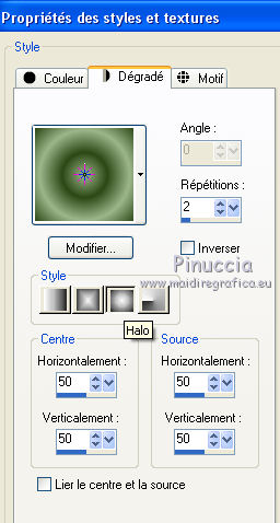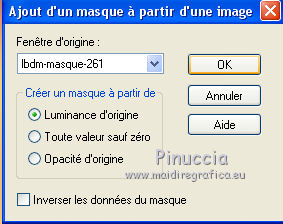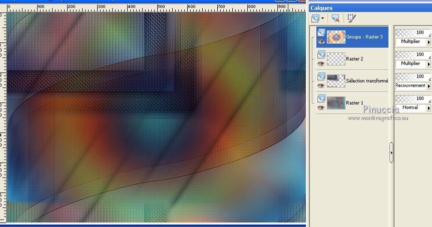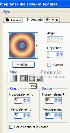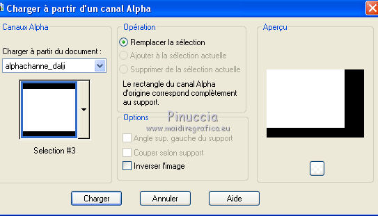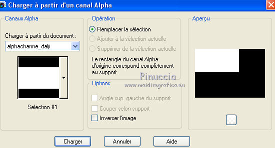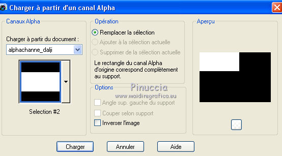 Pour traduire ce tutoriel j'ai utilisé PSPX7, PSPX2 et PSPX3, mais il peut également être exécuté avec les autres versions. Suivant la version utilisée, vous pouvez obtenir des résultats différents. Depuis la version X4, la fonction Image>Miroir a été remplacée par Image>Renverser horizontalement, et Image>Renverser avec Image>Renverser verticalement . Dans les versions X5 et X6, les fonctions ont été améliorées par la mise à disposition du menu Objets. Avec la nouvelle version X7, nous avons encore Image>Miroir et Image>Renverser/Retourner, mais avec nouvelles différences. Voir les détails à ce sujet ici Certaines dénominations ont changées entre les versions de PSP. Les plus frequentes dénominations utilisées: ![]() English translation here Vos versions ici![]() Nécessaire pour réaliser ce tutoriel: Matériel ici Merci pour le masque Mary LBDM. Déco - llegivel. Le reste du matériel est de Maria José. (ici les liens vers les sites des créateurs du matériel) Modules Externes: consulter, si nécessaire, ma section des filtres ici Filters Unlimited 2.0 ici Toadies - Sucking Toad Bevel I, Weaver ici Funhouse - Loom ici Graphics Plus - Weaver ici AP [Lines] - Lines SilverLining ici Carolaine and Sensibility - CS-LDots ici Mura's Seamless - Emboss at Alpha ici FM Tile Tools - Saturation Emboss ici Mura's Meister - Perspective Tiling ici Filtres Toadies, Funhouse, Graphics Plus et Mura's Seamless peuvent être utilisés seuls ou importés dans Filters Unlimited. voir comment le faire ici). Si un filtre est fourni avec cette icône, ![]() en fonction des couleurs utilisées, vous pouvez changer le mode mélange et l'opacité des calques. Dans les plus récentes versions de PSP, vous ne trouvez pas le dégradé d'avant plan/arrière plan ou Corel_06_029. Vous pouvez utiliser le dégradé des versions antérieures. Ici le dossier Dégradés de CorelX. Placer le dégradé dans le dossier Dégradés. Ouvrir les masques dans PSP et les minimiser avec le reste du matériel. Placer en avant plan la couleur #ecaa82, et en arrière plan #5e6b94. ![]() Placer en avant plan Dégradé et sélectionner le dégradé akgradiente67, style Halo. ![]() Si vous utilisez des autres couleurs, préparer un dégradé de premier plan/arrière plan, style Halo, Répétitions 2. ![]() 1. Ouvrir alphachannel_dalji Fenêtre>Dupliquer ou sur le clavier shift+D pour faire une copie. ![]() Fermer l'original. La copie, qui sera la base de votre travail, n'est pas vide, mais contient les sélections enregistrées sur le canal alpha. Remplir l'image transparente du dégradé.2. Réglage>Flou>Flou gaussien- rayon 30. ![]() 3. Effets>Modules Externes>Toadies - *Sucking Toad* - Bevel I, par défaut. ![]() 4. Effets>Modules Externes>Toadies - Weaver. ![]() 5. Effets>Modules Externes>FunHouse - Loom, par défaut. ![]() Répéter l'Effet un dexième fois. 6. Réglage>Netteté>Davantage de netteté. 7. Effets>Effets d'image>Mosaïque sans jointures, Bégaiement diagonale. ![]() 8. Effets>Effets de réflexion>Miroir rotatif. ![]() 9. Sélections>Charger/Enregistrer une sélection>Charger à partir d'un canal alpha. La sélection #1 est déjà disponible. On doit seulement cliquer sur Charger. ![]() ![]() Sélections>Transformer la sélection en calque. 10. Effets>Modules Externes>Graphics Plus - Weaver ![]() 11. Effets>Effets 3D>Ombre portée, couleur #000000. ![]() Sélections>Désélectionner tout. Placer le calque en mode Recouvrement. ![]() 12. Vous positionner sur le calque Raster 1. Sélections>Charger/Enregistrer une sélection>Charger à partir d'un canal alpha. Ouvrir le menu des sélections et charger la sélection #2. ![]() Sélections>Transformer la sélection en calque. Calques>Agencer>Déplacer vers le haut. 13. Effets>Modules Externes>AP [Lines] - Lines SilverLining. ![]() 14. Effets>Modules Externes>Carolaine and Sensibility - CS-LDots. ![]() Effets>Effets 3D>Ombre portée, comme précédemment. Sélections>Désélectionner tout. Calques>Fusionner>Fusionner le calque de dessous. 15. Effets>Effets d'image>Mosaïque sans jointures, Bégaiement diagonale. ![]() 16. Ouvrir le tube decomj1 - Édition>Copier. Revenir sur votre travail et Édition>Coller comme nouveau calque. Placer le calque en mode Multiplier. 17. Calques>Nouveau calque raster. Remplir le calque du dégradé.18. Réglage>Flou>Flou gaussien- rayon 30. ![]() 19. Calques>Nouveau calque de masque>A partir d'une image. Ouvrir le menu deroulant sous la fenêtre d'origine et vous verrez la liste des images ouvertes. Sélectionner le masque lbdm-masque-261. ![]() Calques>Fusionner>Fusionner le groupe. 20. Effets>Modules Externes>Mura's Seamless - Emboss at Alpha, par défaut. ![]() 21. Effets>Modules Externes>FM Tile Tools - Saturation Emboss, par défaut. ![]() Placer le calque en mode Multiplier. ![]() 22. Édition>Copie Spéciale>Copier avec fusion. Édition>Coller comme nouveau calque. 23. Image>Renverser. 24. Effets>Modules Externes>MuRa's Meister - Perspective Tiling. ![]() 25. Effets>Effets de réflexion>Miroir rotatif. ![]() Effets>Effets 3D>Ombre portée, comme précédemment. Calques>Agencer>Déplacer vers le bas - 2 fois. ![]() 26. Vous positionner sur le calque du masque, Groupe-Raster 3. Image>Renverser. 27. Vous positionner sur le calque Raster 2. Calques>Agencer>Placer en haut de la pile. Vous positionner sur le calque Raster 3. ![]() 28. Sélections>Charger/Enregistrer une sélection>Charger à partir d'un canal alpha. Ouvrir le menu des sélections et charger la sélection #3. ![]() Nouveau calque raster. 30. Ouvrir le misted et Édition>Copier. Revenir sur votre travail et Édition>Coller dans la sélection. Placer le calque en mode Lumière dure. Sélections>Désélectionner tout. 31. Calques>Nouveau calque raster. Calques>Agencer>Placer en haut de la pile. Placer en avant plan la Couleur. Remplir le calque avec la couleur #ecaa82.32. Calques>Nouveau calque de masque>A partir d'une image. Ouvrir le menu deroulant sous