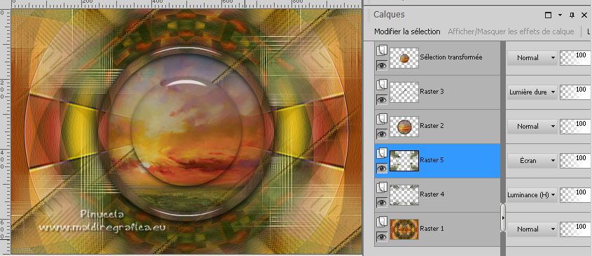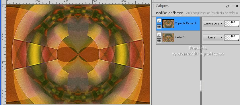 Pour traduire ce tutoriel j'ai utilisé PSPX7, PSPX2 et PSPX3, mais il peut également être exécuté avec les autres versions. Suivant la version utilisée, vous pouvez obtenir des résultats différents. Depuis la version X4, la fonction Image>Miroir a été remplacée par Image>Renverser horizontalement, et Image>Renverser avec Image>Renverser verticalement . Dans les versions X5 et X6, les fonctions ont été améliorées par la mise à disposition du menu Objets. Avec la nouvelle version X7, nous avons encore Image>Miroir et Image>Renverser/Retourner, mais avec nouvelles différences. Voir les détails à ce sujet ici Certaines dénominations ont changées entre les versions de PSP. Les plus frequentes dénominations utilisées: ![]() English translation here Vos versions ici![]() Nécessaire pour réaliser ce tutoriel: ![]() Merci pour le tube Cady Le reste du matériel est de Maria José. (ici les liens vers les sites des créateurs du matériel) ![]() consulter, si nécessaire, ma section des filtres ici Filters Unlimited 2.0 ici Mehdi - Sorting Tiles ici Flaming Pear - Flexify 2 ici Simple - Top Left Mirror ici Texture - Texturizer ici Mura's Meister - Pole Transform ici Alien Skin Eye Candy 5 Impact - Glass ici Filtres Simple peuvent être utilisés seuls ou importés dans Filters Unlimited. voir comment le faire ici). Si un filtre est fourni avec cette icône, ![]() en fonction des couleurs utilisées, vous pouvez changer le mode mélange et l'opacité des calques. Dans les plus récentes versions de PSP, vous ne trouvez pas le dégradé d'avant plan/arriére plan ou Corel_06_029. Vous pouvez utiliser le dégradé des versions antérieures. Ici le dossier Dégradés de CorelX. Placer le preset En cliquant sur le preset une ou deux fois (selon vos réglages) automatiquement il se placera directement dans le dossier Settings de Alien Skin Eye Candy. pourquoi un ou deux clic voir ici ![]() Placer les sélections dans le dossier Sélections Placer en avant plan la couleur #778351 et en arrière plan la couleur #282c1c. ![]() Préparer en avant plan un dégradé de premier plan/arrière plan, style Linéaire. ![]() 1. Ouvrir une nouvelle image transparente 1000 x 700 pixels. Remplir l'image transparente du dégradé.2. Sélections>Sélectionner tout. Ouvrir le misted 2408-MJ-misted et Édition>Copier.Revenir sur votre travail et Édition>Coller dans la sélection. Sélections>Désélectionner tout. 3. Effets>Effets d'image>Mosaïque sans jointures. ![]() 4. Réglage>Flou>Flou gaussien - rayon 30. ![]() 5. Effets>Modules Externes>Mehdi - Sorting Tiles ![]() 6. Effets>Effets de bords>Accentuer davantage. 7. Effets>Modules Externes>Flaming Pear - Flexify 2. ![]() 8. Effets>Effets de réflexion>Miroir rotatif, par défaut. ![]() 9. Effets>Modules Externes>Simple - Top Left Mirror. ![]() 10. Effets>Modules Externes>Texture - Texturizer. ![]() 11. Effets>Modules Externes>Mura's Meister - Pole Transform, par défaut. ![]() 12. Calques>Dupliquer. Image>Renverser. Placer le calque en mode Lumière dure. ![]() Calques>Fusionner>Fusionner le calque de dessous. 13. Sélections>Charger/Enregistrer une sélection>Charger à partir du disque. Chercher et charger la sélection desireeMJ ![]() Sélections>Transformer la sélection en calque. 14. Effets>Effets 3D>Ombre portée, couleur noire. ![]() 15. Sélections>Modifier>Contracter - 25 pixels. Presser CANC sur le clavier ![]() Sélections>Désélectionner tout. 16. Effets>Modules Externes>Alien Skin Eye Candy 5 Impact - Glass. Sélectionner le preset glass-desiree-mj et ok. ![]() 17. Sélections>Charger/Enregistrer une sélection>Charger à partir du disque. Chercher et charger la sélection desiree-1-MJ ![]() 18. Édition>Coller comme nouveau calque (le tube 2408-MJ-misted est toujours en mémoire). ![]() Redimensionner, si nécessaire. Positionner le tube à votre goût.19. Sélections>Inverser. Presser CANC sur le clavier. Sélections>Désélectionner tout. Calques>Agencer>Déplacer vers le bas. Vous positionner sur le calque de dessus Sélection transformée. Calques>Fusionner>Fusionner le calque de dessous. 20. Effets>Effets 3D>Ombre portée, couleur noire. ![]() 21. Sélections>Charger/Enregistrer une sélection>Charger à partir du disque. Chercher et charger la sélection desiree-2-MJ ![]() Sélections>Transformer la sélection en calque. 22. Effets>Modules Externes>Alien Skin Eye Candy 5 Impact - Glass - preset glass-desiree-mj. Sélections>Désélectionner tout. 23. Ouvrir le tube deco-desiree-MJ et Édition>Copier.Revenir sur votre travail et Édition>Coller comme nouveau calque. Calques>Agencer>Déplacer vers le bas. Placer le calque en mode Lumière dure. 24. Vous positionner sur le calque Raster 1. Ouvrir le tube deco-desiree-1-MJ et Édition>Copier.Revenir sur votre travail et Édition>Coller comme nouveau calque. Placer le calque en mode Luminance (héritée). 25. Réglage>Netteté>Netteté. Effets>Effets 3D>Ombre portée, couleur noire. ![]() 26. Ouvrir le tube deco-desiree-2-MJ et Édition>Copier.Revenir sur votre travail et Édition>Coller comme nouveau calque. Placer le calque en mode Écran. La tag et les calques - adapter Mode mélange et opacité à votre goût. ![]() 27. Image>Ajouter des bordures, 1 pixel, symétrique, couleur blanche. Image>Ajouter des bordures, 20 pixels, symétrique, couleur claire d'avant plan. 28. Sélections>Sélectionner tout. Édition>Copier Image>Ajouter des bordures, 30 pixels, symétrique, couleur claire d'avant plan. 29. Sélections>Inverser. Édition>Coller dans la sélection. 30. Effets>Effets 3D>Ombre portée. ![]() 31. Sélections>Inverser. Répéter Effets>Effets 3D>Ombre portée, comme précédemment. Sélections>Désélectionner tout. 32. Ouvrir le tube de la femme woman-Cady ,effacer le watermark et Édition>Copier. Revenir sur votre travail et Édition>Coller comme nouveau calque. Image>Miroir. Image>Redimensionner, à 70%, redimensionner tous les calques décoché. Déplacer le tube