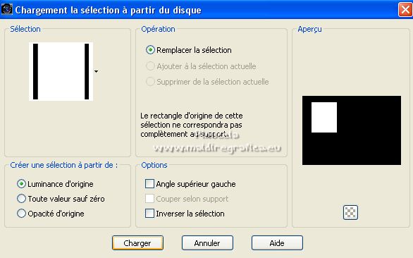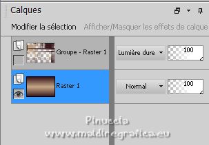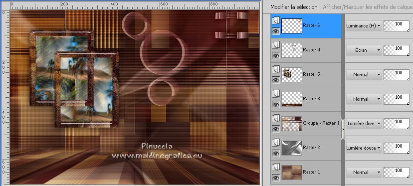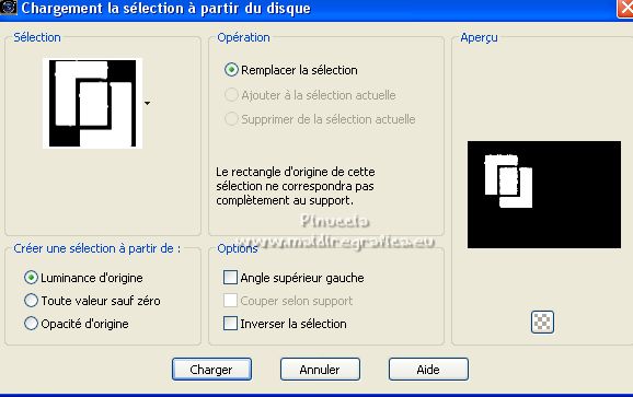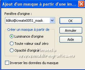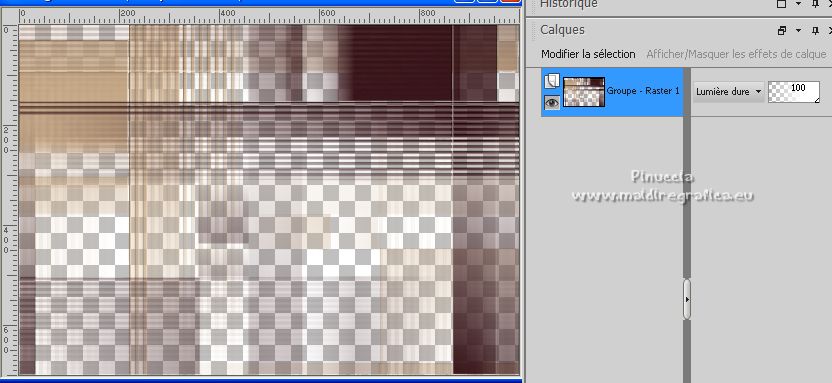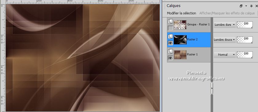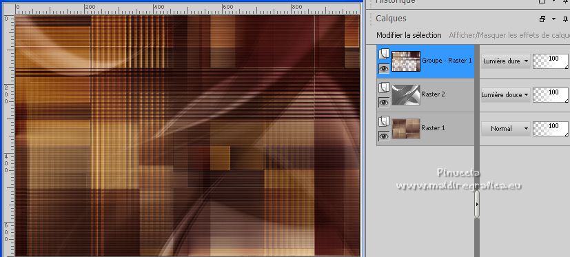 Pour traduire ce tutoriel j'ai utilisé PSPX7, PSPX2 et PSPX3, mais il peut également être exécuté avec les autres versions. Suivant la version utilisée, vous pouvez obtenir des résultats différents. Depuis la version X4, la fonction Image>Miroir a été remplacée par Image>Renverser horizontalement, et Image>Renverser avec Image>Renverser verticalement . Dans les versions X5 et X6, les fonctions ont été améliorées par la mise à disposition du menu Objets. Avec la nouvelle version X7, nous avons encore Image>Miroir et Image>Renverser/Retourner, mais avec nouvelles différences. Voir les détails à ce sujet ici Certaines dénominations ont changées entre les versions de PSP. Les plus frequentes dénominations utilisées: ![]() English translation here Vos versions ici![]() Nécessaire pour réaliser ce tutoriel: ![]() Merci pour le tube Tocha et pour les masques Ildiko et Franie Margot. Le reste du matériel est de Maria José. (ici les liens vers les sites des créateurs du matériel) ![]() consulter, si nécessaire, ma section des filtres ici Filters Unlimited 2.0 ici Mehdi - Sorting Tiles ici RCS Filter Pak 1.0 - RCS Triple Exposure ici Carolaine and Sensibility - CS_Texture ici Mura's Meister - Perspective Tiling ici Alien Skin Eye Candy 5 Impact - Glass ici Mura's Seamless - Emboss at Alpha ici Filtres Mura's Seamless peuvent être utilisés seuls ou importés dans Filters Unlimited. voir comment le faire ici). Si un filtre est fourni avec cette icône, ![]() en fonction des couleurs utilisées, vous pouvez changer le mode mélange et l'opacité des calques. Dans les plus récentes versions de PSP, vous ne trouvez pas le dégradé d'avant plan/arriére plan ou Corel_06_029. Vous pouvez utiliser le dégradé des versions antérieures. Ici le dossier Dégradés de CorelX. Placer le preset En cliquant sur le preset une ou deux fois (selon vos réglages) automatiquement il se placera directement dans le dossier Settings de Alien Skin Eye Candy. pourquoi un ou deux clic voir ici ![]() Placer les sélections dans le dossier Sélections. Ouvrir les masque dans PSP et les minimiser avec le reste du matériel. Placer en avant plan la couleur foncée #38161a, et en arrière plan la couleur claire #c6a987. ![]() Préparer en avant plan un dégradé de premier plan/arrière plan, style Linéaire. ![]() Pour le moment, placer en avant plan la Couleur. 1. Ouvrir une nouvelle image transparente 1000 x 700 pixels. Remplir l'image transparente avec la couleur claire d'arrière plan #c6a987.2. Image>Pivoter vers la gauche (ou Rotation à gauche) ![]() 3. Calques>Nouveau calque de masque>A partir d'une image. Ouvrir le menu deroulant sous la fenêtre d'origine et vous verrez la liste des images ouvertes. Sélectionner le masque ildiko@create0051_mask ![]() Calques>Fusionner>Fusionner le groupe. 4. Effets>Modules Externes>Mura's Seamless - Emboss at Alpha, par défaut. ![]() Image>Piveter vers la droite (ou Rotation à droite) ![]() 5. Calques>Nouveau calque raster. Remplir le calque avec la couleur foncée d'avant plan #38161a.6. Calques>Nouveau calque de masque>A partir d'une image. Ouvrir le menu deroulant sous la fenêtre d'origine et sélectionner à nouveau le masque ildiko@create0051_mask. ![]() Calques>Fusionner>Fusionner le groupe. 7. Effets>Modules Externes>Mura's Seamless - Emboss at Alpha, par défaut. ![]() 8. Calques>Fusionner>Fusionner le calque de dessous. Image>Renverser. Placer le calque en mode Lumière dure. ![]() 9. Placer en avant plan le dégradé que vous avez préparer au début. Calques>Nouveau calque raster. Calques>Agencer>Déplacer vers le bas. Remplir le calque du dégradé.Fermer le calque du masque, Groupe-Raster 1, et rester sur le calque Raster 1. ![]() 10. Effets>Modules Externes>Mehdi - Sorting Tiles ![]() 11. Effets>Effets de bords>Accentuer davantage. 12. Effets>Modules Externes>RCS Filter Pak 1.0 - RCS Triple Exposure, par défaut. ![]() 13. Effets>Effets d'image>Mosaïque sans jointures. ![]() 14. Calques>Nouveau calque raster. Sélections>Sélectionner tout. Ouvrir le masque masque_11_franiemargot ![]() Édition>Copier. Revenir sur votre travail et Édition>Coller dans la sélection. Sélections>Désélectionner tout. Placer le calque en mode Lumière douce. ![]() 16. Effets>Modules Externes>Carolaine and Sensibility - CS-Texture, par défaut. ![]() 17. Réglage>Netteté>Davantage de netteté. Réouvrir et vous positionner sur le calque du masque Groupe-Raster 1. ![]() 18. Édition>Copie Spéciale>Copier avec fusion 19. Édition>Coller comme nouveau calque. Image>Miroir. 20. Édition>Coller comme nouvelle image, et minimiser cette image. 21. Effets>Modules Externes>Mura's Meister - Perspective Tiling. ![]() 22. Activer l'outil Baguette magique , progressivité 60,et cliquer dans la partie transparente pour la sélectionner. Presser +/-10 fois CANC sur le clavier ![]() Sélections>Désélectionner tout. 23. Sélections>Charger/Enregister une sélection>Charger à partir du disque. Chercher et charger la sélection MJ-elly ![]() 24. Calques>Nouveau calque raster. Édition>Coller dans la sélection (l'image minimisée est toujours en mémoire). ![]() 25. Sélections>Modifier>Contracter - 25 pixels. Presser CANC sur le clavier. Sélections>Désélectionner tout. 26. Réglage>Ajouter/Supprimer du bruit>Ajouter du bruit. ![]() 27. Effets>Modules Externes>Alien Skin Eye Candy 5 Impact - Glass. Sélectionner le preset Glass-Elly-MJ et ok. ![]() 28. Calques>Dupliquer. Touche K sur le clavier pour activer l'outil Sélecteur ![]() et placer Position horiz.: 186,00 et Position vert.: 150,00. ![]() Touche M pour désélectionner l'outil. Calques>Fusionner>Fusionner le calque de dessous. 29. Sélections>Charger/Enregister une sélection>Charger à partir du disque. Chercher et charger la sélection MJ-elly-1 ![]() dans le matériel, la sélection MJ-elly-2 est une alternative si nécessaire. Je ne l'ai pas utilisé. 30. Calques>Nouveau calque raster. Ouvrir le g