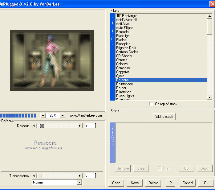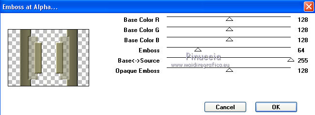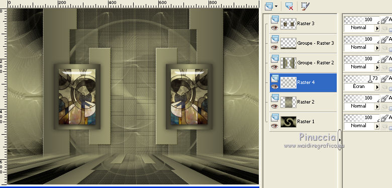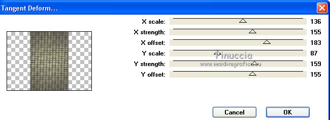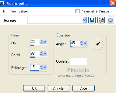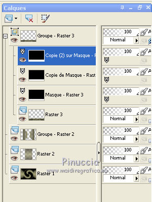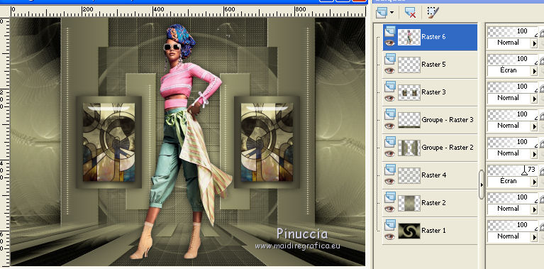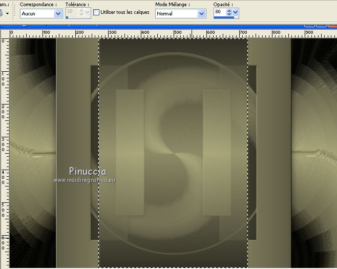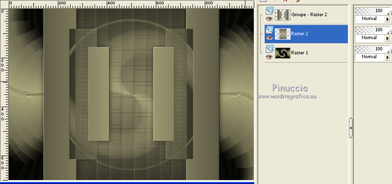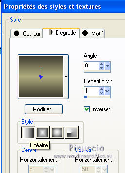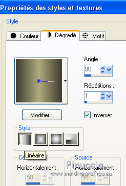 Pour traduire ce tutoriel j'ai utilisé CorelX17, mais il peut également être exécuté avec les autres versions. Suivant la version utilisée, vous pouvez obtenir des résultats différents. Depuis la version X4, la fonction Image>Miroir a été remplacée par Image>Renverser horizontalement, et Image>Renverser avec Image>Renverser verticalement . Dans les versions X5 et X6, les fonctions ont été améliorées par la mise à disposition du menu Objets. Avec la nouvelle version X7, nous avons encore Image>Miroir et Image>Renverser/Retourner, mais avec nouvelles différences. Voir les détails à ce sujet ici Certaines dénominations ont changées entre les versions de PSP. Les plus frequentes dénominations utilisées: ![]() Vos versions iciNécessaire pour réaliser ce tutoriel: Matériel ici Merci pour le masques Ket et Cameron. Le reste du matériel est de Maria José. (ici les liens vers les sites des créateurs de tubes) Modules Externes: consulter, si nécessaire, ma section des filtres ici Filters Unlimited 2.0 ici Distort - Turn Your Inside Outside ici Unplugged Effects - Tangent Deform ici Carolaine and Sensibility - CS-LDots ici Mura's Meister - Perspective Tiling ici Mura's Seamless - Emboss at Alpha ici Alien Skin Eye Candy 5 Impact - Glass ici VanDerLee - Unplugged-X ici Filtres Unplugged Effects peuvent être utilisés seuls ou importés dans Filters Unlimited. voir comment le faire ici). Si un filtre est fourni avec cette icône, ![]() en fonction des couleurs utilisées, vous pouvez changer le mode mélange et l'opacité des calques. Dans les plus récentes versions de PSP, vous ne trouvez pas le dégradé d'avant plan/arrière plan ou Corel_06_029. Vous pouvez utiliser le dégradé des versions antérieures. Ici le dossier Dégradés de CorelX. Placer le preset En cliquant sur le preset une ou deux fois (selon vos réglages) automatiquement il se placera directement dans le dossier Settings de Alien Skin Eye Candy. pourquoi un ou deux clic voir ici Placer les sélections dans le dossier Sélections Placer le masque !!!.mask.kete-fadesuave-1 dans le dossier Masques. Ouvrir le masque de Cameron dans PSP et le minimiser avec le reste du matériel. Choisir deux couleur du graphique. Placer en avant plan la couleur claire; pour moi #aeab7e, et en arrière plan la couleur foncée; pour moi #3e3c2f. ![]() Préparer en avant plan un dégradé de premier plan/arrière plan, style Linéaire. ![]() Préparer en arrière plan un dégradé de premier plan/arrière plan, style Linéaire. ![]() ![]() 1. Ouvrir une nouvelle image transparente 1000 x 700 pixels. Remplir l'image transparente avec le dégradé d'avant plan.2. Effets>Effets de textures>Pierre polie, couleur #ffffff ![]() 3. Effets>Effets de réflexion>Résonance ![]() Effets>Effets de distorsion>Torsion ![]() 5. Effets>Modules Externes>Distort - Turn Your Inside Outside. ![]() 6. Calques>Nouveau calque raster. Remplir le calque avec le dégradé d'arrière plan.![]() 7. Calques>Nouveau calque de masque>A partir d'une image. Ouvrir le menu deroulant sous la fenêtre d'origine et vous verrez la liste des images ouvertes. Sélectionner le masque maskzephir2_camerontags. ![]() Calques>Fusionner>Fusionner le groupe. 8. Effets>Modules Externes>Mura's Seamless - Emboss at Alpha, par défaut. ![]() Effets>Effets 3D>Ombre portée, couleur noire. ![]() 9. Sélections>Charger/Enregistrer une sélection>Charger à partir du disque. Chercher et charger la sélection sel_1_mj. ![]() 10. Calques>Nouveau calque raster. Réduire l'opacité de l'outil Pot de peinture à 80%. Remplir le calque avec le dégradé d'avant plan.![]() Sélections>Désélectionner tout. 11. Effets>Modules Externes>Unplugged Effects - Tangent Deform. ![]() 12. Effets>Modules Externes>Carolaine and Sensibility - CS-LDots. ![]() Calques>Agencer>Déplacer vers le bas. ![]() 13. Vous positionner sur le calque du haut de la pile, Groupe-Raster 2. Édition>Copie Spéciale>Copier avec fusion. Édition>Coller comme nouveau calque. 14. Effets>Modules Externes>Mura's Meister - Perspective Tiling. ![]() 15. Calques>Charger/Enregistrer un masque>Charger à partir du disque. Chercher et charger le masque !!!.mask.ket-fadesuave-1. ![]() Calques>Dupliquer - 2 fois ![]() Calques>Fusionner>Fusionner le groupe. 16. Sélections>Charger/Enregistrer une sélection>Charger à partir du disque. Chercher et charger la sélection sel_mj. ![]() 17. Placer à nouveau l'opacité de l'outil Pot de peinture à 100 Remplir la sélection avec le dégradé d'arrière plan.![]() 18. Sélections>Modifier>Contracter - 20 pixels. Calques>Nouveau calque raster. 19. Ouvrir le graphique 01 - Édition>Copier. Revenir sur votre travail et Édition>Coller dans la sélection. 20. Effets>Modules Externes>Alien Skin Eye Candy 5 Impact - Glass. Sélectionner le preset glass_majo et ok. ![]() Calques>Fusionner>Fusionner le calque de dessous. Sélections>Désélectionner tout. Effets>Effets 3D>Ombre portée, couleur noire. ![]() 21. Calques>Dupliquer. Image>Miroir. Calques>Fusionner>Fusionner le calque de dessous. 22. Ouvrir le tube decoemanuelle_mj - Édition>Copier. Revenir sur votre travail et Édition>Coller comme nouveau calque. Calques>Agencer>Déplacer vers le bas - 3 fois. Placer le calque en mode Écran et réduire l'opacité à 73%. ![]() 23. Ouvrir le tube decoemanuelle_1_mj - Édition>Copier. Revenir sur votre travail et Édition>Coller comme nouveau calque. Calques>Agencer>Placer en haut de la pile. Effets>Effets d'image>Décalage. ![]() Placer le calque en mode Écran ou autre. 24. Ouvrir le tube de la femme - Édition>Copier. Revenir sur votre travail et Édition>Coller comme nouveau calque. Image>Redimensionner, à 95%, redimensionner tous les calques décoché. Positionner bien le tube.Effets>Effets 3D>Ombre portée à choix. La tag et les calques (adapter les modes mélange en fonction de vos couleurs) ![]() 25. Image>Ajouter des bordures, 1 pixel, symétrique, couleur claire. Image>Ajouter de