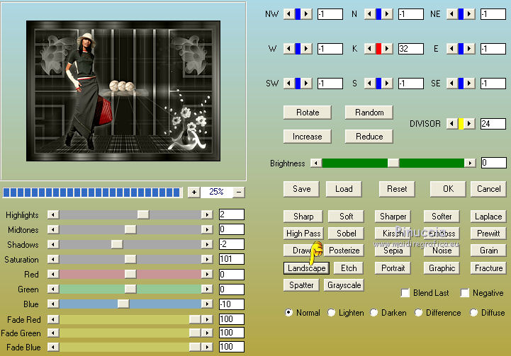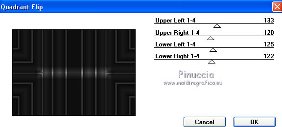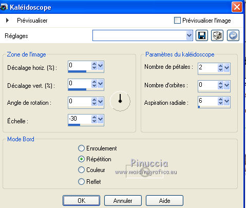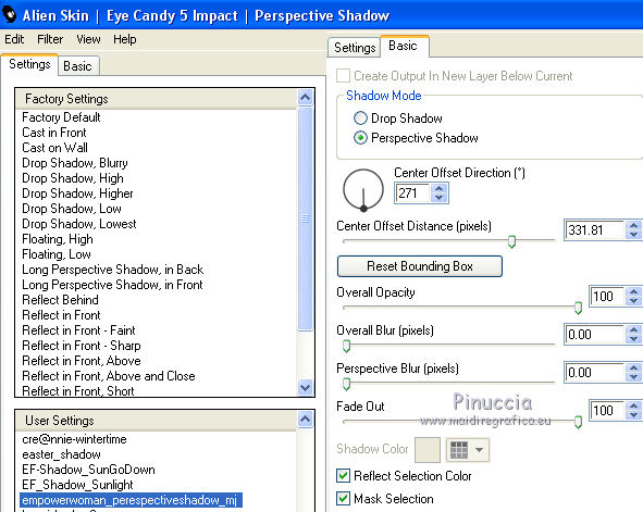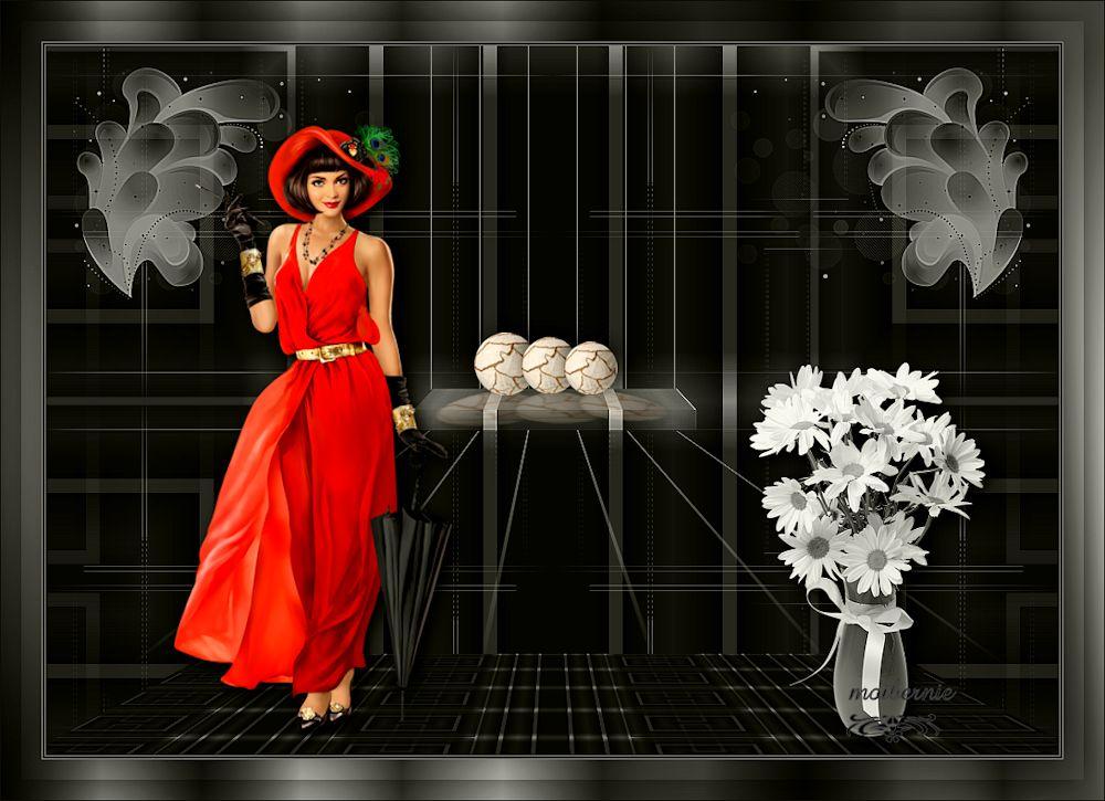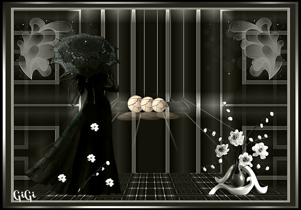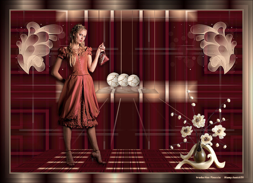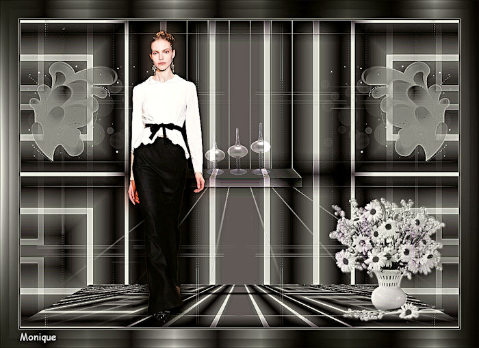 Pour traduire ce tutoriel j'ai utilisé CorelX12, mais il peut également être exécuté avec les autres versions. Suivant la version utilisée, vous pouvez obtenir des résultats différents. Depuis la version X4, la fonction Image>Miroir a été remplacée par Image>Renverser horizontalement, et Image>Renverser avec Image>Renverser verticalement . Dans les versions X5 et X6, les fonctions ont été améliorées par la mise à disposition du menu Objets. Avec la nouvelle version X7, nous avons encore Image>Miroir et Image>Renverser/Retourner, mais avec nouvelles différences. Voir les détails à ce sujet ici Certaines dénominations ont changées entre les versions de PSP. Les plus frequentes dénominations utilisées: ![]() Vos versions Nécessaire pour réaliser ce tutoriel: Matériel ici Pour les tubes merci Ann et Edwige. Le reste du matériel est de Maria José. (les liens des sites des tubeuses ici) Modules Externes: consulter, si nécessaire, ma section des filtres ici Filters Unlimited 2.0 ici Mura's Meister - Perspective Tiling ici Mirror Rave - Quadrant Flip ici Alien Skin Eye Candy 5 Impact - Perspective Shadow, Extrude ici Graphics Plus ici AAA Filters - Custom ici Filtres Mirror Rave et Graphics Plus peuvent être utilisés seuls ou importés dans Filters Unlimited. voir comment le faire ici). Si un filtre est fourni avec cette icône, ![]() en fonction des couleurs utilisées, vous pouvez changer le mode mélange et l'opacité des calques. Dans les plus récentes versions de PSP, vous ne trouvez pas le dégradé d'avant plan/arrière plan ou Corel_06_029. Vous pouvez utiliser le dégradé des versions antérieures. Ici le dossier Dégradés de CorelX. Placer les presets En cliquant sur le preset une ou deux fois (selon vos réglages) automatiquement il se placera directement dans le dossier Settings de Alien Skin Eye Candy. pourquoi un ou deux clic voir ici Placer les pinceaux dans le dossier Pinceaux. Attention, chaque pinceau se compose de deux files qu'il ne faut pas séparer. Consulter, si vous voulez, les notes sur les pinceaux ici Placer le preset Pick empowerwoman_mj dans le dossier Paramètres par défaut. Placer les sélections dans le dossier Sélections Placer en avant plan la couleur #8e8e8e, et en arrière plan la couleur #2c2c2c. ![]() Préparer en avant plan un dégradé de premier plan/arrière plan, style Linéaire. ![]() 1. Ouvrir une nouvelle image transparente 1000 x 700 pixels. Remplir l'image transparente du dégradé.2. Effets>Effets de réflexion>Miroir rotatif. ![]() 3. Sélections>Charger/Enregistrer une sélection>Charger à partir du disque. Chercher et charger la sélection empower_mj. ![]() Presser CANC sur le clavier .![]() Sélections>Désélectionner tout. 4. Calques>Dupliquer. Image>Rotation libre - 90 degrés à gauche. ![]() 5. Activer l'outil Sélecteur ![]() ouvrir le menu des preset et sélectionner le preset empowerwoman_mj ![]() Vous aurez ce-ci ![]() 6. Vous positionner sur le calque Raster 1. Sélections>Sélectionner tout. Vous positionner sur le calque du haut Copie de Raster 1. Image>Recadrer sur la sélection. Placer le calque en mode Multiplier. Calques>Fusionner>Fusionner le calque de dessous. 7. Effets>Effets de réflexion>Kaléïdoscope. ![]() 8. Effets>Effets de réflexion>Miroir rotatif. ![]() 9. Effets>Modules Externes>Mirror Rave - Quadrant Flip, par défaut. ![]() 10. Effets>Effets d'image>Mosaïque sans jointures. ![]() 11. Réglage>Netteté>Davantage de netteté. Si votre image est trop foncée: Réglage>Traitement rapide des photos. ![]() 12. Calques>Nouveau calque raster. Placer en avant plan la couleur. ![]() 13. Activer l'outil Pinceau ![]() chercher et sélectionner le pinceau linhas_1_mj. ![]() Appliquer le pinceau en haut, en cliquant deux fois avec la touche gauche de la souris, pour utiliser la couleur d'avant plan. ![]() 14. Effets>Modules Externes>Alien Skin Eye Candy 5 Impact - Perspective Shadow. Sélectionner le preset empowerwoman_perespectiveshadow_mj et ok. Ci-dessous les réglages, en cas de problèmes avec le preset. ![]() 15. Activer l'outil Sélecteur ![]() et placer Position horiz.: 80,00 et Position vert.: -50,00. ![]() Touche M pour désélectionner l'outil. 16. Vous positionner sur le calque Raster 1. Sélections>Charger/Enregistrer une sélection>Charger à partir du disque. Chercher et charger la sélection empower_1_mj. ![]() Sélections>Transformer la sélection en calque. Calques>Agencer>Placer en haut de la pile. 17. Effets>Modules Externes>Alien Skin Eye Candy 5 Impact - Extrude. Sélectionner le preset presetextrude_empowerwoman_mj et ok. ![]() Sélections>Désélectionner tout. 18. Réglage>Traitement rapide des photos. ![]() 19. Calques>Nouveau calque raster. Garder la couleur claire en avant plan. 20. Activer l'outil Pinceau ![]() chercher et sélectionner le pinceau abstract2, taille 300. ![]() Appliquer le pinceau en haut à gauche, toujours avec la couleur claire d'avant plan. ![]() 21. Calques>Dupliquer. Image>Miroir. Calques>Fusionner>Fusionner le calque de dessous. Réglage>Netteté>Davantage de netteté. 22. Vous positionner sur le calque Raster 1. Calques>Dupliquer. 23. Effets>Modules Externes>Mura's Meister - Perspective Tiling, par défaut. ![]() 24. Effets>Effets d'image>Décalage. ![]() 25. Sélections>Charger/Enregistrer une sélection>Charger à partir du disque. Chercher et charger la sélection empower_2_mj. ![]() Presser CANC sur le clavier. Sélections>Désélectionner tout. 26. Ouvrir le deco empoweredwoman_mj - Édition>Copier. Revenir sur votre travail et Édition>Coller comme nouveau calque. Calques>Agencer>Déplacer vers le bas. Réduire l'opacité de ce calque à 50%. 27. Ouvrir le tube deco empoweredwoman_1_mj - Édition>Copier. Revenir sur votre travail et Édition>Coller comme nouveau calque. Calques>Agencer>Placer en haut de la pile. Positionner le tube sur l'étagère![]() 28. Ouvrir le tube du vase - Édition>Copier. Revenir sur votre travail et Éd
