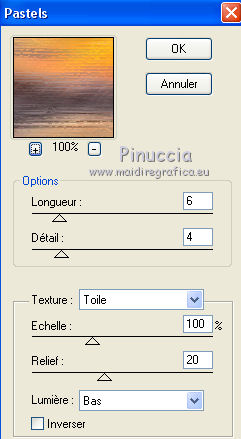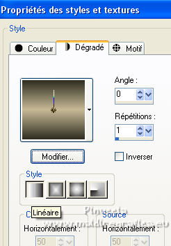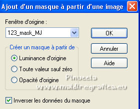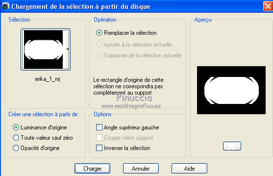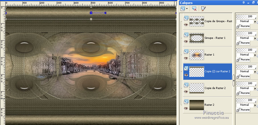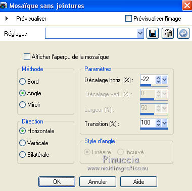 Pour traduire ce tutoriel j'ai utilisé PSPX7, PSPX2 et PSPX3, mais il peut également être exécuté avec les autres versions. Suivant la version utilisée, vous pouvez obtenir des résultats différents. Depuis la version X4, la fonction Image>Miroir a été remplacée par Image>Renverser horizontalement, et Image>Renverser avec Image>Renverser verticalement . Dans les versions X5 et X6, les fonctions ont été améliorées par la mise à disposition du menu Objets. Avec la nouvelle version X7, nous avons encore Image>Miroir et Image>Renverser/Retourner, mais avec nouvelles différences. Voir les détails à ce sujet ici Certaines dénominations ont changées entre les versions de PSP. Les plus frequentes dénominations utilisées: ![]() English translation here Vos versions ici![]() Nécessaire pour réaliser ce tutoriel: Matériel ici Pour les tubes et un masque merci Csilla, Nena Silva et Noe. Le reste du matériel est de Maria José. (ici les liens vers les sites des créateurs du matériel) Modules Externes: consulter, si nécessaire, ma section des filtres ici Filters Unlimited 2.0 ici Mura's Seamless - Emboss at Alpha ici Flaming Pear - Flexify 2 ici Alien Skin Eye Candy 5 Impact - Glass ici Simple - Top Left Mirror ici Fantastic Machine - Paint Engine ici Artistiques - Pastels ici AAA Frames - Foto Frame /AAA Filters - Custom ici Filtres Simple et Mura's Seamless peuvent être utilisés seuls ou importés dans Filters Unlimited. voir comment le faire ici). Si un filtre est fourni avec cette icône, ![]() en fonction des couleurs utilisées, vous pouvez changer le mode mélange et l'opacité des calques. Dans les plus récentes versions de PSP, vous ne trouvez pas le dégradé d'avant plan/arrière plan ou Corel_06_029. Vous pouvez utiliser le dégradé des versions antérieures. Ici le dossier Dégradés de CorelX. Placer le preset En cliquant sur le preset une ou deux fois (selon vos réglages) automatiquement il se placera directement dans le dossier Settings de Alien Skin Eye Candy. pourquoi un ou deux clic voir ici Placer le preset pour Flexify dans un dossier à choix. Placer les sélections dans le dossier Sélections. Ouvrir les masques dans PSP et les minimiser avec le reste du matériel. 1. Placer en avant plan la couleur #2f2e21. et en arrière plan la couleur #c7b996. ![]() Préparer en avant plan un dégradé de premier plan/arrière plan, style Linéaire. ![]() Ouvrir une nouvelle image transparente 1000 x 700 pixels. Remplir l'image transparente du dégradé.2. Calques>Nouveau calque de masque>A partir d'une image. Ouvrir le menu deroulant sous la fenêtre d'origine et vous verrez la liste des images ouvertes. Sélectionner le masque 123_mask-mj, Inverser les données du masque coché. ![]() Calques>Fusionner>Fusionner le groupe. 3. Effets>Effets de textures>Textile couleur du tissage: couleur d'avant plan couleur des interstices: couleur d'arrière plan ![]() 4. Effets>Modules Externes>Mura's Seamless - Emboss at Alpha, par défaut. ![]() 5. Effets>Effets de réflexion>Miroir rotatif, par défaut ![]() Calques>Dupliquer. 6. Effets>Modules Externes>Flaming Pear - Flexify 2. Cliquer sur le bouton rouge et chercher le preset dans le dossier où vous l'avez copié ![]() Ci-dessous les réglages en cas de problèmes avec le preset. Il peut arriver que le preset bloque et ferme PSP (ça m'est arrivé avec la version utilisée pour la traduction anglaise). Si vous le souhaitez, enregistrez votre travail avant d'appliquer le filtre. ![]() 7. Sélections>Charger/Enregistrer une sélection>Charger à partir du disque. Chercher et charger la sélection erika_mj. ![]() 8. Calques>Nouveau calque raster. Remplir le calque du dégradé.Effets>Effets de textures>Textile, comme précédemment. 9. Effets>Modules Externes>Alien Skin Eye Candy 5 Impact - Glass. Sélectionner le preset glass_majo et ok. ![]() 10. Effets>Modules Externes>Simple - Top Left Mirror. ![]() Calques>Fusionner>Fusionner le calque de dessous. Sélections>Désélectionner tout. 11. Image>Redimensionner, à 64%, redimensionner tous les calques décoché. 12. Effets>Effets d'image>Mosaïque sans jointures. ![]() 13. Effets>Effets de réflexion>Miroir rotatif, par défaut ![]() 14. Effets>Effets 3D>Ombre portée, couleur foncée. ![]() Vous positionner sur le calque du masque Groupe-Raster 1. Édition>Répéter Ombre portée. 15. Sélections>Charger/Enregistrer une sélection>Charger à partir du disque. Chercher et charger la sélection erika_1_mj. ![]() Calques>Nouveau calque raster. Calques>Agencer>Déplacer vers le bas. 16. Ouvrir le misted, garder la sélection et Édition>Copier. Revenir sur votre travail et Édition>Coller dans la sélection. Sélections>Désélectionner tout. 17. Calques>Nouveau calque raster. Calques>Agencer>Placer en bas de la pile. Remplir le calque du dégradé.18. Effets>Modules Externes>Fantastic Machine - Paint Engine - preset Fractoil. ![]() 19. Calques>Dupliquer. Activer l'outil Sélecteur ![]() en mode Échelle ![]() tirer le noeud supérieur central vers le bas jusqu'à 625 pixels. ![]() 20. Calques>Dupliquer. Image>Renverser. La tag et les calques; régler Modes melange et opacités à votre goût. ![]() Calques>Fusionner>Calques visibles. 21. Calques>Dupliquer. Image>Redimensionner, à 83%, redimensionner tous les calques décoché. 22. Effets>Effets 3D>Ombre portée, couleur noire. ![]() Vous positionner sur le calque Fusionné. 23. Effets>Effets de distorsion>Vent - vers la droite, intensité 100. ![]() 24. Effets>Modules Externes>Artistiques - Pastels Si vous utilisez la version anglaise du filtre: Artistic - Rough Pastels ![]() 25. Effets>Modules Externes>Simple - Top Left Mirror. ![]() 26. Réglage>Netteté>Netteté. 27. Effets>Modules Externes>AAA Frames - Foto Frame. ![]() 28. Répéter Effets>Modules Externes>AAA Frames - Foto Frame, width à 25. ![]() Calques>Fusionner>Calques visibles. 29. Optionnel: Touches shift+G sur le clavier pour activer Correction Gamma Ci-d
