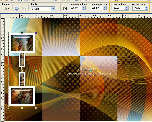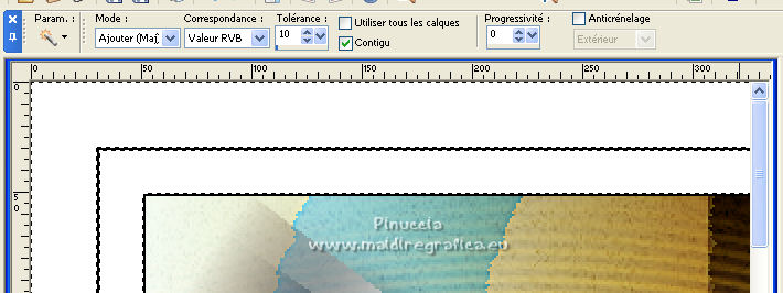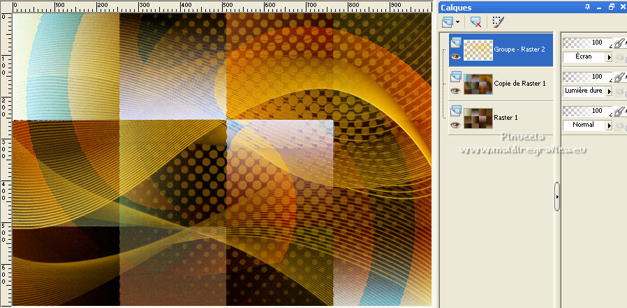 Pour traduire ce tutoriel j'ai utilisé PSPX7, PSPX2 et PSPX3, mais il peut également être exécuté avec les autres versions. Suivant la version utilisée, vous pouvez obtenir des résultats différents. Depuis la version X4, la fonction Image>Miroir a été remplacée par Image>Renverser horizontalement, et Image>Renverser avec Image>Renverser verticalement . Dans les versions X5 et X6, les fonctions ont été améliorées par la mise à disposition du menu Objets. Avec la nouvelle version X7, nous avons encore Image>Miroir et Image>Renverser/Retourner, mais avec nouvelles différences. Voir les détails à ce sujet ici Certaines dénominations ont changées entre les versions de PSP. Les plus frequentes dénominations utilisées: ![]() English translation here Vos versions ici![]() Nécessaire pour réaliser ce tutoriel: ![]() Merci Tine pour le masque. Le reste du matériel est de Maria José. (ici les liens vers les sites des créateurs du matériel) ![]() consulter, si nécessaire, ma section des filtres ici Filters Unlimited 2.0 ici Filter Factory Gallery U - Serrate ici Filter Factory Gallery J - Drink to me ici Neology - Blend Mosaic ici Plugins AB03 - Weird Angles ici Mura's Seamless - Emboss at Alpha ici Artistic - Rough Pastels ici VM Stylize - Zoom Blur ici Mura's Meister - Perspective Tiling ici Alien Skin Eye Candy 5 Impact - Glass ici Filtres Factory Gallery, Plugins AB, Neology, VM Stylize et Mura's Seamless peuvent être utilisés seuls ou importés dans Filters Unlimited. voir comment le faire ici). Si un filtre est fourni avec cette icône, ![]() en fonction des couleurs utilisées, vous pouvez changer le mode mélange et l'opacité des calques. Placer le preset En cliquant sur le preset une ou deux fois (selon vos réglages) automatiquement il se placera directement dans le dossier Settings de Alien Skin Eye Candy. pourquoi un ou deux clic voir ici ![]() Placer la sélection dans le dossier Sélections. Ouvrir le masque dans PSP et le minimiser avec le reste du matériel. 1. Choisir deux couleurs de votre image. Placer en avant plan la couleur claire: #fdb302 et en arrière plan la couleur foncée #2f0400. ![]() 2. Ouvrir une nouvelle image transparente 1000 x 700 pixels. Sélections>Sélectionner tout. 3. Ouvrir le graphique casario et Édition>Copier. Minimiser l'image. Revenir sur votre travail et Édition>Coller dans la sélection. Sélections>Désélectionner tout. 4. Effets>Effets d'image>Mosaïque sans jointures. ![]() 5. Effets>Modules Externes>Neology - Blend Mosaic. ![]() Calques>Dupliquer. 6. Effets>Modules Externes>Filters Unlimited 2.0 - Plugins AB 03 - Weird Angles, par défaut. ![]() 7. Effets>Modules Externes>Filters Unlimited 2.0 - Filter Factory Gallery U - Serrate, par défaut. ![]() 8. Réglage>Netteté>Davantage de netteté. Placer le calque en mode Lumière dure. Vous positionner sur le calque Raster 1. 9. Effets>Modules Externes>Filters Unlimited 2.0 - Paper Textures - Mineral Paper, Limestone. ![]() 10. Calques>Nouveau calque raster. Calques>Agencer>Placer en haut de la pile. Remplir le calque avec la couleur claire #fdb302.11. Calques>Nouveau calque de masque>A partir d'une image. Ouvrir le menu deroulant sous la fenêtre d'origine et vous verrez la liste des images ouvertes. Sélectionner le masque creation.tine_mask345 . ![]() Calques>Fusionner>Fusionner le groupe. 12. Effets>Modules Externes>Mura's Seamless - Emboss at Alpha, par défaut. ![]() Image>Renverser. Placer le calque en mode Écran. ![]() 13. Ouvrir cadrebco_mj et Édition>Copier. Revenir sur votre travail et Édition>Coller comme nouveau calque. Ne pas déplacer. 14. Sélections>Charger/Enregistrer une sélection>Charger à partir du disque. Chercher et charger la sélection cadrebco_mj ![]() 15. Calques>Nouveau calque raster. Activer à nouveau l'image casario et Édition>Copier. Revenir sur votre travail et Édition>Coller dans la sélection. 16. Effets>Modules Externes>Artistic - Rough Pastels, par défaut si vous utilisez la version française de ce filtre le résultat ne change pas Effets>Modules Externes>Artistiques - Pastels. ![]() 17. Effets>Modules Externes>Alien Skin Eye Candy 5 Impact - Glass sélectionner le preset Glass_majo et ok. ![]() Calques>Agencer>Déplacer vers le bas. Vous positionner sur le calque Raster 2. Calques>Fusionner>Fusionner le calque de dessous. Sélections>Désélectionner tout. 18. Touche K sur le clavier pour activer l'outil Sélecteur ![]() et placer Position horiz.: 25,00 et Position vert.: 100,00. ![]() Touche M pour désélectionner l'outil. 19. Calques>Dupliquer. Image>Miroir. Calques>Fusionner>Fusionner le calque de dessous. Calques>Dupliquer. 20. Effets>Modules Externes>VM Stylize - Zoom Blur, par défaut. ![]() 21. Effets>Effets de réflexion>Miroir rotatif, par défaut. ![]() 22. Calques>Agencer>Déplacer vers le bas. Vous positionner sur le calque Raster 3. Calques>Fusionner>Fusionner le calque de dessous. 23. Touche K pour activer l'outil Sélecteur ![]() et placer Position horiz. et vert. à 0,00. ![]() Touche M pour désélectionner l'outil. Effets>Effets 3D>Ombre portée, couleur noire. ![]() 24.Édition>Copie Spéciale>Copier avec fusion Édition>Coller comme nouveau calque. 25. Effets>Modules Externes>Mura's Meister - Perspective Tiling. ![]() 26. Activer l'outil Baguette magique , tolérance et progressivité 0,et cliquer dans l'espace transparent pour le sélectionner. 27. Sélections>Modifier>Progressivité Intérieure/Extérieure. ![]() Presser +/- 10 fois CANC sur le clavier ![]() Sélections>Désélectionner tout. 28. Effets>Effets de réflexion>Miroir rotatif. ![]() Répéter Effets>Effets de réflexion>Miroir rotatif, par défaut. ![]() Calques>Agencer>Déplacer vers le bas - 2 fois. La tag et les calques - adapter Mode mélange selon vos couleurs ![]() 29. Vous positionner sur le calque du haut de la pile. Ouvrir le tube de la femme mariajoseMJ-278 et Édition>Copier. Revenir sur votre travail et Édition>Coller com