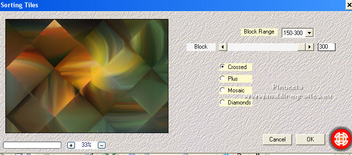 Pour traduire ce tutoriel j'ai utilisé PSPX7, PSPX2 et PSPX3, mais il peut également être exécuté avec les autres versions. Suivant la version utilisée, vous pouvez obtenir des résultats différents. Depuis la version X4, la fonction Image>Miroir a été remplacée par Image>Renverser horizontalement, et Image>Renverser avec Image>Renverser verticalement . Dans les versions X5 et X6, les fonctions ont été améliorées par la mise à disposition du menu Objets. Avec la nouvelle version X7, nous avons encore Image>Miroir et Image>Renverser/Retourner, mais avec nouvelles différences. Voir les détails à ce sujet ici Certaines dénominations ont changées entre les versions de PSP. Les plus frequentes dénominations utilisées: ![]() English translation here Vos versions ici![]() Nécessaire pour réaliser ce tutoriel: ![]() Le matériel est de Maria José. (ici les liens vers les sites des créateurs du matériel) ![]() consulter, si nécessaire, ma section des filtres ici Filters Unlimited 2.0 ici Mehdi - Sorting Tiles ici Mura's Meister - Copies ici Mura's Meister - Perspective Tiling ici Funhouse - Tremors ici Mura's Seamless - Emboss at Alpha ici Optionnel AAA Filters - Custom ici Filtres Funhouse et Mura's Seamless peuvent être utilisés seuls ou importés dans Filters Unlimited. voir comment le faire ici). Si un filtre est fourni avec cette icône, ![]() en fonction des couleurs utilisées, vous pouvez changer le mode mélange et l'opacité des calques. ![]() Placer les sélections dans le dossier Sélections Ouvrir le masque dans PSP et le minimiser avec le reste du matériel. 1. Ouvrir une nouvelle image transparente 1000 x 700 pixels. 2. Sélections>Sélectionner tout. Ouvrir l'image d'arrière plan grafico ![]() Édition>Copier. Revenir sur votre travail et Édition>Coller dans la sélection. Sélections>Désélectionner tout. 3. Réglage>Flou>Flou radial. ![]() Calques>Dupliquer. 4. Effets>Effets géométriques>Perspective Horizontale. ![]() 5. Répéter Effets>Effets géométriques>Perspective Horizontale -95. ![]() ![]() 6. Effets>Effets de distorsion>Cintrage. ![]() 7. Effets>Effets de distorsion>Torsion. ![]() 8. Effets>Modules Externes>Mura's Meister - Copies. ![]() 9. Effets>Effets d'image>Décalage. ![]() Effets>Effets 3D>Ombre portée, couleur noire. ![]() 10. Ouvrir le misted ![]() Si vous utilisez une votre image, appliquer le masque 20-20, ou choisissez un misted. Édition>Copier. Revenir sur votre travail et vous positionner sur le calque Raster 1. 11. Sélections>Charger/Enregistrer une sélection>Charger à partir du disque. Chercher et charger la sélection explosion-MJ ![]() Sélections>Transformer la sélection en calque. 12. Édition>Coller dans la sélection. Sélections>Désélectionner tout. 13. Vous positionner sur le calque Copie de Raster 1. Calques>Fusionner>Fusionner le calque de dessous. 14. Calques>Dupliquer. Image>Miroir. Calques>Fusionner>Fusionner le calque de dessous. 15. Effets>Effets de réflexion>Miroir rotatif, par défaut. ![]() 16. Effets>Effets d'image>Mosaïque sans jointures. ![]() 17. Fermer le calque sélection transformée. Vous positionner sur le calque Raster 1. Effets>Modules Externes>Mehdi - Sorting Tiles. ![]() 18. Effets>Effets d'image>Mosaïque sans jointures. ![]() 19. Effets>Modules Externes>Funhouse - Tremors, par défaut. ![]() Répéter l'Effet une deuxième fois. Réglage>Netteté>Davantage de netteté. Calques>Dupliquer. 20. Effets>Modules Externes>Mura's Meister - Perspective Tiling. ![]() 21. Sélections>Charger/Enregistrer une sélection>Charger à partir du disque. Chercher et charger la sélection explosion-1-MJ ![]() Presser +/-10 fois CANC sur le clavier ![]() Sélections>Désélectionner tout. 22. Placer en avant plan une couleur claire de votre image; pour moi #e48928. Calques>Nouveau calque raster. Remplir le calque avec la couleur d'avant plan.23. Calques>Nouveau calque de masque>A partir d'une image. Ouvrir le menu deroulant sous la fenêtre d'origine et vous verrez la liste des images ouvertes. Sélectionner le masque 253-mask-MJ ![]() Calques>Fusionner>Fusionner le groupe. 24. Effets>Modules Externes>Mura's Seamless - Emboss at Alpha, par défaut. ![]() Placer le calque en mode Écran. Re-ouvrir le calque du haut, Sélection transformée. La tag et les calques - adapter Mode mélange et opacité à votre goût. ![]() 25. Image>Ajouter des bordures, 1 pixel, symétrique, couleur noire. 26. Sélections>Sélectionner tout. Édition>Copier Image>Ajouter des bordures, 20 pixels, symétrique, couleur blanche. 27. Sélections>Inverser. Édition>Coller dans la sélection. 28. Réglage>Flou>Flou gaussien - rayon 30. ![]() Effets>Effets 3D>Ombre portée, couleur noire. ![]() 29. Édition>Copier Sélections>Sélectionner tout. Image>Ajouter des bordures, 30 pixels, symétrique, avec une couleur foncée de votre image, pour moi #39331c. 30. Sélections>Inverser. Édition>Coller dans la sélection (l'image de l'étape 29). 31. Réglage>Netteté>Davantage de netteté. Répéter Effets>Effets 3D>Ombre portée, comme précédemment. ![]() Sélections>Désélectionner tout. Optionnel: Effets>Modules Externes>AAA Filters - Custom - Landscape. ![]() 32. Ouvrir le tube de la femme mariajoseMJ-219 ![]() Édition>Copier. Revenir sur votre travail et Édition>Coller comme nouveau calque. Déplacer le tube à gauche.Effets>Effets 3D>Ombre portée, à choix. 33. Signer votre travail sur un nouveau calque. Image>Ajouter des bordures, 1 pixel, symétrique, couleur noire. 34. Image>Redimensionner, 1000 pixels de largeur, redimensionner tous les calques coché. Enregistrer en jpg. Pour le tube de cette version merci Gabry; le misted est à moi. ![]() ![]() Si vous avez des problèmes, ou des doutes, ou vous trouvez un link modifié, ou seulement pour me dire que ce tutoriel vous a plu, vous pouvez m'écrire. |