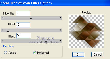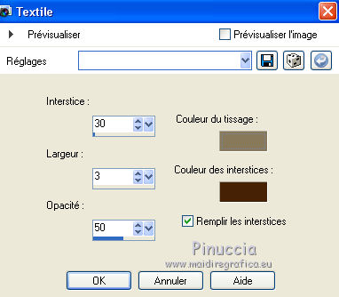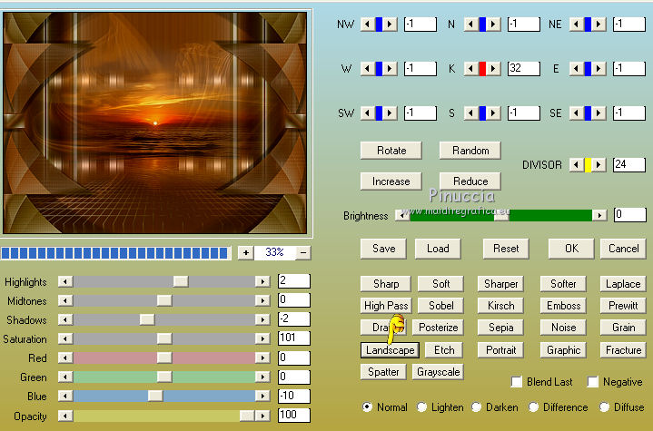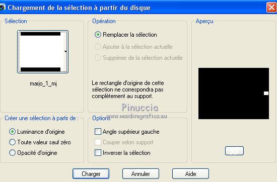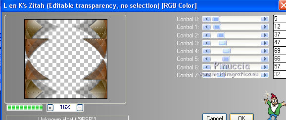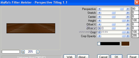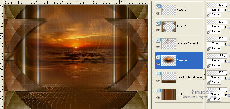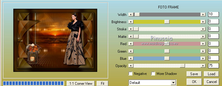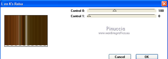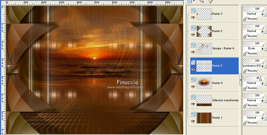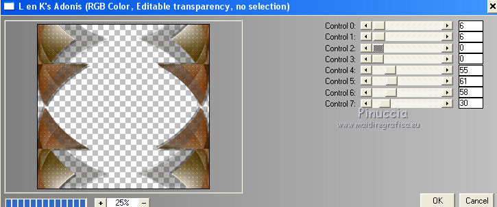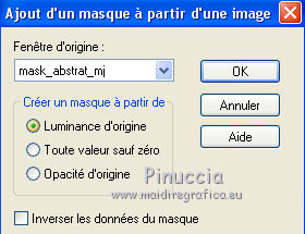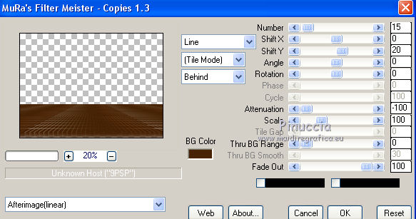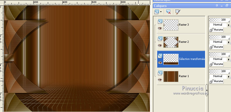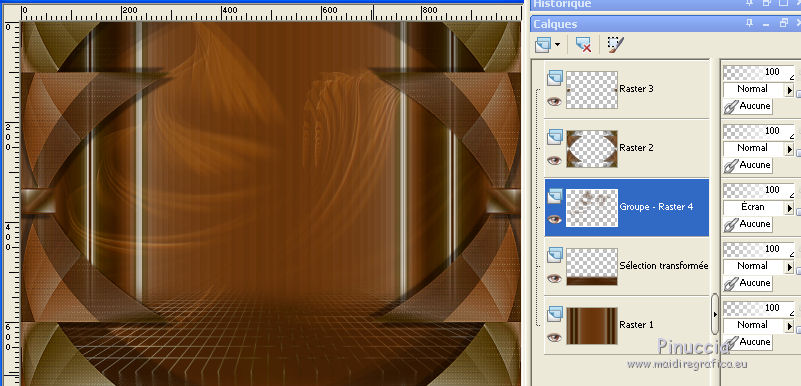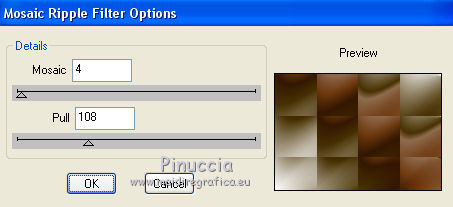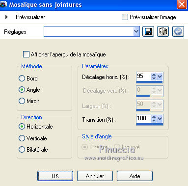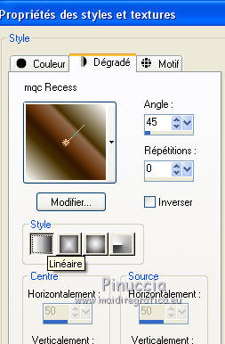 Pour traduire ce tutoriel j'ai utilisé CorelX12, mais il peut également être exécuté avec les autres versions. Suivant la version utilisée, vous pouvez obtenir des résultats différents. Depuis la version X4, la fonction Image>Miroir a été remplacée par Image>Renverser horizontalement, et Image>Renverser avec Image>Renverser verticalement . Dans les versions X5 et X6, les fonctions ont été améliorées par la mise à disposition du menu Objets. Avec la nouvelle version X7, nous avons encore Image>Miroir et Image>Renverser/Retourner, mais avec nouvelles différences. Voir les détails à ce sujet ici Certaines dénominations ont changées entre les versions de PSP. Les plus frequentes dénominations utilisées: ![]() Vos versions iciNécessaire pour réaliser ce tutoriel: Matériel ici Pour les tubes merci Edwige, AngelStar et Suizabella. Le reste du matériel est de Maria José (ici les liens vers les sites des créateurs de tubes) Modules Externes: consulter, si nécessaire, ma section des filtres ici Filters Unlimited 2.0 ici DSB Flux - Mosaic Ripple, Linear Transmission ici Graphics Plus - Vertical Mirror ici Simple - Half Wrap ici L&K's - Adonis ici L&K's - Zitah ici L&K's - Raisa ici Mura's Seamless - Emboss at alpha ici Mura's Meister - Perspective Tiling ici Mura's Meister - Copies ici AAA Frames - Foto Frame / AAA Filters - Custom ici Filtres Graphics Plus, Simple et Mura's Seamless peuvent être utilisés seuls ou importés dans Filters Unlimited. voir comment le faire ici). Si un filtre est fourni avec cette icône, ![]() en fonction des couleurs utilisées, vous pouvez changer le mode mélange et l'opacité des calques. Placer les sélections dans le dossier Sélections. Placer le dégradé dans le dossier Dégradés. Ouvrir le masque dans PSP et le minimiser avec le reste du matériel. Placer en avant plan la couleur #88795a, et en arrière plan la couleur #472205. ![]() Placer en avant plan le dégradé et sélectionner le dégradé mqc recess, style Linéaire. ![]() 1. Ouvrir une nouvelle image transparente 1000 x 700 pixels. Remplir l'image transparente du dégradé.2. Réglage>Flou>Flou radial. ![]() 3. Calques>Nouveau calque raster. Remplir le calque avec le même dégradé.4. Effets>Modules Externes>DSB Flux - Mosaic Ripple. ![]() 5. Image>Rotation libre - 45 degrés à droite. ![]() Image>Redimensionner, à 80%, redimensionner tous les calques décoché. 6. Effets>Modules Externes>DSB Flux - Linear Transmission. ![]() 7. Effets>Modules Externes>Simple - Half Wrap. 8. Effets>Effets géométriques>Cylindre Vertical. ![]() 9. Effets>Modules Externes>Graphics Plus - Vertical Mirror, par défaut. ![]() 10. Effets>Effets de réflexion>Miroir rotatif. ![]() 11. Réglage>Netteté>Davantage de netteté. 12. Effets>Effets 3D>Ombre portée, par défaut. ![]() Répéter Ombre portée, vertical et horizontal -10. 13. Effets>Modules Externes>L&K's - L&K's Adonis. ![]() 14. Effets>Modules Externes>L&K's - L&K's Zitah. ![]() 15. Vous positionner sur le calque Raster 1. Sélections>Charger/Enregistrer une sélection>Charger à partir du disque. Chercher et charger la sélection marjo_mj. ![]() Sélections>Transformer la sélection en calque. Garder sélectionné. 16. Effets>Effets de textures>Textile, couleur du tissage: couleur d'avant plan couleur des interstices: couleur d'arrière plan. ![]() 17. Effets>modules Externes>Mura's Meister - Perspective Tiling. ![]() Sélections>Désélectionner tout. 18. Image>Taille du support 1000 x 730 pixels. ![]() 19. Effets>Modules Externes>Mura's Meister - Copies. ![]() 20. Activer l'outil Baguette magique , progressivité 80et cliquer sur la partie transparente pour la sélectionner. ![]() Presser 10 fois (ou plus) CANC sur le clavier ![]() Sélections>Désélectionner tout. ne pas oublier de placer à nouveau la progressivité à 100 21. Vous positionner sur le calque Raster 1. Effets>Modules Externes>L&K's - L&K's Raisa. ![]() 22. Effets>Effets de réflexion>Miroir rotatif, comme précédemment. ![]() 23. Effets>Effets de réflexion>Kaléïdoscope. ![]() 24. Calques>Nouveau calque raster. Calques>Agencer>Placer en haut de la pile. 25. Sélections>Charger/Enregistrer une sélection>Charger à partir du disque. Chercher et charger la sélection marjo_1_mj. ![]() Remplir la sélection avec la couleur d'arrière plan #472205.26. Sélections>Modifier>Contracter - 3 pixels. Remplir du dégradé.Sélections>Désélectionner tout. 27. Effets>Effets de distorsion>Vent - vers la droite, intensité 75. ![]() 28. Réglage>Netteté>Davantage de netteté. Effets>Effets 3D>Ombre portée, par défaut. ![]() 29. Calques>Dupliquer. Image>Miroir. Calques>Fusionner>Fusionner le calque de dessous. 30. Vous positionner sur le calque Sélection transformée. ![]() Calques>Nouveau calque raster. Remplir le calque avec la couleur d'arrière plan #472205.31. Calques>Nouveau calque de masque>A partir d'une image. Ouvrir le menu deroulant sous la fenêtre d'origine et vous verrez la liste des images ouvertes. Sélectionner le masque mask_abstrat_mj. ![]() Calques>Fusionner>Fusionner le groupe. 32. Effets>Effets d'image>Mosaïque sans jointures. ![]() 33. Effets>Modules Externes>Mura's Seamless - Emboss at Alpha, par défaut. ![]() Placer le calque en mode Écran ou autre. ![]() 34. Ouvrir le misted et Édition>Copier. Revenir sur votre travai et Édition>Coller comme nouveau calque. Positionner bien le tube.Calques>Agencer>Déplacer vers le bas. Réduire l'opacité de ce calque à 85%. ![]() 35. Ouvrir le tube deco_2_mj et Édition>Copier. Revenir sur votre travai et Édition>Coller comme nouveau calque. Placer le calque en mode Luminance (héritée) ou autre. La tag et les calques. ![]() 36. Calques>Fusionner>Calques visibles. 37. Effets>Modules Externes>AAA Filters - Custom - Landscape ![]() 38. Ouvrir le tube de la femme et Édition>Copier. Revenir sur votre travail et Édition>Coller comme nouveau calque. Image>Redimensionner, à 54%, redimensionner tous