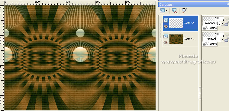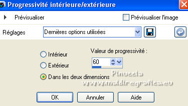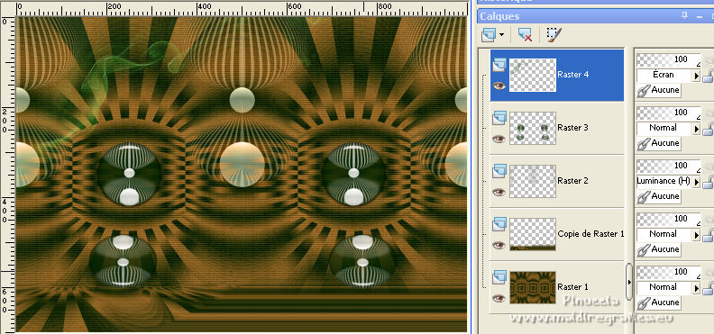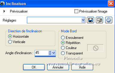 Pour traduire ce tutoriel j'ai utilisé PSPX7, PSPX2 et PSPX3, mais il peut également être exécuté avec les autres versions. Suivant la version utilisée, vous pouvez obtenir des résultats différents. Depuis la version X4, la fonction Image>Miroir a été remplacée par Image>Renverser horizontalement, et Image>Renverser avec Image>Renverser verticalement . Dans les versions X5 et X6, les fonctions ont été améliorées par la mise à disposition du menu Objets. Avec la nouvelle version X7, nous avons encore Image>Miroir et Image>Renverser/Retourner, mais avec nouvelles différences. Voir les détails à ce sujet ici Certaines dénominations ont changées entre les versions de PSP. Les plus frequentes dénominations utilisées: ![]() English translation here Vos versions ici![]() Nécessaire pour réaliser ce tutoriel: ![]() Le matériel est de Maria José. (ici les liens vers les sites des créateurs du matériel) ![]() consulter, si nécessaire, ma section des filtres ici Filters Unlimited 2.0 ici Mezzy - Glass ici Carolaine and Sensibility - CS-Linear-H ici Flaming Pear - Flexify 2 ici Mura's Meister - Perspective Tiling ici Alien Skin Eye Candy 5 Impact - Perspective Shadow, Glass ici ![]() en fonction des couleurs utilisées, vous pouvez changer le mode mélange et l'opacité des calques. Dans les plus récentes versions de PSP, vous ne trouvez pas le dégradé d'avant plan/arriére plan ou Corel_06_029. Vous pouvez utiliser le dégradé des versions antérieures. Ici le dossier Dégradés de CorelX. Placer les presets En cliquant sur le preset une ou deux fois (selon vos réglages) automatiquement il se placera directement dans le dossier Settings de Alien Skin Eye Candy. pourquoi un ou deux clic voir ici ![]() Placer la sélection dans le dossier Sélections. Placer en avant plan la couleur #ad7737, et en arrière plan la couleur #062400. ![]() Préparer en avant plan un dégradé de premier plan/arrière plan, style Rectangulaire. ![]() 1. Ouvrir une nouvelle image transparente 1000 x 700 pixels. Remplir l'image transparente du dégradé.Réglage>Flou>Flou gaussien - rayon 20 ![]() 2. Effets>Modules Externes>Mezzy - Glass. ![]() 3. Effets>Modules Externes>Carolaine and Sensibility - CS-Linear-H, par défaut. ![]() 4. Effets>Modules Externes>Flaming Pear - Flexify 2 ![]() 5. Effets>Modules Externes>Filters Unlimited 2.0 - Paper Texture - Striped Paper,Fine, par défaut. ![]() Réglage>Netteté>Netteté. 6. Ouvrir decoflorence2-MJ ![]() Édition>Copier. Revenir sur votre travail et Édition>Coller comme nouveau calque. Touche K sur le clavier pour activer l'outil Sélecteur ![]() et placer Position horiz.: 332,00 et Position vert.: 0,00. ![]() 7. Effets>Effets d'image>Mosaïque sans jointures. ![]() Placer le calque en mode Luminance (héritée). ![]() 8. Réglage>Netteté>Davantage de netteté. Effets>Effets 3D>Ombre portée, couleur noire. ![]() 9. Sélections>Charger/Enregistrer une sélection>Charger à partir du disque. Chercher et charger la sélection florence-MJ ![]() Calques>Nouveau calque raster. Réduire l'opacité de l'outil Pot de peinture à 80%. Remplir le calque avec la couleur foncée d'arrière plan.Placer à nouveau l'opacité de l'outil Pot de peinture à 100. 10. Calques>Nouveau calque raster. Édition>Coller dans la sélection (le tube decoflorence2-MJ est toujours en mémoire). Placer le calque en mode Écran, ou à votre goût. Calques>Fusionner>Fusionner le calque de dessous. 11. Effets>Modules Externes>Alien Skin Eye Candy 5 Impact - Glass. Sélectionner le preset glass-florence-mj ![]() Sélections>Désélectionner tout. Calques>Dupliquer. Image>Miroir. Calques>Fusionner>Fusionner le calque de dessous. 12. Effets>Modules Externes>Alien Skin Eye Candy 5 Impact - Perspective Shadow. Sélectionner le preset Shadow-florence-MJ et ok. ![]() 13. Vous positionner sur le calque Raster 1. Calques>Dupliquer. Effets>Modules Externes>Mura's Meister - Perspective Tiling. ![]() 14. Activer l'outil Baguette magique , tolérance et progressivité 0,et cliquer dans la partie transparente pour la sélectionner. 15. Sélections>Modifier>Progressivité Intérieure/Extérieure ![]() Presser +/-10 fois CANC sur le clavier ![]() Sélections>Désélectionner tout. 16. Effets>Effets géométriques>Inclinaison. ![]() Édition>Répéter Inclinaison. 17. Ouvrir decoflorence1-MJ ![]() Édition>Copier. Revenir sur votre travail et Édition>Coller comme nouveau calque. Calques>Agencer>Placer en haut de la pile. Placer le calque en mode Écran. La tag et les calques - adapter Mode mélange et opacité à votre goût. ![]() 18. Ouvrir le tube de la femme mariajoseMJ-290 ![]() Effacer le watermark et Édition>Copier. Revenir sur votre travail et Édition>Coller comme nouveau calque. Image>Redimensionner, à 84%, redimensionner tous les calques décoché. Déplacer le tube vers la droite.Effets>Effets 3D>Ombre portée, à choix. 19. Image>Ajouter des bordures, 1 pixel, symétrique, couleur d'arrière plan #062400. Image>Ajouter des bordures, 5 pixels, symétrique, couleur d'avant plan #ad7737. Image>Ajouter des bordures, 1 pixel, symétrique, couleur d'arrière plan #062400. 20. Sélections>Sélectionner tout. Édition>Copier Image>Ajouter des bordures, 50 pixels, symétrique, couleur d'avant plan #ad7737. 21. Sélections>Inverser. Édition>Coller dans la sélection. 22. Réglage>Flou>Flou gaussien - rayon 15. ![]() 23. Effets>Modules Externes>Filters Unlimited 2.0 - Paper Texture - Striped Paper,Fine, par défaut. ![]() 24. Réglage>Netteté>Davantage de netteté. 25. Effets>Effets 3D>Ombre portée, couleur d'arrière plan #062400. ![]() Sélections>Inverser. Répéter Effets>Effets 3D>Ombre portée, comme précédemment. Sélections>Désélectionner tout. 26. Signer votre travail. Image>Ajouter des bordures, 1 pixel, symétrique, couleur d'arrière plan #062400. 27. Image>Redimensionner, 1000 pixels de largeur, redimensionner tous les calques coché. Enregistrer en jpg. Pour le tu