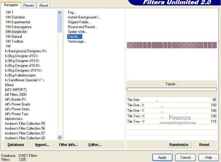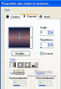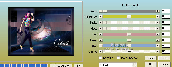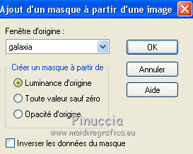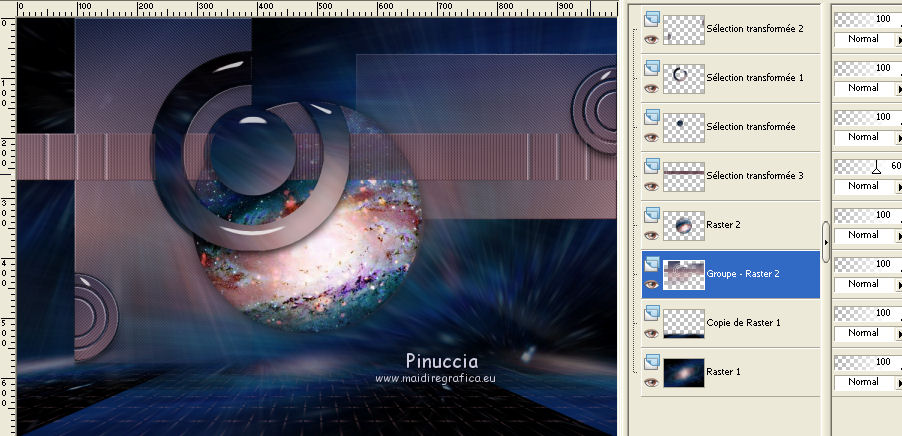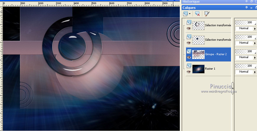 Pour traduire ce tutoriel j'ai utilisé CorelX12, mais il peut également être exécuté avec les autres versions. Suivant la version utilisée, vous pouvez obtenir des résultats différents. Depuis la version X4, la fonction Image>Miroir a été remplacée par Image>Renverser horizontalement, et Image>Renverser avec Image>Renverser verticalement . Dans les versions X5 et X6, les fonctions ont été améliorées par la mise à disposition du menu Objets. Avec la nouvelle version X7, nous avons encore Image>Miroir et Image>Renverser/Retourner, mais avec nouvelles différences. Voir les détails à ce sujet ici Certaines dénominations ont changées entre les versions de PSP. Les plus frequentes dénominations utilisées: ![]() Vos versions ici Nécessaire pour réaliser ce tutoriel: Matériel ici Pour les tubes merci Gabry et smArt. (ici les liens vers les sites des créateurs de tubes) Modules Externes: consulter, si nécessaire, ma section des filtres ici Filters Unlimited 2.0 ici Alien Skin Eye Candy 5 Impact - Glass ici Carolaine and Sensibility - CS-DLines ici VM Instant Art - Tripolis ici DSB Flux - Linear Transmission ici Mura's Seamless - Emboss at Alpha ici Mura's Meister - Perspective Tiling ici AAA Frames - Foto Frame ici Filtres Mura's Seamless et VM Instant Art peuvent être utilisés seuls ou importés dans Filters Unlimited. voir comment le faire ici). Si un filtre est fourni avec cette icône, ![]() en fonction des couleurs utilisées, vous pouvez changer le mode mélange et l'opacité des calques. Dans les plus récentes versions de PSP, vous ne trouvez pas le dégradé d'avant plan/arrière plan ou Corel_06_029. Vous pouvez utiliser le dégradé des versions antérieures. Ici le dossier Dégradés de CorelX. Placer le preset En cliquant sur le preset une ou deux fois (selon vos réglages) automatiquement il se placera directement dans le dossier Settings de Alien Skin Eye Candy. pourquoi un ou deux clic voir ici Placer les sélections dans le dossier Sélections. Ouvrir le masque dans PSP et le minimiser avec le reste du matériel. Placer en avant plan la couleur #a27475, et en arrière plan la couleur #091439. ![]() Préparer en avant plan un dégradé de premier plan/arrière plan, style Linéaire. ![]() 1. Ouvrir une nouvelle image transparente 1000 x 700 pixels. 2. Sélections>Sélectionner tout. Ouvrir graficogalaxia - Édition>Copier. Revenir sur votre travail et Édition>Coller dans la sélection. Sélections>Désélectionner tout. 3. Réglage>Flou>Flou radial. ![]() 4. Calques>Dupliquer. Image>Miroir. Image>Renverser. Réduire l'opacité de ce calque à 50%. Calques>Fusionner>Fusionner le calque de dessous. 4. Calques>Nouveau calque raster. Remplir le calque du dégradé.5. Calques>Nouveau calque de masque>A partir d'une image. Ouvrir le menu deroulant sous la fenêtre d'origine et vous verrez la liste des images ouvertes. Sélectionner le masque galaxia_mj. ![]() Calques>Fusionner>Fusionner le groupe. 6. Effets>Modules Externes Mura's Seamless - Emboss at Alpha, par défaut. ![]() 7. Effets>Modules Externes>Carolaine and Sensibility - CS-DLines, par défaut. ![]() 8. Vous positionner sur le calque Raster 1. Sélections>Charger/Enregistrer une sélection>Charger à partir du disque. Chercher et charger la sélection galaxia_mj. ![]() Sélections>Transformer la sélection en calque. Calques>Agencer>Placer en haut de la pile. 9. Effets>Modules Externes>Alien Skin Eye Candy 5 Impact - Glass. Sélectionner le preset glass_majo et ok. ![]() Sélections>Désélectionner tout. 10. Vous positionner à nouveau sur le calque Raster 1. Sélections>Charger/Enregistrer une sélection>Charger à partir du disque. Chercher et charger la sélection galaxia_1_mj. ![]() Sélections>Transformer la sélection en calque. Calques>Agencer>Placer en haut de la pile. 11. Effets>Modules Externes>Alien Skin Eye Candy 5 Impact - Glass - preset glass_majo. ![]() Sélections>Désélectionner tout. 12. Vous positionner sur le calque du masque Groupe-Raster 2. ![]() Sélections>Charger/Enregistrer une sélection>Charger à partir du disque. Chercher et charger la sélection galaxia_2_mj. ![]() Sélections>Transformer la sélection en calque. Calques>Agencer>Placer en haut de la pile. 13. Effets>Modules Externes>Alien Skin Eye Candy 5 Impact - Glass - preset glass_majo. ![]() Sélections>Désélectionner tout. 14. Calques>Dupliquer. Image>Miroir. Positionner bien l'image.![]() Calques>Fusionner>Fusionner le calque de dessous. 15. Vous positionner à nouveau sur le calque du masque Groupe-Raster 2. Sélections>Charger/Enregistrer une sélection>Charger à partir du disque. Chercher et charger la sélection galaxia_3_mj. ![]() Sélections>Transformer la sélection en calque. 16. Effets>Modules Externes>Filters Unlimited 2.0 - VM Instant Art - Tripolis. ![]() 17. Effets>Effets de réflexion>miroir rotatif, par défaut. ![]() Réduire l'opacité de ce calque à 60%. 18. Vous positionner à nouveau sur le calque du masque Groupe-Raster 2. Sélections>Charger/Enregistrer une sélection>Charger à partir du disque. Chercher et charger la sélection galaxia_4_mj. ![]() 18. Ouvrir le misted - Édition>Copier. Revenir sur votre travail et Édition>Coller comme nouveau calque. Positionner le tube sur la sélection à votre goût.![]() Sélection>Inverser. Presser CANC sur le clavier ![]() 19. Effets>Effets 3D>Ombre portée, couleur noire. ![]() Sélections>Inverser. Répéter Effets>Effets 3D>Ombre portée, comme précédemment. Sélections>Désélectionner tout. 20. Vous positionner sur le calque Raster 1 Calques>Dupliquer. 21. Effets>Effets de textures>Textile couleur du tissage: couleur d'avant plan. ![]() 22. Effets>Modules Externes>Mura's Meister - Perspective Tiling. ![]() 23. Sélections>Charger/Enregistrer une sélection>Charger à partir du disque. Chercher et charger la sélection galaxia_5_mj. ![]() Presser +/-10 fois CANC sur le clavier. Sélections>Désélectionner tout. 24. Vous positionner