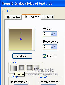 Pour traduire ce tutoriel j'ai utilisé CorelX12, mais il peut également être exécuté avec les autres versions. Suivant la version utilisée, vous pouvez obtenir des résultats différents. Depuis la version X4, la fonction Image>Miroir a été remplacée par Image>Renverser horizontalement, et Image>Renverser avec Image>Renverser verticalement . Dans les versions X5 et X6, les fonctions ont été améliorées par la mise à disposition du menu Objets. Avec la nouvelle version X7, nous avons encore Image>Miroir et Image>Renverser/Retourner, mais avec nouvelles différences. Voir les détails à ce sujet ici Certaines dénominations ont changées entre les versions de PSP. Les plus frequentes dénominations utilisées: ![]() Vos versions iciNécessaire pour réaliser ce tutoriel: Matériel ici Merci pour le tube Tocha et pour le déco Syl. (ici les liens vers les sites des créateurs de tubes) Modules Externes: consulter, si nécessaire, ma section des filtres ici Mehdi - Edge FX ici Mehdi - Flat Median ici Mura's Meister - Copies ici Mura's Meister - Perspective Tiling ici L&K's - L&K's - Pia ici AAA Filters - Custom ici Alien Skin Eye Candy 5 Impact - Glass ici ![]() en fonction des couleurs utilisées, vous pouvez changer le mode mélange et l'opacité des calques. Dans les plus récentes versions de PSP, vous ne trouvez pas le dégradé d'avant plan/arrière plan ou Corel_06_029. Vous pouvez utiliser le dégradé des versions antérieures. Ici le dossier Dégradés de CorelX. Placer le preset En cliquant sur le preset une ou deux fois (selon vos réglages) automatiquement il se placera directement dans le dossier Settings de Alien Skin Eye Candy. pourquoi un ou deux clic voir ici Placer le preset Pick copies_mj dans le dossier Paramètres par défaut. Placer les sélections dans le dossier Sélections. 1. Placer en avant plan la couleur #796647, et en arrière plan la couleur #e5df9f. ![]() 2. Préparer en avant plan un dégradé de premier plan/arrière plan, style Linéaire. ![]() 3. Ouvrir une nouvelle image transparente 1000 x 750 pixels. Ouvrir le tube nenadeco_mj (le tube jaune) - Édition>Copier. Revenir sur votre travail et Édition>Coller comme nouveau calque. Ne pas déplacer. 4. Effets>Modules Externes>Mura's Meister - Copies. ![]() 5. Effets>Modules Externes>AAA Filters Custom cliquer sur Fracture et ok ![]() 6. Calques>Dupliquer. Image>Redimensionner, à 50%, redimensionner tous les calques décoché. 7. Effets>Modules Externes>Mura's Meister - Copies. ![]() Image>Redimensionner, à 60%, redimensionner tous les calques décoché. 8. Effets>Modules Externes>AAA Filters Custom - Fracture. Calques>Dupliquer. 8. Touche K sur le clavier pour activer l'outil Sélecteur ![]() ouvrir le menu des preset et sélectionner le preset copies_mj ![]() Résultat ![]() Touche M pour désélectionner l'outil. 9. Effets>Effets d'image>Décalage. ![]() 10. Effets>Modules Externes>Mura's Meister - Copies. ![]() 11. Effets>Effets de distorsion>Vagues. ![]() 12. Effets>Modules Externes>Mura's Meister - Copies. ![]() Réglage>Netteté>Davantage de netteté. 13. Calques>Dupliquer. Image>Miroir. Calques>Fusionner>Fusionner le calque de dessous. Effets>Effets 3D>Ombre portée, couleur noire. ![]() 14. Vous positionner sur le calque Copie de Raster 2. ![]() Calques>Fusionner>Fusionner le calque de dessous. Effets>Effets 3D>Ombre portée, couleur noire. ![]() 15. Objets>Aligner>Haut. Si vous travaillez avec une versione précédente, qui ne rends pas disponible le menu Objets, utiliser l'outil Déplacement ![]() ou, avec l'outil Sélecteur ![]() placer Position vert. à 0,00. ![]() 16. Vous positionner sur le calque Raster 1, qui est encore vide. Remplir le calque du dégradé.17. Effets>Modules Externes>L&K's - L&K's Pia. ![]() 18. Réglage>Ajouter/Supprimer du bruit>Ajouter du bruit. ![]() 19. Effets>Modules Externes>Mehdi 2 - Flat Median ![]() 20. Effets>Modules Externes>Mehdi - Edges FX - couleur #a9a481. ![]() Réglage>Netteté>Davantage de netteté. 21. Vous positionner sur le calque du haut de la pile - copie (2) de Raster 2. Édition>Copie Spéciale>Copier avec fusion. Édition>Coller comme nouveau calque. 22. Image>Rotation libre - 90 degrés à droite. ![]() 23. Effets>Modules Externes>Mura's Meister - Perspective Tiling. ![]() Réglage>Netteté>Davantage de netteté. 24. Sélections>Charger/Enregistrer une sélection>Charger à partir du disque. Chercher et charger la sélection copies_1. ![]() Presser 10 fois CANC sur le clavier ![]() Sélections>Désélectionner tout. 25. Vous positionner sur le calque Raster 1. Sélections>Charger/Enregistrer une sélection>Charger à partir du disque. Chercher et charger la sélection copies_2. ![]() Sélections>Transformer la sélection en calque. Calques>Agencer>Déplacer vers le haut. 26. Effets>Effets artistiques>Émail ![]() 27. Effets>Modules Externes>Alien Skin Eye Candy 5 Impact - Glass. Sélectionner le preset glass_majo et ok. ![]() Sélections>Désélectionner tout. 28. Ouvrir le tube de la femme - Édition>Copier. Revenir sur votre travail et Édition>Coller comme novueau calque. Déplacer le tube à droite.Effets>Effets 3D>Ombre portée, à choix. Ouvrir le tube déco - Édition>Copier. Revenir sur votre travail et Édition>Coller comme novueau calque. Déplacer le tube à gauche.Effets>Effets 3D>Ombre portée, à choix. Vous devriez avoir ce-ci ![]() Calques>Fusionner>Calques visibles. 29. Effets>Modules Externes>AAA Filters - Custom sélectionner le preset Landscape et ok ![]() 30. Image>Ajouter des bordures, 1 pixel, symétrique, couleur noire. Image>Ajouter des bordures, 20 pixels, symétrique, couleur claire ##8d844f. Image>Ajouter des bordures, 1 pixel, symétrique, couleur noire. Image>Ajouter des bordures, 30 pixels, symétrique, couleur claire ##8d844f. Image>Ajouter des bordures, 1 pixel, symétrique, couleur noire. 31. Signer votre travail. Calques>Fusionner>Tous. 32. Image>Redimensionner, 1000 pixels de largeur, redimension