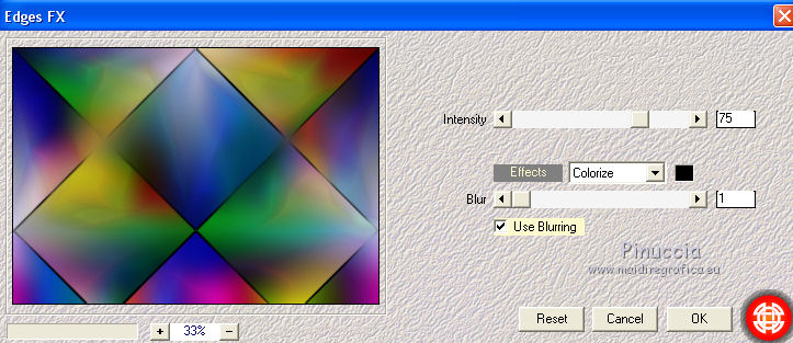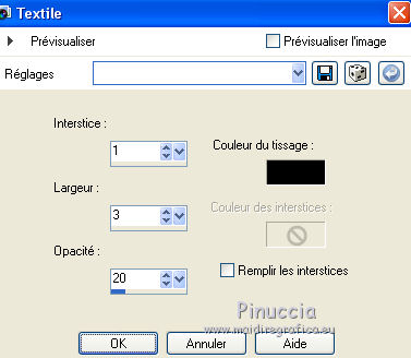 Pour traduire ce tutoriel j'ai utilisé CorelX12, mais il peut également être exécuté avec les autres versions. Suivant la version utilisée, vous pouvez obtenir des résultats différents. Depuis la version X4, la fonction Image>Miroir a été remplacée par Image>Renverser horizontalement, et Image>Renverser avec Image>Renverser verticalement . Dans les versions X5 et X6, les fonctions ont été améliorées par la mise à disposition du menu Objets. Avec la nouvelle version X7, nous avons encore Image>Miroir et Image>Renverser/Retourner, mais avec nouvelles différences. Voir les détails à ce sujet ici Certaines dénominations ont changées entre les versions de PSP. Les plus frequentes dénominations utilisées: ![]() Vos versions ici Nécessaire pour réaliser ce tutoriel: Matériel ici Merci pour les tubes Suizabella et Luz Cristina. Le misted est de Maria José (ici les liens vers les sites des créateurs de tubes) Modules Externes: consulter, si nécessaire, ma section des filtres ici Filters Unlimited 2.0 ici DSB Flux - Isotope ici Mura's Seamless - Emboss at Alpha ici Mehdi - Sorting Tiles, Edge FX ici Carolaine and Sensibility - CS_Halloween 2 ici Eye Candy 4000 - Motion Trail ici Filtres Mura's Seamless peuvent être utilisés seuls ou importés dans Filters Unlimited. voir comment le faire ici). Si un filtre est fourni avec cette icône, ![]() en fonction des couleurs utilisées, vous pouvez changer le mode mélange et l'opacité des calques. Placer les sélections dans le dossier Sélections Ouvrir le masque dans PSP et le minimiser avec le reste du matériel. 1. Placer en avant plan un couleur claire; pour moi #faf0c4. Placer en arrière plan la couleur noire #000000. ![]() Ouvrir une nouvelle image transparente 1000 x 700 pixels. Remplir l'image transparente avec la couleur claire #faf0c4.2. Effets>Modules Externes>DSB Flux - Isotope pour le numéro négatif il faut utiliser le curseur ![]() Vous pouvez changer les réglages à votre goût. 3. Effets>Effets d'image>Mosaïque sans jointures. ![]() 4. Réglage>Flou>Flou gaussien - rayon 30. ![]() 5. Effets>Modules Externes>Mehdi - Sorting Tiles ![]() 6. Effets>Modules Externes>Mehdi - Edges FX, couleur noire. ![]() 7. Effets>Effets de textures>Textile couleur du tissage noire ![]() 8. Sélections>Charger/Enregistrer une sélection>Charger à partir du disque. Chercher et charger la sélection gypsie_mj. ![]() Sélections>Transformer la sélection en calque. Sélections>Désélectionner tout. 9. Effets>Modules Externes>Carolaine and Sensibility - CS_Halloween 2 ![]() Répéter l'Effet une deuxième fois. 10. Réglage>Netteté>Davantage de netteté. Effets>Effets 3D>Ombre portée, couleur noire. ![]() Calques>Fusionner>Fusionner le calque de dessous. 11. Effets>Effets d'image>Mosaïque sans jointures. ![]() 12. Calques>Nouveau calque raster. Remplir avec la couleur claire.13. Calques>Nouveau calque de masque>A partir d'une image. Ouvrir le menu deroulant sous la fenêtre d'origine et vous verrez la liste des images ouvertes. Sélectionner le masque rawpixel_3_mj. ![]() Calques>Fusionner>Fusionner le groupe. 14. Effets>Modules Externes>Eye Candy 4000 - Motion Trail ![]() 15. Effets>Modules Externes>Mura's Seamless - Emboss at Alpha, par défaut. ![]() Placer le calque en mode Recouvrement ou autre. ![]() 16. Sélections>Charger/Enregistrer une sélection>Charger à partir du disque. Chercher et charger la sélection gypsie_1_mj. ![]() Calques>Nouveau calque raster. 17. Ouvrir le misted - Édition>Copier. Revenir sur votre travail et Édition>Coller dans la sélection. Sélections>Désélectionner tout. 18. Ouvrir le tube de la femme - Édition>Copier. Revenir sur votre travail et Édition>Coller comme nouveau calque. Image>Redimensionner, à 75%, redimensionner tous les calques décoché. Positionner bien le tube.Effets>Effets 3D>Ombre portée, à choix. 19. Ouvrir le tube deco_gypsie_mj - Édition>Copier. Revenir sur votre travail et Édition>Coller comme nouveau calque. Déplacer le tube en haut à gauche.![]() Placer le calque en mode Luminance (héritée) ou autre. 20. Ouvrir le texte Gypsie - Édition>Copier. Revenir sur votre travail et Édition>Coller comme nouveau calque. Positionner bien le tube.Placer le calque en mode Recouvrement ou autre. La tag et les calques (placer modes mélange et opacitées à votre goût) ![]() Calques>Fusionner>Tous. 21. Image>Ajouter des bordures, 1 pixel, symétrique, couleur noire. Image>Ajouter des bordures, 10 pixels, symétrique, couleur blanche. Image>Ajouter des bordures, 1 pixel, symétrique, couleur noire. Image>Ajouter des bordures, 20 pixels, symétrique, couleur blanche. Image>Ajouter des bordures, 1 pixel, symétrique, couleur noire. Image>Ajouter des bordures, 30 pixels, symétrique, couleur blanche. Image>Ajouter des bordures, 1 pixel, symétrique, couleur noire. 22. Sélections>Charger/Enregistrer une sélection>Charger à partir du disque. Chercher et charger la sélection gypsie_2_mj. ![]() Effets>Effets 3D>Ombre portée, couleur noire. ![]() Sélections>Désélectionner tout. 23. Signer votre travail sur un nouveau calque. Calques>Fusionner>Tous. 24. Image>Redimensionner, 1000 pixels di largeur, redimensionner tous les calques coché. Enregistrer en jpg. Version avec tubes de Luz Cristina et Cal ![]() Vos versions ici ![]() Si vous avez des problèmes, ou des doutes, ou vous trouvez un link modifié, ou seulement pour me dire que ce tutoriel vous a plu, vous pouvez m'écrire. 27 Novembre 2019 |