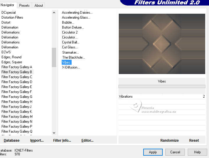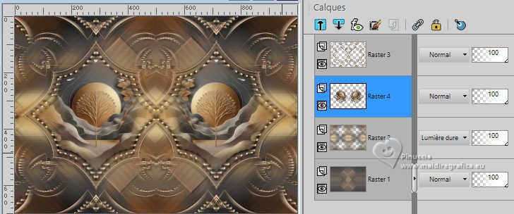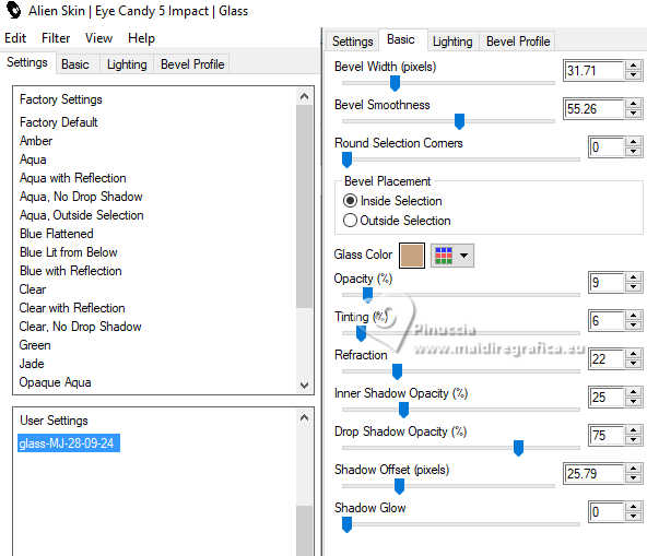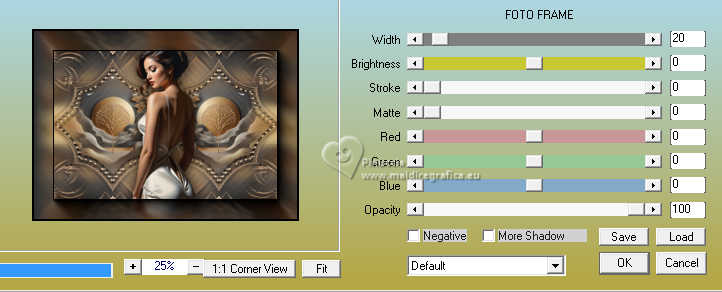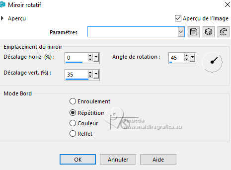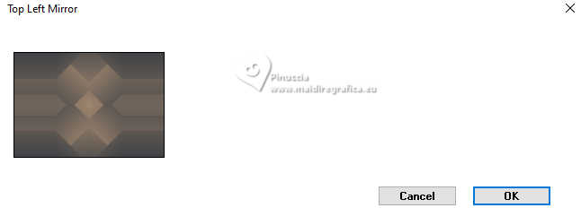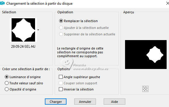 Pour traduire ce tutoriel j'ai utilisé PSPX9 et PSP2020, mais il peut également être exécuté avec les autres versions. Suivant la version utilisée, vous pouvez obtenir des résultats différents. Depuis la version X4, la fonction Image>Miroir a été remplacée par Image>Renverser horizontalement, et Image>Renverser avec Image>Renverser verticalement . Dans les versions X5 et X6, les fonctions ont été améliorées par la mise à disposition du menu Objets. Avec la nouvelle version X7, nous avons encore Image>Miroir et Image>Renverser/Retourner, mais avec nouvelles différences. Voir les détails à ce sujet ici Certaines dénominations ont changées entre les versions de PSP. Les plus frequentes dénominations utilisées: ![]() English translation here Vos versions ici![]() Nécessaire pour réaliser ce tutoriel: ![]() Matériel de Maria José. (ici les liens vers les sites des créateurs du matériel) ![]() consulter, si nécessaire, ma section des filtres ici Filters Unlimited 2.0 ici Mehdi - Sorting Tiles ici Simple - Top Left Mirror, Diamonds ici Filter Factory Gallery B - Vibes ici L&k's - L&K's Djin ici Alien Skin Eye Candy 5 Impact - Glass ici AAA Frames - Foto Frame ici Filtres Factory Gallery et Simple peuvent être utilisés seuls ou importés dans Filters Unlimited. voir comment le faire ici. Si un filtre est fourni avec cette icône, ![]() en fonction des couleurs utilisées, vous pouvez changer le mode mélange et l'opacité des calques. Dans les plus récentes versions de PSP, vous ne trouvez pas le dégradé d'avant plan/arrière plan ou Corel_06_029. Vous pouvez utiliser le dégradé des versions antérieures. Ici le dossier Dégradés de CorelX. Placer le preset En cliquant sur le preset une ou deux fois (selon vos r glages) automatiquement il se placera directement dans le dossier Settings de Alien Skin Eye Candy. pourquoi un ou deux clic voir ici ![]() Placer la sélection dans le dossier Sélections Choisir deux couleurs à choix ou de votre misted; pour l'exemple: Placer en avant plan la couleur #c8a380 et en arrière plan la couleur #3a3f43. ![]() Préparer en avant plan un dégradé de premier plan/arrière plan, style Halo. ![]() 1. Ouvrir une nouvelle image transparente 1000 x 700 pixels. Remplir l'image transparente du dégradé.2. Effets>Modules Externes>Mehdi - Sorting Tiles. ![]() 3. Effets>Effets de réflexion>Miroir rotatif. ![]() 4. Effets>Modules Externes>Simple - Top Left Mirror. ![]() 5. Effets>Modules Externes>Filters Unlimited 2.0 - Filter Factory Gallery B - Vibes, par défaut. ![]() 6. Calques>Nouveau calque raster. Sélections>Sélectionner tout. Ouvrir le misted misted-2-MJ ![]() Édition>Copier. Minimiser le tube. Revenir sur votre travail et Édition>Coller dans la sélection. Sélections>Désélectionner tout. 7. Effets>Effets d'image>Mosaïque sans jointures. ![]() 8. Réglage>Flou>Flou gaussien - rayon 30. ![]() 9. Effets>Modules Externes>L&K's - L&K's Djin. ![]() 10. Effets>Effets d'image>Mosaïque sans jointures, comme précédemment. ![]() 11. Effets>Modules Externes>Simple - Diamonds. 12. Effets>Modules Externes>Simple - Top Left Mirror. ![]() 13. Réglage>Netteté>Davantage de netteté. Placer le calque en mode Lumière dure. ![]() 14. Ouvrir deco-tuto-MJ ![]() Édition>Copier. Revenir sur votre travail et Édition>Coller comme nouveau calque. 15. Sélections>Charger/Enregistrer une sélection>Charger à partir du disque. Chercher et charger la sélection 28-09-24-SEL-M ![]() 16. Calques>Nouveau calque raster. Activer à nouveau le misted misted-2-MJ et Édition>Copier. Revenir sur votre travail et Édition>Coller dans la sélection. 17. Effets>Modules Externes>Alien Skin Eye Candy 5 Impact - Glass. Sélectionner le preset glass-MJ-28-09-24 si vous utilisez des autres couleurs, changez Glass Color avec votre couleur d'avant plan ![]() Sélections>Désélectionner tout. 18. Calques>Dupliquer. Image>Miroir>Miroir horizontal. Calques>Fusionner>Fusionner le calque de dessous. Calques>Agencer>Déplacer vers le bas. La tag et les calques - adapter Mode mélange et opacité en fonction de votre travail. ![]() 19. Vous positionner sur le calque du haut de la pile. Ouvrir le tube de la femme femme-tuto-MJ ![]() Édition>Copier. Revenir sur votre travail et Édition>Coller comme nouveau calque. Image>Redimensionner, à 66%, redimensionner tous les calques décoché. Effets>Effets 3D>Ombre portée, à choix. 20. Image>Ajouter des bordures, 1 pixel, symétrique, couleur foncée d'arrière plan #3a3f43. 21. Sélections>Sélectionner tout. Édition>Copier 22. Image>Ajouter des bordures, 30 pixels, symétrique, couleur blanche. 23. Sélections>Inverser. Édition>Coller dans la sélection - l'image copiée à l'étape 21. 24. Effets>Effets de distorsion>Vent - vers la droite - intensité 80. ![]() 25. Effets>Modules Externes>Simple - Top Left Mirror. ![]() 26. Effets>Modules Externes>AAA Frames - Foto Frame. ![]() Effets>Effets 3D>Ombre portée, couleur noire. ![]() 27. Sélections>Sélectionner tout. Édition>Copier 28. Image>Ajouter des bordures, 30 pixels, symétrique, couleur blanche. 29. Sélections>Inverser. Édition>Coller dans la sélection - l'image copiée à l'étape 27. Sélections>Désélectionner tout. 30. Signer votre travail sur un nouveau calque. Image>Ajouter des bordures, 1 pixel, symétrique, couleur foncée d'arrière plan #3a3f43. 31. Image>Redimensionner, 1000 pixels de largeur, redimensionner tous les calques coché. Enregistrer en jpg. Pour les tubes de cette version merci Luz Cristina et Kamil ![]() ![]() Si vous avez des problèmes, ou des doutes, ou vous trouvez un link modifié, ou seulement pour me dire que ce tutoriel vous a plu, vous pouvez m'écrire. |