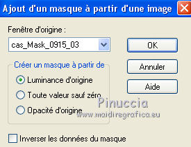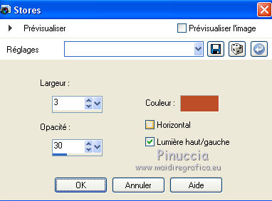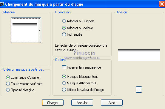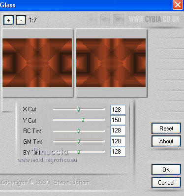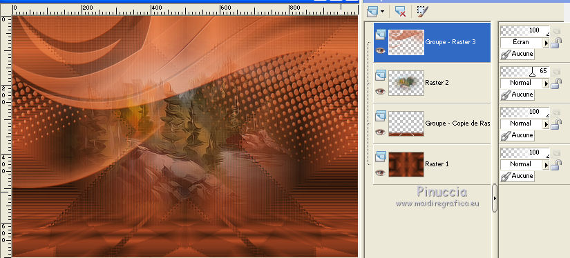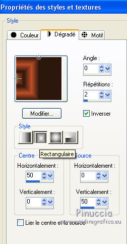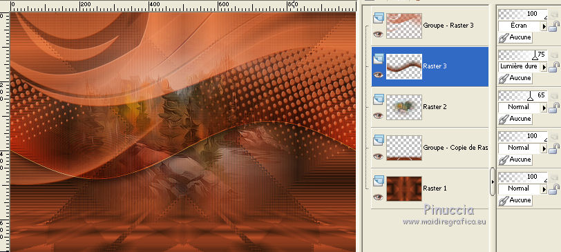 Pour traduire ce tutoriel j'ai utilisé PSPX7, PSPX2 et PSPX3, mais il peut également être exécuté avec les autres versions. Suivant la version utilisée, vous pouvez obtenir des résultats différents. Depuis la version X4, la fonction Image>Miroir a été remplacée par Image>Renverser horizontalement, et Image>Renverser avec Image>Renverser verticalement . Dans les versions X5 et X6, les fonctions ont été améliorées par la mise à disposition du menu Objets. Avec la nouvelle version X7, nous avons encore Image>Miroir et Image>Renverser/Retourner, mais avec nouvelles différences. Voir les détails à ce sujet ici Certaines dénominations ont changées entre les versions de PSP. Les plus frequentes dénominations utilisées: ![]() English translation here Vos versions ici![]() Nécessaire pour réaliser ce tutoriel: Matériel ici Pour un masque merci Casio. Le reste du matériel est de Maria José. (ici les liens vers les sites des créateurs du matériel) Modules Externes: consulter, si nécessaire, ma section des filtres ici Filters Unlimited 2.0 ici Mezzy - Glass ici l'effet est dans le matériel Simple - Pizza Slice Mirror ici Graphics Plus - Vertical Mirror ici VanDerLee Unplugged X ici Mura's Meister - Perspective Tiling ici Mura's Seamless - Emboss at Alpha ici AAA Filters - Custom ici Filtres Simple, Graphics Plus et Mura's Seamless peuvent être utilisés seuls ou importés dans Filters Unlimited. voir comment le faire ici). Si un filtre est fourni avec cette icône, ![]() en fonction des couleurs utilisées, vous pouvez changer le mode mélange et l'opacité des calques. Dans les plus récentes versions de PSP, vous ne trouvez pas le dégradé d'avant plan/arrière plan ou Corel_06_029. Vous pouvez utiliser le dégradé des versions antérieures. Ici le dossier Dégradés de CorelX. Placer la sélection dans le dossier Sélections. Placer la masque !!!!.mask.ket-fadesuave-1 dans le dossier Masques. Ouvrir le deuxième masque dans PSP et le minimiser avec le reste du matériel. Placer en avant plan la couleur #2c180e, et en arrière plan la couleur #bd4e28. ![]() Préparer en avant plan un dégradé de premier plan/arrière plan, style Rectangulaire. il peut arriver de voir un'autre image dans la fenêtre du dégradé; ne vous inquiètez pas; ce qu'il est importante est la palette du dégradé, et l'image remplie (voir à l'étape 1) ![]() 1. Ouvrir une nouvelle image transparente 1000 x 700 pixels. Remplir l'image transparente du dégradéComme j'ai écrit au point précédent, voici votre image remplie du dégradé ![]() 2. Effets>Modules Externes>Mezzy - Glass ![]() 3. Réglage>Netteté>Davantage de netteté. 4. Effets>Modules Externes>Simple - Pizza Slice Mirror Cet effet travaille sans fenêtre; résultat ![]() 5. Sélections>Charger/Enregistrer une sélection>Charger à partir du disque. Chercher et charger la sélection harmony_mj ![]() 6. Effets>Effets de textures>Stores, couleur d'arrière plan ![]() Sélections>Désélectionner tout. 7. Effets>Modules Externes>Graphics Plus - Vertical Mirror. ![]() 8. Calques>Dupliquer. Image>Miroir. Réduire l'opacité de ce calque à 50%. Calques>Fusionner>Fusionner le calque de dessous. 9. Effets>Modules Externes>Mezzy - Glass, comme précédemment. ![]() 10. Effets>Modules Externes>VanDerLee - Unplugged-X - Renaissance. ![]() 11. Réglage>Netteté>Davantage de netteté. 12. Calques>Dupliquer. Image>Rotation libre - 90 degrés à droite ![]() 13. Effets>Modules Externes>Mura's Meister - Perspective Tiling. ![]() 14. Calques>Charger/Enrgistrer un masque>Charger à partir du disque. Chercher et charger le masque !!!!.mask.ket-fadesuave-1 ![]() Calques>Dupliquer. Calques>Fusionner>Fusionner le groupe. 15. Ouvrir le misted - Édition>Copier. Revenir sur votre travail et Édition>Coller comme nouveau calque. 16. Touche K sur le clavier pour activer l'outil Sélecteur ![]() et placer Position horiz.: 48,00 et Position vert.: -30,00. ![]() Réduire l'opacité de ce calque à 65%. 17. Calques>Nouveau calque raster. Réduire l'opacité de l'outil Pot de peinture à 80%, et remplir le calque avec la couleur claire d'arrière plan #bd4e28.Ne pas oublier de placer à nouveau l'opacité à 100. 18. Calques>Nouveau calque de masque>A partir d'une image. Ouvrir le menu deroulant sous la fenêtre d'origine et vous verrez la liste des images ouvertes. Sélectionner le masque cas_Mask_0915_03. ![]() Calques>Fusionner>Fusionner le groupe. 19. Effets>Modules Externes>Mura's Seamless - Emboss at Alpha, par défaut. ![]() Placer le calque en mode Écran. ![]() 20. Ouvrir le tube deco_harmony_mj - Édition>Copier. Revenir sur votre travail et Édition>Coller comme nouveau calque. 21. Garder Position horiz.: 0,00 et placer Position vert.: 138,00. ![]() Placer le calque en mode Lumière dure et réduire l'opacité à 75%. Calques>Agencer>Déplacer vers le bas. 22. Effets>Effets 3D>Ombre portée, couleur noire. ![]() La tag et les calques (adapter Modes mélange et opacitées en fonction de vos couleurs) ![]() Calques>Fusionner>Calques visibles. 23. Effets>Modules Externes>AAA Filters - Custom - cliquer sur Landscape et ok. ![]() 24. Ouvrir le tube de la femme et Édition>Copier. Revenir sur votre travail et Édition>Coller comme nouveau calque. Image>Redimensionner, à 85%, redimensionner tous les calques décoché. Déplacer le tube à gauche.Effets>Effets 3D>Ombre portée, à choix. 25. Ouvrir le tube déco et Édition>Copier. Revenir sur votre travail et Édition>Coller comme nouveau calque. Image>Redimensionner, à 75%, redimensionner tous les calques décoché. Déplacer le tube en bas à droite.Effets>Effets 3D>Ombre portée, à choix. 26. Image>Ajouter des bordures, 1 pixel, symétrique, couleur foncée #2b170c. 27. Sélections>Sélectionner tout. Image>Ajouter des bordures, 50 pixels, symétrique, couleur blanche. 28. Sélections>Inverser. Rémplir la sélection du dégradé (opacité 100)29. Effets>Modules Externes>Mezzy - Glass, comme pr