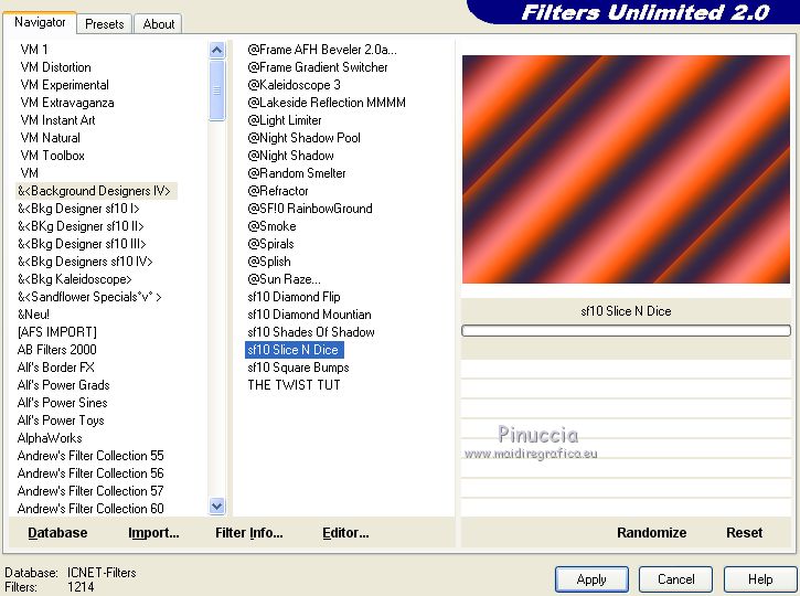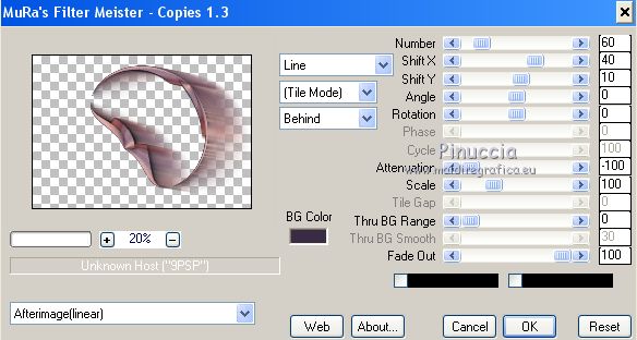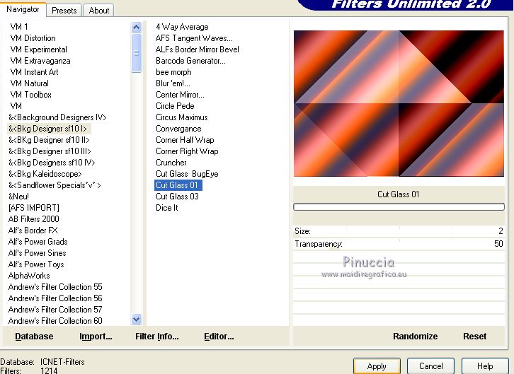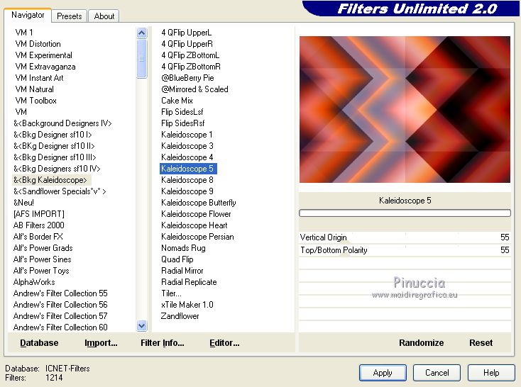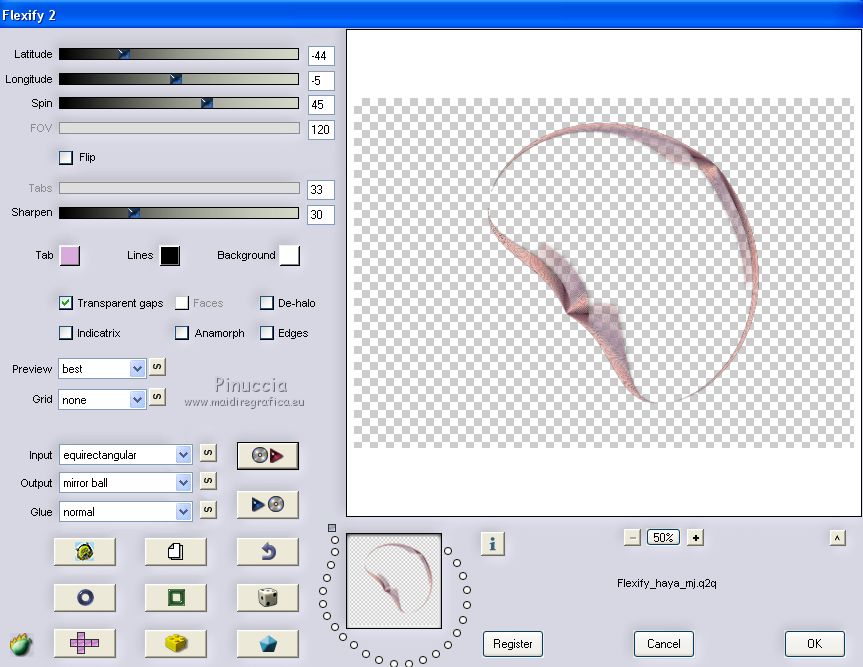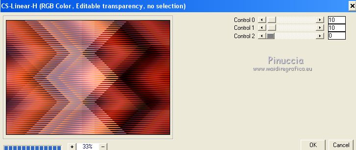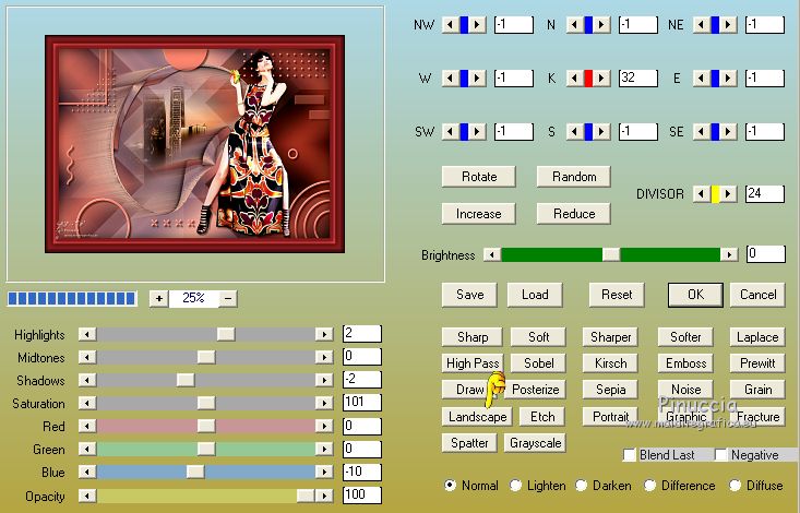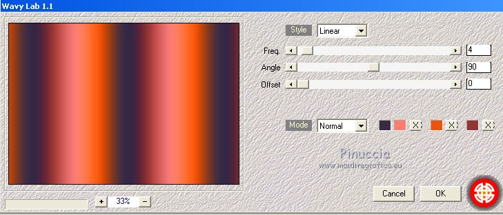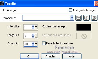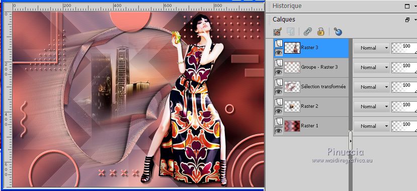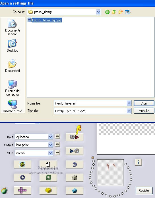 Pour traduire ce tutoriel j'ai utilisé CorelX17, mais il peut également être exécuté avec les autres versions. Suivant la version utilisée, vous pouvez obtenir des résultats différents. Depuis la version X4, la fonction Image>Miroir a été remplacée par Image>Renverser horizontalement, et Image>Renverser avec Image>Renverser verticalement . Dans les versions X5 et X6, les fonctions ont été améliorées par la mise à disposition du menu Objets. Avec la nouvelle version X7, nous avons encore Image>Miroir et Image>Renverser/Retourner, mais avec nouvelles différences. Voir les détails à ce sujet ici Certaines dénominations ont changées entre les versions de PSP. Les plus frequentes dénominations utilisées: ![]() Vos versions ici Nécessaire pour réaliser ce tutoriel: Matériel ici Merci pour le tube Tocha. (ici les liens vers les sites des créateurs de tubes) Modules Externes: consulter, si nécessaire, ma section des filtres ici Filters Unlimited 2.0 ici &<Background Designers IV> - sf10 Slice N Dice (à importer dans Unlimited) ici &<Background Designer sf10I> - Cut Glass 01 (à importer dans Unlimited) ici &<Background Kaleidoscope> - Kaleidoscope 5 (à importer dans Unlimited) ici Carolaine and Sensibility - CS-Linear-H ici Mehdi - Wavy Lab 1.1. ici Flaming Pear - Flexify 2 ici AAA Filters - Custom ici Mura's Meister - Copies ici Mura's Seamless - Emboss at Alpha ici Filtres Mura's Seamless peuvent être utilisés seuls ou importés dans Filters Unlimited. voir comment le faire ici). Si un filtre est fourni avec cette icône, ![]() en fonction des couleurs utilisées, vous pouvez changer le mode mélange et l'opacité des calques. Dans les plus récentes versions de PSP, vous ne trouvez pas le dégradé d'avant plan/arrière plan ou Corel_06_029. Vous pouvez utiliser le dégradé des versions antérieures. Ici le dossier Dégradés de CorelX. Placer le preset pour Flexify dans un dossier à choix. De ce dossier vous l'importerez lorque vous en aurez besoin. Placer le cadre dans le dossier Cadres Placer les sélections dans le dossier Sélections. Ouvrir le masque dans PSP et le minimiser avec le reste du matériel. Placer en avant plan la couleur #ff7c9f et en arrière plan la couleur #392b44. ![]() per il mio esempio ho usato il colore rosso #ff4836 ![]() 1. Ouvrir une nouvelle image transparente 1000 x 700 pixels. 2. Effets>Modules Externes>Mehdi - Wavy Lab 1.1. Ce filtre crée des dégradés avec les couleurs de votre palette: la première est la couleur d'arrière plan, la deuxième est la couleur d'avant plan. Des autres deux couleurs créées par le filtre changer la troisième avec #ef5309, et la quatrième avec #943435. ![]() 3. Effets>Modules Externes>Filters Unlimited 2.0 - &<Background Designers IV> - sf10 Slice N Dice ![]() 4. Effets>Modules Externes>Filters Unlimited 2.0 - &<Background Designer sf10I> - Cut Glass 01. ![]() 5. Effets>Modules Externes>Filters Unlimited 2.0 - &<Background Kaleidoscope> - Kaleidoscope 5 ![]() 6. Effets>Modules Externes>Carolaine and Sensibility - CS-Linear-H. ![]() 7. Sélections>Charger/Enregistrer une sélection>Charger à partir du disque. Chercher et charger la sélection haya_mj. ![]() Sélections>Transformer la sélection en calque. Sélections>Désélectionner tout. 8. Effets>Effets de textures>Textile ![]() 9. Réglage>Netteté>Davantage de netteté. Effets>Effets 3D>Ombre portée, couleur noire. ![]() 10. Effets>Effets d'image>Mosaïque sans jointures. ![]() 11. Calques>Dupliquer. Image>Miroir. Image>Renverser. Calques>Fusionner>Fusionner le calque de dessous. 12. Effets>Effets géométriques>Cercle. ![]() Image>Redimensionner, à 90%, redimensionner tous les calques décoché. 13. Effets>Modules Externes>Flaming Pear - Flexify 2. Cliquer sur le bouton rouge, chercher et sélectionner le preset dans le dossier où vous l'avez copié ![]() Ci-dessous les réglages, en cas de problèmes avec le preset ![]() 14. Effets>Modules Externes>Mura's Meister - Copies. ![]() Image>Miroir. 15. Sélections>Charger/Enregistrer une sélection>Charger à partir du disque. Chercher et charger la sélection haya_1_mj. ![]() Calques>Nouveau calque raster. Calques>Agencer>Déplacer vers le bas. 16. Ouvrir le misted - Édition>Copier. Revenir sur votre travail et Édition>Coller dans la sélection. Sélections>Désélectionner tout. 17. Calques>Nouveau calque raster. Calques>Agencer>Placer en haut de la pile. Remplir le calque avec la couleur #ff8b7f.18. Calques>Nouveau calque de masque>A partir d'une image. Ouvrir le menu deroulant sous la fenêtre d'origine et vous verrez la liste des images ouvertes. Sélectionner le masque maskgeo_mj. ![]() Calques>Fusionner>Fusionner le groupe. 19. Effets>Modules Externes>Mura's Seamless - Emboss at Alpha, par défaut. ![]() 20. Effets>Effets 3D>Ombre portée, couleur noire. ![]() 21. Ouvrir le tube de la femme - Édition>Copier. Revenir sur votre travail et Édition>Coller comme nouveau calque. Image>Redimensionner, à 58%, redimensionner tous les calques décoché. Déplacer le tube à droite.Effets>Effets 3D>Ombre portée, à choix. La tag et les calques ![]() Calques>Fusionner>Calques visibles. 22. Image>Cadre - Sélectionner le cadre cadre_haya_renee ![]() Coloriser, si vous utilisez des autres couleurs. Effets>Effets 3D>Ombre portée, couleur noire. ![]() 23. Signer votre travail sur un nouveau calque. Calques>Fusionner>Tous. 24. Image>Ajouter des bordures, 1 pixel, symétrique, couleur noire. Optionnel: Effets>Modules Externes>AAA Filters - Custom - Landscape et ok. ![]() 25. Image>Redimensionner, 1000 pixels de largeur, redimensionner tous les calques coché. Enregistrer en jpg. Version avec tube de Beatriz (le paysage est à moi) ![]() Vos versions ici ![]() Si vous avez des problèmes, ou des doutes, ou vous trouvez un link modifié, ou seulement pour me dire que ce tutoriel vous a plu, vous pouvez m'écrire. 22 Mars 2019 |