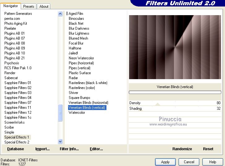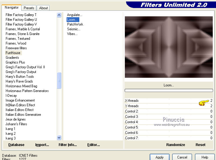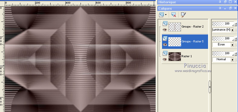 Pour traduire ce tutoriel j'ai utilisé CorelX12, mais il peut également être exécuté avec les autres versions. Suivant la version utilisée, vous pouvez obtenir des résultats différents. Depuis la version X4, la fonction Image>Miroir a été remplacée par Image>Renverser horizontalement, et Image>Renverser avec Image>Renverser verticalement . Dans les versions X5 et X6, les fonctions ont été améliorées par la mise à disposition du menu Objets. Avec la nouvelle version X7, nous avons encore Image>Miroir et Image>Renverser/Retourner, mais avec nouvelles différences. Voir les détails à ce sujet ici Certaines dénominations ont changées entre les versions de PSP. Les plus frequentes dénominations utilisées: ![]() Vos versions ici Nécessaire pour réaliser ce tutoriel: Matériel ici Merci pour les tubes Animabelle et Cickadesign et pour les masques Astrid et Casio. (ici les liens vers les sites des créateurs de tubes) Modules Externes: consulter, si nécessaire, ma section des filtres ici Filters Unlimited 2.0 ici Simple - Blintz ici Mura's Seamless - Emboss at Alpha ici Graphics Plus - Vertical Mirror ici Funhouse - Loom ici Filtres Simple, Graphics Plus, Mura's Seamless et Funhouse peuvent être utilisés seuls ou importés dans Filters Unlimited. voir comment le faire ici). Si un filtre est fourni avec cette icône, ![]() en fonction des couleurs utilisées, vous pouvez changer le mode mélange et l'opacité des calques. Dans les plus récentes versions de PSP, vous ne trouvez pas le dégradé d'avant plan/arrière plan ou Corel_06_029. Vous pouvez utiliser le dégradé des versions antérieures. Ici le dossier Dégradés de CorelX. Placer le preset dans le dossier Paramètres par défaut. Ouvrir les masques dans PSP et les minimiser avec le reste du matériel. 1. Choisir deux couleurs à votre goût. Mes couleurs: avant plan #a49290, arrière plan #433837. ![]() Préparer en avant plan un dégradé de premier plan/arrière plan, style Radial. ![]() Ouvrir une nouvelle image transparente 1000 x 700 pixels. Remplir l'image transparente du dégradé.2. Effets>Modules Externes>Filters Unlimited 2.0 - Special Effects 1 - Plastic Surface, par défaut. ![]() 3. Effets>Modules Externes>Filters Unlimited 2.0 - Special Effects 1 - Venetian Blinds (vertical), par défaut. ![]() 4. Effets>Modules Externes>Simple - Blintz. Image>Renverser. 5. Effets>Modules Externes>Simple - Blintz. ![]() 6. Effets>Effets de réflexion>Miroir rotatif, par défaut. ![]() 7. Effets>Modules Externes>Graphics Plus - Vertical Mirror. ![]() 8. Effets>Modules Externes>Filters Unlimited 2.0 - Funhouse - Loom. ![]() 9. Placer en avant plan la couleur. Calques>Nouveau calque raster. Remplir le calque avec la couleur claire d'avant plan.10. Calques>Nouveau calque de masque>A partir d'une image. Ouvrir le menu deroulant sous la fenêtre d'origine et vous verrez la liste des images ouvertes. Sélectionner le masque Astrid masker 99. ![]() Calques>Fusionner>Fusionner le groupe. 11. Effets>Modules Externes>Mura's Seamless - Emboss at Alpha, par défaut ![]() 12. Effets>Effets de réflexion>Miroir rotatif, par défaut. 13. Effets>Effets d'image>Mosaïque sans jointures. ![]() Placer le calque en mode Luminance (héritée) ou autre. ![]() 14. Calques>Nouveau calque raster. Remplir le calque avec la couleur claire.15. Calques>Nouveau calque de masque>A partir d'une image. Ouvrir le menu deroulant sous la fenêtre d'origine et sélectionner le masque cas_mask4. ![]() Calques>Fusionner>Fusionner le groupe. 16. Effets>Modules Externes>Mura's Seamless - Emboss at Alpha, par défaut 17. Touche K sur le clavier pour activer l'outil Sélecteur ![]() ouvrir le menu des preset et sélectionner le preset marjo_2 ![]() Résultat Position horiz.: 0,00 et Position vert.: 251,00. ![]() Touche M pour désélectionner l'outil. 18. Effets>Effets de distorsion>Vent - vers la gauche, intensité 100. ![]() Répéter l'Effet Vent vers la droite ![]() 19. Réglage>Netteté>Davantage de netteté. Placer le calque en mode Écran ou autre. Calques>Agencer>Déplacer vers le bas ![]() 20. Ouvrir le tube deco_1_mj - Édition>Copier. Revenir sur votre travail et Édition>Coller comme nouveau calque. Calques>Agencer>Placer en haut de la pile. Effets>Effets 3D>Ombre portée, couleur noire. ![]() 21. Ouvrir le tube deco_2_mj Édition>Copier. Revenir sur votre travail et Édition>Coller comme nouveau calque. Placer le calque en mode Luminance (héritée) ou autre et réduire l'opacité à 75% 22. Vous positionner sur le calque Raster 1. Ouvrir le misted Édition>Copier. Revenir sur votre travail et Édition>Coller comme nouveau calque. Si nécessaire, réduire l'opacité de ce calque à votre goût. La tag et les calques (placer modes mélange et opacitées à votre goût) ![]() Calques>Fusionner>Calques visibles. 23. Ouvrir le tube de la femme Édition>Copier. Revenir sur votre travail et Édition>Coller comme nouveau calque. Positionner le tube à votre goûtEffets>Effets 3D>Ombre portée, à choix. 24. Image>Ajouter des bordures, 1 pixel, symétrique, couleur noire. Image>Ajouter des bordures, 10 pixels, symétrique, couleur claire. Image>Ajouter des bordures, 2 pixels, symétrique, couleur noire. Image>Ajouter des bordures, 30 pixels, symétrique, couleur claire. Image>Ajouter des bordures, 1 pixel, symétrique, couleur noire. 25. Signer votre travail sur un nouveau calque. Calques>Fusionner>Tous. 26. Image>Redimensionner, 1000 pixels di largeur, redimensionner tous les calques coché. Enregistrer en jpg. Version avec tubes de Luz Cristina ![]() Vos versions ici ![]() Si vous avez des problèmes, ou des doutes, ou vous trouvez un link modifié, ou seulement pour me dire que ce tutoriel vous a plu, vous pouvez m'écrire. 27 Novembre 2019 |