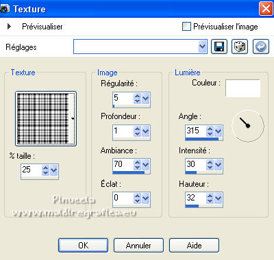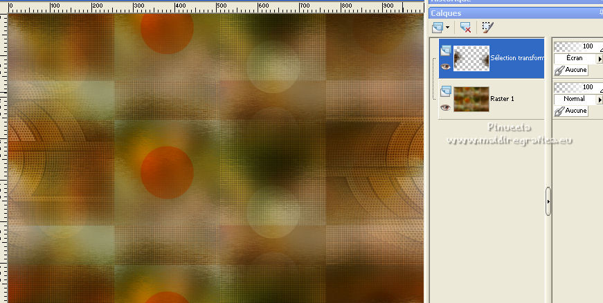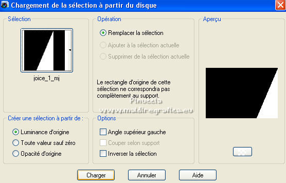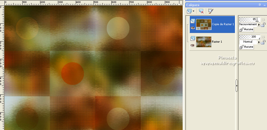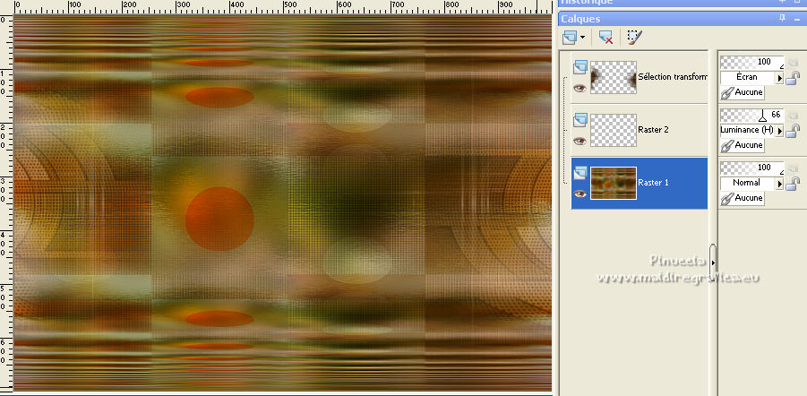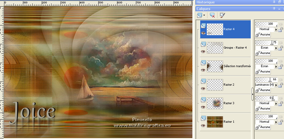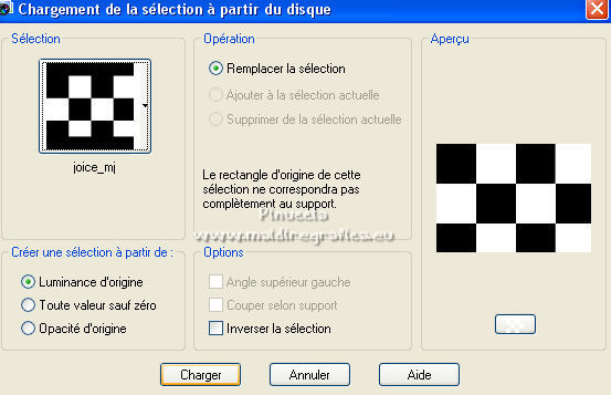 Pour traduire ce tutoriel j'ai utilisé PSPX7, PSPX2 et PSPX3, mais il peut également être exécuté avec les autres versions. Suivant la version utilisée, vous pouvez obtenir des résultats différents. Depuis la version X4, la fonction Image>Miroir a été remplacée par Image>Renverser horizontalement, et Image>Renverser avec Image>Renverser verticalement . Dans les versions X5 et X6, les fonctions ont été améliorées par la mise à disposition du menu Objets. Avec la nouvelle version X7, nous avons encore Image>Miroir et Image>Renverser/Retourner, mais avec nouvelles différences. Voir les détails à ce sujet ici Certaines dénominations ont changées entre les versions de PSP. Les plus frequentes dénominations utilisées: ![]() English translation here Vos versions ici![]() Nécessaire pour réaliser ce tutoriel: Matériel ici Pour le tube et le masque merci Querida et Astrid. Le reste du matériel est de Maria José. (ici les liens vers les sites des créateurs du matériel) Modules Externes: consulter, si nécessaire, ma section des filtres ici Filters Unlimited 2.0 ici Photo Tools - Gradient Sky-Compliment ici Neology - Vasarely Mosaic ici Carolaine and Sensibility - CS-BRectangles, CS-LDots ici Toadies - Weaver ici Flaming Pear - Sphere Warp B, Sphere Warp A ici Unplugged Tools - Renaissance ici Mura's Seamless - Emboss at Alpha ici Filtres Photo Tools, Neology, Toadies, Unplugged et Mura's Seamless peuvent être utilisés seuls ou importés dans Filters Unlimited. voir comment le faire ici). Si un filtre est fourni avec cette icône, ![]() en fonction des couleurs utilisées, vous pouvez changer le mode mélange et l'opacité des calques. Placer la texture Cuadros 1 dans le dossier Textures. Placer les sélections dans le dossier Sélections. Ouvrir le masque dans PSP et le minimiser avec le reste du matériel. 1. Placer en avant plan la couleur #b6b2a4, et en arrière plan la couleur #4c4433. ![]() 2. Ouvrir une nouvelle image transparente 1000 x 700 pixels. Sélections>Sélectionner tout. 3. Ouvrir l'image en jpg backjoice_mj et Édition>Copier. Revenir sur votre travail et Édition>Coller dans la sélection. Sélections>Désélectionner tout. Coloriser à votre goût. Pour mon exemple, j'ai fait: Effets>Modules Externes>Photo Tools - Gradient Sky-Compliment ![]() pour ma deuxième version, j'ai utilisé l'effet dans Unlimited, et j'ai cliqué sur Randomize jusqu'à ce que j'ai trouvé le résultat qui me plaisait le plus. ![]() 4. Effets>Effets d'image>Mosaïque sans jointures. ![]() 5. Calques>Dupliquer. Effets>Modules Externes>Neology - Vasarely Mosaic. ![]() 6. Sélections>Charger/Enregistrer une sélection>Charger à partir du disque. Chercher et charger la sélection joice_mj. ![]() 7. Réglage>Flou>Flou gaussien - rayon 25. ![]() 8. Effets>Effets de textures>Textures - sélectionner la texture Cuadros 1 ![]() Sélections>Désélectionner tout. Placer le calque en mode Recouvrement et réduire l'opacité à 85%. ![]() Calques>Fusionner>Fusionner le calque de dessous. 9. Effets>Effets d'image>Mosaïque sans jointures. ![]() 10. Sélections>Charger/Enregistrer une sélection>Charger à partir du disque. Chercher et charger la sélection joice_1_mj. ![]() Sélections>Transformer la sélection en calque. 11. Réglage>Flou>Flou gaussien - rayon 25. ![]() 12. Effets>Modules Externes>Carolaine and Sensibility - CS-BRectangles. ![]() Sélections>Désélectionner tout. 13. Effets>Modules Externes>Toadies - Weaver, par défaut. ![]() 14. Effets>Modules Externes>Carolaine and Sensibility - CS-LDots. ![]() 15. Calques>Dupliquer. Image>Miroir. Image>Renverser. Calques>Fusionner>Fusionner le calque de dessous. 16. Effets>Modules Externes>Flaming Pear - Sphere Warp B. 17. Réglage>Netteté>Davantage de netteté. 18. Effets>Modules Externes>Unplugged Tools - Renaissance. ![]() Placer le calque en mode Écran. ![]() 19. Ouvrir le tube decojoice_mj et Édition>Copier. Revenir sur votre travail et Édition>Coller comme nouveau calque. Placer le calque en mode Luminance (héritée), ou à votre goût, et réduire l'opacité à 66%. Calques>Agencer>Déplacer vers le bas. 20. Vous positionner sur le calque Raster 1. Effets>Modules Externes>Flaming Pear - Sphere Warp A. 21. Réglage>Netteté>Davantage de netteté. ![]() 22. Ouvrir le misted et Édition>Copier. Revenir sur votre travail et Édition>Coller comme nouveau calque. Touche K sur le clavier pour activer l'outil Sélecteur ![]() placer Position horiz.: 300,00 et garder Position vert.: 10,00. ![]() ces réglages sont pour le tube utilisé ![]() Touche M pour désélectionner l'outil. Réduire l'opacité de ce calque +/-81%. 23. Calques>Nouveau calque raster. Calques>Agencer>Placer en haut de la pile. Remplir le calque avec la couleur d'avant plan #b6b2a4.24. Calques>Nouveau calque de masque>A partir d'une image. Ouvrir le menu deroulant sous la fenêtre d'origine et vous verrez la liste des images ouvertes. Sélectionner le masque Astrid masker 157a. ![]() Calques>Fusionner>Fusionner le groupe. 25. Effets>Modules Externes>Mura's Seamless - Emboss at Alpha, par défaut. ![]() Placer le calque en mode Écran si nécessaire réduire l'opacité +/-75% ou à votre goût. 26. Ouvrir le tube texto2 et Édition>Copier. Revenir sur votre travail et Édition>Coller comme nouveau calque. Positionner le texte à votre convenance, ou voir mon exemple.Placer le calque en mode Lumière douce ou à votre goût. La tag et les calques - adapter Modes mélange et opacités en fonction de vos couleurs. ![]() 27. Image>Ajouter des bordures, 1 pixel, symétrique, couleur noire. Image>Ajouter des bordures, 10 pixels, symétrique, couleur claire d'avant plan #b6b2a4. Image>Ajouter des bordures, 1 pixel, symétrique, couleur noire. Image>Ajouter des bordures, 15 pixels, symétrique, couleur foncée d'arrière plan #4c4433. Image>Ajouter des bordures, 1 pixel, symétrique, couleur noire. Image>Ajouter des bordures, 20 pixels, symétrique, couleur claire