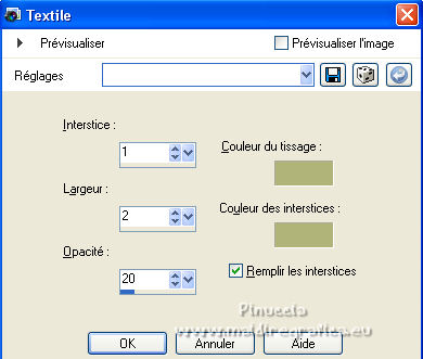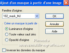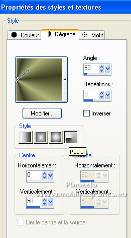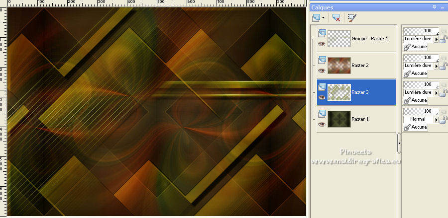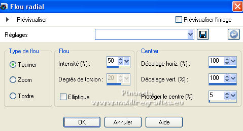 Pour traduire ce tutoriel j'ai utilisé PSPX7, PSPX2 et PSPX3, mais il peut également être exécuté avec les autres versions. Suivant la version utilisée, vous pouvez obtenir des résultats différents. Depuis la version X4, la fonction Image>Miroir a été remplacée par Image>Renverser horizontalement, et Image>Renverser avec Image>Renverser verticalement . Dans les versions X5 et X6, les fonctions ont été améliorées par la mise à disposition du menu Objets. Avec la nouvelle version X7, nous avons encore Image>Miroir et Image>Renverser/Retourner, mais avec nouvelles différences. Voir les détails à ce sujet ici Certaines dénominations ont changées entre les versions de PSP. Les plus frequentes dénominations utilisées: ![]() English translation here Vos versions ici![]() Nécessaire pour réaliser ce tutoriel: Matériel ici Le matériel est de Maria José. (ici les liens vers les sites des créateurs du matériel) Modules Externes: consulter, si nécessaire, ma section des filtres ici Filters Unlimited 2.0 ici Flaming Pear - Flexify 2 ici Mura's Seamless - Emboss at Alpha ici VM Extravaganza - Holidays in Egypt ici Mura's Meister - Copies ici Graphics Plus - Vertical Mirror ici Mehdi - Edge FX ici Simple - Diamonds ici Filtres Mura Seamless, VM Extravaganza, Graphics Plus et Simple peuvent être utilisés seuls ou importés dans Filters Unlimited. voir comment le faire ici). Si un filtre est fourni avec cette icône, ![]() en fonction des couleurs utilisées, vous pouvez changer le mode mélange et l'opacité des calques. Dans les plus récentes versions de PSP, vous ne trouvez pas le dégradé d'avant plan/arrière plan ou Corel_06_029. Vous pouvez utiliser le dégradé des versions antérieures. Ici le dossier Dégradés de CorelX. Placer le preset pour Flexify dans un dossier à choix. Vous l'importerez de ce dossier lorsque vous en aurez besoin. Ouvrir le masque dans PSP et le minimiser avec le reste du matériel. 1. Placer en avant plan la couleur #b0b478, et en arrière plan la couleur #3d3f23. ![]() Ouvrir une nouvelle image transparente 1000 x 700 pixels. Remplir l'image transparente avec la couleur claire d'avant plan.2. Calques>Nouveau calque de masque>A partir d'une image. Ouvrir le menu deroulant sous la fenêtre d'origine et vous verrez la liste des images ouvertes. Sélectionner le masque 182_mask_MJ. ![]() Calques>Fusionner>Fusionner le groupe. 3. Effets>Modules Externes>Mura's Seamless - Emboss at Alpha, par défaut. ![]() 4. Effets>Effets 3D>Ombre portée, par défaut. ![]() Placer le calque en mode Lumière dure. 5. Préparer en avant plan un dégradé de premier plan/arrière plan, style Radial. ![]() Calques>Nouveau calque raster. Calques>Agencer>Placer en bas de la pile. Remplir le calque du dégradé.6. Réglage>Flou>Flou gaussien - rayon 50. ![]() 7. Effets>Modules Externes>VM Extravaganza - Holidays in Egypt ![]() 8. Effets>Modules Externes>Graphics Plus - Vertical Mirror, par défaut. ![]() 9. Effets>Effets de réflexion>Miroir rotatif, par défaut. ![]() 10. Effets>Modules Externes>Mehdi - Edges FX - couleur claire. ![]() 11. Réglage>Netteté>Davantage de netteté. 12. Calques>Nouveau calque raster. Sélections>Sélectionner tout. 13. Ouvrir le tube mistedblur (bien coloré) - Édition>Copier. Revenir sur votre travail et Édition>Coller dans la sélection. Sélections>Désélectionner tout. 14. Réglage>Flou>Flou radial. ![]() 15. Calques>Dupliquer. Calques>Fusionner>Fusionner le calque de dessous. 16. Effets>Modules Externes>Flaming Pear - Flexify 2 cliquer sur le bouton rouge et chercher, dans le dossier où vous l'avez copié, le preset justine-Flexify 2 ![]() et ok ![]() 17. Effets>Effets d'image>Mosaïque sans jointures. ![]() Placer le calque en mode Lumière dure. Réglage>Netteté>Davantage de netteté. 18. Calques>Nouveau calque raster. Calques>Agencer>Déplacer vers le bas. Placer en avant plan la Couleur. Remplir le calque avec la couleur claire.19. Image>Redimensionner, à 80%, redimensionner tous les calques décoché. Activer l'outil Baguette magique ![]() et cliquer dans l'image pour la sélectionner. Sélections>Modifier>Contracter - 5 pixels. Presser CANC sur le clavier ![]() Sélections>Désélectionner tout. 20. Effets>Effets de réflexion>Kaléïdoscope. ![]() 21. Effets>Modules Externes>Mura's Meister - Copies. ![]() 22. Effets>Modules Externes>Simple - Diamonds. 23. Effets>Modules Externes>Mehdi - Edges FX, comme précédemment mais avec la couleur foncée #3d3f23. ![]() Placer le calque en mode Lumière dure. 24. Effets>Effets 3D>Ombre portée, par défaut. ![]() La tag et les calques - adapter Modes mélange en fonction des vos couleurs. ![]() 25. Vous positionner sur le calque du haut de la pile. Ouvrir le misted rosarosa et Édition>Copier. Revenir sur votre travail et Édition>Coller comme nouveau calque. Touche K sur le clavier pour activer l'outil Sélecteur ![]() et placer Position horiz.: 474,00 et Position vert.: -16,00. ![]() Touche M pour désélectionner l'outil. 26. Image>Ajouter des bordures, 1 pixel, symétrique, couleur noire. Calques>Dupliquer. 27. Réglage>Flou>Flou gaussien - rayon 50. ![]() 28. Sélections>Sélectionner tout. Sélections>Modifier>Progressivité intérieure/extérieure. ![]() Presser CANC sur le clavier. 29. Effets>Effets de textures>Textile les deux couleurs: couleur claire d'avant plan ![]() Sélections>Désélectionner tout. 30. Image>Ajouter des bordures, 1 pixel, symétrique, couleur noire. Sélections>Sélectionner tout. Édition>Copier. Image>Ajouter des bordures, 50 pixels, symétrique, couleur blanche. 31. Sélections>Inverser. Édition>Coller dans la sélection. Effets>Effets 3D>Ombre portée, couleur noire. ![]() 32. Sélections>Sélectionner tout. Sélections>Modifier>Contracter - 25 pixels. Effets>Effets 3D>Ombre portée, comme précédemment. Sélections>Désélectionner tout. 33. Ouvrir le tube de la femme et Édition>Copier. Revenir sur votre travail et Édition>Coller c