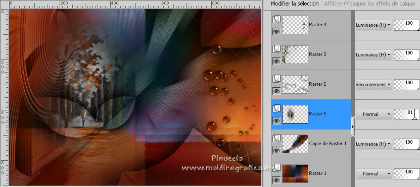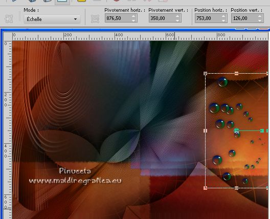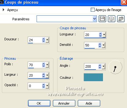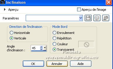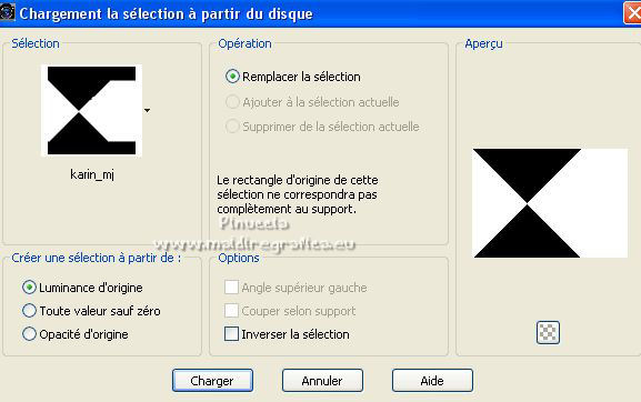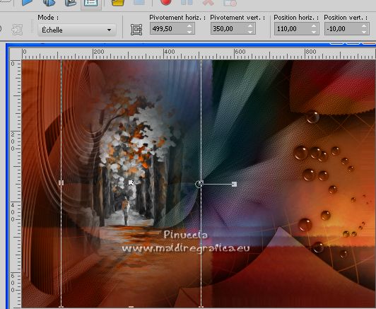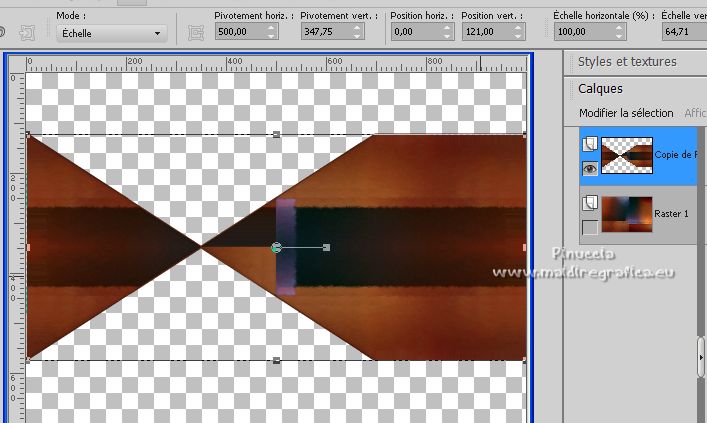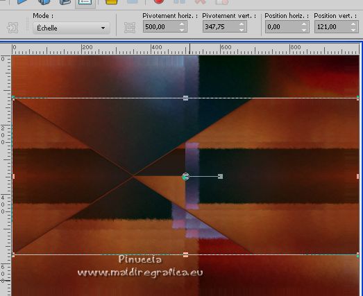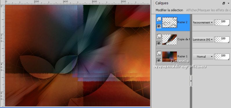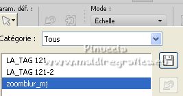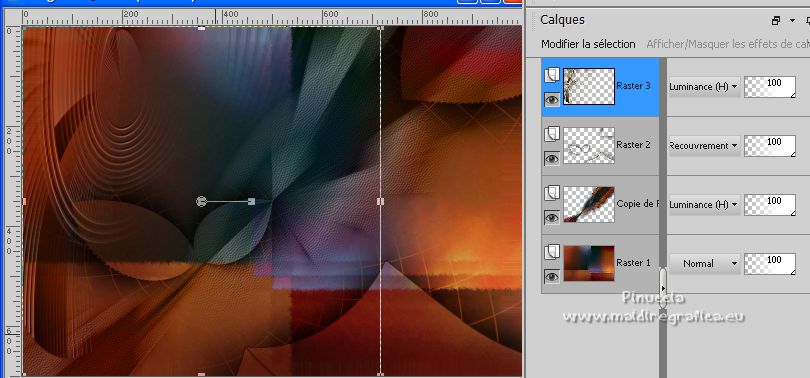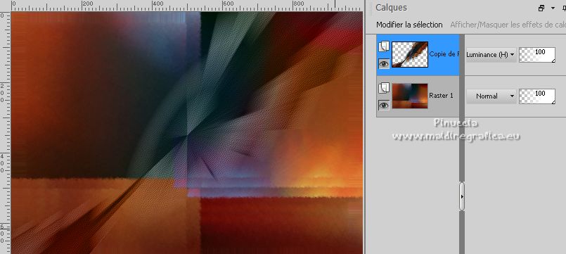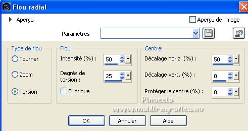 Pour traduire ce tutoriel j'ai utilisé PSPX7, PSPX2 et PSPX3, mais il peut également être exécuté avec les autres versions. Suivant la version utilisée, vous pouvez obtenir des résultats différents. Depuis la version X4, la fonction Image>Miroir a été remplacée par Image>Renverser horizontalement, et Image>Renverser avec Image>Renverser verticalement . Dans les versions X5 et X6, les fonctions ont été améliorées par la mise à disposition du menu Objets. Avec la nouvelle version X7, nous avons encore Image>Miroir et Image>Renverser/Retourner, mais avec nouvelles différences. Voir les détails à ce sujet ici Certaines dénominations ont changées entre les versions de PSP. Les plus frequentes dénominations utilisées: ![]() English translation here Vos versions ici![]() Nécessaire pour réaliser ce tutoriel: Matériel ici Pour le tube merci Nena Silva. Le reste du matériel est de Maria José. (ici les liens vers les sites des créateurs du matériel) Modules Externes: consulter, si nécessaire, ma section des filtres ici Filters Unlimited 2.0 ici Mehdi - Sorting Tiles ici Fantastic Machine - Paint Engine ici VanDerLee - Unplugged-X ici Simple - Pizza Slice Mirror ici VM Toolbox - Zoom blur ici AAA Frames - Foto Frame ici Filtres Simple et VM Toolbox peuvent être utilisés seuls ou importés dans Filters Unlimited. voir comment le faire ici). Si un filtre est fourni avec cette icône, ![]() en fonction des couleurs utilisées, vous pouvez changer le mode mélange et l'opacité des calques. Placer le preset Preset_Pick_zoomblur_mj dans le dossier Paramètres par défaut. Placer la texture brown_172 dans le dossier Textures. Placer la sélection dans le dossier Sélections. 1. Ouvrir l'image en jpg graficorouge (ou une votre image). Édition>Copier. Choisir deux couleurs de votre image; pour l'exemple: couleur d'avant plan #421410, couleur d'arrière plan #3e93ab. ![]() 2. Ouvrir une nouvelle image transparente 1000 x 700 pixels. Sélections>Sélectionner tout. Édition>Coller dans la sélection. Sélections>Désélectionner tout. 3. Réglage>Flou>Flou radial. ![]() 4. Effets>Effets de traits ou Effets Média Art>Coups de pinceau, couleur d'arrière plan. ![]() selon les resources mémoire de votre ordinateur l'attente peur paraître longue; ne t'inquiète pas 5. Effets>Modules Externes>Mehdi - Sorting Tiles. ![]() 6. Effets>Modules Externes>Fantastic Machine - Paint Engine sélectionner le preset impression 1 et cochér Input et Line. ![]() si vous avez problèmes avec l'installation du filtre voir ici En tous cas, vous pouvez copier manuellement les réglages de la capture 7. Effets>Modules Externes>VanDerLee - Unplugged-X - Lens Reflect. ![]() 8. Calques>Dupliquer. Effets>Modules Externes>Simple - Pizza Slice Mirror. Ce filtre travaille sans fenêtre; résultat ![]() 9. Sélections>Charger/Enregistrer une sélection>Charger à partir du disque. Chercher et charger la sélection karin_mj. ![]() 10. Sélections>Inverser. Presser CANC sur le clavier ![]() Effets>Effets 3D>Ombre portée, couleur noire. ![]() Sélections>Désélectionner tout. 11. Touche K sur le clavier pour activer l'outil Sélecteur ![]() ouvrir le menu des preset et sélectionner le preset zoomblur_mj. ![]() ![]() Touche M pour désélectionner l'outil. Si vous fermez le calque de dessous ![]() 12. Effets>Modules Externes>VM Toolbox - Zoom Blur, par défaut. ![]() 13. Effets>Effets géométriques>Inclinaison. ![]() 14. Effets>Effets de textures>Texture - sélectionner la texture brown172. ![]() 15. Réglage>Netteté>Netteté. Placer le calque en mode Luminance (Héritée), ou autre. ![]() Effets>Effets 3D>Ombre portée, couleur noire. ![]() 16. Ouvrir le tube decoflexify_mj et Édition>Copier. Revenir sur votre travail et Édition>Coller comme nouveau calque. Image>Renverser. Placer le calque en mode Recouvrement. ![]() 17. Ouvrir le tube deco_mj et Édition>Copier. Revenir sur votre travail et Édition>Coller comme nouveau calque. 18. Objets>Aligner>Haut et Objets>Aligner>Gauche Si vous travaillez avec une version précédente qui ne rend pas disponible le menu Objets, activer l'outil Sélecteur ![]() et placer Position vert. à 0,00 ![]() Placer le calque en mode Luminance (héritée), ou autre. ![]() 19. Ouvrir le tube deco1_mj et Édition>Copier. Revenir sur votre travail et Édition>Coller comme nouveau calque. Objets>Aligner>Droite. ![]() Placer le calque en mode Luminance (héritée). 20. Ouvrir le misted et Édition>Copier. Revenir sur votre travail et Édition>Coller comme nouveau calque. Si vous utilisez un autre tube, déplacer en haut à gauche.Pour le tube fourni: Touche K pour activer l'outil Sélecteur ![]() et placer Position horiz.: 110,00 et Position vert.: -10,00. ![]() 21. Calques>Agencer>Déplacer vers le bas - 3 fois. Réduire l'opacité de ce calque à 81%. (régler Modes mélange et opacité selon vos couleurs) ![]() 22. Vous positionner sur le calque Raster 1. Édition>Copier. Pour précaution: Édition>Coller comme nouvelle image et minimiser l'image. 23. Revenir sur votre travail. Image>Ajouter des bordures, 1 pixel, symétrique, couleur noire. Image>Ajouter des bordures, 1 pixel, symétrique, couleur d'avant plan #421410. Image>Ajouter des bordures, 1 pixel, symétrique, couleur noire. 24. Sélections>Sélectionner tout. Image>Ajouter des bordures, 50 pixels, symétrique, couleur blanche. 25. Sélections>Inverser. Édition>Coller dans la sélection (l'image de l'étape 22 est en mémoire). 26. Effets>Effets 3D>Ombre portée, couleur noire. ![]() Sélections>Désélectionner tout. 27. Effets>Modules Externes>AAA Frames - Foto Frame. ![]() 28. Ouvrir le tube de la femme et Édition>Copier. Revenir sur votre travail et Édition>Coller comme nouveau calque. Déplacer le tube à gauche, ou à votre goût.Effets>Effets 3D>Ombre portée, à choix. 29. Signer votre travail sur un nouveau calque. Image>Ajouter des bordures, 1 pixel, symétrique, couleur noire. 30. Image>Redimensionne