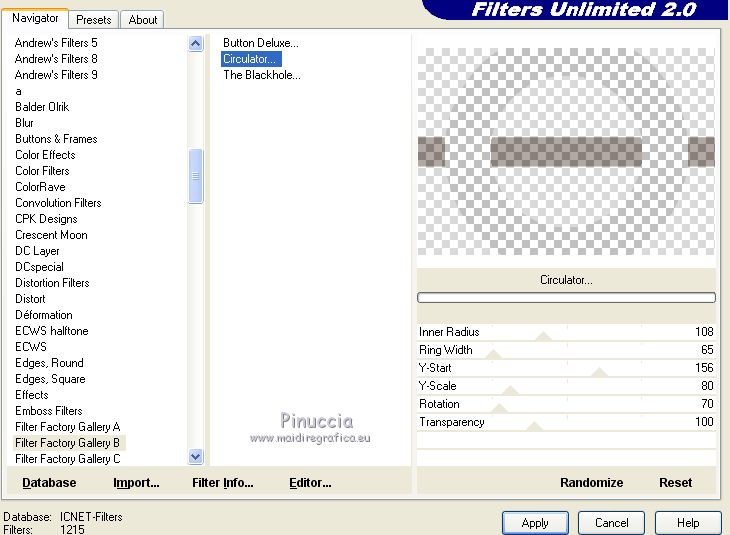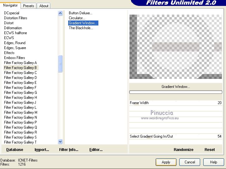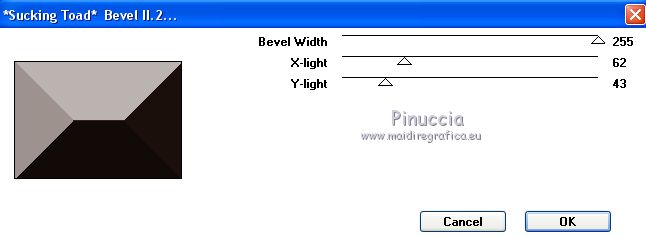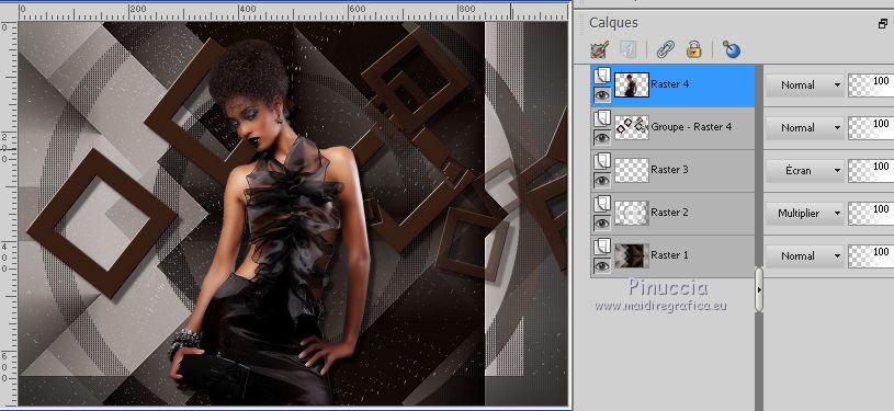 Pour traduire ce tutoriel j'ai utilisé CorelX17, mais il peut également être exécuté avec les autres versions. Suivant la version utilisée, vous pouvez obtenir des résultats différents. Depuis la version X4, la fonction Image>Miroir a été remplacée par Image>Renverser horizontalement, et Image>Renverser avec Image>Renverser verticalement . Dans les versions X5 et X6, les fonctions ont été améliorées par la mise à disposition du menu Objets. Avec la nouvelle version X7, nous avons encore Image>Miroir et Image>Renverser/Retourner, mais avec nouvelles différences. Voir les détails à ce sujet ici Certaines dénominations ont changées entre les versions de PSP. Les plus frequentes dénominations utilisées: ![]() Vos versions ici Nécessaire pour réaliser ce tutoriel: Matériel ici Pour le tube et le masque merci Crealine et @nn. (ici les liens vers les sites des créateurs de tubes) Modules Externes: consulter, si nécessaire, ma section des filtres ici Filters Unlimited 2.0 ici Simple - Blintz ici Graphics Plus - Vertical Mirror ici L&K's - L&K's Katharina ici Filter Factory Gallery B - Circulator, Gradient Window ici Mura's Seamless - Emboss at Alpha ici Filtres Simple, Graphics Plus et Mura's Seamless peuvent être utilisés seuls ou importés dans Filters Unlimited. voir comment le faire ici). Si un filtre est fourni avec cette icône, ![]() en fonction des couleurs utilisées, vous pouvez changer le mode mélange et l'opacité des calques. Dans les plus récentes versions de PSP, vous ne trouvez pas le dégradé d'avant plan/arrière plan ou Corel_06_029. Vous pouvez utiliser le dégradé des versions antérieures. Ici le dossier Dégradés de CorelX. Placer les sélections dans le dossier Sélections. Ouvrir le masque dans PSP et le minimiser avec le reste du matériel. Placer en avant plan la couleur #aea6a3, et en arrière plan la couleur #371f15. ![]() 1. Ouvrir une nouvelle image transparente 1000 x 700 pixels. Remplir l'image transparente avec la couleur d'arrière plan #371f15.2. Effets>Modules Externes>Toadies - Sucking Toad Bevel II.2. ![]() 3. Effets>Effets d'image>Mosaïque sans jointures. ![]() 4. Effets>Modules Externes>Simple - Blintz. Image>Renverser. Effets>modules Externes>Simple - Blintz. 5. Réglage>Netteté>Davantage de netteté. 6. Effets>Modules Externes>Graphics Plus - Vertical mirror. ![]() 7. Sélections>Charger/Enregistrer une sélection>Charger à partir du disque. Chercher et charger la sélection labellenoir_mj ![]() Calques>Nouveau calque raster. Remplir l'image transparente avec la couleur d'arrière plan #371f15.Sélections>Désélectionner tout. 8. Effets>Modules Externes>Filter Factory Gallery B - Circulator ![]() Si vous avez utilisé la version software du Filtre, vous aurez ce-ci ![]() Pour obtenir le résultat du tutoriel, il faut utiliser la version de Unlimited composée de files en format 8bf, vous la trouvez ici Ne pas oublier de supprimer des Emplacement des fichiers la version software. 9. Effets>Modules Externes>Filter Factory Gallery B - Gradient Window ![]() 10. Effets>Modules Externes>L&K's - L&K's Katharina, par défaut. ![]() 11. Image>Miroir. Effets>Modules Externes>L&K's - L&K's Katharina, comme précédemment. ![]() Placer le calque en mode Multiplier. 12. Réglage>Netteté>Davantage de netteté. 13. Ouvrir le tube deco_bellenoir_mj - Édition>Copier. Revenir sur votre travail et Édition>Coller comme nouveau calque. Placer le calque en mode Écran. 14. Calques>Nouveau calque raster. Remplir le calque avec la couleur d'arrière plan.15. Calques>Nouveau calque de masque>A partir d'une image. Ouvrir le menu deroulant sous la fenêtre d'origine et vous verrez la liste des images ouvertes. Sélectionner le masque @nn_030611. ![]() Calques>Fusionner>Fusionner le groupe. 16. Effets>Modules Externes>Mura's Seamless - Emboss at Alpha, par défaut. ![]() Effets>Effets 3D>Ombre portée, par défaut. ![]() 17. Objets>Aligner>Haut, ou activer l'outil Sélecteur ![]() et placer Position vert. à 0,00 ![]() 18. Ouvrir le tube de la femme - Édition>Copier. Revenir sur votre travail et Édition>Coller comme nouveau calque. Image>Redimensionner, à 75%, redimensionner tous les calques décoché. Déplacer le tube à droite.Effets>Effets 3D>Ombre portée, à choix. La tag et les calques ![]() 19. Image>Ajouter des bordures, 1 pixel, symétrique, couleur d'arrière plan #371f15. Image>Ajouter des bordures, 3 pixels, symétrique, couleur d'avant plan #aea6a3. Image>Ajouter des bordures, 1 pixel, symétrique, couleur d'arrière plan #371f15. Image>Ajouter des bordures, 10 pixels, symétrique, couleur d'avant plan #aea6a3. Image>Ajouter des bordures, 1 pixel, symétrique, couleur d'arrière plan #371f15. Image>Ajouter des bordures, 30 pixels, symétrique, couleur d'avant plan #aea6a3. Image>Ajouter des bordures, 1 pixel, symétrique, couleur d'arrière plan #371f15. Image>Ajouter des bordures, 3 pixels, symétrique, couleur d'avant plan #aea6a3. Image>Ajouter des bordures, 1 pixel, symétrique, couleur d'arrière plan #371f15. 20. Sélections>Charger/Enregistrer une sélection>Charger à partir du disque. Chercher et charger la sélection bellenoir_borda. ![]() 21. Effets>Effets 3D>Biseautage intérieur. ![]() Sélections>Désélectionner tout. 22. Signer votre travail sur un nouveau calque. Calques>Fusionner>Tous. 23. Image>Redimensionner, 1000 pixels de largeur, redimensionner tous les calques coché. Enregistrer en jpg. Version avec tube de Thafs ![]() Vos versions ici ![]() Si vous avez des problèmes, ou des doutes, ou vous trouvez un link modifié, ou seulement pour me dire que ce tutoriel vous a plu, vous pouvez m'écrire. 22 Mars 2019 |