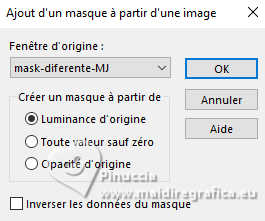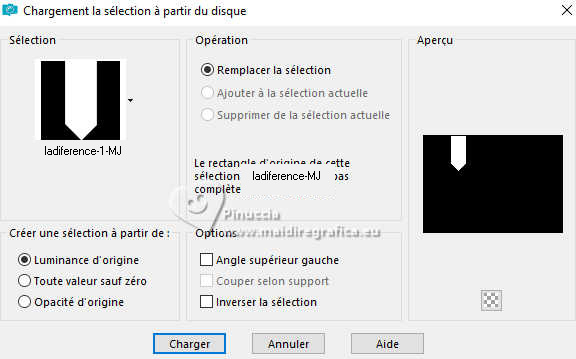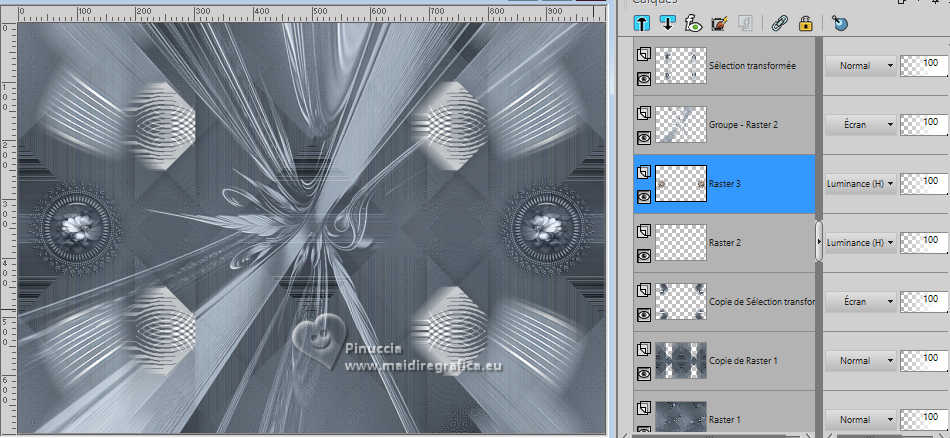 Pour traduire ce tutoriel j'ai utilisé PSPX9 et PSP2020, mais il peut également être exécuté avec les autres versions. Suivant la version utilisée, vous pouvez obtenir des résultats différents. Depuis la version X4, la fonction Image>Miroir a été remplacée par Image>Renverser horizontalement, et Image>Renverser avec Image>Renverser verticalement . Dans les versions X5 et X6, les fonctions ont été améliorées par la mise à disposition du menu Objets. Avec la nouvelle version X7, nous avons encore Image>Miroir et Image>Renverser/Retourner, mais avec nouvelles différences. Voir les détails à ce sujet ici Certaines dénominations ont changées entre les versions de PSP. Les plus frequentes dénominations utilisées: ![]() English translation here Vos versions ici![]() Nécessaire pour réaliser ce tutoriel: ![]() Pour le masque merci Nahah . Le reste du matériel est de Maria José. (ici les liens vers les sites des créateurs du matériel) ![]() consulter, si nécessaire, ma section des filtres ici Filters Unlimited 2.0 ici Mehdi - Sorting Tiles ici &<Bkg Designer sf10I> - Cirquelate, Circus Maximus (à importer dans Unlimited) ici Eye Candy 4000 - Motion Trail ici Mura's Seamless - Emboss at Alpha ici Flaming Pear - Flexify 2 ici FM Tile Tools - Blend Emboss ici VM Stylize - Zoom Blur ici Simple - Top Left Mirror ici Filtres Mura's Seamless, VM Stylize et Simple peuvent être utilisés seuls ou importés dans Filters Unlimited. voir comment le faire ici. Si un filtre est fourni avec cette icône, ![]() en fonction des couleurs utilisées, vous pouvez changer le mode mélange et l'opacité des calques. N'hésitez pas à changer le mode mélange des calques et leur opacité selon les couleurs utilisées. Dans les plus récentes versions de PSP, vous ne trouvez pas le dégradé d'avant plan/arrière plan ou Corel_06_029. Vous pouvez utiliser le dégradés des versions antérieures. Ici le dossier Dégradés de CorelX. ![]() Placer les sélections dans le dossier Sélections. Ouvrir le masque dans PSP et le minimiser avec le reste du matériel. Choisir deux couleur à votre goût. Pour l'exemple: Placer en avant plan la couleur #2d343b, et en arrière plan la couleur #8592a2. ![]() Préparer en avant plan un dégradé de premier plan/arrière plan, style Halo. ![]() 1. Ouvrir une nouvelle image transparente 1000 x 700 pixels. Remplir l'image transparente du dégradé.2. Effets>Modules Externes>Mehdi - Sorting Tiles. ![]() 3. Effets>Effets d'image>Mosaïque sans jointures. ![]() 4. Réglage>Netteté>Davantage de netteté. 5. Effets>Modules Externes>Filters Unlimited 2.0 - &<Bkg Designer sf10I> - Cirquelate. ![]() 6. Effets>Modules Externes>FM Tile Tools - Blend Emboss, par défaut. ![]() Réglage>Netteté>Davantage de netteté. 7. Calques>Dupliquer. Effets>Modules Externes>Simple - Pizza Slice Mirror. Édition>Répéter Pizza Slice Mirror. Résultat ![]() 8. Effets>Effets de réflexion>Miroir rotatif. ![]() 9. Sélections>Charger/Enregistrer une sélection>Charger à partir du disque. Chercher et charger la sélection ladiference-MJ. ![]() ![]() Presser CANC sur le clavier ![]() ![]() 10. Effets>Effets 3D>Ombre portée, couleur noire. ![]() Sélections>Désélectionner tout. ![]() 11. Effets>Effets d'image>Mosaïque sans jointures, comme précédemment. ![]() 12. Effets>Modules Externes>Simple - Top Left Mirror. ![]() 13. Vous positionner sur le calque Raster 1. Sélections>Charger/Enregistrer une sélection>Charger à partir du disque. Chercher et charger la sélection ladiference-1-MJ ![]() Sélections>Transformer la sélection en calque. Calques>Agencer>Placer en haut de la pile. Garder sélectionné. 14. Effets>Modules Externes>Filters Unlimited 2.0 - &<Bkg Designer sf10I> - Circus Maximus. ![]() Sélections>Désélectionner tout. 15. Effets>Modules Externes>Simple - Top Left Mirror ![]() 16. Effets>Modules Externes>Eye Candy 4000 - Motion Trail. ne vous inquiètez pas pour la couleur que vous voyez dans la prévisualisation du filtre ![]() 17. Calques>Dupliquer. Effets>Modules Externes>VM Stylize - Zoom Blur, par défaut. ![]() Cet effet est particulier; au fil des années, il a été contaminé par diverses manipulations. Parfois, dans votre PSP, il peut être trouvé dans le plugin VM Toolbox, et/ou il peut avoir des paramètres différents; les paramètres réguliers sont les deux premiers. Si vous trouvez d'autres paramètres en plus de ceux-ci, vous pouvez les ignorer en toute sécurité 18. Effets>Modules Externes>Simple - Top Left Mirror. ![]() Réglage>Netteté>Davantage de netteté. Placer le calque en mode Écran. 19. Effets>Effets géométriques>Cylindre Vertical. ![]() 20. Vous positionner sur le calque Sélection transformée. Effets>Effets d'image>Mosaïque sans jointures. ![]() Calques>Agencer>Déplacer vers le haut. Optionnel - garder la couleur blanche ou coloriser avec l'outil Changeur de couleur , couleur à choix.21. Calques>Nouveau calque raster. Remplir le calque avec la couleur claire d'arrière plan.22. Calques>Nouveau calque de masque>A partir d'une image. Ouvrir le menu deroulant sous la fenêtre d'origine et vous verrez la liste des images ouvertes. Sélectionner le masque mask-diferente-MJ. ![]() Calques>Fusionner>Fusionner le groupe. 23. Effets>Modules Externes>Mura's Seamless - Emboss at Alpha, par défaut. ![]() 24. Effets>Modules Externes>Flaming Pear - Flexify 2. ![]() 25. Réglage>Netteté>Davantage de netteté. Image>Miroir>Miroir vertical (Image>Renverser). Placer le calque en mode Écran. Calques>Agencer>Déplacer vers le bas. 26. Ouvrir 1-ladiference-deco-MJ ![]() Édition>Copier. Revenir sur votre travail et Édition>Coller comme nouveau calque. Placer le calque en mode Luminance (héritée). Calques>Agencer>Déplacer vers le bas. Effets>Effets 3D>Ombre portée, couleur noire ![]() selon votre tubes et vos préférences, vous pouvez utiliser le tube decofinal-MJ ![]() Voir ma deuxième version La tag et les calques - Mode mélange et