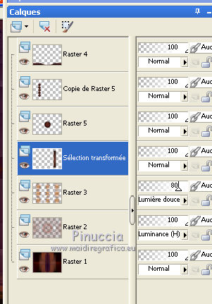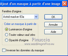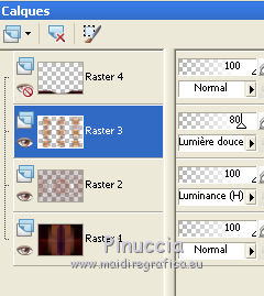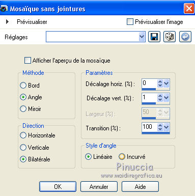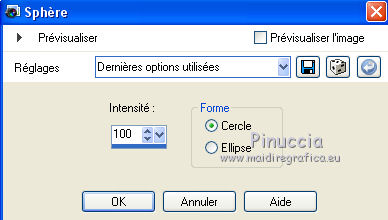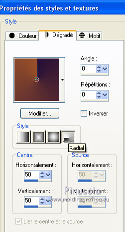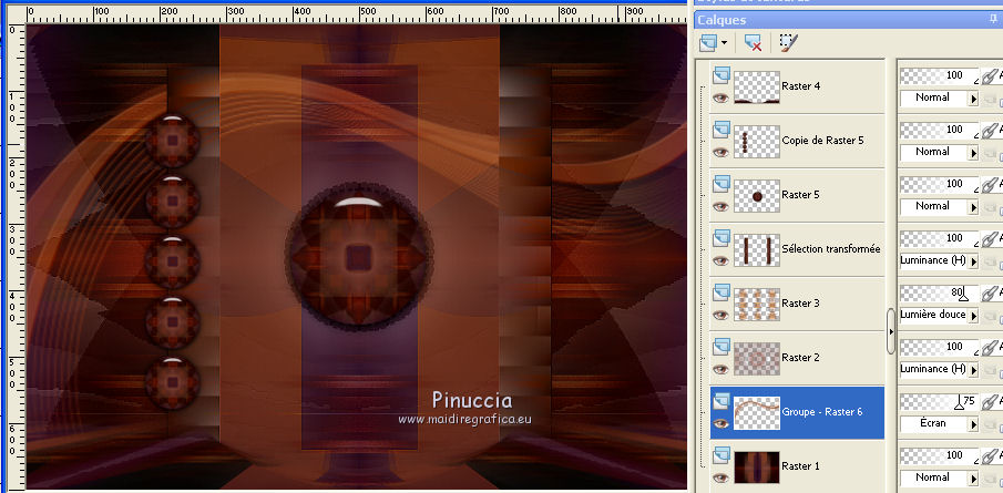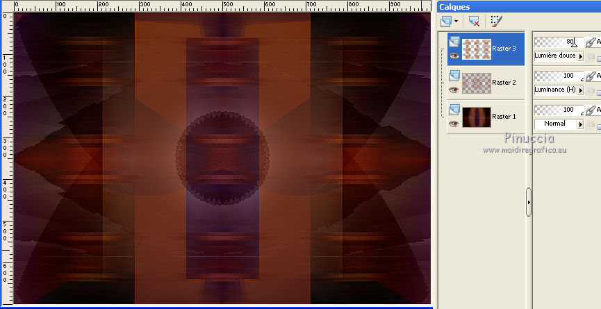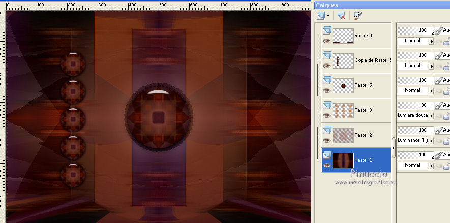 Pour traduire ce tutoriel j'ai utilisé PSPX7, PSPX2 et PSPX3, mais il peut également être exécuté avec les autres versions. Suivant la version utilisée, vous pouvez obtenir des résultats différents. Depuis la version X4, la fonction Image>Miroir a été remplacée par Image>Renverser horizontalement, et Image>Renverser avec Image>Renverser verticalement . Dans les versions X5 et X6, les fonctions ont été améliorées par la mise à disposition du menu Objets. Avec la nouvelle version X7, nous avons encore Image>Miroir et Image>Renverser/Retourner, mais avec nouvelles différences. Voir les détails à ce sujet ici Certaines dénominations ont changées entre les versions de PSP. Les plus frequentes dénominations utilisées: ![]() English translation here Vos versions ici![]() Nécessaire pour réaliser ce tutoriel: Matériel ici Pour le masque merci Astrid Le reste du matériel est de Maria José. (ici les liens vers les sites des créateurs du matériel) Modules Externes: consulter, si nécessaire, ma section des filtres ici Filters Unlimited 2.0 ici Filter Factory Gallery B - Fluttering Flag, Button Deluxe ici VM Distortion - FlipChop ici Krusty's FX vol.II 2.0 - Generator A-2 (Eye), Generator A-2 (Deco) ici Transparency - Eliminate Black ici Mura's Meister - Perspective Tiling ici Mura's Meister - Copies ici Alien Skin Eye Candy 5 Impact - Glass ici Simple - Pizza Slice Mirror, Top Left Mirror ici Toadies - Weaver ici Mura's Seamless - Emboss at Alpha ici Filtres VM Distortion, Factory Gallery, Krusty's Transparency, Simple, Toadies et Mura's Seamless peuvent être utilisés seuls ou importés dans Filters Unlimited. voir comment le faire ici). Si un filtre est fourni avec cette icône, ![]() en fonction des couleurs utilisées, vous pouvez changer le mode mélange et l'opacité des calques. Dans les plus récentes versions de PSP, vous ne trouvez pas le dégradé d'avant plan/arrière plan ou Corel_06_029. Vous pouvez utiliser le dégradé des versions antérieures. Ici le dossier Dégradés de CorelX. Placer le preset En cliquant sur le preset une ou deux fois (selon vos réglages) automatiquement il se placera directement dans le dossier Settings de Alien Skin Eye Candy. pourquoi un ou deux clic voir ici Placer les sélections dans le dossier Sélections. Ouvrir le masque dans PSP et le minimiser avec le reste du matériel. Placer en avant plan la couleur #250f37, et en arrière plan la couleur #995029. ![]() Préparer en avant plan un dégradé de premier plan/arrière plan, style Radial. ![]() 1. Ouvrir une nouvelle image transparente 1000 x 700 pixels. Remplir l'image transparente du dégradé.2. Effets>Modules Externes>VM Distortion - FlipChop. ![]() 3. Effets>Modules Externes>Filter Factory Gallery B - Fluttering Flag, par défaut. ![]() 4. Effets>Modules Externes>Filters Unlimited 2.0 - Filter Factory Gallery B - Button Deluxe, par défaut. ![]() 5. Effets>Effets d'image>Mosaïque sans jointures. ![]() 6. Effets>Effets de réflexion>Miroir rotatif, par dèfaut. ![]() 7. Effets>Effets de bords>Éroder. Effets>Effets de bords>Accentuer. 8. Calques>Nouveau calque raster. Effets>Modules Externes>Krusty's FX vol.II 2.0 - Generator A-2 (Eye), par défaut. ![]() vous pouvez changer les couleurs à votre goût. 9. Calques>Dupliquer. Image>Renverser. Réduire l'opacitè de ce calque à 50%. Calques>Fusionner>Fusionner le calque de dessous. Résultat ![]() 10. Effets>Modules Externes>Transparency - Eliminate Black Cet effet travaille sans fenêtre; résultat ![]() Effets>Effets de bords>Éroder. Effets>Effets de bords>Accentuer. Placer le calque en mode Luminance (héritée). 11. Calques>Nouveau calque raster. Effets>Modules Externes>Krusty's FX vol.II 2.0 - Generator A-2 (Deco), par défaut. ![]() 12. Effets>Effets de réflexion>Miroir rotatif, par dèfaut. ![]() Résultat ![]() 13. Effets>Modules Externes>Transparency - Eliminate Black Résultat ![]() 14. Réglage>Netteté>Davantage de netteté. Placer le calque en mode Lumière douce et réduire l'opacité à 80%. ![]() 15. Édition>Copie Spéciale>Copier avec fusion. Édition>Coller comme nouveau calque. 16. Effets>Modules Externes>Mura's Meister - Perspective Tiling. ![]() 17. Sélections>Charger/Enregistrer une sélection>Charger à partir du disque. Chercher et charger la sélection laurely_mj ![]() Presser +/- 10 fois CANC sur le clavier ![]() Sélections>Désélectionner tout. 18. Effets>Effets géométriques>Sphère. ![]() Fermer ce calque. Vous positionner sur le calque de dessous, Raster 3. ![]() 19. Édition>Copie Spéciale>Copier avec fusion. 20. Sélections>Charger/Enregistrer une sélection>Charger à partir du disque. Chercher et charger la sélection laurely_1_mj ![]() 21. Calques>Nouveau calque raster. Édition>Coller dans la sélection. 22. Effets>Modules Externes>Pizza Slice Mirror. 23. Effets>Modules Externes>Alien Skin Eye Candy 5 Impact - Glass. Sélectionner le preset glass_majo et ok. ![]() Sélections>Désélectionner tout. Effets>Effets 3D>Ombre portée, couleur noire. ![]() 24. Calques>Dupliquer. Image>Redimensionner, à 40%, redimensionner tous les calques décoché. 25. Touche K sur le clavier pour activer l'outil Sélecteur ![]() et placer Position horiz.: 167,00 et Position vert.: 122,00. ![]() Touche M pour désélectionner l'outil. 26. Effets>Modules Externes>Mura's Meister - Copies. ![]() Ré-ouvrir le calque Raster 4. Vous positionner sur le calque Raster 1. ![]() 27. Sélections>Charger/Enregistrer une sélection>Charger à partir du disque. Chercher et charger la sélection laurely_2_mj ![]() Sélections>Transformer la sélection en calque. Calques>Agencer>Déplacer vers le haut - 2 fois. ![]() 28. Effets>Modules Externes>Toadies - Weaver. ![]() Sélections>Désélectionner tout. 29. Effets>Effets de réflexion>Miroir rotatif, par dèfaut. ![]() Placer le calque en mode Luminance (héritée). Vous positionner sur le calque Raster 1. 30. Calques>Nouveau calque raster. Réduire l'opacité