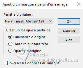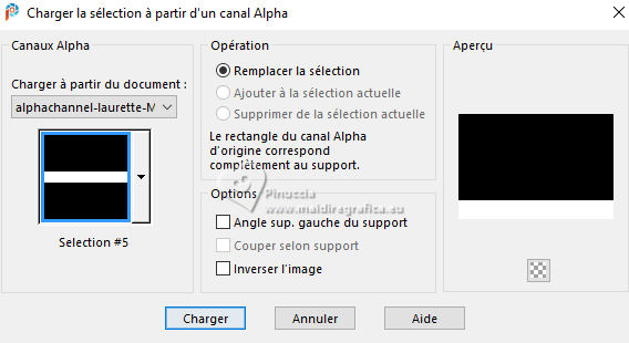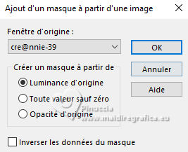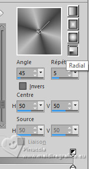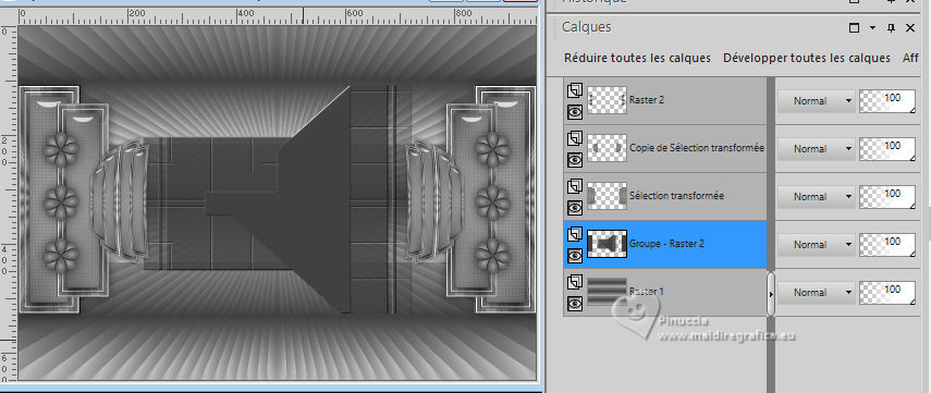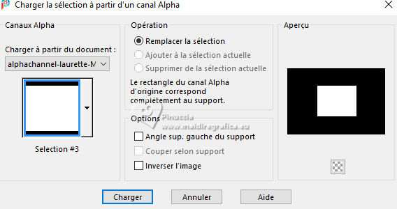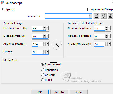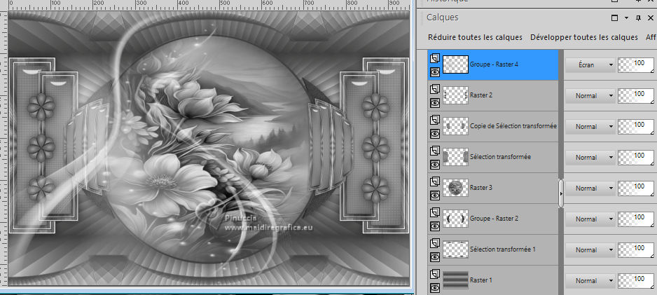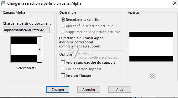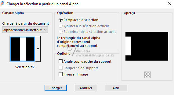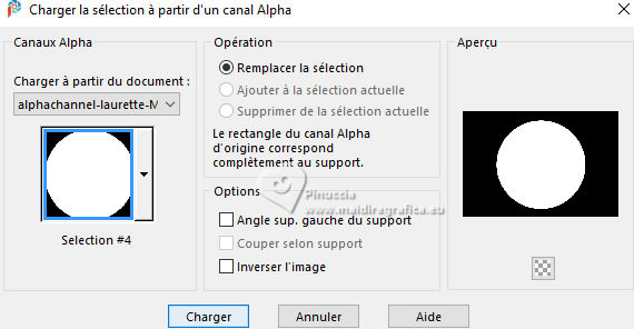 Pour traduire ce tutoriel j'ai utilisé PSPX9 et PSP2020, mais il peut également être exécuté avec les autres versions. Suivant la version utilisée, vous pouvez obtenir des résultats différents. Depuis la version X4, la fonction Image>Miroir a été remplacée par Image>Renverser horizontalement, et Image>Renverser avec Image>Renverser verticalement . Dans les versions X5 et X6, les fonctions ont été améliorées par la mise à disposition du menu Objets. Avec la nouvelle version X7, nous avons encore Image>Miroir et Image>Renverser/Retourner, mais avec nouvelles différences. Voir les détails à ce sujet ici Certaines dénominations ont changées entre les versions de PSP. Les plus frequentes dénominations utilisées: ![]() English translation here Vos versions ici![]() Nécessaire pour réaliser ce tutoriel: ![]() Pour les masques merci Nahar et Creaannie. Le reste du matériel est de Maria José. (ici les liens vers les sites des créateurs du matériel) ![]() consulter, si nécessaire, ma section des filtres ici Filters Unlimited 2.0 ici &<Bkg Designer sf10I> - Convergance (à importer dans Unlimited) ici Mura's Seamless - Emboss at Alpha ici AAA Frames - Foto Frame ici Carolaine and Sensibility - CS-LDots ici Graphics Plus - Horizontal Mirror ici Simple - Top Left Mirror ici Alien Skin Eye Candy 5 Impact - Glass ici Filtres Mura's Seamless, Graphics Plus et Simple peuvent être utilisés seuls ou importés dans Filters Unlimited. voir comment le faire ici. Si un filtre est fourni avec cette icône, ![]() en fonction des couleurs utilisées, vous pouvez changer le mode mélange et l'opacité des calques. N'hésitez pas à changer le mode mélange des calques et leur opacité selon les couleurs utilisées. Dans les plus récentes versions de PSP, vous ne trouvez pas le dégradé d'avant plan/arrière plan ou Corel_06_029. Vous pouvez utiliser le dégradés des versions antérieures. Ici le dossier Dégradés de CorelX. Placer le preset En cliquant sur le preset une ou deux fois (selon vos réglages) automatiquement il se placera directement dans le dossier Settings de Alien Skin Eye Candy. pourquoi un ou deux clic voir ici ![]() Ouvrir les masques dans PSP et le minimiser avec le reste du matériel. Choisir deux couleur à votre goût. Pour l'exemple: Placer en avant plan la couleur #414141, et en arrière plan la couleur #bebebe. ![]() Préparer en avant plan un dégradé de premier plan/arrière plan, style Radial. ![]() 1. Ouvrir alphachannellaurette-MJ Fenêtre>Dupliquer ou sur le clavier shift+D pour faire une copie. ![]() Fermer l'original. La copie, qui sera la base de votre travail, n'est pas vide, mais contient les sélections enregistrées sur le canal alpha. Remplir l'image transparente du dégradé.2. Effets>Modules Externes>Filters Unlimited 2.0 - &<Bkg Designer sf10I> - Convergance. ![]() 3. Sélections>Charger/Enregistrer une sélection>Charger à partir d'un canal alpha. La sélection Selection #1 est déjà disponible. On doit seulement cliquer sur Charger. ![]() Calques>Nouveau calque raster. Placer en avant plan la Couleur. ![]() Remplir le calque avec la couleur foncée d'avant plan .4. Calques>Nouveau calque de masque>A partir d'une image. Ouvrir le menu deroulant sous la fenêtre d'origine et vous verrez la liste des images ouvertes. Sélectionner le masque cre@nnie-39. ![]() Calques>Fusionner>Fusionner le groupe. 5. Effets>Modules Externes>Mura's Seamless - Emboss at Alpha, par défaut. ![]() Sélections>Désélectionner tout. 6. Vous positionner sur le calque Raster 1. Sélections>Charger/Enregistrer une sélection>Charger à partir d'un canal alpha. Ouvrir le menu des sélections et charger la sélection Selection #2 ![]() Sélections>Transformer la sélection en calque. Calques>Agencer>Placer en haut de la pile. 7. Effets>Effets de réflexion>Kaléïdoscope. ![]() 8. Effets>Modules Externes>AAA Frames - Foto Frame. ![]() Sélections>Modifier>Contracter - 10 pixels. 9. Répéter Effets>Modules Externes>AAA Frames - Foto Frame, comme précédemment. ![]() 10. Sélections>Modifier>Contracter - 10 pixels. Réglage>Flou>Flou gaussien - rayon 20. ![]() 11. Effets>Modules Externes>Carolaine and Sensibility - CS-LDots ![]() 12. Effets>Modules Externes>Alien Skin Eye Candy 5 Impact - Glass. Sélectionner le preset glass-laurette-MJ ![]() Sélections>Désélectionner tout. 13. Calques>Dupliquer. Image>Redimensionner, à 85%, redimensionner tous les calques décoché. Calques>Fusionner>Fusionner le calque de dessous. Effets>Effets 3D>Ombre portée, couleur noire. ![]() 14. Effets>Effets de réflexion>Miroir rotatif. ![]() Calques>Dupliquer. 15. Effets>Modules Externes>Graphics Plus - Horizontal Mirror ![]() 16. Image>Redimensionner, à 50%, redimensionner tous les calques décoché. 17. Effets>Modules Externes>Graphics Plus - Horizontal Mirror ![]() 18. Effets>Effets géométriques>Cercle ![]() 19. Effets>Effets de distorsion>Bombage ![]() 20. Ouvrir deco-laurette-MJ ![]() Édition>Copier. Revenir sur votre travail et Édition>Coller comme nouveau calque. 21. Effets>Effets 3D>Ombre portée, couleur noire. ![]() Vous positionner sur le calque du masque, Groupe Raster 2. ![]() 21. Effets>Modules Externes>Carolaine and Sensibility - CS-LDots, comme précédemment ![]() 22. Effets>Modules Externes>Simple - Top Left Mirror. ![]() 23. Effets>Effets géométriques>Cercle ![]() 24. Sélections>Charger/Enregistrer une sélection>Charger à partir d'un canal alpha. Ouvrir le menu des sélections et charger la sélection Selection #3 ![]() Presser CANC sur le clavier. Sélections>Désélectionner tout. 25. Effets>Effets de distorsion>Bombage. ![]() Effets>Effets 3D>Ombre portée, couleur noire. ![]() 26. Sélections>Charger/Enregistrer une sélection>Charger à partir d'un canal alpha. Ouvrir le menu des sélections et charger la sélection Selection #4 ![]() 27. Calques>Nouveau calque raster. Placer à nouveau en avant plan le dégradé. ![]() Remplir le calque du dég