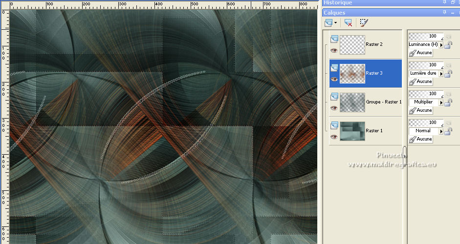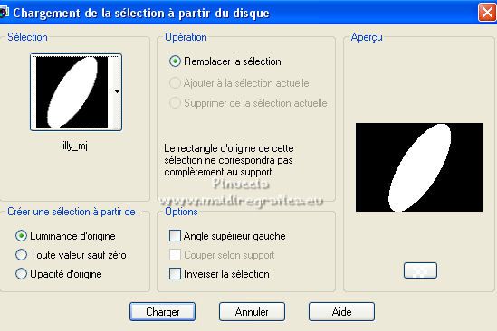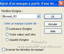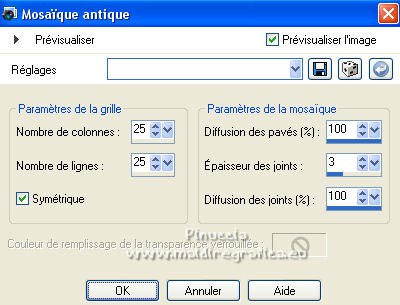 Pour traduire ce tutoriel j'ai utilisé PSPX7, PSPX2 et PSPX3, mais il peut également être exécuté avec les autres versions. Suivant la version utilisée, vous pouvez obtenir des résultats différents. Depuis la version X4, la fonction Image>Miroir a été remplacée par Image>Renverser horizontalement, et Image>Renverser avec Image>Renverser verticalement . Dans les versions X5 et X6, les fonctions ont été améliorées par la mise à disposition du menu Objets. Avec la nouvelle version X7, nous avons encore Image>Miroir et Image>Renverser/Retourner, mais avec nouvelles différences. Voir les détails à ce sujet ici Certaines dénominations ont changées entre les versions de PSP. Les plus frequentes dénominations utilisées: ![]() English translation here Vos versions ici![]() Nécessaire pour réaliser ce tutoriel: Matériel ici Le matériel est de Maria José. (ici les liens vers les sites des créateurs du matériel) Modules Externes: consulter, si nécessaire, ma section des filtres ici Filters Unlimited 2.0 ici Funhouse - Tremors ici Mehdi - Sorting Tiles ici Mura's Seamless - Emboss at Alpha, Duplicate ici Toadies - Weaver ici Flaming Pear - Flexify 2 ici Carolaine and Sensibility - CS-LDots ici AAA Frames - Foto Frame ici Filtres Andrew's, Mura Seamless et Simple peuvent être utilisés seuls ou importés dans Filters Unlimited. voir comment le faire ici). Si un filtre est fourni avec cette icône, ![]() en fonction des couleurs utilisées, vous pouvez changer le mode mélange et l'opacité des calques. Dans les plus récentes versions de PSP, vous ne trouvez pas le dégradé d'avant plan/arrière plan ou Corel_06_029. Vous pouvez utiliser le dégradé des versions antérieures. Ici le dossier Dégradés de CorelX. Placer le preset pour Flexify dans un dossier à choix. Placer la sélection dans le dossier Sélections. Ouvrir le masque dans PSP et le minimiser avec le reste du matériel. 1. Placer en avant plan la couleur #2f413e, et en arrière plan la couleur #9cb8b3. ![]() Préparer en avant plan un dégradé de premier plan/arrière plan, style Radial. ![]() Placer en avant plan la Couleur. Ouvrir une nouvelle image transparente 1000 x 700 pixels. Remplir l'image transparente avec la couleur foncée d'avant plan.2. Calques>Nouveau calque de masque>A partir d'une image. Ouvrir le menu deroulant sous la fenêtre d'origine et vous verrez la liste des images ouvertes. Sélectionner le masque lillymask_MJ. ![]() Calques>Fusionner>Fusionner le groupe. 3. Effets>Modules Externes>Mura's Seamless - Emboss at Alpha, par défaut. ![]() Placer le calque en mode Multiplier, ou à votre goût. 4. Effets>Modules Externes>Flaming Pear - Flexify 2 cliquer sur le bouton rouge et chercher, dans le dossier où vous l'avez copié, le preset ZZ_Flexify 2 settings.q2q ![]() Ci-dessous les réglages ![]() 5. Effets>Effets d'image>Mosaïque sans jointures. ![]() 6. Placer en avant plan le Dégradé. Calques>Nouveau calque raster. Remplir le calque du dégradé.Calques>Agencer>Placer en bas de la pile. 7. Effets>Modules Externes>Mehdi - Sorting Tiles. ![]() 8. Répéter Effets>Modules Externes>Mehdi - Sorting Tiles - Block Range à 500. ![]() 9. Effets>Modules Externes>Mura's Seamless - Duplicate, par défaut. ![]() 10. Effets>Modules Externes>Funhouse - Tremors, par défaut. ![]() 11. Effets>Effets de bords>Accentuer. 12. Réglage>Ajouter/Supprimer du bruit>Ajouter du bruit. ![]() 13. Vous positionner sur le calque du haut de la pile. Ouvrir le tube deco_lillyball et Édition>Copier. Revenir sur votre travail et Édition>Coller comme nouveau calque. Placer le calque en mode Luminance (héritée). 14. Sélections>Charger/Enregistrer une sélection>Charger à partir du disque. Chercher et charger la sélection lilly_mj. ![]() 15. Calques>Nouveau calque raster. Ouvrir le misted du visage et Édition>Copier. Revenir sur votre travail et Édition>Coller dans la sélection. 16. Effets>Effets de textures>Mosaïque antique. ![]() 17. Effets>Effets 3D>Ombre portée, couleur #000000. ![]() Sélections>Désélectionner tout. Calques>Agencer>Déplacer vers le bas. 18. Calques>Dupliquer. Image>Miroir. Calques>Fusionner>Fusionner le calque de dessous. 19. Effets>Modules Externes>Toadies - Weaver. ![]() 20. Effets>Modules Externes>Flaming Pear - Flexify 2, comme précédemment. 21. Effets>Effets d'image>Mosaïque sans jointures. ![]() Placer le calque en mode Lumière dure ou autre. ![]() 22. Vous positionner sur le calque du haut de la pile. Ouvrir le tube deco1_lillyball et Édition>Copier. Revenir sur votre travail et Édition>Coller comme nouveau calque. Il est à sa place: Position horiz.: 0,00 et Position vert.: 50,00. ![]() 23. Ouvrir le tube decofinal_mj et Édition>Copier. Revenir sur votre travail et Édition>Coller comme nouveau calque. Positionner le tube24. Ouvrir le tube du visage et Édition>Copier. Revenir sur votre travail et Édition>Coller comme nouveau calque. Image>Redimensionner, à 80%, redimensionner tous les calques décoché. Positionner bien le tube.Effets>Effets 3D>Ombre portée, à choix. La tag et les calques - adapter Mode mélange et opacité en fonction de vos couleurs. ![]() 25. Image>Ajouter des bordures, 1 pixel, symétrique, couleur noire. 26. Sélections>Sélectionner tout. Édition>Copier. 27. Image>Ajouter des bordures, 50 pixels, symétrique, couleur blanche. 28. Sélections>Inverser. Édition>Coller dans la sélection. 29. Réglage>Flou>Flou gaussien - rayon 30. ![]() 30. Effets>Modules Externes>Carolaine and Sensibility - CS-LDots ![]() 31. Effets>Effets de distorsion>Vent - vers la gauche, intensité 50. ![]() Effets>Effets 3D>Ombre portée, couleur noire. ![]() Sélections>Désélectionner tout. 32. Effets>Modules Externes>AAA Frames - Foto Frame. ![]() 33. Signer votre travail. Image>Ajouter des bordures, 1 pixel, symétrique, couleur noire. 34. Image>Redimensionner, à 1000 pixels de largeur, redimensionner tous les calques coché. Enregistrer en jpg. Pour le 