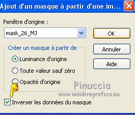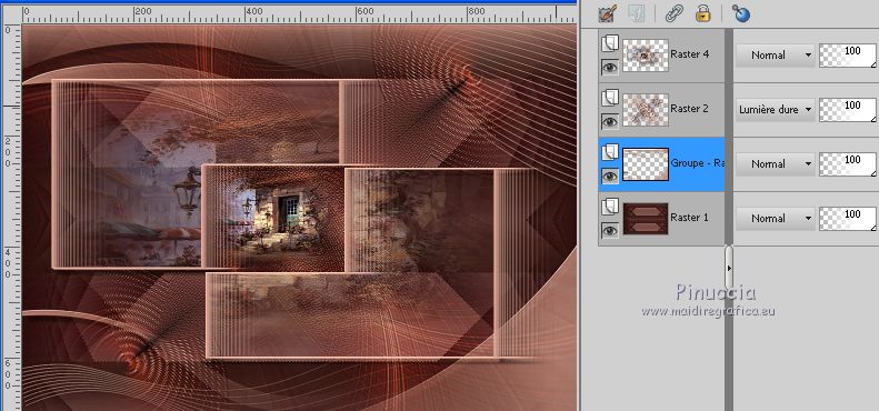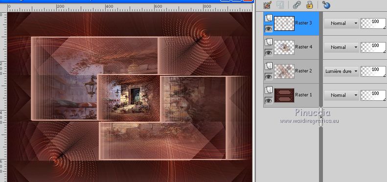 Pour traduire ce tutoriel j'ai utilisé CorelX17, mais il peut également être exécuté avec les autres versions. Suivant la version utilisée, vous pouvez obtenir des résultats différents. Depuis la version X4, la fonction Image>Miroir a été remplacée par Image>Renverser horizontalement, et Image>Renverser avec Image>Renverser verticalement . Dans les versions X5 et X6, les fonctions ont été améliorées par la mise à disposition du menu Objets. Avec la nouvelle version X7, nous avons encore Image>Miroir et Image>Renverser/Retourner, mais avec nouvelles différences. Voir les détails à ce sujet ici Certaines dénominations ont changées entre les versions de PSP. Les plus frequentes dénominations utilisées: ![]() English translation here Vos versions iciNécessaire pour réaliser ce tutoriel: Matériel ici Pour le tube merci Beatriz. Le reste du matériel est de Maria José. (ici les liens vers les sites des créateurs de tubes) Modules Externes: consulter, si nécessaire, ma section des filtres ici Filters Unlimited 2.0 ici Mura's Seamless - Emboss at Alpha ici Plugins AB 22 - Some splits (à importer dans Unlimited) - dans le matériel Simple - Top Left Mirror ici Mura's Meister - Copies ici VanDerLee - Unplugged-X ici Simple - Top Left Mirror ici Kiwi - Zig-zack ici Filtres Kiwi, Simple et Mura's Seamless peuvent être utilisés seuls ou importés dans Filters Unlimited. voir comment le faire ici). Si un filtre est fourni avec cette icône, ![]() en fonction des couleurs utilisées, vous pouvez changer le mode mélange et l'opacité des calques. Dans les plus récentes versions de PSP, vous ne trouvez pas le dégradé d'avant plan/arrière plan ou Corel_06_029. Vous pouvez utiliser le dégradé des versions antérieures. Ici le dossier Dégradés de CorelX. Placer les sélections dans le dossier Sélections Ouvrir le masque dans PSP et le minimiser avec le reste du matériel. Placer en avant plan la couleur #341d16, et en arrière plan la couleur #cc998a. ![]() Préparer en avant plan un dégradé de premier plan/arrière plan, style Linéaire. ![]() 1. Ouvrir une nouvelle image transparente 1000 x 700 pixels. Remplir l'image transparente du dégradé.2. Effets>Modules Externes>Filters Unlimited 2.0 - Plugins AB 22 - Some Splits ![]() Si vous voulez une seule couleur, voir les réglages ci-dessous ![]() Le résultat sera différent selon les couleurs utilisées. 3. Effets>Modules Externes>Simple - Top Left Mirror. ![]() 4. Effets>Modules Externes>*Kiwi* -Zig-Zack ![]() 5. Effets>Effets d'image>Mosaïque sans jointures. ![]() 6. Réglage>Netteté>Davantage de netteté. 7. Ouvrir deco_lindsay_MJ - Édition>Copier. Revenir sur votre travail et Édition>Coller comme nouveau calque. 8. Calques>Dupliquer. Image>Miroir. Image>Renverser. Calques>Fusionner>Fusionner le calque de dessous. Placer le calque en mode Lumière dure. 9. Sélections>Charger/Enregistrer une sélection>Charger à partir du disque. Chercher et charger la sélection lindsay_0_mj. ![]() 10. Calques>Nouveau calque raster. Remplir le calque avec la couleur claire.11. Sélections>Modifier>Contracter - 3 pixels. Presser CANC sur le clavier ![]() Sélections>Désélectionner tout. 12. Effets>Modules Externes>Mura's Meister - Copies. ![]() 13. Réglage>Netteté>Davantage de netteté. 14. Sélections>Charger/Enregistrer une sélection>Charger à partir du disque. Charger à nouveau la sélection lindsay_0_mj. ![]() 15. Calques>Nouveau calque raster. Ouvrir le misted - Édition>Copier. Revenir sur votre travail et Édition>Coller dans la sélection. Réduire l'opacité de ce calque +/- 60%, ou en fonction de votre misted. Sélections>Désélectionner tout. 16. Sélections>Charger/Enregistrer une sélection>Charger à partir du disque. Chercher et charger la sélection lindsay_1_mj. ![]() 17. Calques>Nouveau calque raster. Édition>Coller dans la sélection (le misted est toujours en mémoire). 18. Réglage>Netteté>Davantage de netteté. Sélections>Désélectionner tout. Calques>Fusionner>Fusionner le calque de dessous. Calques>Agencer>Déplacer vers le bas. 19. Vous positionner sur le calque du haut de la pile, Raster 3. ![]() Calques>Fusionner>Fusionner le calque de dessous. 20. Objets>Aligner>Centrer sur le support. Si vous travaillez avec une version précédente qui ne rends pas disponible le menu Objets, activer l'outil Sélecteur ![]() et placer Position horiz.: 53,00 et Position vert.: 98,00 ![]() 21. Effets>Effets 3D>Ombre portée, par défaut ![]() 22. Calques>Nouveau calque raster. Remplir le calque avec la couleur claire.23. Calques>Nouveau calque de masque>A partir d'une image. Ouvrir le menu deroulant sous la fenêtre d'origine et vous verrez la liste des images ouvertes. Sélectionner le masque mask_26_mj. ![]() Calques>Fusionner>Fusionner le groupe. 24. Effets>Modules Externes>MuRa's Seamless - Emboss at Alpha, par défaut. ![]() 25. Réglage>Netteté>Davantage de netteté. 26. Effets>Effets 3D>Ombre portée, comme précédemment. ![]() 27. Calques>Agencer>Déplacer vers le bas - 2 fois. Vous devriez avoir ceci ![]() 28. Ouvrir le déco - Édition>Copier. Revenir sur votre travail et Édition>Coller comme nouveau calque. Image>Redimensionner, à 95%, redimensionner tous les calques décoché. Déplacer le tube en bas à gauche.Effets>Effets 3D>Ombre portée, à choix. 29. Ouvrir le tube de la femme - Édition>Copier. Revenir sur votre travail et Édition>Coller comme nouveau calque. Image>Redimensionner, à 95%, redimensionner tous les calques décoché. Déplacer le tube à droite.Effets>Effets 3D>Ombre portée, à choix. Calques>Fusionner>Calques visibles. 30. Sélections>Sélectionner tout. Édition>Copier. 31. Image>Ajouter des bordures, 25 pixels, symétrique, couleur blanche. 32. Sélections>Inverser. Édition>Coller dans la sélection. 33. Réglage>Flou>Flou gaussien - rayon 25. ![]() 34. Effets>Modules Externes>VanDerLee - Unplugged-X - Defocus ![]() 35. Réglage>Netteté>Davantage de nettet