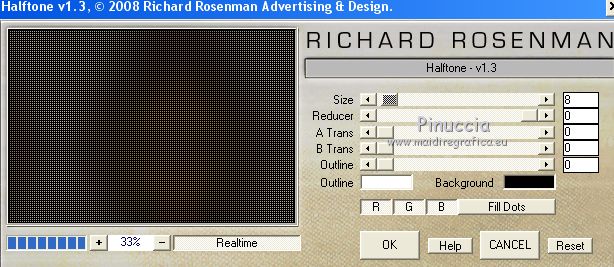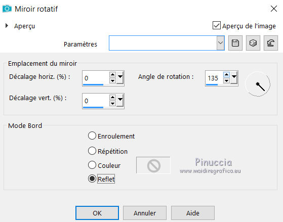 Pour traduire ce tutoriel j'ai utilisé CorelX12, mais il peut également être exécuté avec les autres versions. Suivant la version utilisée, vous pouvez obtenir des résultats différents. Depuis la version X4, la fonction Image>Miroir a été remplacée par Image>Renverser horizontalement, et Image>Renverser avec Image>Renverser verticalement . Dans les versions X5 et X6, les fonctions ont été améliorées par la mise à disposition du menu Objets. Avec la nouvelle version X7, nous avons encore Image>Miroir et Image>Renverser/Retourner, mais avec nouvelles différences. Voir les détails à ce sujet ici Certaines dénominations ont changées entre les versions de PSP. Les plus frequentes dénominations utilisées: ![]() Vos versions ici![]() Nécessaire pour réaliser ce tutoriel: Matériel ici Pour le tube merci Maryse. Le reste du matériel est de Maria José. (les liens des sites des tubeuses ici) Modules Externes: consulter, si nécessaire, ma section des filtres ici Filters Unlimited 2.0 ici Mura's Meister - Perspective Tiling ici Mura's Seamless - Emboss at alpha ici VM Toolbox - Zoom Blur ici Graphics Plus - Cross Shadow, Vertical Mirror ici AP Lines - Lines SilverLining ici AAA Filters - Custom ici Richard Rosenman Halftone ici Carolaine and Sensibility - CS-LDots ici Filtres Mirror Rave, Birgits Chaos, Graphics Plus et Simple peuvent être utilisés seuls ou importés dans Filters Unlimited. voir comment le faire ici). Si un filtre est fourni avec cette icône, ![]() en fonction des couleurs utilisées, vous pouvez changer le mode mélange et l'opacité des calques. Placer les sélections dans le dossier Sélections 1. Ouvrir une nouvelle image transparente 1000 x 700 pixels. Sélections>Sélectionner tout. Ouvrir l'image en jpg et Édition>Copier. Revenir sur votre travail et Édition>Coller dans la sélection. Sélections>Désélectionner tout. 2. Effets>Effets d'image>Mosaïque sans jointures. ![]() 3. Réglage>Flou>Flou gaussien - rayon 50. ![]() 4. Effets>Effets de réflexion>Miroir rotatif. ![]() Édition>Répéter Miroir rotatif. 5. Effets>Effets de réflexion>Miroir rotatif, par défaut. ![]() 6. Effets>Modules Externes>Graphics Plus - Vertical Mirror, par défaut. ![]() 7. Réglage>Netteté>Davantage de netteté. 8. Sélections>Charger/Enregistrer une sélection>Charger à partir du disque. Chercher et charger la sélection liselotte_mj ![]() Sélections>Transformer la sélection en calque. 9. Effets>Effets de textures>Pierre polie, couleur blanche. ![]() En fonction de votre image, l'effet sera toujours différent 10. Effets>Effets 3D>Ombre portée, couleur noire. ![]() Sélections>Désélectionner tout. 11. Effets>Modules Externes>VM Toolbox - Zoom Blur, par défaut. ![]() 12. Effets>Effets de réflexion>Miroir rotatif, par défaut. ![]() Calques>Dupliquer. Image>Rotation libre - 90 degrés à gauche. ![]() 13. Calques>Fusionner>Fusionner le calque de dessous. Sur le même calque: Sélections>Charger/Enregistrer une sélection>Charger à partir du disque. Chercher et charger la sélection liselotte_1_mj ![]() Effets>Effets 3D>Ombre portée, comme précédemment. ![]() 14. Sélections>Modifier>Contracter - 8 pixels. Presser CANC sur le clavier ![]() Répéter Effets>Effets 3D>Ombre portée, comme précédemment. Sélections>Désélectionner tout. 15. Effets>Modules Externes>Carolaine and Sensibility - CS-LDots. ![]() 16. Effets>Modules Externes>AP [Lines] - Lines SilverLining. ![]() 17. Effets>Effets d'image>Mosaïque sans jointures, Bégaiement diagonale. ![]() 18. Effets>Effets de réflexion>Miroir rotatif, par défaut. ![]() 19. Effets>Modules Externes>Graphics Plus - Vertical Mirror, par défaut. ![]() 20. Effets>Modules Externes>Mura's Seamless - Emboss at Alpha, par défaut - 2 fois ![]() Placer le calque en mode Multiplier. ![]() 21. Vous positionner sur le calque Raster 1. Calques>Dupliquer. 22. Effets>Modules Externes>Richard Rosenman - Halftone, par défaut. ![]() 23. Effets>Effets d'image>Enroulement de page ![]() régler les couleurs en fonction de votre travail 24.- Effets>Effets de réflexion>Miroir rotatif, par défaut. ![]() 25. Effets>Modules Externes>Mura's Meister - Perspective Tiling. ![]() 26. Activer l'outil Baguette magique , progressivité 40,et cliquer sur la partie transparente pour la sélectionner. ![]() Presser +/- 10 fois CANC sur le clavier. ![]() Sélections>Désélectionner tout. 27. Calques>Dupliquer. Image>Renverser. Calques>Fusionner>Fusionner le calque de dessous. Placer le calque en mode Lumière dure. ![]() 28. Ouvrir le misted - Édition>Copier. Revenir sur votre travail et Édition>Coller comme nouveau calque. Positionner bien le tube.Si nécessaire, réduire l'opacité de ce calque à 77%. 29. Ouvrir le tube decoradialblur - Édition>Copier. Revenir sur votre travail et Édition>Coller comme nouveau calque. Calques>Agencer>Placer en haut de la pile. Placer le calque en mode Écran. ![]() 30. Ouvrir le tube de la femme MR_Liselotte - Édition>Copier. Revenir sur votre travail et Édition>Coller comme nouveau calque. Déplacer le tube à gauche.Optionnel: Effets>Effets 3D>Ombre portée. 31. Ouvrir le déco flor_Maryse - Édition>Copier. Revenir sur votre travail et Édition>Coller comme nouveau calque. Déplacer le tube à droite.Optionnel: Effets>Effets 3D>Ombre portée. Vous devriez avoir ce-ci ![]() En fonction de vos couleurs, vous êtes libre de changer mode mélange et opacité des calques. 32. Calques>Fusionner>Tous. 33. Image>Ajouter des bordures, 1 pixel, symétrique, couleur noire. Image>Ajouter des bordures, 1 pixel, symétrique, couleur #d5c3af. Image>Ajouter des bordures, 1 pixel, symétrique, couleur noire. 34. Sélections>Sélectionner tout. Édition>Copier. 35. Image>Ajouter des bordures, 40 pixels, symétrique, couleur blanche. Sélections>Inverser. Édition>Coller dans la sélection (l'image copiée à l'étape 34). 36. Réglage>Flou>Flou gaussien - rayon 50. ![]() 37. Effets>Modules Externes>Graphics Pl