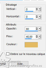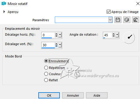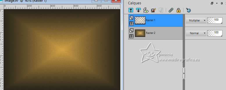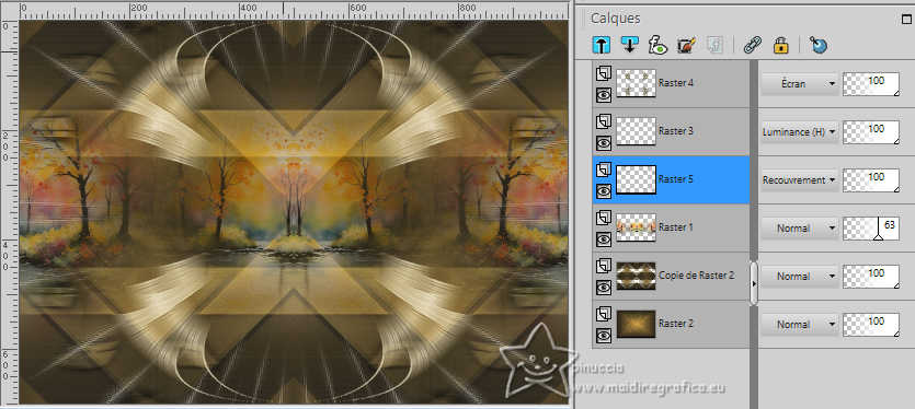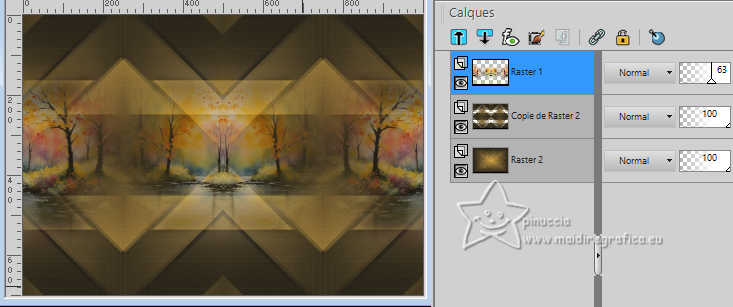 Pour traduire ce tutoriel j'ai utilisé PSPX9 et PSP2020, mais il peut également être exécuté avec les autres versions. Suivant la version utilisée, vous pouvez obtenir des résultats différents. Depuis la version X4, la fonction Image>Miroir a été remplacée par Image>Renverser horizontalement, et Image>Renverser avec Image>Renverser verticalement . Dans les versions X5 et X6, les fonctions ont été améliorées par la mise à disposition du menu Objets. Avec la nouvelle version X7, nous avons encore Image>Miroir et Image>Renverser/Retourner, mais avec nouvelles différences. Voir les détails à ce sujet ici Certaines dénominations ont changées entre les versions de PSP. Les plus frequentes dénominations utilisées: ![]() English translation here Vos versions ici![]() Nécessaire pour réaliser ce tutoriel: ![]() Matériel de Maria José. (ici les liens vers les sites des créateurs du matériel) ![]() consulter, si nécessaire, ma section des filtres ici Filters Unlimited 2.0 ici Balder Olrik - Transparent Control ici Simple - Pizza Slice Mirror, Top Left Mirror ici Graphics Plus - Cross Shadow, Quick Tile I ici Filtres Balder Olrik, Simple et Graphics Plus peuvent être utilisés seuls ou importés dans Filters Unlimited. voir comment le faire ici. Si un filtre est fourni avec cette icône, ![]() en fonction des couleurs utilisées, vous pouvez changer le mode mélange et l'opacité des calques. ![]() Placer la sélection dans le dossier Sélections. Choisir deux couleurs à choix; pour l'exemple: Placer en avant plan la couleur #e2b960 et en arrière plan la couleur #3d3729. ![]() Préparer en avant plan un dégradé de premier plan/arrière plan, style Rectangulaire. ![]() 1. Ouvrir une nouvelle image transparente 1000 x 700 pixels. Remplir l'image transparente du dégradé.2. Réglage>Ajouter/Supprimer du bruit>Ajouter du bruit. ![]() 3. Effets>Modules Externes>Filters Unlimited 2.0 - Balder Olrik - Transparent Control. ![]() Ne soyez pas surpris du résultat ![]() Placer le calque en mode Multiplier Ne vous inquiétez pas si rien ne change encore. ![]() 4. Calques>Nouveau calque raster. Calques>Agencer>Déplacer vers le bas. Remplir le calque du dégradé.Vous positionner sur le calque du haut de la pile, Raster 1. ![]() Calques>Fusionner>Fusionner le calque de dessous. 5. Calques>Dupliquer. Effets>Modules Externes>Simple - Pizza Slice Mirror Édition>Répéter Pizza Slice Mirror Cet effets travaille sans fenétre; résultat après les deux applications ![]() 6. Sélections>Charger/Enregistrer une sélection>Charger à partir du disque. Chercher et charger la sélection MJ-loiva ![]() Presser CANC sur le clavier ![]() ![]() 7. Effets>Effets 3D>Ombre portée, couleur noire. ![]() Sélections>Désélectionner tout. 8. Effets>Modules Externes>Simple - Top Left Mirror. ![]() 9. Effets>Effets d'image>Mosaïque sans jointures. ![]() 10. Effets>Effets de réflexion>Miroir rotatif. ![]() 11. Effets>Modules Externes>Simple - Top Left Mirror. ![]() 12. Effets>Effets d'image>Mosaïque sans jointures. ![]() 13. Effets>Effets 3D>Ombre portée, couleur claire ![]() 14. Ouvrir le misted misted-tuto-MJ ![]() Édition>Copier. Revenir sur votre travail et Édition>Coller comme nouveau calque. 15. Effets>Effets d'image>Mosaïque sans jointures. ![]() 16. Effets>Effets de réflexion>Miroir rotatif, par défaut. ![]() Réduire l'opacité de ce calque +/-63% ![]() 17. Ouvrir deco-1-MJ ![]() Édition>Copier. Revenir sur votre travail et Édition>Coller comme nouveau calque. Placer le calque en mode Luminance (héritée). 18. Ouvrir deco-2-MJ ![]() Édition>Copier. Revenir sur votre travail et Édition>Coller comme nouveau calque. Placer le calque en mode Écran. 19. Ouvrir deco-3-MJ ![]() Édition>Copier. Revenir sur votre travail et Édition>Coller comme nouveau calque. Calques>Agencer>Déplacer vers le bas - 2 fois. Placer le calque en mode Recouvrement. La tag et les calques - adapter Mode mélange et opacité en fonction de votre travail ![]() 20. Ouvrir le tube principal AI-image-misted-MJ ![]() Édition>Copier. Revenir sur votre travail et Édition>Coller comme nouveau calque. Image>Redimensionner, à 68%, redimensionner tous les calques décoché. Positionner bien le tube![]() 21. Image>Ajouter des bordures, 1 pixel, symétrique, couleur foncée. 22. Sélections>Sélectionner tout. Édition>Copier Image>Ajouter des bordures, 50 pixels, symétrique, couleur blanche. 23. Sélections>Inverser. Édition>Coller dans la sélection - l'image copiée à l'étape 22. 24. Réglage>Flou>Flou gaussien - rayon 30. ![]() Effets>Effets 3D>Ombre portée, couleur claire. ![]() 25. Sélections>Sélectionner tout. Sélections>Modifier>Contracter - 25 pixels. 26. Sélections>Inverser. Répéter Effets>Effets 3D>Ombre portée, couleur claire. ![]() 27. Effets>Modules Externes>Graphics Plus - Quick Tile I, par défaut. ![]() 28. Effets>Modules Externes>Simple - Top Left Mirror. ![]() 29. Effets>Modules Externes>Graphics Plus - Cross Shadow, par défaut. ![]() Sélections>Désélectionner tout. 30. Signer votre travail sur un nouveau calque. Image>Ajouter des bordures, 1 pixel, symétrique, couleur foncée. 31. Image>Redimensionner, 1000 pixels de largeur, redimensionner tous les calques coché. Enregistrer en jpg. Pour le tube de cette version merci Luz Cristina et Mentali ![]() ![]() Si vous avez des problèmes, ou des doutes, ou vous trouvez un link modifié, ou seulement pour me dire que ce tutoriel vous a plu, vous pouvez m'écrire. |