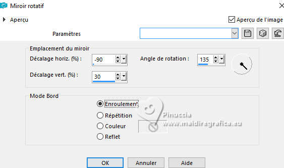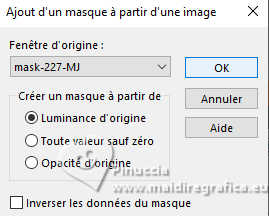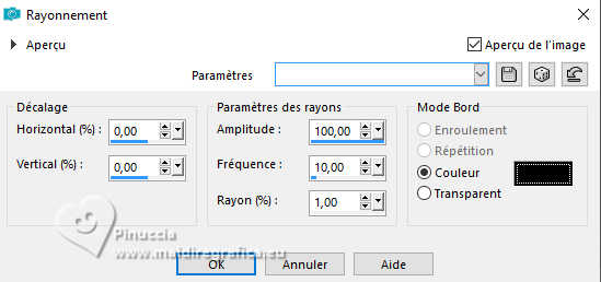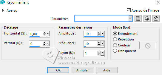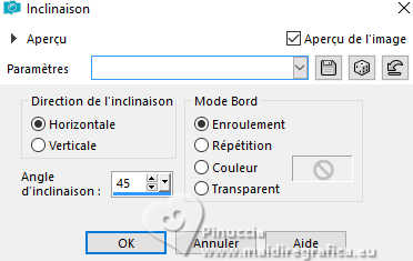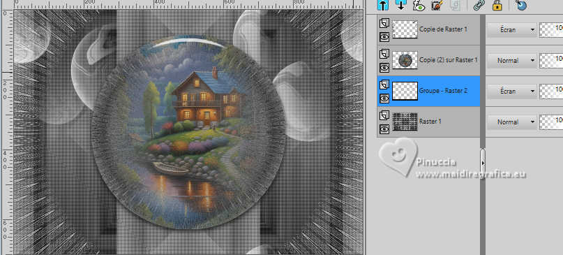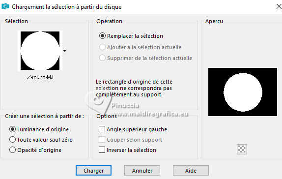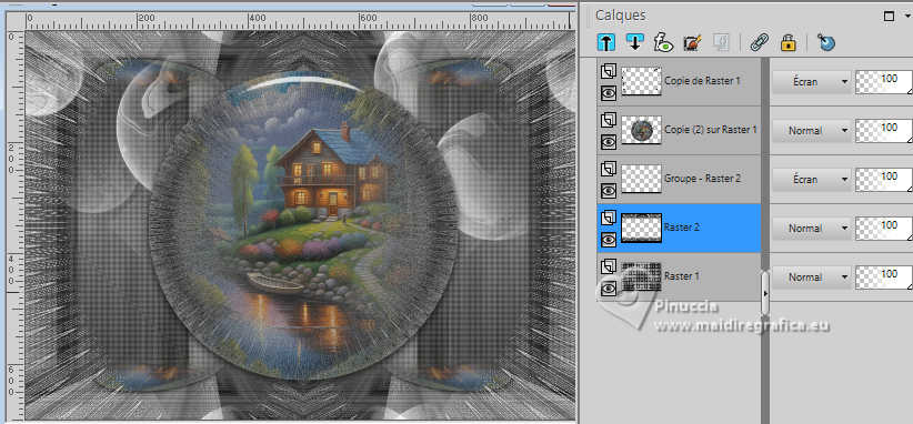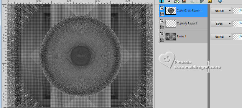 Pour traduire ce tutoriel j'ai utilisé PSPX9 et PSP2019, mais il peut également être exécuté avec les autres versions. Suivant la version utilisée, vous pouvez obtenir des résultats différents. Depuis la version X4, la fonction Image>Miroir a été remplacée par Image>Renverser horizontalement, et Image>Renverser avec Image>Renverser verticalement . Dans les versions X5 et X6, les fonctions ont été améliorées par la mise à disposition du menu Objets. Avec la nouvelle version X7, nous avons encore Image>Miroir et Image>Renverser/Retourner, mais avec nouvelles différences. Voir les détails à ce sujet ici Certaines dénominations ont changées entre les versions de PSP. Les plus frequentes dénominations utilisées: ![]() English translation here Vos versions ici![]() Nécessaire pour réaliser ce tutoriel: ![]() Le matériel est de Maria José. (ici les liens vers les sites des créateurs du matériel) ![]() consulter, si nécessaire, ma section des filtres ici Filters Unlimited 2.0 ici Mehdi - Sorting Tiles ici FM Tile Tools - Seamless Tile ici Simple - Top Left Mirror ici Mura's Seamless - Emboss at Alpha ici VM Natural - Cross Weave ici Alien Skin Eye Candy 5 Impact - Glass ici Mura's Meister - Perspective Tiling ici Filtres Simple, VM Natural et Mura's Seamless peuvent être utilisés seuls ou importés dans Filters Unlimited. voir comment le faire ici). Si un filtre est fourni avec cette icône, ![]() en fonction des couleurs utilisées, vous pouvez changer le mode mélange et l'opacité des calques. Placer le preset En cliquant sur le preset une ou deux fois (selon vos réglages) automatiquement il se placera directement dans le dossier Settings de Alien Skin Eye Candy. pourquoi un ou deux clic voir ici ![]() Placer les sélections dans le dossier Sélections. Ouvrir le masque dans PSP et le minimiser avec le reste du matériel. 1. Choisir deux couleurs de l'image d'arrière plan. Placer en avant plan la couleur #020202 et en arrière plan la couleur #c4c4c4. ![]() 2. Ouvrir une nouvelle image transparente 1000 x 700 pixels. Sélections>Sélectionner tout. 3. Ouvrir l'image paysage-p-bco-MJ ![]() Édition>Copier. Revenir sur votre travail et Édition>Coller dans la sélection. Sélections>Désélectionner tout. 4. Effets>Effets d'image>Mosaïque sans jointures. ![]() 5. Effets>Modules Externes>Mehdi - Sorting Tiles. ![]() 6. Répéter Effets>Modules Externes>Mehdi - Sorting Tiles, crossed coché. ![]() 7. Effets>Effets de réflexion>Miroir rotatif. ![]() 8. Effets>Modules Externes>FM Tile Tools - Seamless Tile, par défaut. ![]() 9. Effets>Modules Externes>Simple - Top Left Mirror. ![]() 10. Calques>Dupliquer. Effets>Modules Externes>VM Natural - Cross Weave. ![]() Placer le calque en mode Multiplier. Layers>Merge>Merge Down. Layers>Duplicate. 11. Effets>Effets géométriques>Cercle. ![]() 12. Image>Redimensionner, à 80%, redimensionner tous les calques décoché. Calques>Dupliquer. 13. Sélections>Charger/Enregistrer une sélection>Charger à partir du disque. Chercher et charger la sélection Z-round-MJ ![]() 14. Effets>Effets de distorsion>Rayonnement. ![]() Sélections>Désélectionner tout. 15. Vous positionner sur le calque Copie de Raster 1. Répéter Effets>Effets de distorsion>Rayonnement, Enroulement coché ![]() 16. Rester sur ce calque. Sélections>Charger/Enregistrer une sélection>Charger à partir du disque. Chercher et charger la sélection ZZ-round-MJ ![]() Presser CANC sur le clavier ![]() Sélections>Désélectionner tout. 17. Effets>Effets de réflexion>Miroir rotatif, par défaut. ![]() 18. Réglage>Netteté>Netteté. Placer ce calque en mode Écran. Vous positionner sur le calque du haut de la pile, Copie(2) de Raster 1. ![]() 19. Sélections>Charger/Enregistrer une sélection>Charger à partir du disque. Chercher et charger à nouveau la sélection Z-round-MJ ![]() 20. Ouvrir le misted misted-lonely-MJ ![]() Édition>Copier. Revenir sur votre travail et Édition>Coller comme nouveau calque. Positionner l'image à votre goût![]() 21. Sélections>Inverser. Presser CANC sur le clavier. Sélections>Inverser. Réduire l'opacité de ce calque +/-80%, si nécessaire. Calques>Fusionner>Fusionner le calque de dessous. 22. Effets>Modules Externes>Alien Skin Eye Candy 5 Impact - Glass. Sélectionner le preset glass-noir-et-blanc-MJ ![]() Sélections>Désélectionner tout. Calques>Agencer>Déplacer vers le bas. 23. Calques>Nouveau calque raster. Remplir le calque avec la couleur claire.24. Calques>Nouveau calque de masque>A partir d'une image. Ouvrir le menu deroulant sous la fenêtre d'origine et vous verrez la liste des images ouvertes. Sélectionner le masque mask-227-MJ ![]() Calques>Fusionner>Fusionner le groupe. 25. Effets>Modules Externes>Mura's Seamless - Emboss at Alpha, par défaut. ![]() Placer le calque en mode Écran. Calques>Agencer>Déplacer vers le bas. ![]() 26. Vous positionner sur le calque du haut de la pile, Copie de Raster 1. Édition>Copie Spéciale>Copier avec fusion Édition>Coller comme nouveau calque. 27. Effets>Modules Externes>Mura's Meister - Perspective Tiling. ![]() 28. Effets>Effets géométriques>Inclinaison. ![]() 29. Effets>Effets de réflexion>Miroir rotatif. ![]() 30. Activer l'outil Baguette magique , progressivité 70,et cliquer dans la partie transparente pour la sélectionner. Presser +/-10 fois CANC sur le clavier. Sélections>Désélectionner tout. ne pas oublier de placer à nouveau la progressivité de l'outil Baguette magique à 0 31. Calques>Dupliquer. Image>Miroir>Miroir vertical (Image>Renverser). Calques>Fusionner>Fusionner le calque de dessous. Calques>Agencer>Déplacer vers le bas - 3 fois. La tag et les calques - adapter Mode mélange et Opacité selon vos couleurs ![]() 32. Image>Ajouter des bordures, 1 pixel, simétrique, couleur foncée. Imae>Ajouter des bordures, 2 pixels, symétrique, couleur claire. Image>Ajouter des bordures, 1 pixels, symétrique, couleur foncée. 33. Sélections>Sélectionner