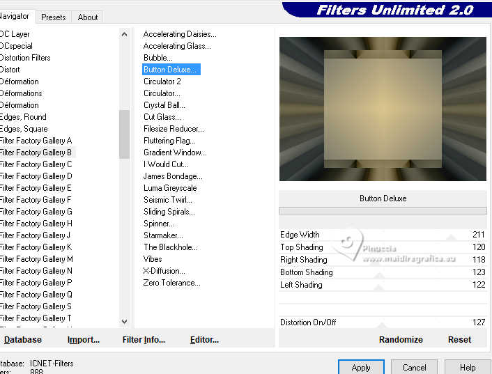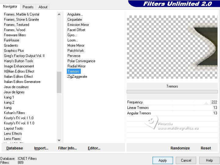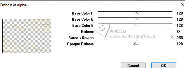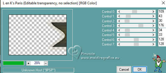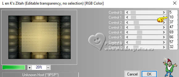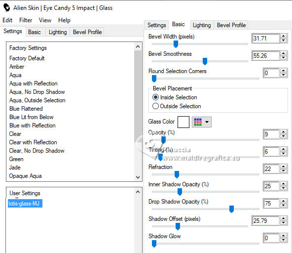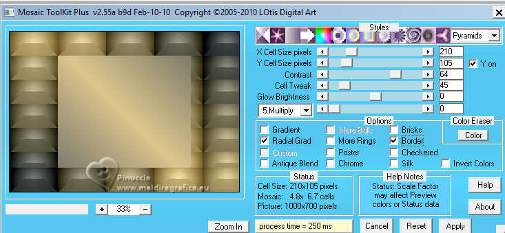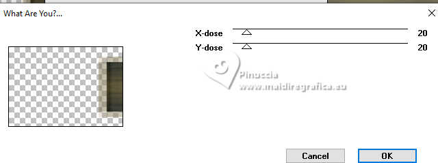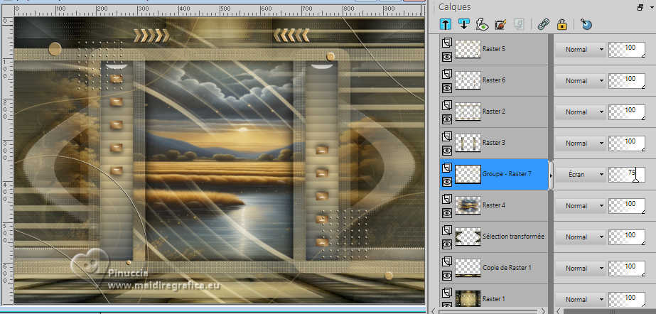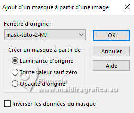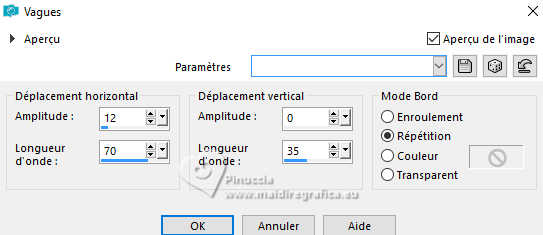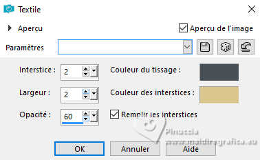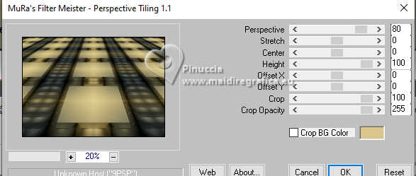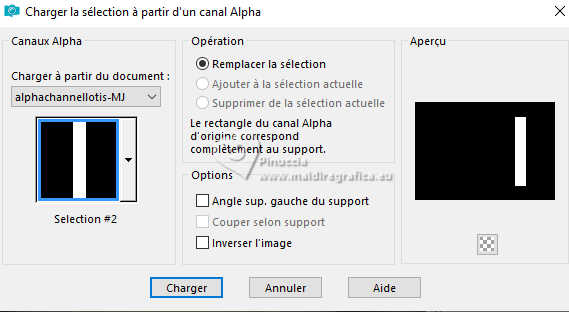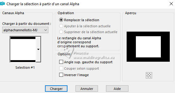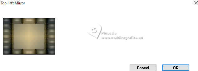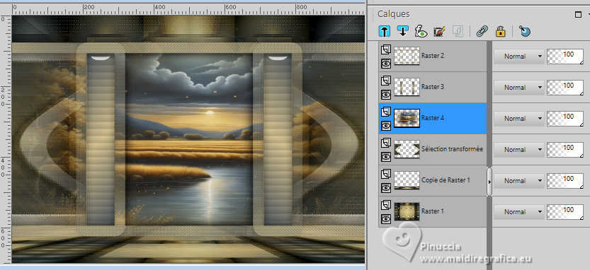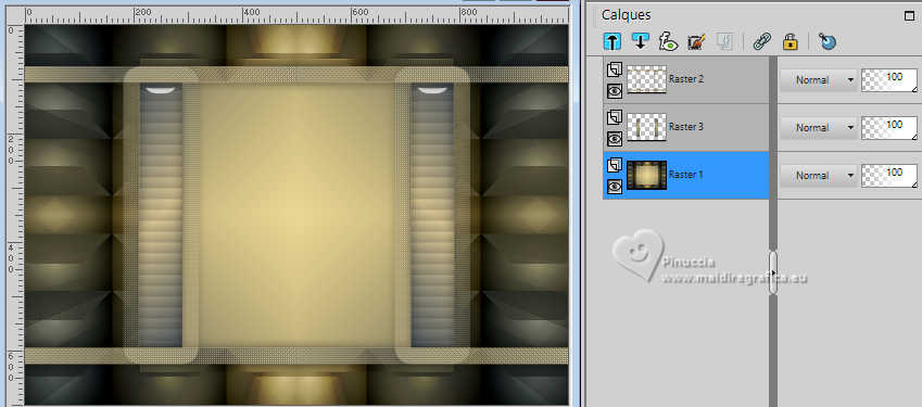 Pour traduire ce tutoriel j'ai utilisé PSPX9 et PSP2020, mais il peut également être exécuté avec les autres versions. Suivant la version utilisée, vous pouvez obtenir des résultats différents. Depuis la version X4, la fonction Image>Miroir a été remplacée par Image>Renverser horizontalement, et Image>Renverser avec Image>Renverser verticalement . Dans les versions X5 et X6, les fonctions ont été améliorées par la mise à disposition du menu Objets. Avec la nouvelle version X7, nous avons encore Image>Miroir et Image>Renverser/Retourner, mais avec nouvelles différences. Voir les détails à ce sujet ici Certaines dénominations ont changées entre les versions de PSP. Les plus frequentes dénominations utilisées: ![]() English translation here Vos versions ici![]() Nécessaire pour réaliser ce tutoriel: ![]() Matériel de Maria José. (ici les liens vers les sites des créateurs du matériel) ![]() consulter, si nécessaire, ma section des filtres ici Filters Unlimited 2.0 ici Mura's Meister - Perspective Tiling ici Simple - Top Left Mirror ici Filter Factory Gallery B - Button Deluxe ici LOtis Filters - Mosaic Toolkit Plus ici Mura's Seamless - Emboss at Alpha ici Alien Skin Eye Candy 5 Impact - Glass ici Toadies - What are you ici Funhouse - Tremors ici L&K's - L&K's Paris ici L&K's - L&K's Zitah ici AAA Frames - Foto Frame ici Filtres Simple, Factory Gallery, Mura's Seamless, Toadies et Funhouse peuvent être utilisés seuls ou importés dans Filters Unlimited. voir comment le faire ici. Si un filtre est fourni avec cette icône, ![]() en fonction des couleurs utilisées, vous pouvez changer le mode mélange et l'opacité des calques. Dans les plus récentes versions de PSP, vous ne trouvez pas le dégradé d'avant plan/arriére plan ou Corel_06_029. Vous pouvez utiliser le dégradé des versions antérieures. Ici le dossier Dégradés de CorelX. Placer le preset En cliquant sur le preset une ou deux fois (selon vos réglages) automatiquement il se placera directement dans le dossier Settings de Alien Skin Eye Candy. pourquoi un ou deux clic voir ici ![]() Ouvrir le masque dans PSP et le minimiser avec le reste du matériel. Placer en avant plan la couleur foncée #475058 et en arrière plan la couleur claire #dac58d. ![]() Préparer en avant plan un dégradé de premier plan/arrière plan, style Linéaire. ![]() 1. Ouvrir alphachannellotis Fenêtre>Dupliquer ou sur le clavier shift+D pour faire une copie. ![]() 2. Fermer l'original. La copie, qui sera la base de votre travail, n'est pas vide, mais contient les sélections enregistrées sur le canal alpha. Remplir l'image transparente du dégradé.3. Effets>Modules Externes>LOtis Filters - Mosaic Tookit Plus note: nous utilisons le Blend 5.Multiply, mais vous pouvez en choisir un autre et conserver les autres paramètres ![]() 4. Effets>Effets de réflexion>Miroir rotatif, par défaut. ![]() 5. Effets>Modules Externes>Simple - Top Left Mirror. ![]() Calques>Dupliquer. 6. Effets>Modules Externes>Filters Unlimited 2.0 - Filter Factory Gallery B - Button Deluxe, par défaut. ![]() 7. Effets>Effets de bords>Accentuer. Placer le calque en mode Recouvrement et réduire l'opacité +/-60%. ![]() Calques>Fusionner>Fusionner le calque de dessous. 8. Sélections>Charger/Enregistrer une sélection>Charger à partir d'un canal alpha. La sélection Selection #1 est déjà disponible. On doit seulement cliquer sur Charger. ![]() 9. Sélections>Modifier>Sélectionner les bordures de la sélection. ![]() 10. Calques>Nouveau calque raster. Remplir le calque du dégradé.11. Effets>Effets de textures>Textile couleur du tissage: couleur d'avant plan couleur des interstices: couleur d'arrière plan ![]() Effets>Effets 3D>Ombre portée, couleur noire. ![]() Sélections>Désélectionner tout. 12. Effets>Effets d'image>Mosaïque sans jointures. ![]() 13. Effets>Effets de réflexion>Miroir rotatif. ![]() 14. Sélections>Charger/Enregistrer une sélection>Charger à partir d'un canal alpha. Ouvrir le menu des sélections et charger la sélection Selection #2 ![]() 15. Calques>Nouveau calque raster. Remplir le calque du dégradé.16. Effets>Effets de textures>Stores - couleur noire. ![]() 17. Effets>Modules Externes>Alien Skin Eye Candy 5 Impact - Glass. Sélectionner le preset lotis-glass-MJ ![]() Sélections>Désélectioner tout. 18. Calques>Dupliquer. Image>Miroir>Miroir horizontal. Calques>Fusionner>Fusionner le calque de dessous. Calques>Agencer>Déplacer vers le bas. Vous positionner sur le calque Raster 1. .19. Sélections>Charger/Enregistrer une sélection>Charger à partir d'un canal alpha. Ouvrir le menu des sélections et charger la sélection Selection #3 ![]() Sélections>Transformer la sélection en calque. Sélections>Désélectionner tout. 20. Effets>Modules Externes>Toadies - What are you, par défaut. ![]() 21. Effets>Effets de distorsion>Vagues. ![]() 22. Effets>Modules Externes>Filters Unlimited 2.0 - Funhouse - Tremors, par défaut. ![]() 23. Effets>Modules Externes>L&K's - L&K's Paris, par défaut. ![]() 24. Calques>Dupliquer. Image>Miroir>Miroir horizontal. Calques>Fusionner>Fusionner le calque de dessous. 25. Effets>Modules Externes>L&K's - L&K's Zitah. ![]() 26. Vous positionner sur le calque Raster 1. Effets>Modules Externes>L&K's - L&K's Zitah, comme précédemment. ![]() 27. Réglage>Netteté>Davantage de netteté. Calques>Dupliquer. 28. Effets>Modules Externes>Mura's Meister - Perspective Tiling, par défaut. ![]() 29. Touche K pour activer l'outil Sélecteur ![]() mode Échelle ![]() tirer le noeud central supérieur vers le bas comme ci-dessous ![]() Touche M pour désélectionner l'outil. Calques>Nouveau calque raster. Sélections>Sélectionner tout. 30. Ouvrir le tube misted-lotis-MJ ![]() Édition>Copier. Revenir sur votre travail et Édition>Coller dans la sélection. Sélections>Désélectionner tout. 31. Sélections>Charger/Enregistrer une sélection>Charger à partir d'un canal alpha. Ouvrir le menu des s
