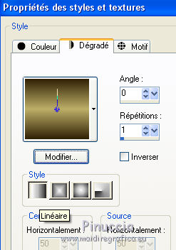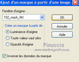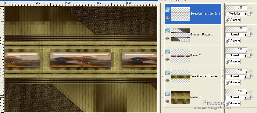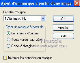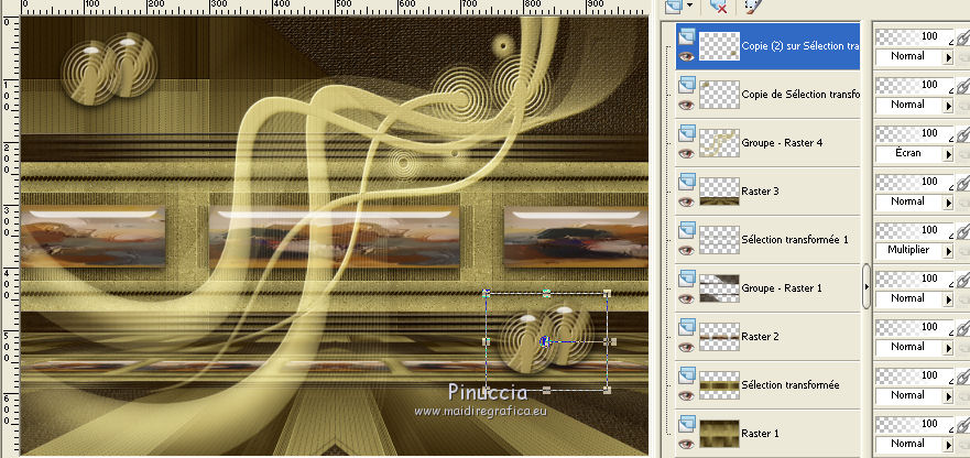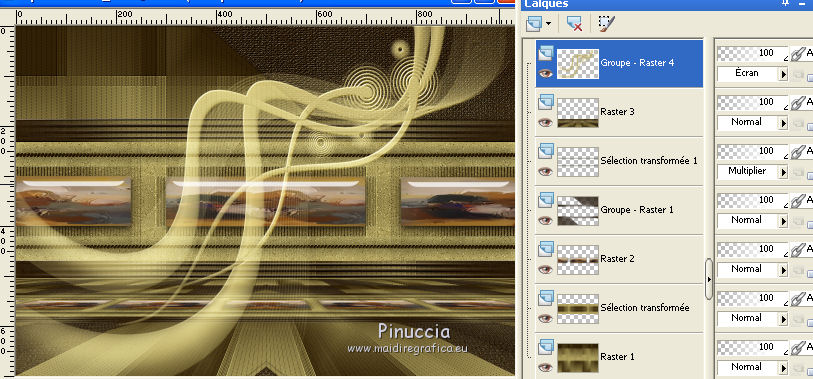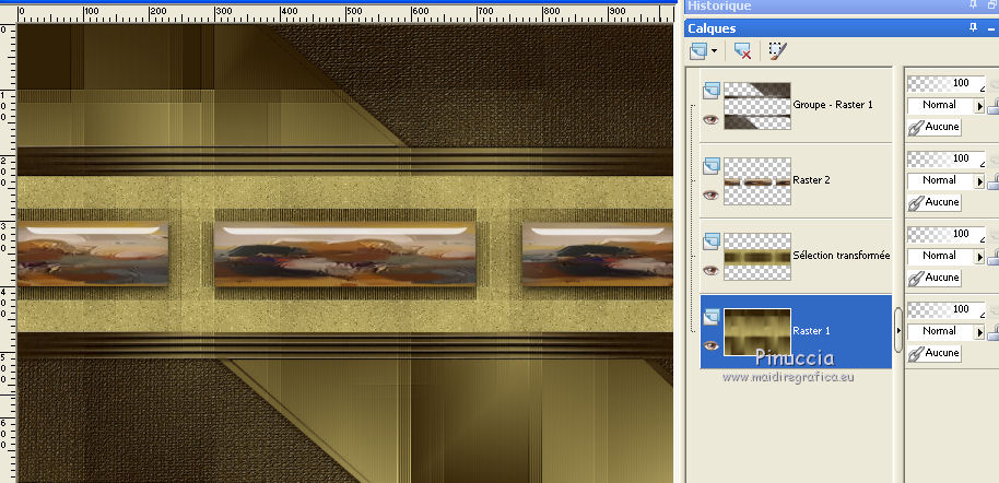 Pour traduire ce tutoriel j'ai utilisé PSPX7, PSPX2 et PSPX3, mais il peut également être exécuté avec les autres versions. Suivant la version utilisée, vous pouvez obtenir des résultats différents. Depuis la version X4, la fonction Image>Miroir a été remplacée par Image>Renverser horizontalement, et Image>Renverser avec Image>Renverser verticalement . Dans les versions X5 et X6, les fonctions ont été améliorées par la mise à disposition du menu Objets. Avec la nouvelle version X7, nous avons encore Image>Miroir et Image>Renverser/Retourner, mais avec nouvelles différences. Voir les détails à ce sujet ici Certaines dénominations ont changées entre les versions de PSP. Les plus frequentes dénominations utilisées: ![]() English translation here Vos versions ici![]() Nécessaire pour réaliser ce tutoriel: Matériel ici Pour le tube de la femme merci Beatriz. Le reste du matériel est de Maria José. (ici les liens vers les sites des créateurs du matériel) Modules Externes: consulter, si nécessaire, ma section des filtres ici Filters Unlimited 2.0 ici &<Bkg Kaleidoscope> - Kaleidoscope Persian (à importer dans Unlimited) ici Fantastic Machine - Paint Engine ici Mura's Seamless - Emboss at Alpha ici Mehdi - Sorting Tiles ici AP 01 [Innovations] - Distort-ShiftMesh ici AP 01 [Lines] - Lines SilverLining ici Alien Skin Eye Candy 5 Impact - Glass ici °Kiwi° Oelfilter - Zick Zack ici Mura's Meister - Perspective Tiling ici Filtres Kiwi et Mura's Seamless peuvent être utilisés seuls ou importés dans Filters Unlimited. voir comment le faire ici). Si un filtre est fourni avec cette icône, ![]() en fonction des couleurs utilisées, vous pouvez changer le mode mélange et l'opacité des calques. Dans les plus récentes versions de PSP, vous ne trouvez pas le dégradé d'avant plan/arrière plan ou Corel_06_029. Vous pouvez utiliser le dégradé des versions antérieures. Ici le dossier Dégradés de CorelX. Placer le preset En cliquant sur le preset une ou deux fois (selon vos réglages) automatiquement il se placera directement dans le dossier Settings de Alien Skin Eye Candy. pourquoi un ou deux clic voir ici Ouvrir les masques dans PSP et les minimiser avec le reste du matériel. 1. Placer en avant plan la couleur #312107. et en arrière plan la couleur #bdae67. ![]() Préparer en avant plan un dégradé de premier plan/arrière plan, style Linéaire. ![]() Placer en avant plan la Couleur. Ouvrir alpha-channel_MJ Fenêtre>Dupliquer ou sur le clavier shift+D pour faire une copie. ![]() Fermer l'original. La copie, qui sera la base de votre travail, n'est pas vide, mais contient les sélections enregistrées sur le canal alpha. Remplir l'image transparente avec la couleur foncée d'avant plan #312107.2. Effets>Modules Externes>Fantastic Machine - Paint Engine - preset zap ![]() Si vous ne trouvez pas le preset dans le filtre, quelque chose s'est probablement mal passé lors de l'installation; voir mes notes ici Dans tous les cas, vous pouvez toujours copier les paramètres que vous voyez dans la capture. 3. Calques>Nouveau calque de masque>A partir d'une image. Ouvrir le menu deroulant sous la fenêtre d'origine et vous verrez la liste des images ouvertes. Sélectionner le masque 102_mask_MJ. ![]() Calques>Fusionner>Fusionner le groupe. 4. Effets>Modules Externes>Mura's Seamless - Emboss at Alpha, par défaut. ![]() 5. Calques>Nouveau calque raster. Placer en avant plan le dégradé préparé au début. Remplir le calque du dégradé.Calques>Agencer>Déplacer vers le bas. 6. Effets>Modules Externes>Mehdi - Sorting Tiles. ![]() 7. Effets>Effets de bords>Accentuer. 8. Effets>Modules Externes>AP [Innovations] - Distort-ShiftMesh ![]() 9. Effets>Effets d'image>Mosaïque sans jointures. ![]() Image>Renverser. 10. Sélections>Charger/Enregistrer une sélection>Charger à partir d'un canal alpha. La sélection #1 est déjà disponible. On doit seulement cliquer sur Charger. ![]() Sélections>Transformer la sélection en calque. 11. Réglage>Ajouter/Supprimer du bruit>Ajouter du bruit. ![]() 12. Effets>Modules Externes>Filters Unlimited 2.0 - &<Bkg Kaleidoscope> - Kaleidoscope Persian, par défaut. ![]() 13. Sélections>Charger/Enregistrer une sélection>Charger à partir d'un canal alpha. Ouvrir le menu des sélections et charger la sélection #2. ![]() Calques>Nouveau calque raster. 14. Ouvrir le tube abstrat1_mj et Édition>Copier. Revenir sur votre travail et Édition>Coller dans la sélection. 15. Effets>Modules Externes>Alien Skin Eye Candy 5 Impact - Glass. Sélectionner le preset glass_majo et ok. ![]() Sélections>Désélectionner tout. 16. Vous positionner sur le calque du bas de la pile Raster 1. ![]() Effets>Modules Externes>AP [Lines] - Lines SilverLining. ![]() 17. Vous positionner sur le calque du haut de la pile, Groupe-Raster 1. Sélections>Charger/Enregistrer une sélection>Charger à partir d'un canal alpha. Ouvrir le menu des sélections et charger la sélection #3. ![]() Sélections>Transformer la sélection en calque. Sélections>Désélectionner tout. 18. Touche K sur le clavier pour activer l'outil Sélecteur ![]() garder Position horiz.: 0,00 et placer Position vert.: 254,00. ![]() Touche M pour désélectionner l'outil. 19. Calques>Dupliquer. Image>Renverser. Calques>Fusionner>Fusionner le calque de dessous. 20. Effets>Modules Externes>°Kiwi° Oelfilter - Zig Zack, par défaut. ![]() 21. Effets>Effets 3D>Ombre portée, couleur noire. ![]() Placer le calque en mode Multiplier. ![]() 22. Édition>Copie Spéciale>Copier avec fusion. Édition>Coller comme nouveau calque. 24. Effets>Modules Externes>Mura's Meister - Perspective Tiling. ![]() 25. Effets>Effets de réflexion>Miroir rotatif, par défaut. ![]() 26. Calques>Nouveau calque raster. Remplir le calque avec la couleur claire d'arrière plan #bdae67.27. Calques>Nouveau calque de masque>A partir d'une image. Ouvrir le menu deroulant sous la fenêtre d'origine et sélectionner le masque 103a_mask_MJ