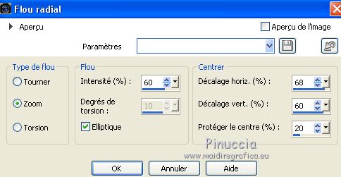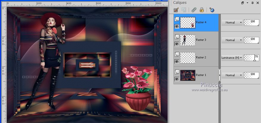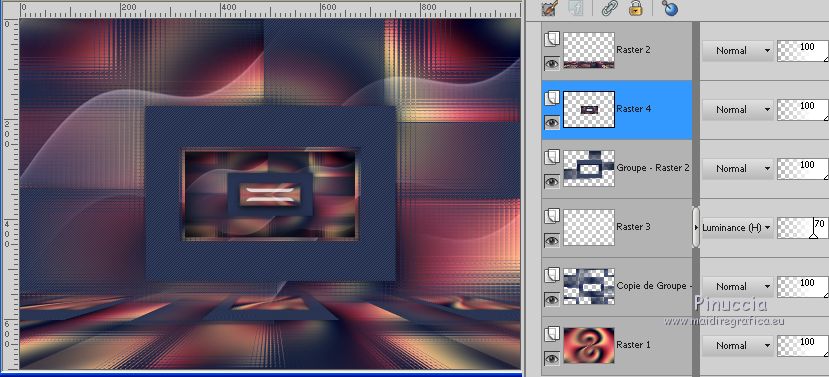 Pour traduire ce tutoriel j'ai utilisé PSPX7, PSPX2 et PSPX3, mais il peut également être exécuté avec les autres versions. Suivant la version utilisée, vous pouvez obtenir des résultats différents. Depuis la version X4, la fonction Image>Miroir a été remplacée par Image>Renverser horizontalement, et Image>Renverser avec Image>Renverser verticalement . Dans les versions X5 et X6, les fonctions ont été améliorées par la mise à disposition du menu Objets. Avec la nouvelle version X7, nous avons encore Image>Miroir et Image>Renverser/Retourner, mais avec nouvelles différences. Voir les détails à ce sujet ici Certaines dénominations ont changées entre les versions de PSP. Les plus frequentes dénominations utilisées: ![]() English translation here Vos versions ici![]() Nécessaire pour réaliser ce tutoriel: Matériel ici Merci pour le tubes Suizabella et CibiBijoux et pour le masque Cameron. (ici les liens vers les sites des créateurs du matériel) Modules Externes: consulter, si nécessaire, ma section des filtres ici Filters Unlimited 2.0 ici Carolaine and Sensibility - CS-DLines ici Mehdi - Wavy Lab 1.1. ici Alien Skin Eye Candy 5 Impact - Glass ici Mura's Meister - Perspective Tiling ici Simple - Top Left Mirror ici AAA Filters - Custom ici Graphics Plus - Vertical Mirror ici Filtres Simple et Graphics Plus peuvent être utilisés seuls ou importés dans Filters Unlimited. voir comment le faire ici). Si un filtre est fourni avec cette icône, ![]() en fonction des couleurs utilisées, vous pouvez changer le mode mélange et l'opacité des calques. Placer le preset En cliquant sur le preset une ou deux fois (selon vos réglages) automatiquement il se placera directement dans le dossier Settings de Alien Skin Eye Candy. pourquoi un ou deux clic voir ici Placer les sélections dans le dossier Sélections. Ouvrir le masque dans PSP et le minimiser avec le reste du matériel. Placer en avant plan la couleur #131e3c, et en arrière plan la couleur #dd555f. ![]() 1. Ouvrir une nouvelle image transparente 1000 x 700 pixels. 2. Effets>Modules Externes>Mehdi - Wavy Lab 1.1. Ce filtre crée des dégradés avec les couleurs de votre palette: la première est la couleur d'arrière plan, la deuxième est la couleur d'avant plan. Changer les autres deux couleurs créées par le filtre: la troisième avec la couleur #4a121d et la quatrième avec la couleur #f4c784. ![]() 3. Réglage>Flou>Flou radial. ![]() 4. Effets>Effets de bords>Accentuer Davantage. Image>Renverser. 5. Calques>Nouveau calque raster. Remplir le calque avec la couleur foncée d'avant plan.6. Calques>Nouveau calque de masque>A partir d'une image. Ouvrir le menu deroulant sous la fenêtre d'origine et vous verrez la liste des images ouvertes. Sélectionner le masque camerontags. ![]() 7. Effets>Effets de bords>Accentuer davantage. Calques>Fusionner>Fusionner le groupe. 8. Calques>Dupliquer. 9. Effets>Effets d'image>Mosaïque sans jointures. ![]() 10. Effets>Effets de textures>Mosaïque de verre. ![]() 11. Réglage>Netteté>Davantage de netteté. Calques>Agencer>Déplacer vers le bas. 12. Vous positionner sur le calque de dessus, Groupe-Raster 2. Effets>Modules Externes>Carolaine and Sensibility - CS-DLines, par défaut. ![]() Image>Renverser. Effets>Effets 3D>Ombre portée, couleur noire. ![]() 13. Édition>Copie Spéciale>Copier avec fusion. Édition>Coller comme nouveau calque. 14. Effets>Modules Externes>Mura's Meister - Perspective Tiling. ![]() 15. Sélections>Charger/Enregistrer une sélection>Charger à partir du disque. Chercher et charger la sélection ludmila_mj. ![]() Presser +/-10 fois CANC sur le clavier ![]() Sélections>Désélectionner tout. 16. Ouvrir le tube deco_ludmila_1_mj - Édition>Copier. Revenir sur votre travail et Édition>Coller comme nouveau calque. Calques>Agencer>Déplacer vers le bas - 2 fois. Placer le calque en mode Luminance (héritée) et réduire l'opacité à 70%. 17. Fermer le calque Raster 2. Vous positionner sur le calque Groupe-Raster 2. ![]() 18. Édition>Copie Spéciale>Copier avec fusion. 19. Sélections>Charger/Enregistrer une sélection>Charger à partir du disque. Chercher et charger la sélection ludmila_1_mj. ![]() 20. Calques>Nouveau calque raster. Édition>Coller dans la sélection. 21. Calques>Nouveau calque raster. Effets>Effets 3D>Découpe. ![]() Calques>Fusionner>Fusionner le calque de dessous. 22. Sélections>Charger/Enregistrer une sélection>Charger à partir du disque. Chercher et charger la sélection ludmila_2_mj. ![]() 23. Effets>Modules Externes>Alien Skin Eye Candy 5 Impact - Glass. Sélectionner le preset majo_glass et ok. ![]() Garder sélectionné. 24. Effets>Modules Externes>Graphics Plus - Vertical Mirror ![]() Sélections>Désélectionner tout. Réouvrir le calque Raster 2. La tag et les calques - adapter modes mélanges et opacitées à votre goût ![]() Calques>Fusionner>Calques visibles. 25. Effets>Modules Externes>AAA Filters - Custom - cliquer sur Landscape, Brightness -5 et ok. ![]() 26. Image>Redimensionner, à 90%, redimensionner tous les calques décoché. 27. Sélections>Sélectionner tout. Sélections>Flottante. Sélections>Statique. Effets>Effets 3D>Ombre portée, couleur noire. ![]() Sélections>Inverser. 28. Effets>Effets de distorsion>Bombage ![]() Répéter Effets>Effets 3D>Ombre portée, couleur noire. ![]() 29. Effets>Effets de distorsion>Bombage, comme précédemment. Édition>Répéter Bombage. Édition>Répéter Bombage. 30. Sélections>Sélectionner tout. Sélections>Flottante. Sélections>Statique. Édition>Copier. 31. Image>Ajouter des bordures, 40 pixels, symétrique, couleur blanche. 32. Sélections>Inverser. Édition>Coller dans la sélection (l'image de l'étape 30). 33. Réglage>Flou>Flou directionnel ou Flou de mouvement ![]() 34. Effets>Effets de réflexion>Miroir rotatif. ![]() 35. Effets>Modules Externes>Simple - Top Left Mirror. ![]() Réglage>Netteté>Davantage de netteté. 36. Sélections>Inverser. Effets>Eff