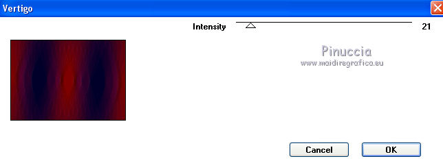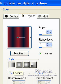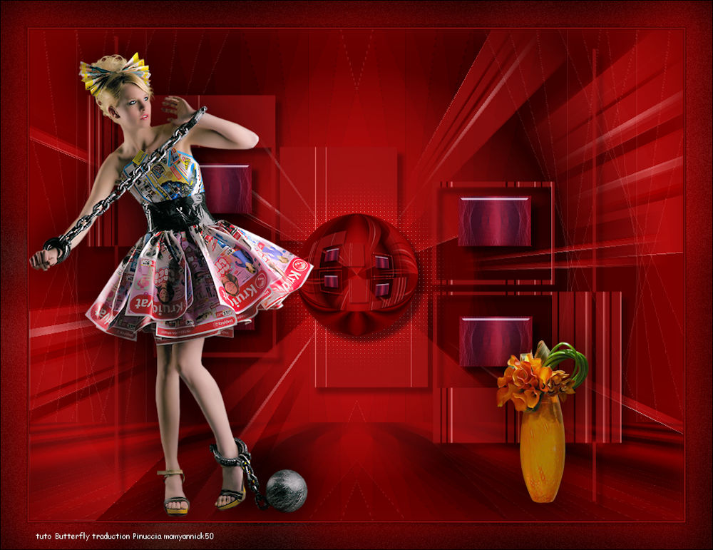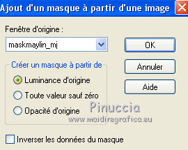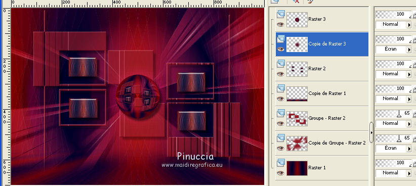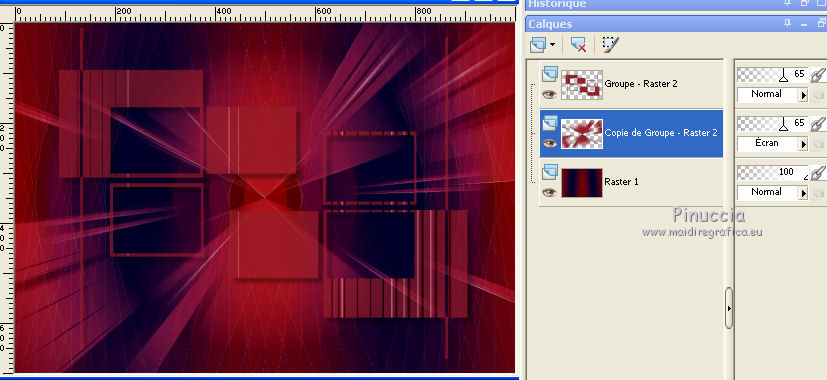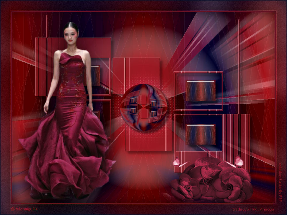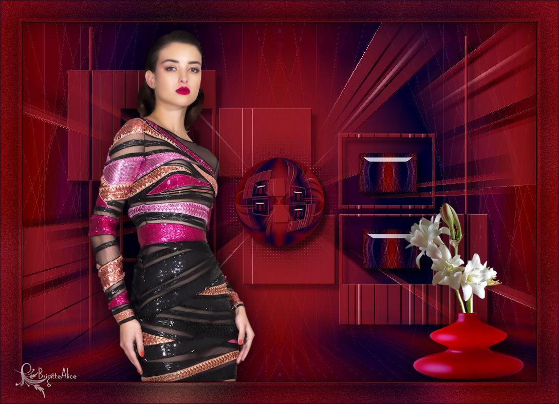 Pour traduire ce tutoriel j'ai utilisé CorelX12, mais il peut également être exécuté avec les autres versions. Suivant la version utilisée, vous pouvez obtenir des résultats différents. Depuis la version X4, la fonction Image>Miroir a été remplacée par Image>Renverser horizontalement, et Image>Renverser avec Image>Renverser verticalement . Dans les versions X5 et X6, les fonctions ont été améliorées par la mise à disposition du menu Objets. Avec la nouvelle version X7, nous avons encore Image>Miroir et Image>Renverser/Retourner, mais avec nouvelles différences. Voir les détails à ce sujet ici Certaines dénominations ont changées entre les versions de PSP. Les plus frequentes dénominations utilisées: ![]() Vos versions ici Nécessaire pour réaliser ce tutoriel: Matériel ici Merci pour le déco Katrina. Le reste du matériel est de Maria José. (ici les liens vers les sites des créateurs de tubes) Modules Externes: consulter, si nécessaire, ma section des filtres ici Filters Unlimited 2.0 ici Filter Factory Gallery D - Vertigo ici Mura's Meister - Perspective Tiling ici L&K's - L&K's - Raisa ici Alien Skin Eye Candy 5 Impact - Glass ici Carolaine and Sensibility - CS-LDot ici VM Toolbox - Zoom Blur ici si vous importez l'effet dans Unlimited, l'effet se place sur VM Stylize>Zoom Blur (voir l'étape 10) Filtres Factory Gallery peuvent être utilisés seuls ou importés dans Filters Unlimited. voir comment le faire ici). Si un filtre est fourni avec cette icône, ![]() en fonction des couleurs utilisées, vous pouvez changer le mode mélange et l'opacité des calques. Dans les plus récentes versions de PSP, vous ne trouvez pas le dégradé d'avant plan/arrière plan ou Corel_06_029. Vous pouvez utiliser le dégradé des versions antérieures. Ici le dossier Dégradés de CorelX. Placer le preset En cliquant sur le preset une ou deux fois (selon vos réglages) automatiquement il se placera directement dans le dossier Settings de Alien Skin Eye Candy. pourquoi un ou deux clic voir ici Placer les sélections dans le dossier Sélections. Ouvrir le masque dans PSP et le minimiser avec le reste du matériel. 1. Ouvrir une nouvelle image transparente 1000 x 750 pixels. Choisir deux couleurs; pour moi: couleur d'avant plan couleur d'arrière plan ![]() Préparer en avant plan un dégradé de premier plan/arrière plan, style Linéaire. ![]() Remplir l'image transparente du dégradé.2. Effets>Effets artistiques>Topographie ![]() 3. Effets>Modules Externes>Filter Factory Gallery D - Vertigo ![]() 4. Effets>Effets de réflexion>Miroir rotatif. ![]() 5. Calques>Nouveau calque raster. Remplir avec la couleur claire d'arrière plan #971e29.6. Calques>Nouveau calque de masque>A partir d'une image. Ouvrir le menu deroulant sous la fenêtre d'origine et vous verrez la liste des images ouvertes. Sélectionner le masque maskmaylin_mj. ![]() Calques>Fusionner>Fusionner le groupe. 7. Effets>Modules Externes>Mura's Seamless - Emboss at Alpha, par défaut. ![]() 8. Effets>Modules Externes>L&K's - L&K's Raisa ![]() 9. Effets>Effets 3D>Ombre portée, couleur noire. ![]() Réduire l'opacité de ce calque à 65%. 10. Calques>Dupliquer. Effets>Modules Externes>Filters Unlimited 2.0 - VM Stylize - Zoom Blur ![]() 11. Effets>Modules Externes>Mura's Seamless - Emboss at Alpha, par défaut. 12. Image>Renverser. Calques>Agencer>Déplacer vers le bas. Placer le calque en mode Écran. ![]() Vous positionner sur le calque de dessus Groupe-Raster 2. Répéter Effets>Modules Externes>Mura's Seamless - Emboss at Alpha, par défaut. 13. Vous positionner sur le calque Raster 1. Calques>Dupliquer. 14. Effets>Modules Externes>Mura's Meister - Perspective Tiling. ![]() 15. Sélections>Charger/Enregistrer une sélection>Charger à partir du disque. Chercher et charger la sélection maylin_1_mj. ![]() Presser 5 fois CANC sur le clavier ![]() Sélections>Désélectionner tout. Calques>Agencer>Placer en haut de la pile. 16. Sélections>Charger/Enregistrer une sélection>Charger à partir du disque. Chercher et charger la sélection maylin_mj. ![]() 17. Calques>Nouveau calque raster. Remplir le calque du dégradé.18. Effets>Effets artistiques>Topographie ![]() 19. Effets>Modules Externes>Filters Factory Gallery D - Vertigo, comme précédemment. ![]() 20. Effets>Effets de réflexion>Miroir rotatif, comme précédemment. ![]() 21. Effets>Modules Externes>Alien Skin Eye Candy 5 Impact - Glass Sélectionner le preset glass_majo_1 et ok. ![]() Ci-dessous les réglages, en cas de problèmes avec le preset. ![]() Sélections>Désélectionner tout. 22. Calques>Dupliquer - 3 fois. Positionner bien les petits cadres, comme ci-dessous.![]() 23. Vous positionner sur le calque du haut de la pile. Calques>Fusionner>Fusionner le calque de dessous, 3 fois. Effets>Effets 3D>Ombre portée, comme précédemment. ![]() 24. Édition>Copie Spéciale>Copier avec fusion. Édition>Coller comme nouveau calque. 25. Effets>Effets géométriques>Cercle. ![]() 26. Image>Redimensionner, à 25%, redimensionner tous les calques décoché. Effets>Effets 3D>Ombre portée, comme précédemment. 27. Calques>Dupliquer. Réglage>Flou>Flou gaussien - rayon 30. ![]() 28. Effets>Modules Externes>Carolaine and Sensibility - CS-LDots. ![]() 29. Réglage>Netteté>Davantage de netteté. Calques>Agencer>Déplacer vers le bas. Placer le calque en mode Écran. ![]() 30. Calques>Fusionner>Calques visibles. 31. Ouvrir le tube de la femme: si vous utilisez le tuber fourni vous positionner sur le calque Raster 2 (le tube sur ce calque est redimensionné pour le tutoriel) Édition>Copier. Revenir sur votre travail et Édition>Coller comme nouveau calque. Déplacer le tube à gauche.32. Réglage>Flou>Flou gaussien - rayon 30. ![]() Calques>Agencer>Déplacer vers le bas. Placer le calque en mode Multiplier. 33. Vous positionner sur le calque du haut de la pile. Ouvrir le tube déco et Édition>Copier. Revenir sur votre travail et Édition>Coller comme nouveau calq