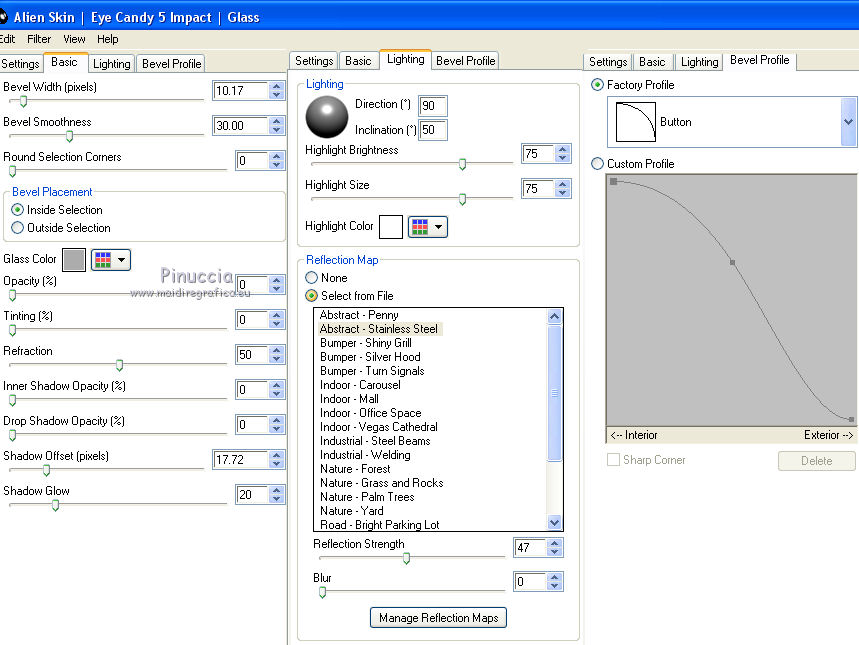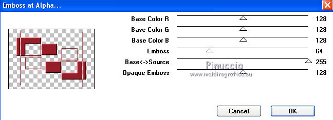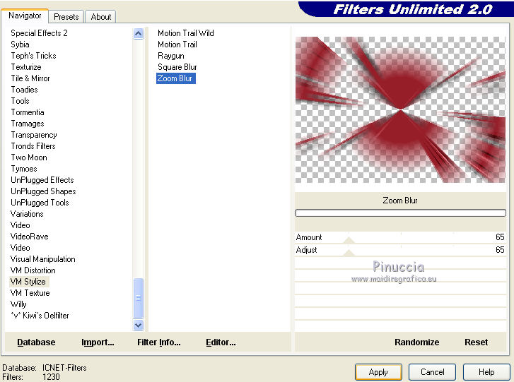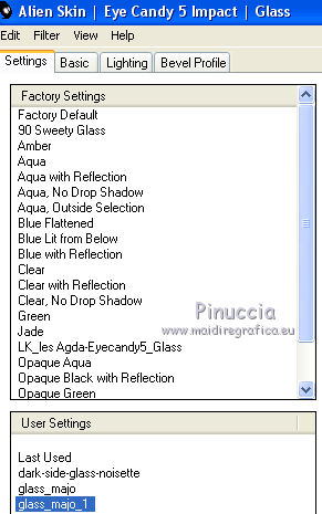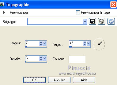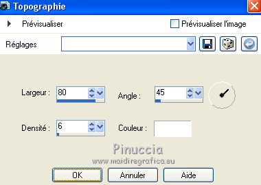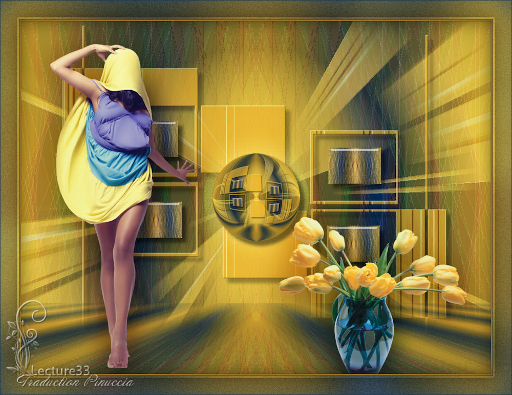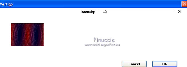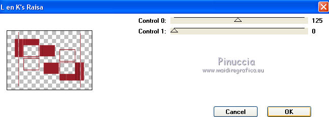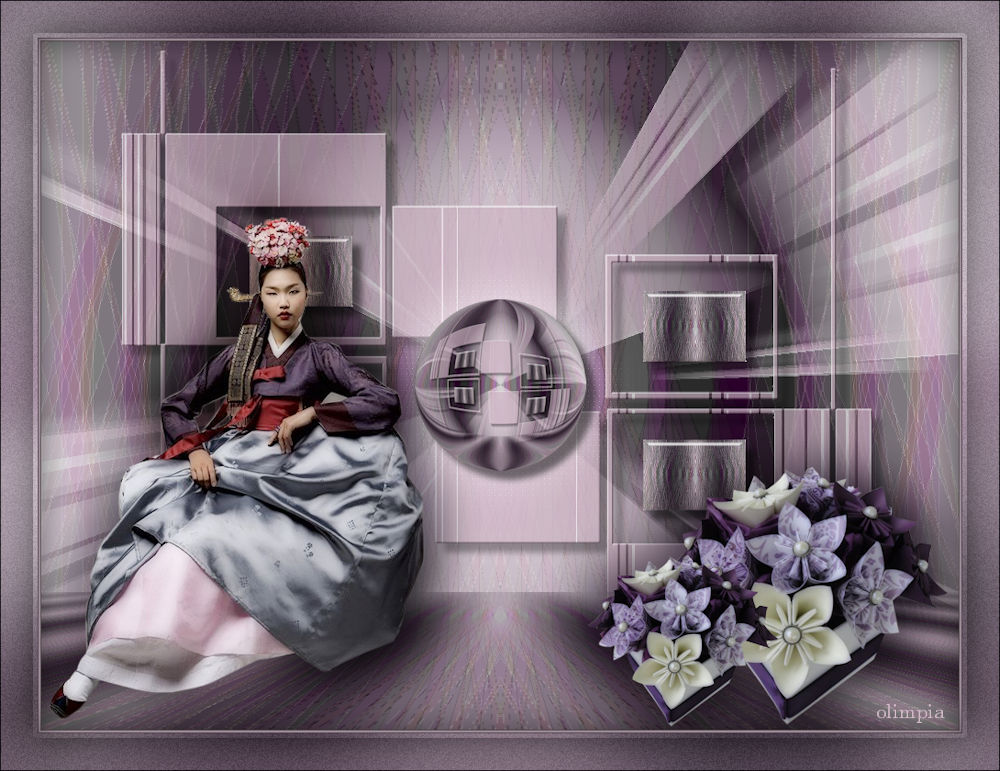 Pour traduire ce tutoriel j'ai utilisé CorelX12, mais il peut également être exécuté avec les autres versions. Suivant la version utilisée, vous pouvez obtenir des résultats différents. Depuis la version X4, la fonction Image>Miroir a été remplacée par Image>Renverser horizontalement, et Image>Renverser avec Image>Renverser verticalement . Dans les versions X5 et X6, les fonctions ont été améliorées par la mise à disposition du menu Objets. Avec la nouvelle version X7, nous avons encore Image>Miroir et Image>Renverser/Retourner, mais avec nouvelles différences. Voir les détails à ce sujet ici Certaines dénominations ont changées entre les versions de PSP. Les plus frequentes dénominations utilisées: ![]() Vos versions ici Nécessaire pour réaliser ce tutoriel: Matériel ici Merci pour le déco Katrina. Le reste du matériel est de Maria José. (ici les liens vers les sites des créateurs de tubes) Modules Externes: consulter, si nécessaire, ma section des filtres ici Filters Unlimited 2.0 ici Filter Factory Gallery D - Vertigo ici Mura's Meister - Perspective Tiling ici L&K's - L&K's - Raisa ici Alien Skin Eye Candy 5 Impact - Glass ici Carolaine and Sensibility - CS-LDot ici VM Toolbox - Zoom Blur ici si vous importez l'effet dans Unlimited, l'effet se place sur VM Stylize>Zoom Blur (voir l'étape 10) Filtres Factory Gallery peuvent être utilisés seuls ou importés dans Filters Unlimited. voir comment le faire ici). Si un filtre est fourni avec cette icône, ![]() en fonction des couleurs utilisées, vous pouvez changer le mode mélange et l'opacité des calques. Dans les plus récentes versions de PSP, vous ne trouvez pas le dégradé d'avant plan/arrière plan ou Corel_06_029. Vous pouvez utiliser le dégradé des versions antérieures. Ici le dossier Dégradés de CorelX. Placer le preset En cliquant sur le preset une ou deux fois (selon vos réglages) automatiquement il se placera directement dans le dossier Settings de Alien Skin Eye Candy. pourquoi un ou deux clic voir ici Placer les sélections dans le dossier Sélections. Ouvrir le masque dans PSP et le minimiser avec le reste du matériel. 1. Ouvrir une nouvelle image transparente 1000 x 750 pixels. Choisir deux couleurs; pour moi: couleur d'avant plan couleur d'arrière plan ![]() Préparer en avant plan un dégradé de premier plan/arrière plan, style Linéaire. ![]() Remplir l'image transparente du dégradé.2. Effets>Effets artistiques>Topographie ![]() 3. Effets>Modules Externes>Filter Factory Gallery D - Vertigo ![]() 4. Effets>Effets de réflexion>Miroir rotatif. ![]() 5. Calques>Nouveau calque raster. Remplir avec la couleur claire d'arrière plan #971e29.6. Calques>Nouveau calque de masque>A partir d'une image. Ouvrir le menu deroulant sous la fenêtre d'origine et vous verrez la liste des images ouvertes. Sélectionner le masque maskmaylin_mj. ![]() Calques>Fusionner>Fusionner le groupe. 7. Effets>Modules Externes>Mura's Seamless - Emboss at Alpha, par défaut. ![]() 8. Effets>Modules Externes>L&K's - L&K's Raisa ![]() 9. Effets>Effets 3D>Ombre portée, couleur noire. ![]() Réduire l'opacité de ce calque à 65%. 10. Calques>Dupliquer. Effets>Modules Externes>Filters Unlimited 2.0 - VM Stylize - Zoom Blur ![]() 11. Effets>Modules Externes>Mura's Seamless - Emboss at Alpha, par défaut. 12. Image>Renverser. Calques>Agencer>Déplacer vers le bas. Placer le calque en mode Écran. ![]() Vous positionner sur le calque de dessus Groupe-Raster 2. Répéter Effets>Modules Externes>Mura's Seamless - Emboss at Alpha, par défaut. 13. Vous positionner sur le calque Raster 1. Calques>Dupliquer. 14. Effets>Modules Externes>Mura's Meister - Perspective Tiling. ![]() 15. Sélections>Charger/Enregistrer une sélection>Charger à partir du disque. Chercher et charger la sélection maylin_1_mj. ![]() Presser 5 fois CANC sur le clavier ![]() Sélections>Désélectionner tout. Calques>Agencer>Placer en haut de la pile. 16. Sélections>Charger/Enregistrer une sélection>Charger à partir du disque. Chercher et charger la sélection maylin_mj. ![]() 17. Calques>Nouveau calque raster. Remplir le calque du dégradé.18. Effets>Effets artistiques>Topographie ![]() 19. Effets>Modules Externes>Filters Factory Gallery D - Vertigo, comme précédemment. ![]() 20. Effets>Effets de réflexion>Miroir rotatif, comme précédemment. ![]() 21. Effets>Modules Externes>Alien Skin Eye Candy 5 Impact - Glass Sélectionner le preset glass_majo_1 et ok. ![]() Ci-dessous les réglages, en cas de problèmes avec le preset. ![]() Sélections>Désélectionner tout. 22. Calques>Dupliquer - 3 fois. Positionner bien les petits cadres, comme ci-dessous.![]() 23. Vous positionner sur le calque du haut de la pile. Calques>Fusionner>Fusionner le calque de dessous, 3 fois. Effets>Effets 3D>Ombre portée, comme précédemment. ![]() 24. Édition>Copie Spéciale>Copier avec fusion. Édition>Coller comme nouveau calque. 25. Effets>Effets géométriques>Cercle. ![]() 26. Image>Redimensionner, à 25%, redimensionner tous les calques décoché. Effets>Effets 3D>Ombre portée, comme précédemment. 27. Calques>Dupliquer. Réglage>Flou>Flou gaussien - rayon 30. ![]() 28. Effets>Modules Externes>Carolaine and Sensibility - CS-LDots. ![]() 29. Réglage>Netteté>Davantage de netteté. Calques>Agencer>Déplacer vers le bas. Placer le calque en mode Écran. ![]() 30. Calques>Fusionner>Calques visibles. 31. Ouvrir le tube de la femme: si vous utilisez le tuber fourni vous positionner sur le calque Raster 2 (le tube sur ce calque est redimensionné pour le tutoriel) Édition>Copier. Revenir sur votre travail et Édition>Coller comme nouveau calque. Déplacer le tube à gauche.32. Réglage>Flou>Flou gaussien - rayon 30. ![]() Calques>Agencer>Déplacer vers le bas. Placer le calque en mode Multiplier. 33. Vous positionner sur le calque du haut de la pile. Ouvrir le tube déco et Édition>Copier. Revenir sur votre travail et Édition>Coller comme nouveau calq