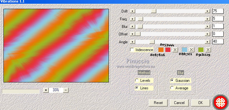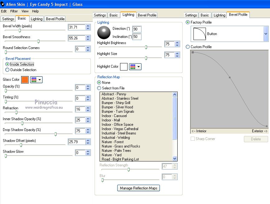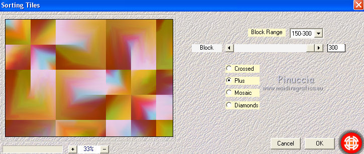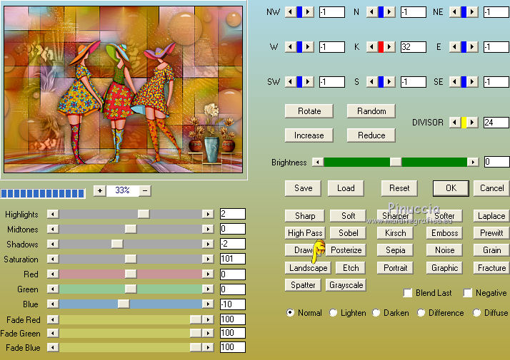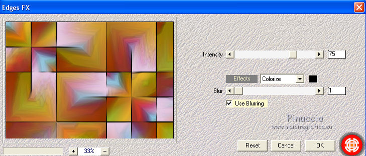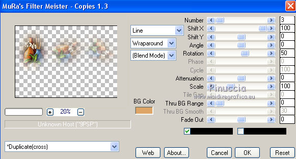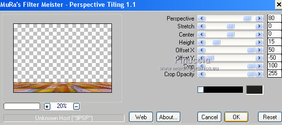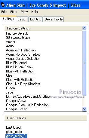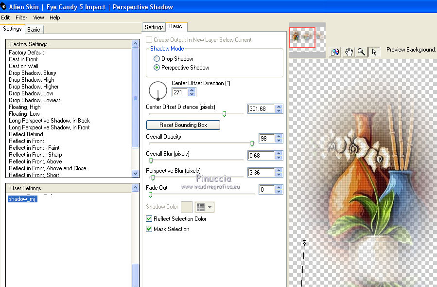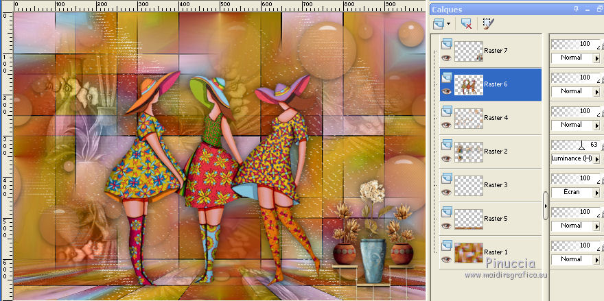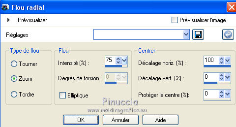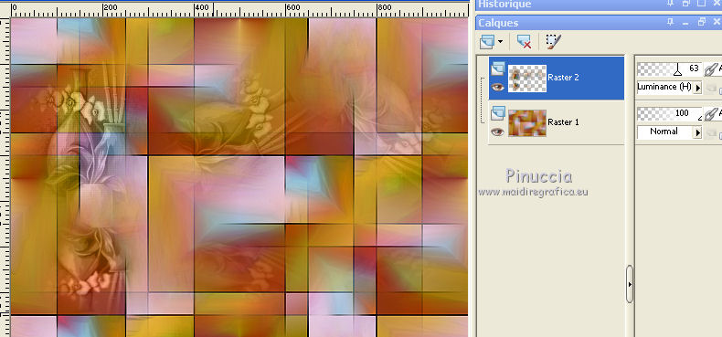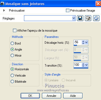 Pour traduire ce tutoriel j'ai utilisé CorelX12, mais il peut également être exécuté avec les autres versions. Suivant la version utilisée, vous pouvez obtenir des résultats différents. Depuis la version X4, la fonction Image>Miroir a été remplacée par Image>Renverser horizontalement, et Image>Renverser avec Image>Renverser verticalement . Dans les versions X5 et X6, les fonctions ont été améliorées par la mise à disposition du menu Objets. Avec la nouvelle version X7, nous avons encore Image>Miroir et Image>Renverser/Retourner, mais avec nouvelles différences. Voir les détails à ce sujet ici Certaines dénominations ont changées entre les versions de PSP. Les plus frequentes dénominations utilisées: ![]() Vos versions iciNécessaire pour réaliser ce tutoriel: Matériel ici Pour le tube merci Suizabella. (les liens des sites des createurs de tubes ici) Modules Externes: consulter, si nécessaire, ma section des filtres ici Filters Unlimited 2.0 ici Carolaine and Sensibility - CS-DLines ici Mura's Meister - Perspective Tiling ici Mura's Meister - Copies ici Mehdi - Vibration 1.1 ici Mehdi - Sorting Tiles - Edges FX ici Alien Skin Eye Candy 5 Impact - Perspective Shadow, Glass ici Optionnel: AAA Filters - Custom ici ![]() en fonction des couleurs utilisées, vous pouvez changer le mode mélange et l'opacité des calques. Dans les plus récentes versions de PSP, vous ne trouvez pas le dégradé d'avant plan/arrière plan ou Corel_06_029. Vous pouvez utiliser le dégradé des versions antérieures. Ici le dossier Dégradés de CorelX. Placer les presets En cliquant sur le preset une ou deux fois (selon vos réglages) automatiquement il se placera directement dans le dossier Settings de Alien Skin Eye Candy. pourquoi un ou deux clic voir ici Placer le preset mistedmeninas dans le dossier Paramètres par défaut. Placer les sélections dans le dossier Sélections 1. Placer en avant plan la couleur #70230c, et en arrière plan la couleur #dfa567. ![]() Préparer en avant plan un dégradé de premier plan/arrière plan, style Linéaire. ![]() 2. Ouvrir une nouvelle image transparente 1000 x 700 pixels. Sélections>Sélectionner tout. Ouvrir le graphique Franck Ayrole et Édition>Copier. Revenir sur votre travail et Édition>Coller dans la sélection. Sélections>Désélectionner tout. 3. Réglage>Flou>Flou radial. ![]() 4. Calques>Dupliquer. Image>Miroir. Image>Renverser. Réduire l'opacité de ce calque à 50%. Calques>Fusionner>Fusionner le calque de dessous. 5. Effets>Modules Externes>Mehdi - Vibrations 1.1 ![]() ![]() 6. Effets>Modules Externes>Mehdi - Sorting Tiles. ![]() 7. Effets>Modules Externes>Mehdi - Edges FX - couleur noire ![]() 8. Effets>Effets d'image>Mosaïque sans jointures. ![]() 9. Réglage>Netteté>Davantage de netteté. 10. Ouvrir le tube mistedjarrosfloral - Édition>Copier. Revenir sur votre travail et Édition>Coller comme nouveau calque. 11. Activer l'outil Sélecteur ![]() ouvrir le menu des preset et sélectionner le preset mistedmeninas. ![]() Vous aurez ce-ci ![]() Touche M pour désélectionner l'outil. 12. Effets>Modules Externes>Mura's Meister - Copies. ![]() 13. Effets>Modules Externes>Alien Skin Eye Candy 5 Impact - Perspective Shadow. Sélectionner le preset shadow_mj et ok. Ci-dessous les réglages en cas de problèmes avec le preset. ![]() Placer le calque en mode Luminance (héritée) et réduire l'opacité à 63%. ![]() 14. Ouvrir le tube deco_meninas - Édition>Copier. Revenir sur votre travail et Édition>Coller comme nouveau calque. Calques>Agencer>Déplacer vers le bas. 15. Vous positionner sur le calque du haut de la pile. Calques>Nouveau calque raster. Remplir le calque du dégradé.16. Sélections>Charger/Enregistrer une sélection>Charger à partir du disque. Chercher et charger la sélection meninas_1_mj. ![]() 17. Sélections>Inverser. Presser CANC sur le clavier ![]() Sélections>Inverser. 18. Effets>Modules Externes>Carolaine and Sensibility - CS-DLines ![]() 19. Effets>Modules Externes>Alien Skin Eye Candy 5 Impact - Glass sélectionner le preset glass_majo_2 e ok. ![]() Ci-dessous les réglages ![]() Sélections>Désélectionner tout. 20. Effets>Effets d'image>Mosaïque sans jointures. ![]() 21. Effets>Effets d'image>Mosaïque sans jointures, par défaut. ![]() Image>Miroir. 22. Édition>Copie Spéciale>Copier avec fusion. Édition>Coller comme nouveau calque. 23. Effets>Modules Externes>Mura's Meister - Perspective Tiling. ![]() 24. Sélections>Charger/Enregistrer une sélection>Charger à partir du disque. Chercher et charger la sélection meninas_2_mj. ![]() Presser 4 fois CANC sur le clavier ![]() Sélections>Désélectionner tout. 25. Calques>Agencer>Déplacer vers le bas - 3 fois. ![]() 26. Vous positionner sur le calque du haut de la pile. Copier/Coller comme nouveau calque les tubes meninas et mistedjarrosfloral. Redimensionner et positionner bien les tubes, voir mon exemple.Effets>Effets 3D>Ombre portée, à choix. Vous devriez avoir ce-ci ![]() En fonction de vos couleurs, vous êtes libre de changer mode mélange et opacité des calques. Calques>Fusionner>Calques visibles. 27. Effets>Modules Externes>AAA Filters Custom - Landscape (optionnel). ![]() 28. Image>Ajouter des bordures, 1 pixel, symétrique, couleur noire. Image>Ajouter des bordures, 2 pixels, symétrique, couleur d'arrière plan #dfa567. Image>Ajouter des bordures, 1 pixel, symétrique, couleur noire. 29. Sélections>Sélectionner tout. Édition>Copier. Image>Ajouter des bordures, 15 pixels, symétrique, couleur blanche. Sélections>Inverser. Édition>Coller dans la sélection. 30. Sélections>Sélectionner tout. Édition>Copier. Image>Ajouter des bordures, 30 pixels, symétrique, couleur blanche. Sélections>Inverser. Édition>Coller dans la sélection. 31. Réglage>Flou>Flou gaussien - rayon 10 ![]() 31. Sélections>Inverser. Effets>Effets 3D>Ombre portée, couleur noire. ![]() Sélections>Désélectionner tout. 32. Signer votre travail sur un no