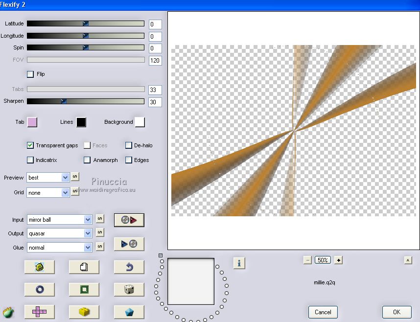 Pour traduire ce tutoriel j'ai utilisé CorelX12, mais il peut également être exécuté avec les autres versions. Suivant la version utilisée, vous pouvez obtenir des résultats différents. Depuis la version X4, la fonction Image>Miroir a été remplacée par Image>Renverser horizontalement, et Image>Renverser avec Image>Renverser verticalement . Dans les versions X5 et X6, les fonctions ont été améliorées par la mise à disposition du menu Objets. Avec la nouvelle version X7, nous avons encore Image>Miroir et Image>Renverser/Retourner, mais avec nouvelles différences. Voir les détails à ce sujet ici Certaines dénominations ont changées entre les versions de PSP. Les plus frequentes dénominations utilisées: ![]() Vos versions ici Nécessaire pour réaliser ce tutoriel: Matériel ici (ici les liens vers les sites des créateurs de tubes) Modules Externes: consulter, si nécessaire, ma section des filtres ici Filters Unlimited 2.0 ici Neology - Vasarely Mosaic ici Flaming Pear - Flexify 2 ici Mura's Meister - Perspective Tiling ici Simple - Pizza Slice Mirror ici Mehdi - Sorting Tiles ici VM Toolbox - Blast ici AAA Filters - Custom ici Filtres Neology, VM Toolbox et Simple peuvent être utilisés seuls ou importés dans Filters Unlimited. voir comment le faire ici). Si un filtre est fourni avec cette icône, ![]() en fonction des couleurs utilisées, vous pouvez changer le mode mélange et l'opacité des calques. Dans les plus récentes versions de PSP, vous ne trouvez pas le dégradé d'avant plan/arrière plan ou Corel_06_029. Vous pouvez utiliser le dégradé des versions antérieures. Ici le dossier Dégradés de CorelX. Placer le preset pour Flexify dans un dossier à choix. Placer les sélections dans le dossier Sélections 1. Choisir deux couleurs du tube. Mes couleurs: avant plan #d89231, arrière plan #030a1a. ![]() Préparer en avant plan un dégradé de premier plan/arrière plan, style Linéaire. ![]() Ouvrir une nouvelle image transparente 1000 x 700 pixels. Remplir l'image transparente du dégradé.2. Effets>Modules Externes>Neology - Vasarely Mosaics ![]() 3. Effets>Modules Externes>Simple - Pizza Slice Mirror. 4. Effets>Effets de réflexion>Miroir rotatif, par défaut. ![]() 5. Sélections>Charger/Enregistrer une sélection>Charger à partir du disque. Chercher et charger la sélection millie_mj. ![]() Sélections>Transformer la sélection en calque. 6. Réglage>Flou>Flou gaussien - rayon 25. ![]() Sélections>Désélectionner tout. 7. Effets>Effets d'image>Mosaïque sans jointures. ![]() 8. Effets>Effets géométriques>Inclinaison. ![]() 9. Effets>Modules Externes>Flaming Pear - Flexify Cliquer sur le bouton rouge et chercher, dans le dossier où vous l'avez copié, le preset millie.q2q ![]() Cliquer ok pour appliquer ![]() 10. Sélections>Charger/Enregistrer une sélection>Charger à partir du disque. Chercher et charger la sélection millie_1_mj. ![]() Presser CANC sur le clavier ![]() Sélections>Désélectionner tout. 11. Effets>Effets de distorsion>Torsion ![]() 12. Effets>Effets artistiques>Simili. ![]() 13. Réglage>Netteté>Davantage de netteté. 14. Effets>Effets d'image>Mosaïque sans jointures. ![]() Placer le calque en mode Écran ou autre. 15. Vous positionner sur le calque Raster 1. Calques>Dupliquer. Effets>Modules Externes>Mura's Meister - Perspective Tiling. ![]() 16. Sélections>Charger/Enregistrer une sélection>Charger à partir du disque. Chercher et charger la sélection millie_2_mj. ![]() Sélections>Transformer la sélection en calque. 17. Réglage>Flou>Flou gaussien - rayon 25. ![]() Calques>Fusionner>Fusionner le calque de dessous. Sélections>Désélectionner tout. Calques>Dupliquer. Image>Renverser. Calques>Fusionner>Fusionner le calque de dessous. 18. Ouvrir deco_millie_mj - Édition>Copier. Revenir sur votre travail et Édition>Coller comme nouveau calque. 19. Vous positionner sur le calque Raster 1. Sélections>Charger/Enregistrer une sélection>Charger à partir du disque. Chercher et charger à nouveau la sélection millie_mj. ![]() Sélections>Transformer la sélection en calque. 20. Réglage>Flou>Flou gaussien - rayon 25. ![]() 21. Effets>Modules Externes>Mehdi - Sorting Tiles. ![]() 22. Effets>Modules Externes>AAA Filters - Custom - cliquer sur Prewitt et ok ![]() Sélections>Désélectionner tout. 23. Calques>Dupliquer. Image>Renverser. Réduire l'opacité de ce calque à 50%. Calques>Fusionner>Fusionner le calque de dessous. 24. Effets>Effets géométriques>Inclinaison. ![]() 25. Effets>Effets d'image>Mosaïque sans jointures. ![]() 26. Vous positionner sur le calque du haut de la pile. Ouvrir le tube des vases - Édition>Copier. Revenir sur votre travail et Édition>Coller comme nouveau calque. Déplacer le tube à droite.Effets>Effets 3D>Ombre portée, à choix. Ouvrir le tube de la femme - Édition>Copier. Revenir sur votre travail et Édition>Coller comme nouveau calque. Image>Redimensionner, à 88%, redimensionner tous les calques décoché. Déplacer le tube à gauche.Effets>Effets 3D>Ombre portée, à choix. La tag et les calques (placer modes mélange et opacitées à votre goût) ![]() Calques>Fusionner>Calques visibles. Optionnel: Effets>Modules Externes>AAA Filters - Custom - Landscape ![]() 27. Image>Ajouter des bordures, 1 pixel, symétrique, couleur noire. 28. Sélections>Sélectionner tout. Édition>Copier. 29. Image>Ajouter des bordures, 30 pixels, symétrique, couleur blanche. Sélections>Inverser. Édition>Coller dans la sélection (l'image copiée à l'étape 28). 30. Réglage>Flou>Flou gaussien - rayon 25. ![]() 31. Effets>Effets artistiques>Simili, comme précédemment. ![]() 32. Réglage>Netteté>Davantage de netteté. 33. Sélections>Inverser. Effets>Effets 3D>Ombre portée, couleur noire. ![]() 34. Sélections>Sélectionner tout. Image>Ajouter des bordures, 30 pixels, symétrique, couleur blanche. Sélections>Inverser. Édition>Coller dans la sélection (l'image copiée à l'étape 28 est toujours