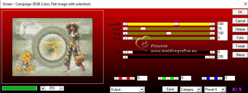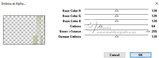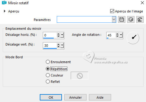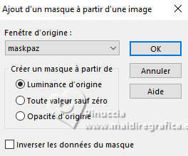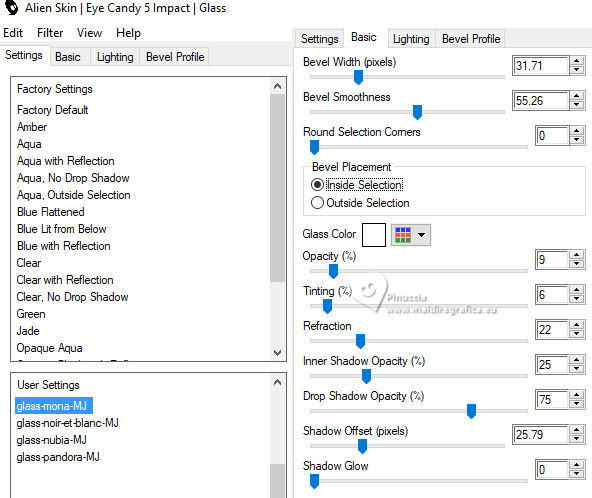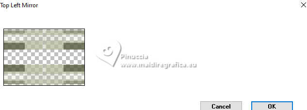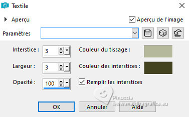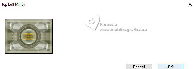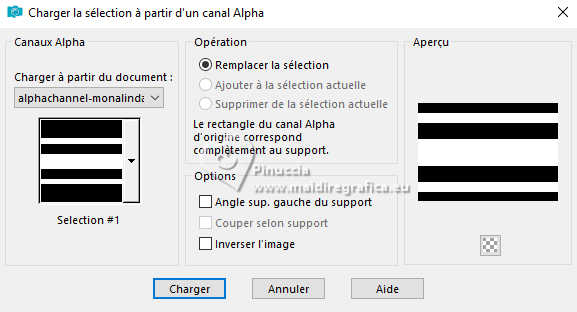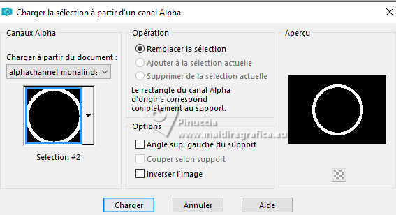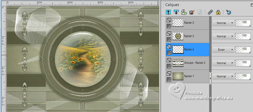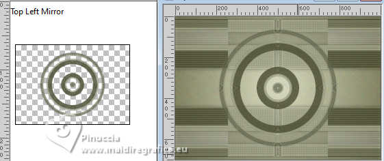 Pour traduire ce tutoriel j'ai utilisé PSPX9 et PSP2020, mais il peut également être exécuté avec les autres versions. Suivant la version utilisée, vous pouvez obtenir des résultats différents. Depuis la version X4, la fonction Image>Miroir a été remplacée par Image>Renverser horizontalement, et Image>Renverser avec Image>Renverser verticalement . Dans les versions X5 et X6, les fonctions ont été améliorées par la mise à disposition du menu Objets. Avec la nouvelle version X7, nous avons encore Image>Miroir et Image>Renverser/Retourner, mais avec nouvelles différences. Voir les détails à ce sujet ici Certaines dénominations ont changées entre les versions de PSP. Les plus frequentes dénominations utilisées: ![]() English translation here Vos versions ici![]() Nécessaire pour réaliser ce tutoriel: ![]() Matériel de Maria José. (ici les liens vers les sites des créateurs du matériel) ![]() consulter, si nécessaire, ma section des filtres ici Filters Unlimited 2.0 ici Ap 05 [Noise/Paint] - Smear-Campaign ici Simple - Top Left Mirror ici Mura's Seamless - Emboss at Alpha ici Alien Skin Eye Candy 5 Impact - Glass ici Mura's Meister - Pole Transform ici Filtres Simple et Mura's Seamless peuvent être utilisés seuls ou importés dans Filters Unlimited. voir comment le faire ici. Si un filtre est fourni avec cette icône, ![]() en fonction des couleurs utilisées, vous pouvez changer le mode mélange et l'opacité des calques. Dans les plus récentes versions de PSP, vous ne trouvez pas le dégradé d'avant plan/arrière plan ou Corel_06_029. Vous pouvez utiliser le dégradés des versions antérieures. Ici le dossier Dégradés de CorelX. Placer le preset En cliquant sur le preset une ou deux fois (selon vos réglages) automatiquement il se placera directement dans le dossier Settings de Alien Skin Eye Candy. pourquoi un ou deux clic voir ici ![]() Ouvrir le masque dans PSP et le minimiser avec le reste du matériel. Choisir deux couleurs à choix; pour l'exemple: Placer en avant plan la couleur #b5b89b et en arrière plan la couleur #434321. ![]() Préparer en avant plan un dégradé de premier plan/arrière plan, style Halo. ![]() 1. Ouvrir alphachannel-monalinda-MJ. Fenêtre>Dupliquer ou sur le clavier shift+D pour faire une copie. ![]() Fermer l'original. La copie, qui sera la base de votre travail, n'est pas vide, mais contient les sélections enregistrées sur le canal alpha. Remplir l'image transparente du dégradé.2. Effets>Modules Externes>AP 05 [Noise/Paint] - Smear-Campaign ![]() 3. Calques>Nouveau calque raster. Placer en avant plan la Couleur ![]() Remplir le calque avec la couleur claire d'avant plan.4. Calques>Nouveau calque de masque>A partir d'une image. Ouvrir le menu deroulant sous la fenêtre d'origine et vous verrez la liste des images ouvertes. Sélectionner le masque maskpaz. ![]() Calques>Fusionner>Fusionner le groupe. 5. Effets>Modules Externes>Mura's Seamless - Emboss at Alpha, par défaut. ![]() 6. Effets>Effets de réflexion>Miroir rotatif. ![]() 7. Effets>Modules Externes>Simple - Top Left Mirror. ![]() 8. Effets>Effets 3D>Ombre portée, couleur noire. ![]() 9. Calques>Dupliquer. Sélections>Charger/Enregistrer une sélection>Charger à partir d'un canal alpha. La sélection Selection #1 est déjà disponible. On doit seulement cliquer sur Charger. ![]() Presser CANC sur le clavier ![]() Sélections>Désélectionner tout. 10. Effets>Modules Externes>Mura's Meister - Pole Transform. ![]() 11. Effets>Modules Externes>Simple - Top Left Mirror. ![]() 12. Sélections>Charger/Enregistrer une sélection>Charger à partir d'un canal alpha. Ouvrir le menu des sélections et charger la sélection Selection #2. ![]() Calques>Nouveau calque raster. Placer à nouveau en avant plan le dégradé ![]() Remplir la sélection du dégradé.13. Effets>Effets de textures>Textile couleur du tissage: couleur d'avant plan couleur des interstices: couleur d'arrière plan ![]() 14. Effets>Modules Externes>Alien Skin Eye Candy 5 Impact - Glass. Sélectionner le preset glass-mona-MJ ![]() Sélections>Désélectionner tout. 15. Vous positionner sur le calque de dessous, Copie de Groupe-Raster 2. Sélections>Charger/Enregistrer une sélection>Charger à partir d'un canal alpha. Ouvrir le menu des sélections et charger la sélection Selection #3. ![]() Presser CANC sur le clavier. Sélections>Désélectionner tout. 16. Vous positionner sur le calque du bas de la pile, Raster 1. Sélections>Charger/Enregistrer une sélection>Charger à partir d'un canal alpha. Ouvrir le menu des sélections et charger la sélection Selection #4. ![]() Sélections>Transformer la sélection en calque. Calques>Agencer>Placer en haut de la pile. 17. Calques>Nouveau calque raster. Ouvrir le misted misted-MJ ![]() Édition>Copier. Revenir sur votre travail et Édition>Coller dans la sélection. 18. Effets>Modules Externes>Alien Skin Eye Candy 5 Impact - Glass - preset glass-mona-MJ Sélections>Désélectioner tout. Calques>Fusionner>Fusionner le calque de dessous - 2 fois. Calques>Agencer>Déplacer vers le bas. 19. Vous positionner sur le calque du haut de la pile, Copie de Groupe-Raster 2. Calques>Fusionner>Fusionner le calque de dessous. Effets>Effets 3D>Ombre portée, couleur foncée d'arrière plan ![]() 20. Ouvrir deco-2-MJ ![]() Édition>Copier. Revenir sur votre travail et Édition>Coller comme nouveau calque. 21. Ouvrir deco-3-MJ ![]() Édition>Copier. Revenir sur votre travail et Édition>Coller comme nouveau calque. Calques>Agencer>Déplacer vers le bas - 2 fois. Placer le calque en mode Écran. La tag et les calques - adapter Mode mélange et opacité en fonction de votre travail ![]() 22. Vous positionner sur le calque du haut de la pile. Ouvrir le tube de la femme AI-image-tube_MJ ![]() Édition>Copier. Revenir sur votre travail et Édition>Coller comme nouveau calque. Image>Redimensionner, à 70%, redimensionner tous les calques décoché. Déplacer le tube à droite.Effets