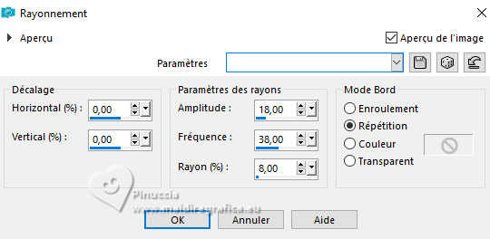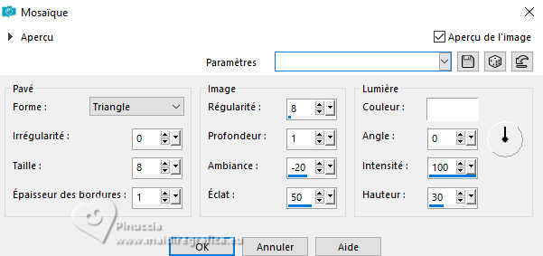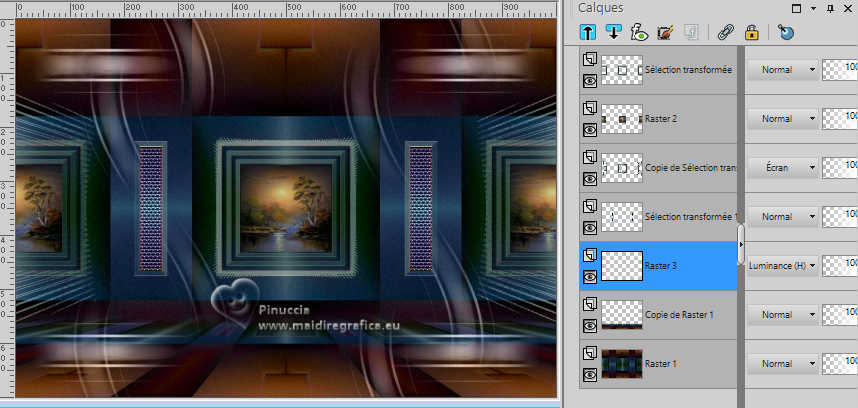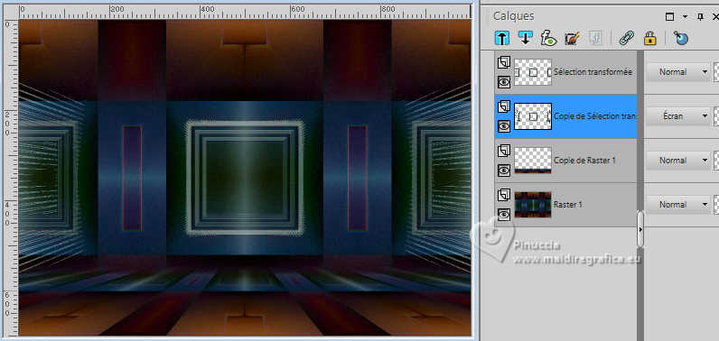 Pour traduire ce tutoriel j'ai utilisé PSPX9, et PSP2020, mais il peut également être exécuté avec les autres versions. Suivant la version utilisée, vous pouvez obtenir des résultats différents. Depuis la version X4, la fonction Image>Miroir a été remplacée par Image>Renverser horizontalement, et Image>Renverser avec Image>Renverser verticalement . Dans les versions X5 et X6, les fonctions ont été améliorées par la mise à disposition du menu Objets. Avec la nouvelle version X7, nous avons encore Image>Miroir et Image>Renverser/Retourner, mais avec nouvelles différences. Voir les détails à ce sujet ici Certaines dénominations ont changées entre les versions de PSP. Les plus frequentes dénominations utilisées: ![]() English translation here Vos versions ici![]() Nécessaire pour réaliser ce tutoriel: ![]() Le matériel est de Maria José (ici les liens vers les sites des créateurs du matériel) ![]() consulter, si nécessaire, ma section des filtres ici Filters Unlimited 2.0 ici VanDerLee - Unplugged-X ici Mehdi - Sorting Tiles ici Graphics Plus - Vertical Mirror ici Simple - Top Left Mirror ici Mura's Meister - Perspective Tiling ici Kiwi - ici Filtres Graphics plus, Kiwi et Simple peuvent être utilisés seuls ou importés dans Filters Unlimited. voir comment le faire ici). Si un filtre est fourni avec cette icône, ![]() en fonction des couleurs utilisées, vous pouvez changer le mode mélange et l'opacité des calques. Dans les plus récentes versions de PSP, vous ne trouvez pas le dégradé d'avant plan/arriére plan ou Corel_06_029. Vous pouvez utiliser le dégradé des versions antérieures. Ici le dossier Dégradés de CorelX. Placer le preset En cliquant sur le preset une ou deux fois (selon vos réglages) automatiquement il se placera directement dans le dossier Settings de Alien Skin Eye Candy. pourquoi un ou deux clic voir ici ![]() Placer les sélections dans le dossier Sélections. Placer en avant plan la couleur #1e2827 et en arrière plan la couleur #9ba99c. ![]() Les couleurs ne feront aucune différence, vous pouvez les utiliser à partir du tutoriel. Le résultat sera selon votre graphique Préparer en avant plan un dégradé de premier plan/arrière plan, style Linéaire. ![]() 1. Ouvrir une nouvelle image transparente 1000 x 700 pixels. Remplir l'image transparente du dégradé.2. Effets>Modules Externes>VanDerLee - Unplugged-X - Tan Deform. ![]() 3. Calques>Nouveau calque raster. Sélections>Sélectionner tout. 4. Ouvrir le graphique d4bb80... ![]() Édition>Copier. Revenir sur votre travail et Édition>Coller dans la sélection. Sélections>Désélectionner tout. 5. Effets>Effets d'image>Mosaïque sans jontures. ![]() 6. Réglage>Flou>Flou gaussien - rayon 25. ![]() Placer le calque en mode Différence. Calques>Fusionner>Fusionner le calque de dessous. 7. Effets>Modules Externes>Mehdi - Sorting Tiles. ![]() 8. Effets>Effets de réflexion>Miroir rotatif. ![]() 9. Effets>Modules Externes>Simple - Top Left Mirror. ![]() 10. Effets>Modules Externes>Graphics Plus - Vertical Mirror, par défaut. ![]() 11. Réglage>Ajouter/Supprimer du bruit>Ajouter du bruit. ![]() 12. Calques>Dupliquer. Effets>Modules Externes>Mura's Meister - Perspective Tiling. ![]() 13. Activer l'outil Baguette magique , progressivité 60et cliquer dans la partie transparente pour la sélectionner. Presser +/-10 fois CANC sur le clavier ![]() Sélections>Désélectionner tout. ne pas oublier de placer à nouveau la progressivité à 0 14. Vous positionner sur le calque Raster 1. Sélections>Charger/Enregistrer une sélection>Charger à partir du disque. Chercher et charger la sélection multicolor-MJ ![]() Sélections>Transformer la sélection en calque. Calques>Agencer>Placer en haut de la pile. Sélection>Désélectionner tout. 15. Effets>Effets 3D>Ciselage, couleur d'arrière plan. ![]() 16. Calques>Dupliquer. Image>Redimensionner, 85%, redimensionner tous les calques décoché. Répéter Calques>Dupliquer. Image>Redimensionner, 85%, redimensionner tous les calques décoché. Calques>Fusionner>Fusionner le calque de dessous - 2 fois. 17. Sélections>Charger/Enregistrer une sélection>Charger à partir du disque. Chercher et charger la sélection multicolor-1-MJ ![]() Presser CANC sur le clavier. Sélections>Désélectionner tout. 18. Effets>Effets d'image>Mosaïque sans jointures. ![]() 19. Calques>Dupliquer. Effets>Effets de distorsion>Rayonnement. ![]() Calques>Agencer>Déplacer vers le bas. 20. Effets>Modules Externes>Simple - Top Left Mirror. ![]() Placer le calque en mode Écran. ![]() 21. Sélections>Charger/Enregistrer une sélection>Charger à partir du disque. Charger à nouveau la sélection multicolor-1-MJ ![]() 22. Calques>Nouveau calque raster. Édition>Coller dans la sélection - le graphique est toujours en mémoire. 23. Calques>nouveau calque raster. Effets>Effets 3D>Découpe. ![]() Calques>Fusionner>Fusionner le calque de dessous. Sélections>Désélectionner tout. 24. Effets>Effets d'image>Mosaïque sans jointures ![]() 25. Vous positionner sur le calque Raster 1. Sélections>Charger/Enregistrer une sélection>Charger à partir du disque. Chercher et charger la sélection multicolor-2-MJ ![]() Sélections>Transformer la sélection en calque. Calques>Agencer>Déplacer vers le haut 26. Effets>Effets de textures>Mosaïque ![]() 27. Réglage>Netteté>Davantage de netteté. Sélections>Désélectionner tout. 28. Effets>Effets 3D>Ciselage, comme précédemment. ![]() 29. Calques>Dupliquer. Image>Miroir. Calques>Fusionner>Fusionner le calque de dessous. 30. Ouvrir deco-MJ ![]() Édition>Copier. Revenir sur votre travail et Édition>Coller comme nouveau calque. Calques>Agencer>Déplacer vers le bas. Placer le calque en mode Luminance (héritée). La tag et les calques - adapter à votre goût. ![]() 31. Vous positionner sur le calque du haut de la pile. Ouvrir le tube de la femme mariajose-MJ ![]() Effacer le watermark et Édition>Copier Revenir sur votre travail et
