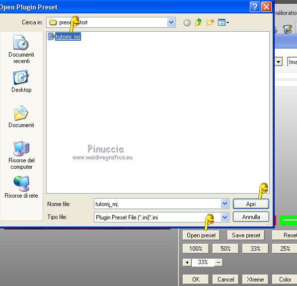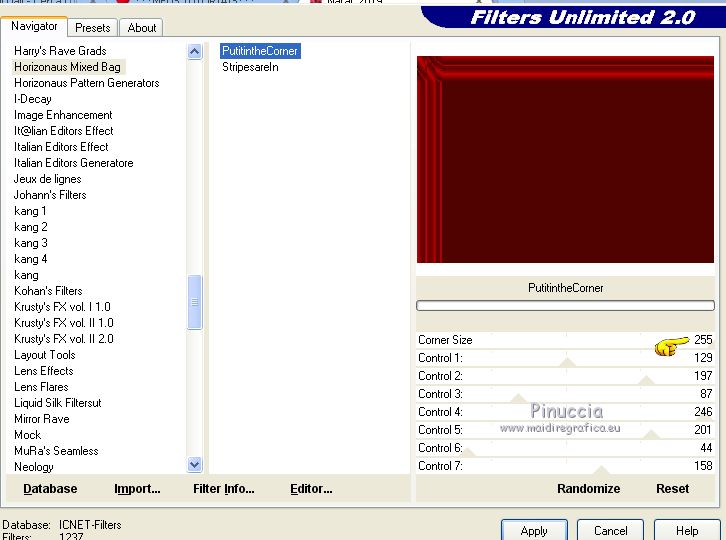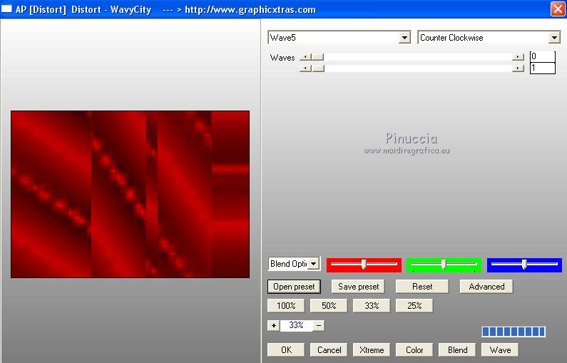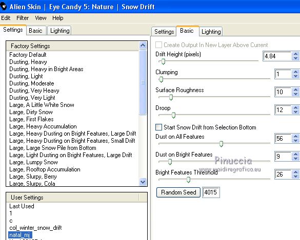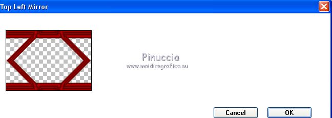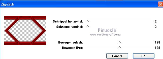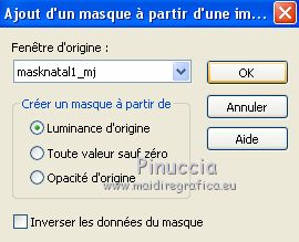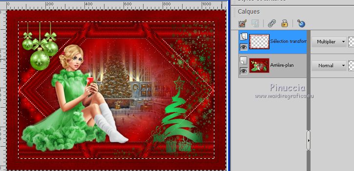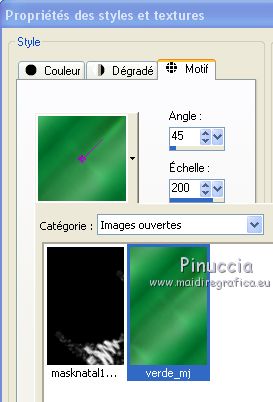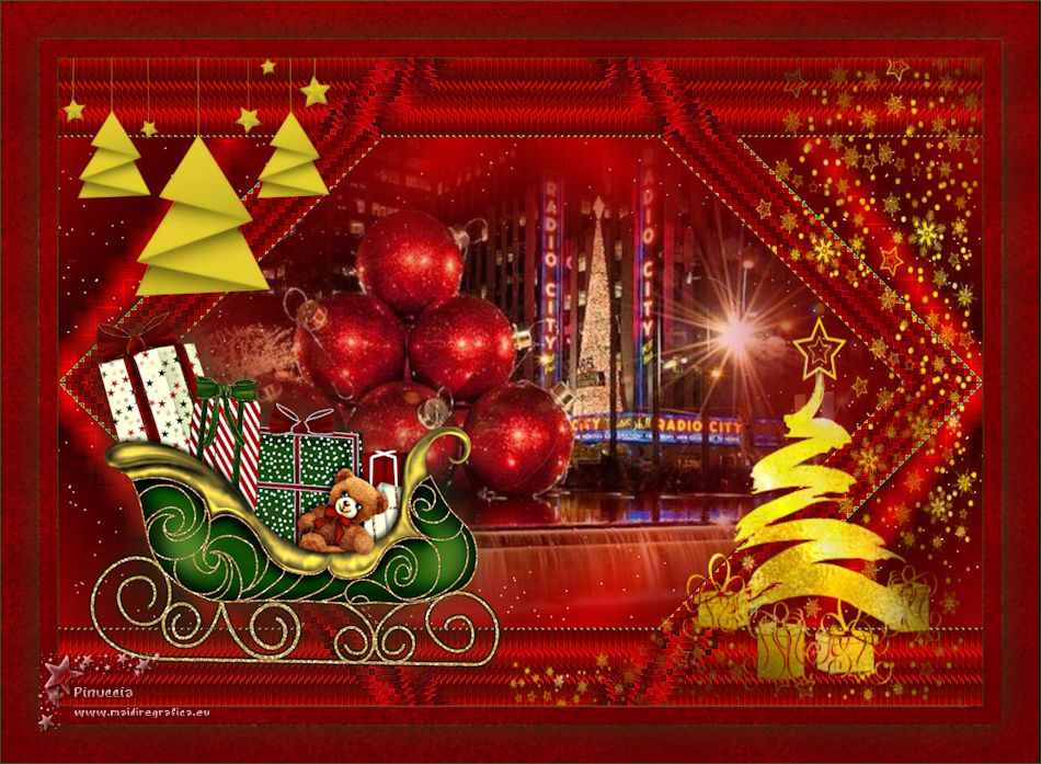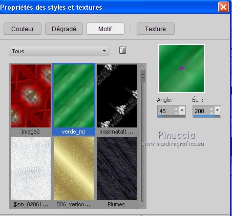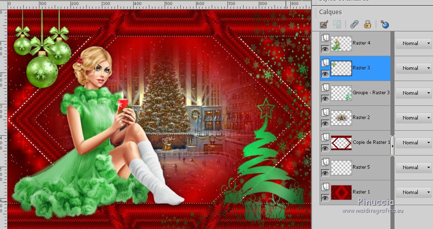 Pour traduire ce tutoriel j'ai utilisé CorelX17, mais il peut également être exécuté avec les autres versions. Suivant la version utilisée, vous pouvez obtenir des résultats différents. Depuis la version X4, la fonction Image>Miroir a été remplacée par Image>Renverser horizontalement, et Image>Renverser avec Image>Renverser verticalement . Dans les versions X5 et X6, les fonctions ont été améliorées par la mise à disposition du menu Objets. Avec la nouvelle version X7, nous avons encore Image>Miroir et Image>Renverser/Retourner, mais avec nouvelles différences. Voir les détails à ce sujet ici Certaines dénominations ont changées entre les versions de PSP. Les plus frequentes dénominations utilisées: ![]() Vos versions ici Nécessaire pour réaliser ce tutoriel: Matériel ici Image du net, sans signature. Le reste du matériel est de Maria José (ici les liens vers les sites des créateurs de tubes) Modules Externes: consulter, si nécessaire, ma section des filtres ici Filters Unlimited 2.0 ici Simple - Top Left Mirror ici Graphics Plus - Cross Shadow, Vertical Mirror ici Alien Skin Eye Candy 5 Nature - Snow Drift ici Horizonaus Mixed Bag - PutitintheCorner ici Kiwi Oelfilters - Zig-Zack ici AP [Distort] - Distort-Wavy City - dans le matériel Mehdi - Weaver ici Filtres Simple, Horizonaus, Kiwi et Graphics Plus peuvent être utilisés seuls ou importés dans Filters Unlimited. voir comment le faire ici). Si un filtre est fourni avec cette icône, ![]() en fonction des couleurs utilisées, vous pouvez changer le mode mélange et l'opacité des calques. Placer le preset En cliquant sur le preset une ou deux fois (selon vos réglages) automatiquement il se placera directement dans le dossier Settings de Alien Skin Eye Candy. pourquoi un ou deux clic voir ici Placer les sélections dans le dossier Sélections. Ouvrir le masque et le motif verde_mj dans PSP et les minimiser avec le reste du matériel. 1. Placer en avant plan la couleur #990000, et en arrière plan la couleur #14582b. ![]() 2. Ouvrir une nouvelle image transparente 1000 x 700 pixels. Sélections>Sélectionner tout. Ouvrir backnatal_mj. Si vous utilisez des autres couleurs, coloriser à votre goût, avec l'outil Changeur de couleur, ou selon vos couleur et/ou votre version de PSP. ![]() Édition>Copier. Revenir sur votre travail et Édition>Coller dans la sélection. Sélections>Désélectionner tout. 3. Effets>Effets d'image>Mosaïque sans jointures. ![]() 4. Effets>Modules Externes>Mehdi - Weaver. ![]() Effets>Effets de bords>Accentuer davantage. 5. Calques>Dupliquer. Effets>Modules Externes>AP[Distort] Distort-WavyCity Cliquer sur Open preset et chercher dans le dossier où vous l'avez copié, le preset tutomj_mj ![]() Cliquer ok pour appliquer ![]() 6. Effets>Modules Externes>Filters Unlimited 2.0 - Horizonaus Mixed Bag - PutitintheCorner. ![]() 7. Sélections>Charger/Enregistrer une sélection>Charger à partir du disque. Chercher et charger la sélection natal_mj. ![]() Presser CANC sur le clavier ![]() Sélections>Désélectionner tout. 8. Effets>Effets géométriques>Inclinaison ![]() 9. Effets>Modules Externes>Simple - Top Left Mirror. ![]() 10. Effets>Modules Externes>*Kiwi* Oelfilters - Zig-zack, par défaut. ![]() 11. Effets>Effets de Réflexion>Miroir rotatif, par défaut. ![]() 12. Effets>Effets de bords>Accentuer. 13. Effets>Modules Externes>Graphics Plus - Vertical Mirror, par défaut. ![]() 14. Vous positionner sur le calque Raster 1. Effets>Effets de Réflexion>Miroir rotatif, par défaut. ![]() 15. Effets>Modules Externes>Graphics Plus - Vertical Mirror, par défaut. ![]() 16. Revenir sur le calque du haut de la pile, Copie de Raster 1. Calques>Nouveau calque raster. Sélections>Charger/Enregistrer une sélection>Charger à partir du disque. Chercher et charger la sélection natal_1_mj. ![]() 17. Ouvrir le misted - Édition>Copier. Revenir sur votre travail et Édition>Coller dans la sélection. Sélections>Désélectionner tout. 18. Placer en arrière plan Motif, et sélectionner le motif pattern verde_mj dans les anciennes versions chercher sous la catégorie Images Ouvertes, dans les nouvelles versions les images ouvertes sont en haut de la liste ![]() 19. Calques>Nouveau calque raster. Remplir le calque avec le motif d'avant plan.20. Calques>Nouveau calque de masque>A partir d'une image. Ouvrir le menu deroulant sous la fenêtre d'origine et vous verrez la liste des images ouvertes. et sélectionner le masque masknatal1_mj. ![]() Calques>Fusionner>Fusionner le groupe. 21. Effets>Modules Externes>Graphics Plus - Cross Shadow, par défaut. ![]() 22. Ouvrir le tube deconoel_mj - Édition>Copier. Revenir sur votre travail et Édition>Coller comme nouveau calque. 23. Ouvrir le tube de la femme - Édition>Copier. Revenir sur votre travail et Édition>Coller comme nouveau calque. Image>Redimensionner, à 90%, redimensionner tous les calques décoché. Déplacer le tube en bas à droite.Effets>Effets 3D>Ombre portée, à choix. 24. Vous positionner sur le calque du bas de la pile. Ouvrir neige_mj - Édition>Copier. Revenir sur votre travail et Édition>Coller comme nouveau calque. ![]() 25. Image>Ajouter des bordures, 1 pixel, symétrique, couleur #14582b. Image>Ajouter des bordures, 20 pixels, symétrique, couleur #990000. Image>Ajouter des bordures, 1 pixel, symétrique, couleur #14582b. Image>Ajouter des bordures, 40 pixels, symétrique, couleur #990000. 26. Sélections>Charger/Enregistrer une sélection>Charger à partir du disque. Chercher et charger la sélection natal_2_mj. ![]() Sélections>Transformer la sélection en calque. 27. Effets>Modules Externes>Alien Skin Eye Candy 5 Nature - Snow Drift, sélectionner le preset natal_mj et ok. Ci-dessous les réglages, en cas de problèmes avec le preset. ![]() Placer le calque en mode Multiplier, ou autre. ![]() 28. Calques>Fusionner>Calques visibles. 29. Sélections>Sélectionner tout. Sélections>Modifier>Contracter - 40 pixels. 30. Eff