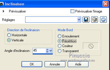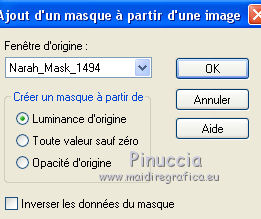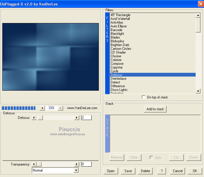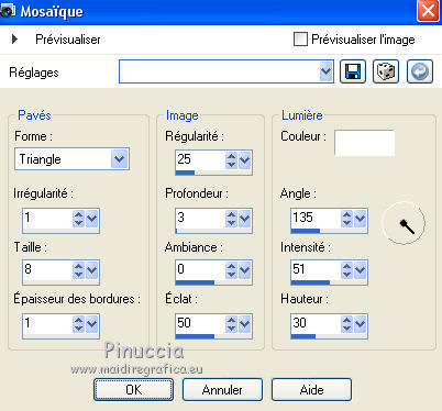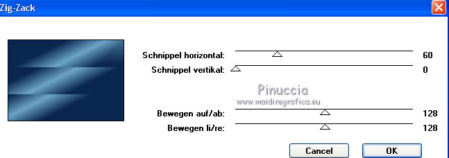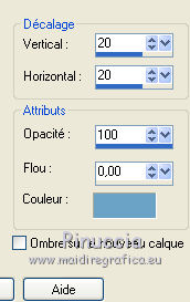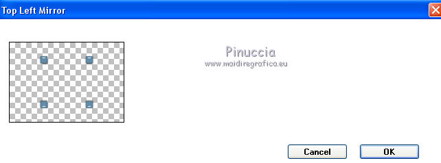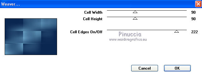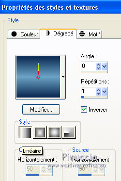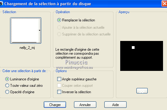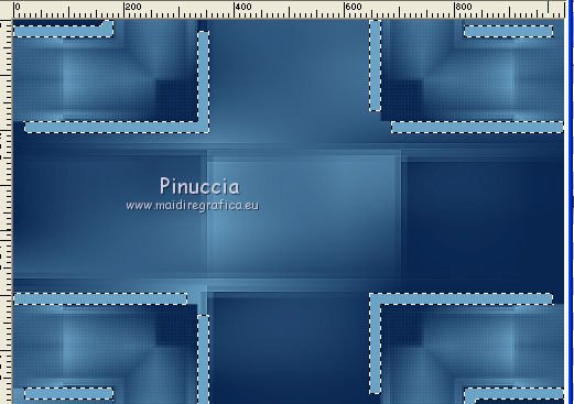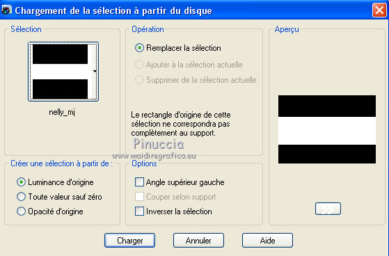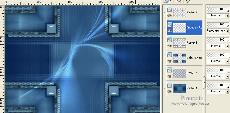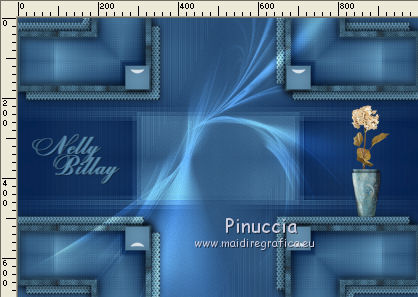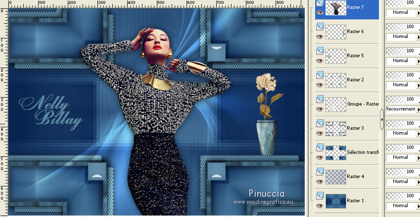 Pour traduire ce tutoriel j'ai utilisé CorelX17, mais il peut également être exécuté avec les autres versions. Suivant la version utilisée, vous pouvez obtenir des résultats différents. Depuis la version X4, la fonction Image>Miroir a été remplacée par Image>Renverser horizontalement, et Image>Renverser avec Image>Renverser verticalement . Dans les versions X5 et X6, les fonctions ont été améliorées par la mise à disposition du menu Objets. Avec la nouvelle version X7, nous avons encore Image>Miroir et Image>Renverser/Retourner, mais avec nouvelles différences. Voir les détails à ce sujet ici Certaines dénominations ont changées entre les versions de PSP. Les plus frequentes dénominations utilisées: ![]() Vos versions iciNécessaire pour réaliser ce tutoriel: Matériel ici Merci pour le tube Luz Cristina et pour le masque Narah. (ici les liens vers les sites des créateurs de tubes) Modules Externes: consulter, si nécessaire, ma section des filtres ici Filters Unlimited 2.0 ici °v° Kiwi's Oelfilter - Zig-Zack ici Carolaine and Sensibility - CS-LDots ici Graphics Plus - Vertical Mirror ici Mura's Seamless - Emboss at Alpha ici Simple - Top Left Mirror ici VanDerLee - Unplugged-X ici Alien Skin Eye Candy 5 Impact - Glass ici Toadies - Weaver ici Filtres Kiwi, Toadies, Graphics Plus, Mura's Seamless et Simple peuvent être utilisés seuls ou importés dans Filters Unlimited. voir comment le faire ici). Si un filtre est fourni avec cette icône, ![]() en fonction des couleurs utilisées, vous pouvez changer le mode mélange et l'opacité des calques. Dans les plus récentes versions de PSP, vous ne trouvez pas le dégradé d'avant plan/arrière plan ou Corel_06_029. Vous pouvez utiliser le dégradé des versions antérieures. Ici le dossier Dégradés de CorelX. Placer le preset En cliquant sur le preset une ou deux fois (selon vos réglages) automatiquement il se placera directement dans le dossier Settings de Alien Skin Eye Candy. pourquoi un ou deux clic voir ici Placer les sélections dans le dossier Sélections. Ouvrir le masque dans PSP et le minimiser avec le reste du matériel. 1. Placer en avant plan la couleur #6ba3c6, et en arrière plan la couleur #0a2751. ![]() Préparer en avant plan un dégradé de premier plan/arrière plan, style Linéaire. ![]() Ouvrir une nouvelle image transparente 1000 x 700 pixels. Remplir l'image transparente du dégradé.2. Effets>Effets géométriques>Inclinaison. ![]() 3. Effets>Modules Externes>°v° Kiwi's Oelfilter - Zig-Zack. ![]() rappelez-vous que le filtre commence par le signe °v° et donc, pour les règles de l'ordre alphabétique, il se trouve en bas de la liste ![]() 4. Effets>Modules Externes>Toadies - Weaver. ![]() 5. Effets>Modules Externes>VanDerLee - Unplugged-X - Defocus ![]() 6. Effets>Effets de bords>Accentuer. 7. Sélections>Charger/Enregistrer une sélection>Charger à partir du disque. Chercher et charger la sélection nelly_mj. ![]() Sélections>Transformer la sélection en calque. Sélections>Désélectionner tout. 8. Image>Rotation libre - 90 degrés à droite. ![]() 9. Effets>Effets de réflexion>Miroir rotatif. ![]() Vous positionner sur le calque Raster 1. Sélections>Sélectionner tout. Vous positionner sur le calque Sélection transformée. Image>Recadrer sur la sélection. 10. Effets>Effets de réflexion>Miroir rotatif. ![]() 11. Effets>Effets de réflexion>Kaléïdoscope. ![]() 12. Effets>Modules Externes>Carolaine and Sensibility - CS-LDots. ![]() 13. Effets>Effets 3D>Ombre portée, couleur claire. ![]() Répéter Ombre portée vertical et horizontal -20. 14. Sélections>Charger/Enregistrer une sélection>Charger à partir du disque. Chercher et charger la sélection nelly_1_mj. ![]() Si tous s'est bien passé, vous devriez avoir ![]() 15. Effets>Effets de textures>Mosaïque. ![]() Sélections>Désélectionner tout. Effets>Effets 3D>Ombre portée, couleur noire. ![]() 16. Sélections>Charger/Enregistrer une sélection>Charger à partir du disque. Chercher et charger la sélection nelly_2_mj. ![]() 17. Placer en avant plan la Couleur. Calques>Nouveau calque raster. Remplir le calque avec la couleur claire.18. Effets>Modules Externes>Alien Skin Eye Candy 5 Impact - Glass. Sélectionner le preset glass_majo et ok. ![]() Sélections>Désélectionner tout. 19. Effets>Modules Externes>Simple - Top Left Mirror. ![]() 20. Ouvrir le tube deco_nelly_mj - Édition>Copier. Revenir sur votre travail et Édition>Coller comme nouveau calque. Calques>Agencer>Déplacer vers le bas. Effets>Effets 3D>Ombre portée, comme précédemment. 21. Vous positionner sur le calque Raster 1. Effets>Effets de réflexion>Miroir rotatif, par défaut. ![]() 22. Effets>Modules Externes>Graphics Plus - Vertical Mirror, par défaut. ![]() 23. Ouvrir le tube deco_nelly_1_mj - Édition>Copier. Revenir sur votre travail et Édition>Coller comme nouveau calque. 24. Placer en avant plan la couleur blanche #ffffff. Calques>Nouveau calque raster. Remplir le calque avec la couleur blanche.Réduire l'opacité du calque à 80%. 25. Calques>Nouveau calque de masque>A partir d'une image. Ouvrir le menu deroulant sous la fenêtre d'origine et vous verrez la liste des images ouvertes. Sélectionner le masque Narah_Mask_1494. ![]() Calques>Fusionner>Fusionner le groupe. 26. Effets>Modules Externes>Mura's Seamless - Emboss at Alpha, par défaut. ![]() Calques>Agencer>Déplacer vers le haut - 2 fois. Placer le calque en mode Recouvrement, ou autre ![]() 27. Vous positionner sur le calque du haut de la pile. Ouvrir le tube texto - Édition>Copier. Revenir sur votre travail et Édition>Coller comme nouveau calque. Dépacler le texte à gauche, voir mon exemple.28. Ouvrir le tube déco - Édition>Copier. Revenir sur votre travail et Édition>Coller comme nouveau calque. Déplacer le tube à droite.![]() 29. Ouvrir le tube de la femme - Édition>Copier. Revenir sur votre travail et Édition>Coller comme nouveau calque. Image>Redimensionner, à 90