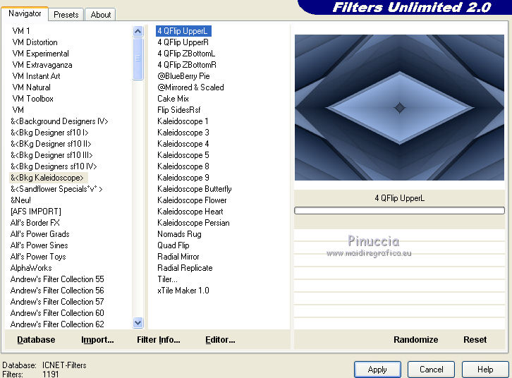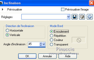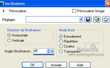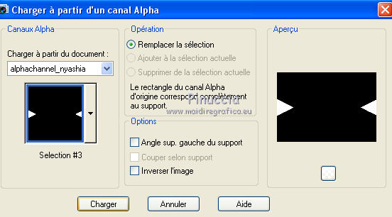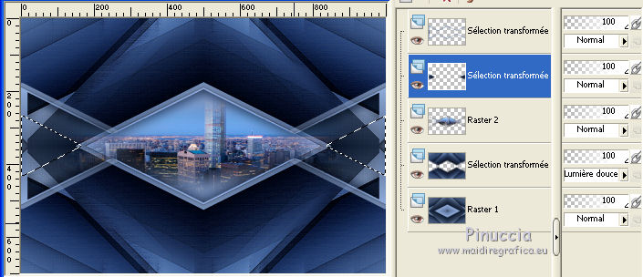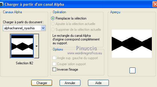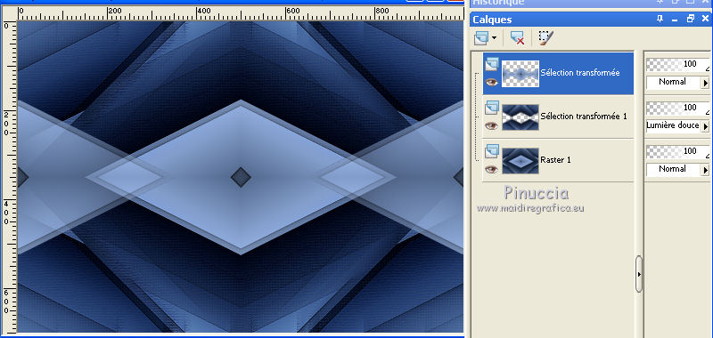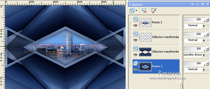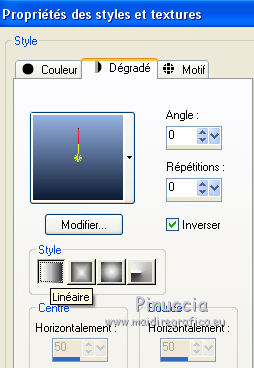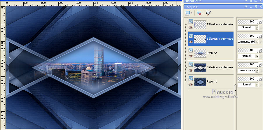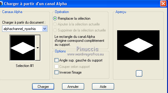 Pour traduire ce tutoriel j'ai utilisé CorelX12, mais il peut également être exécuté avec les autres versions. Suivant la version utilisée, vous pouvez obtenir des résultats différents. Depuis la version X4, la fonction Image>Miroir a été remplacée par Image>Renverser horizontalement, et Image>Renverser avec Image>Renverser verticalement . Dans les versions X5 et X6, les fonctions ont été améliorées par la mise à disposition du menu Objets. Avec la nouvelle version X7, nous avons encore Image>Miroir et Image>Renverser/Retourner, mais avec nouvelles différences. Voir les détails à ce sujet ici Certaines dénominations ont changées entre les versions de PSP. Les plus frequentes dénominations utilisées: ![]() Vos versions iciNécessaire pour réaliser ce tutoriel: Matériel ici Pour les tubes merci AngelStar et Grisi. (les liens des sites des tubeuses ici) Modules Externes: consulter, si nécessaire, ma section des filtres ici Filters Unlimited 2.0 ici &<Bkg Kaleidoscope> - 4QFlip UpperL (à importer dans Unlimited) ici Graphics Plus - Vertical Mirror ici Artistiques - Pastels ici Alien Skin Eye Candy 5 Impact - Glass ici Mura's Seamless - Emboss at Alpha ici Filtres Graphics Plus et Mura's Seamless peuvent être utilisés seuls ou importés dans Filters Unlimited. voir comment le faire ici). Si un filtre est fourni avec cette icône, ![]() en fonction des couleurs utilisées, vous pouvez changer le mode mélange et l'opacité des calques. Dans les plus récentes versions de PSP, vous ne trouvez pas le dégradé d'avant plan/arrière plan ou Corel_06_029. Vous pouvez utiliser le dégradé des versions antérieures. Ici le dossier Dégradés de CorelX. Placer le preset En cliquant sur le preset une ou deux fois (selon vos réglages) automatiquement il se placera directement dans le dossier Settings de Alien Skin Eye Candy. pourquoi un ou deux clic voir ici Ouvrir les masque dans PSP et les minimiser avec le reste du matériel. 1. Placer en avant plan la couleur #96b3e4, et en arrière plan la couleur #0d1b33. ![]() Préparer en avant plan un dégradé de premier plan/arrière plan, style Linéaire. ![]() 2. Ouvrir alphachannel_nyashia Fenêtre>Dupliquer ou sur le clavier shift+D pour faire une copie. ![]() Fermer l'original. La copie, qui sera la base de votre travail, n'est pas vide, mais contient les sélections enregistrées sur le canal alpha. Remplir l'image transparente du dégradé.3. Ouvrir le tube deco_nyashia_mj et Édition>Copier. Revenir sur votre travail et Édition>Coller comme nouveau calque. Calques>Fusionner>Fusionner le calque de dessous. 4. Effets>Effets géométriques>Inclinaison. ![]() Répéter Effets>Effets géométriques>Inclinaison, horizontal coché. ![]() 5. Effets>Modules Externes>Filters Unlimited 20 - &<Bkg Kaleidoscope> - 4 QFlip UpperL. ![]() 6. Selections>Load/Save Selection>Load Selection from Disk. The selection #1 is immediately available. You just have to click Load. ![]() Sélections>Transformer la sélection en calque. Sélections>Désélectionner tout. 7. Effets>Effets d'image>Mosaïque sans jointures. ![]() 8. Vous positionner sur le calque Raster 1. Sélections>Charger/Enregistrer une sélection>Charger à partir d'un canal alpha. Ouvrir le menu des sélections et charger la sélection #2. ![]() Sélections>Transformer la sélection en calque. Sélections>Désélectionner tout. 9. Réglage>Flou>Flou directionnel ou Flou de mouvement. ![]() 10. Effets>Modules Externes>Graphics Plus - Vertical Mirror, par défaut. ![]() 11. Effets>Modules Externes>Artistiques - Pastels, par défaut. ![]() 12. Réglage>Netteté>Davantage de netteté. Placer le calque en mode Lumière douce. 13. Vous positionner sur le calque Raster 1. Réglage>Netteté>Davantage de netteté. 14. Vous positionner sur le calque du haut de la pile, Sélection transformée. ![]() Sélections>Charger/Enregistrer une sélection>Charger à partir d'un canal alpha. Ouvrir le menu des sélections et charger à nouveau la sélection #2. ![]() Sélections>Inverser. Sélections>Modifier>Contracter - 18 pixels. Presser CANC sur le clavier ![]() 15. Calques>Nouveau calque raster. Ouvrir le misted du paysage et Édition>Copier. Revenir sur votre travail et Édition>Coller dans la sélection. 16. Sélections>Inverser. Effets>Effets 3D>Ombre portée, couleur noire. ![]() Sélections>Désélectionner tout. Calques>Agencer>Déplacer vers le bas. ![]() 17. Vous positionner à nouveau sur le calque Raster 1. Sélections>Charger/Enregistrer une sélection>Charger à partir d'un canal alpha. Ouvrir le menu des sélections et charger la sélection #3. ![]() Sélections>Transformer la sélection en calque. Calques>Agencer>Déplacer vers le haut - 2 fois ![]() 18. Effets>Modules Externes>Alien Skin Eye Candy 5 Impact - Glass. Sélectionner le preset glass_majo et ok. ![]() Ci-dessous les réglages, en cas de problèmes avec le preset. ![]() 19. Effets>Modules Externes>Graphics Plus - Vertical Mirror, par défaut. ![]() Sélections>Désélectionner tout. Placer le calque en mode Luminance (héritée) ![]() 20. Placer en avant plan la Couleur. Calques>Nouveau calque raster. Calques>Agencer>Déplacer vers le bas - 2 fois. Remplir le calque avec la couleur claire d'avant plan.21. Calques>Nouveau calque de masque>A partir d'une image. Ouvrir le menu deroulant sous la fenêtre d'origine et vous verrez la liste des images ouvertes. Sélectionner le masque cas_Mask_1015_01. ![]() Calques>Fusionner>Fusionner le groupe. 22. Effets>Modules Externes>Mura's Seamless - Emboss at Alpha, par défaut. ![]() 23. Effets>Effets d'image>Mosaïque sans jointures. ![]() 24. Image>Renverser. Placer le calque en mode Écran. ![]() 25. Vous positionner à nouveau sur le calque Raster 1. Ouvrir le tube deconyashia_1_mj et Édition>Copier. Revenir sur votre travail et Édition>Coller comme nouveau calque. Placer le calque en mode Luminance (héritée) ![]() En fonction de vos couleurs, vous êtes libre de changer mode